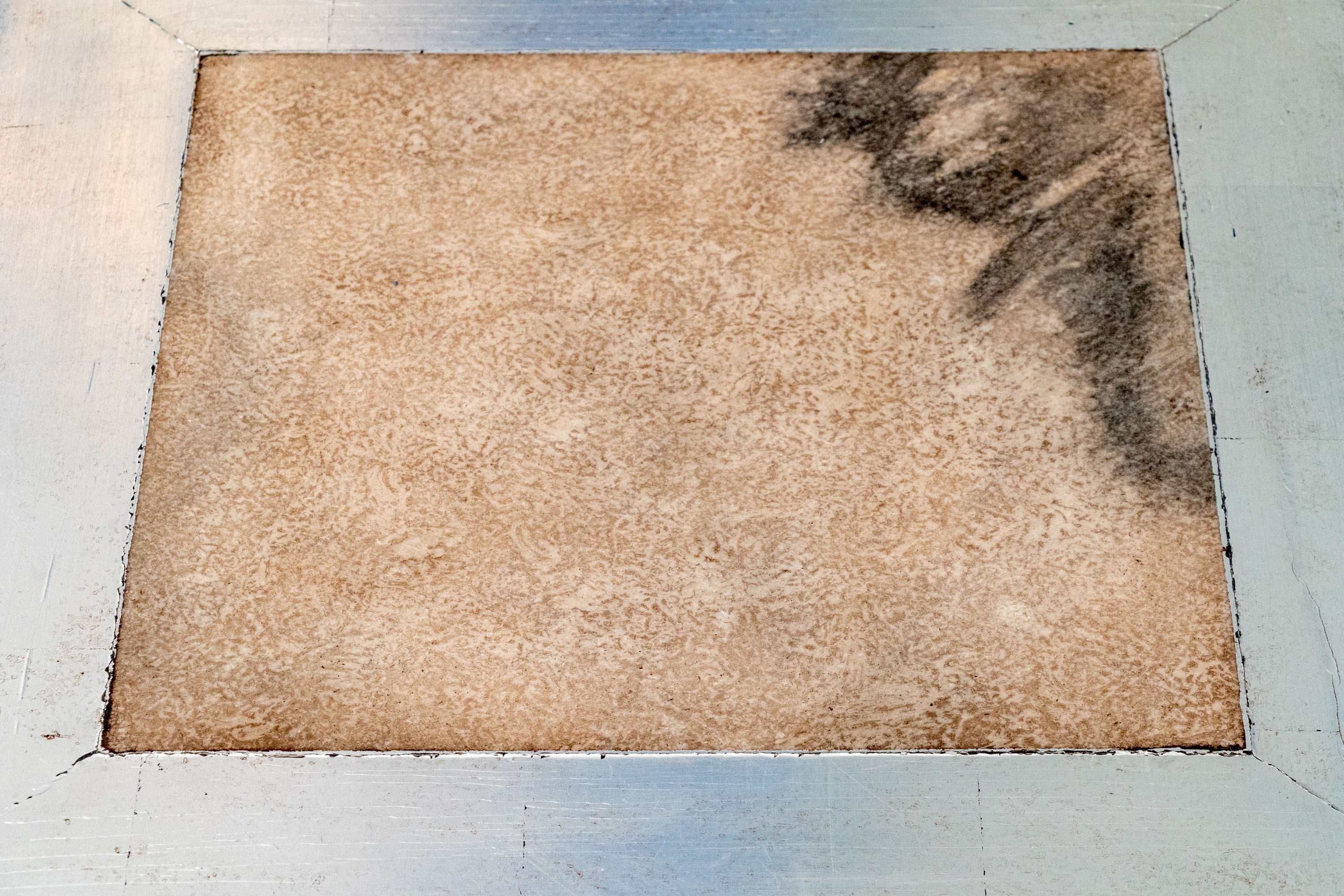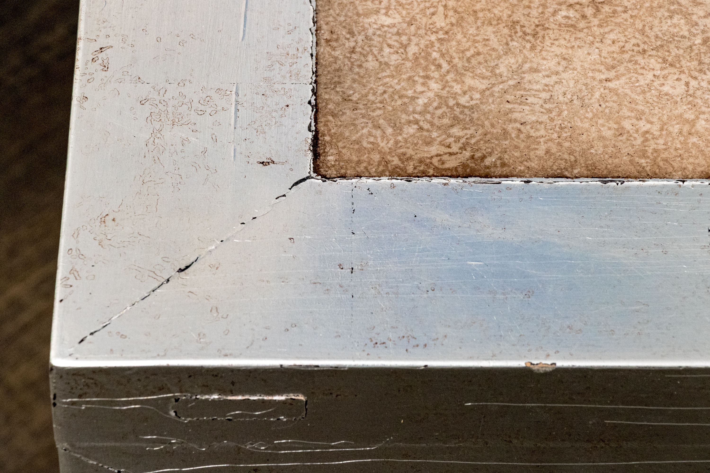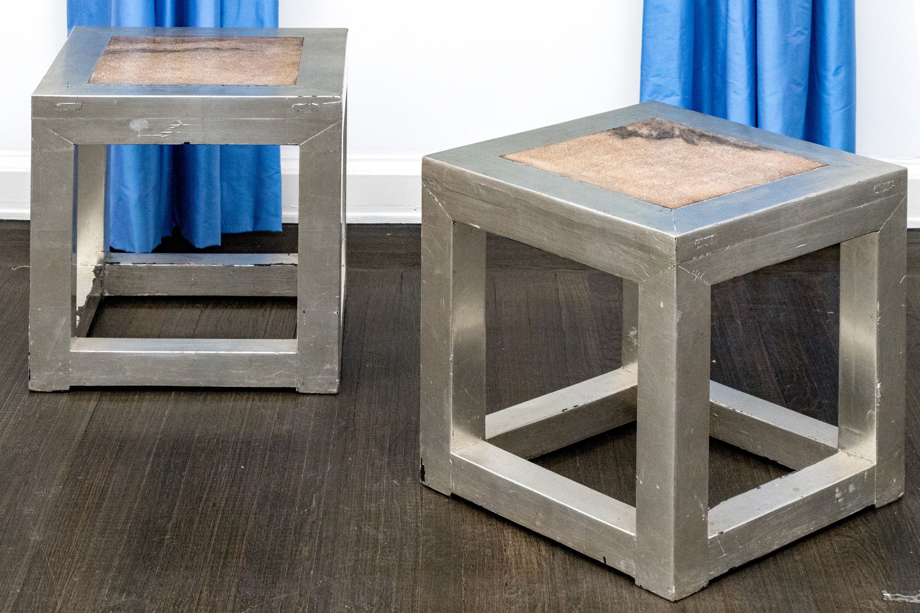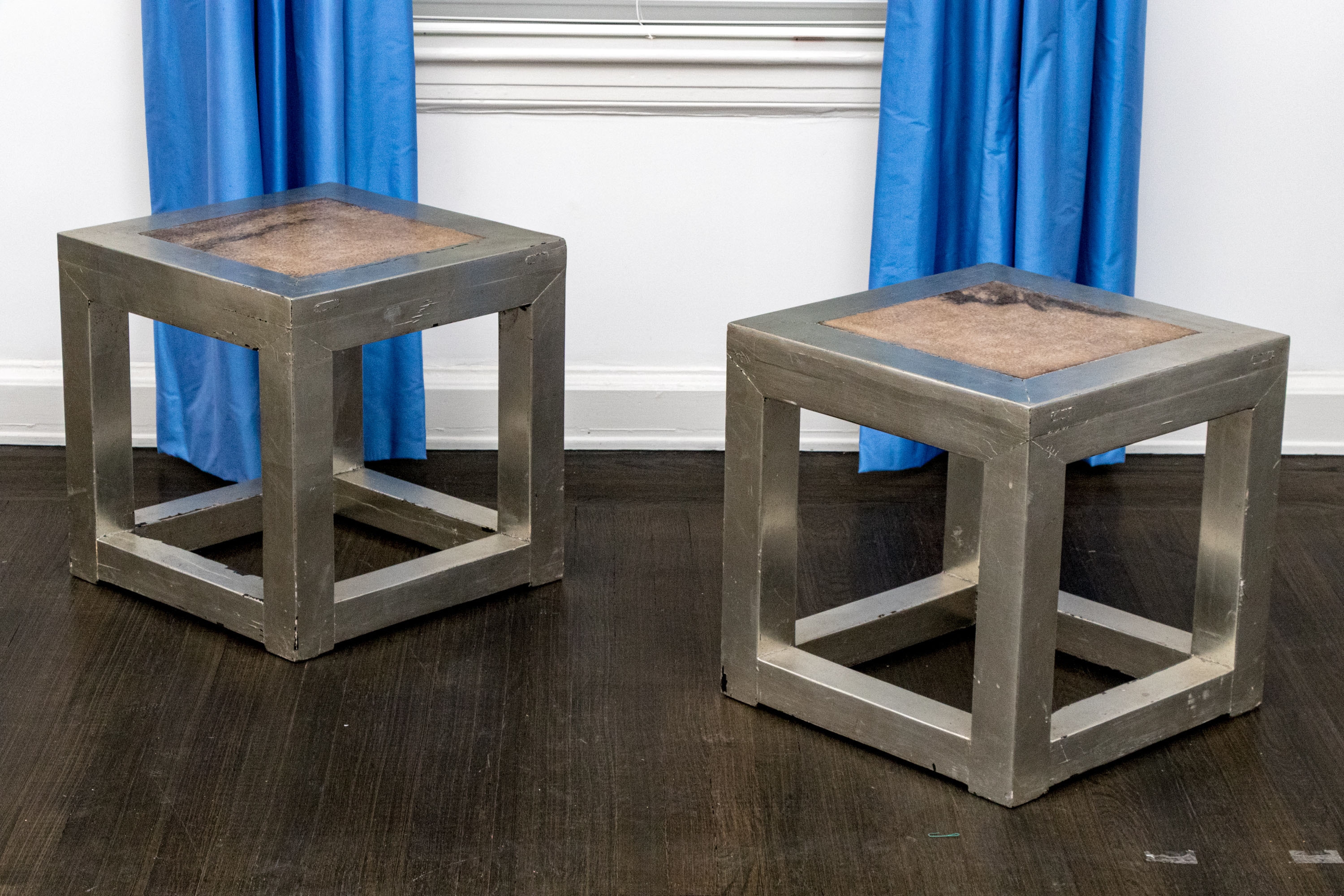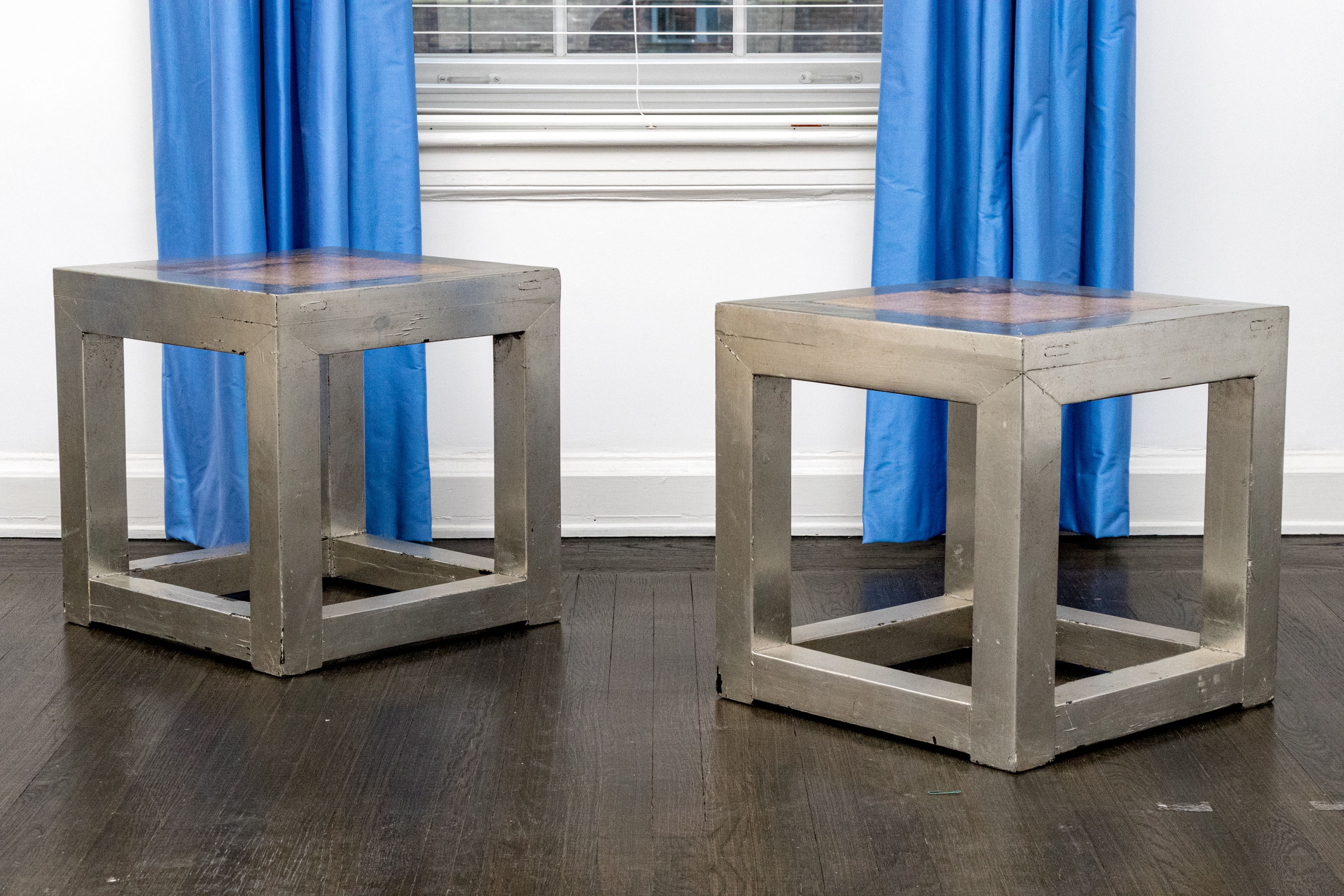 A striking pair of end tables with brutalist cube wood frames in a lux silvered finish. The tables feature mottled brown stone tops for a great blend of medias. Raised on rectangular legs with a low box stretcher completing the cube forms.