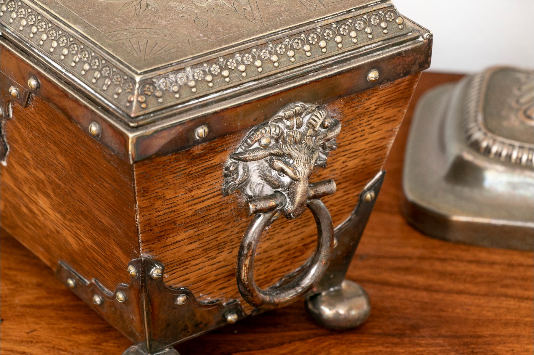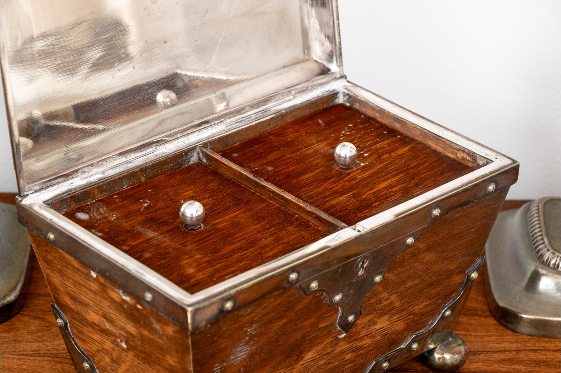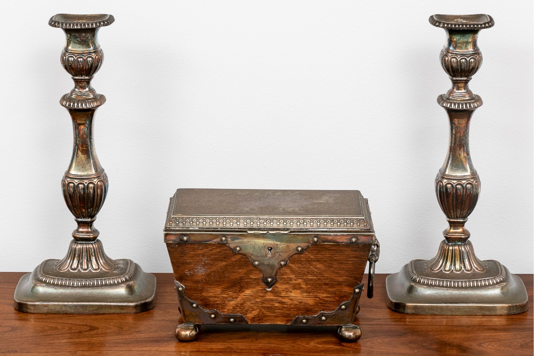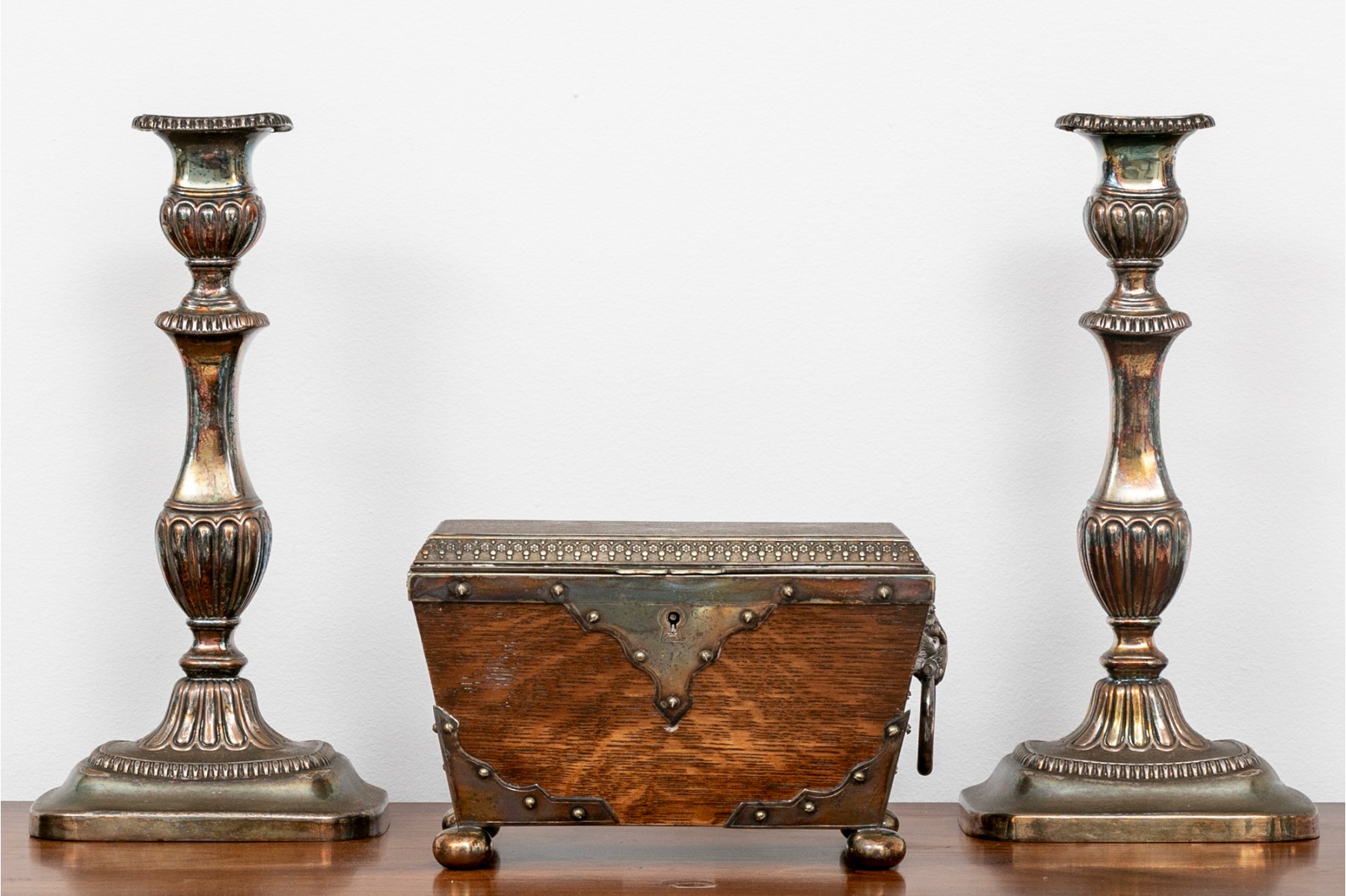 This stunning set includes a pair of exquisite silver-plated candlesticks accompanied by an oak tree caddy box featuring a silver plate mount. The oak tree caddy box, with its silver plate mount, brings a touch of rustic charm to the ensemble. This box serves a dual purpose, offering a stylish storage solution and an appealing display piece. It's perfect for holding small items or acting as a charming decor item in its own right.