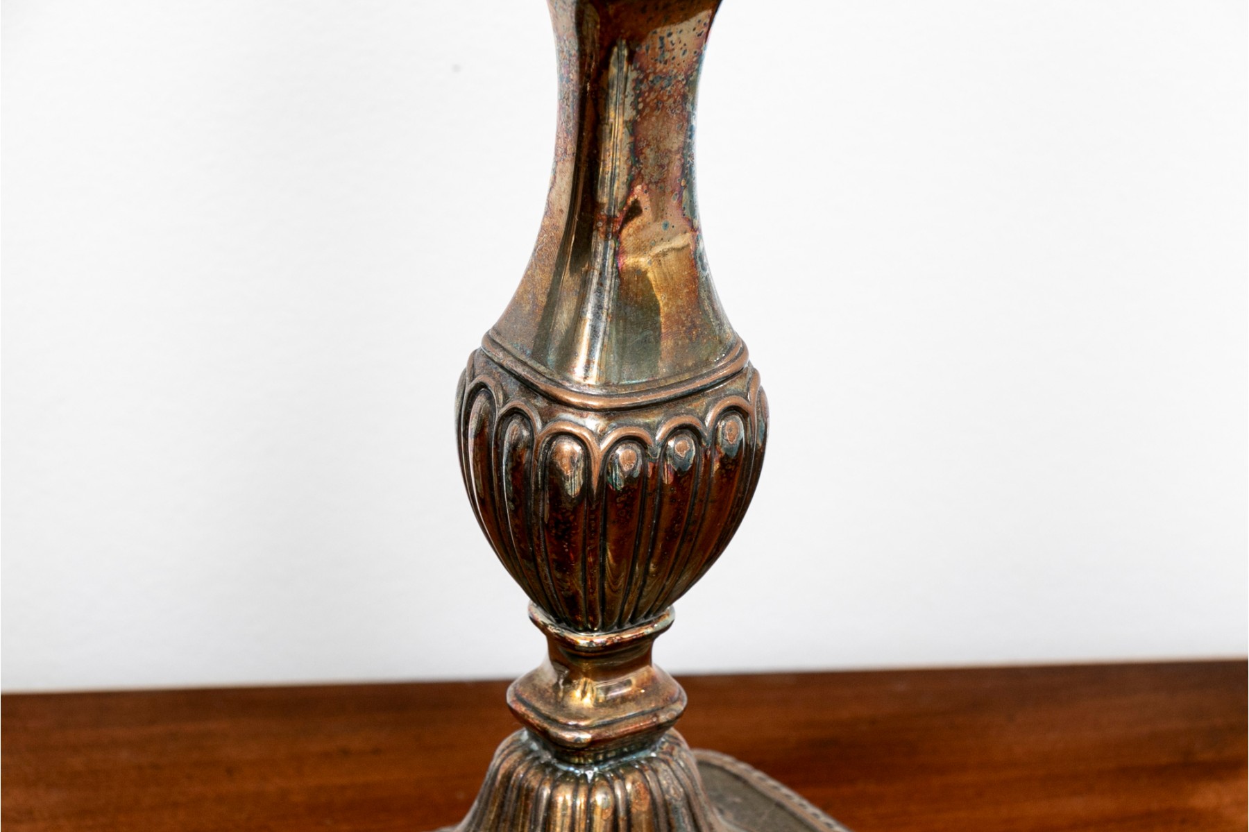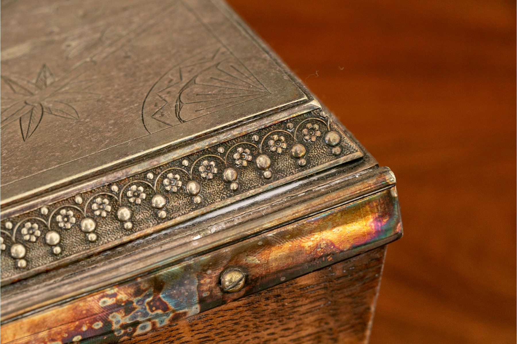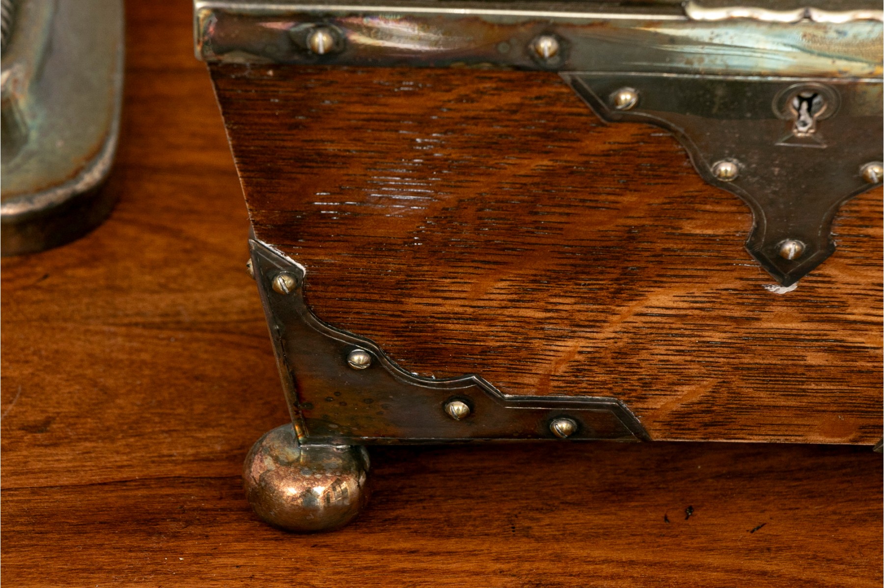 This stunning set includes a pair of exquisite silver-plated candlesticks accompanied by an oak tree caddy box featuring a silver plate mount. The oak tree caddy box, with its silver plate mount, brings a touch of rustic charm to the ensemble. This box serves a dual purpose, offering a stylish storage solution and an appealing display piece. It's perfect for holding small items or acting as a charming decor item in its own right.