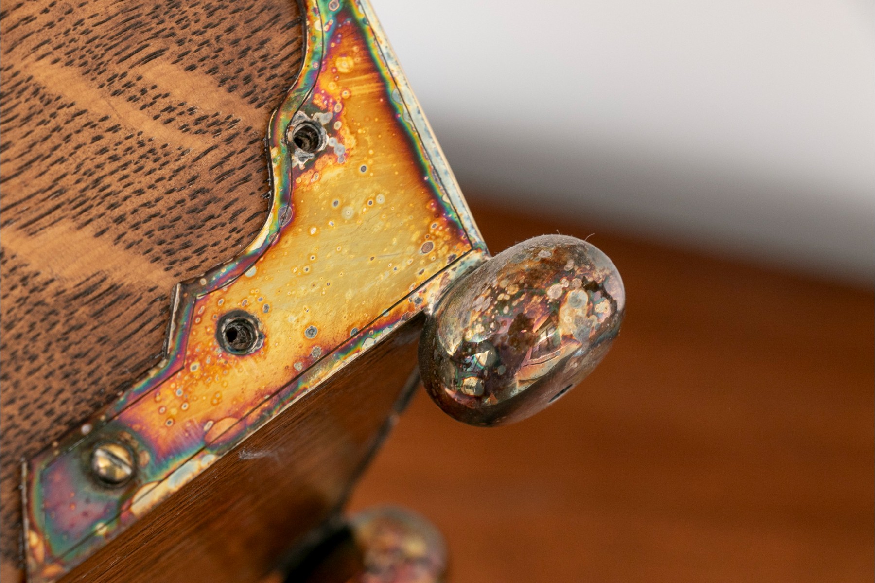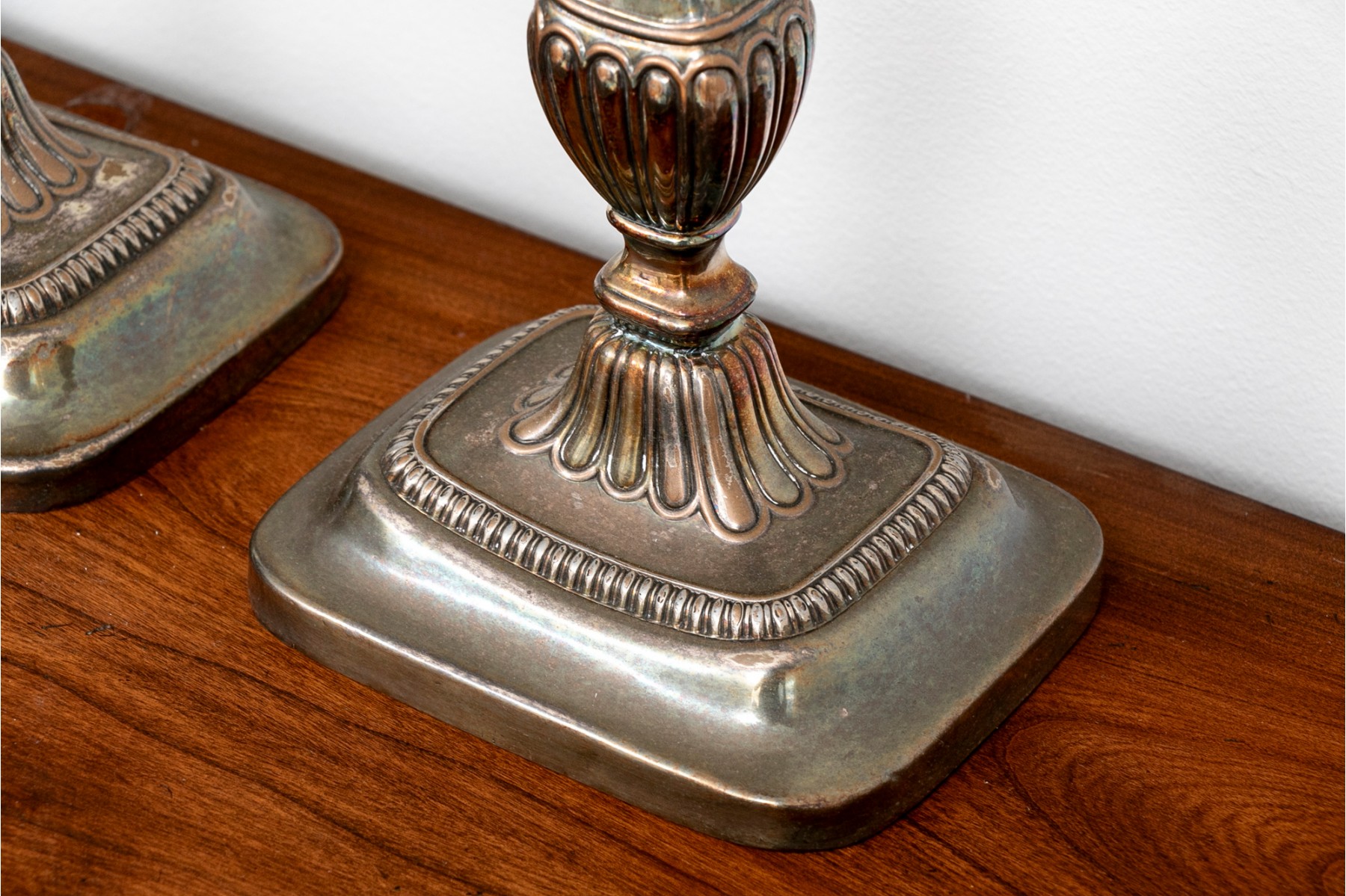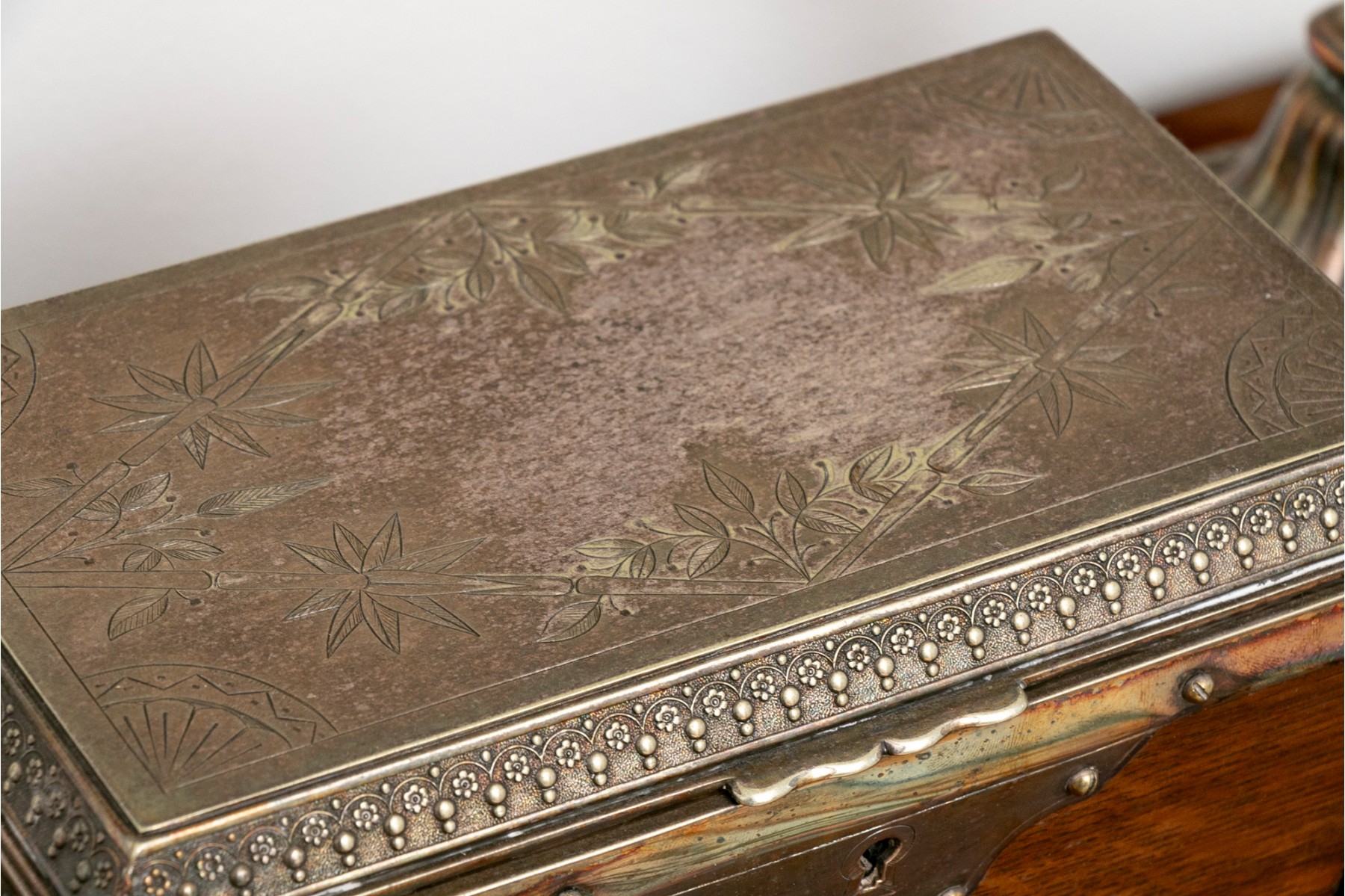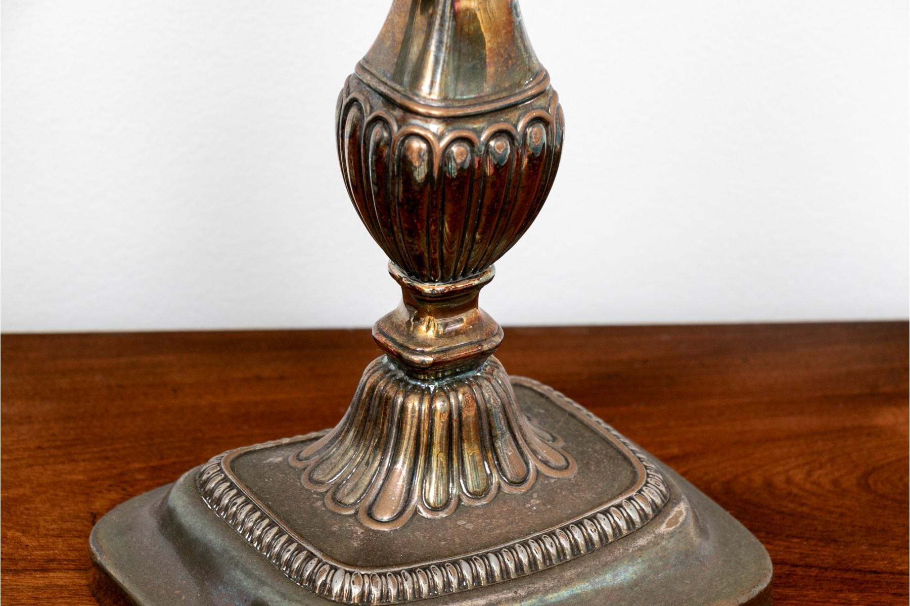 This stunning set includes a pair of exquisite silver-plated candlesticks accompanied by an oak tree caddy box featuring a silver plate mount. The oak tree caddy box, with its silver plate mount, brings a touch of rustic charm to the ensemble. This box serves a dual purpose, offering a stylish storage solution and an appealing display piece. It's perfect for holding small items or acting as a charming decor item in its own right.