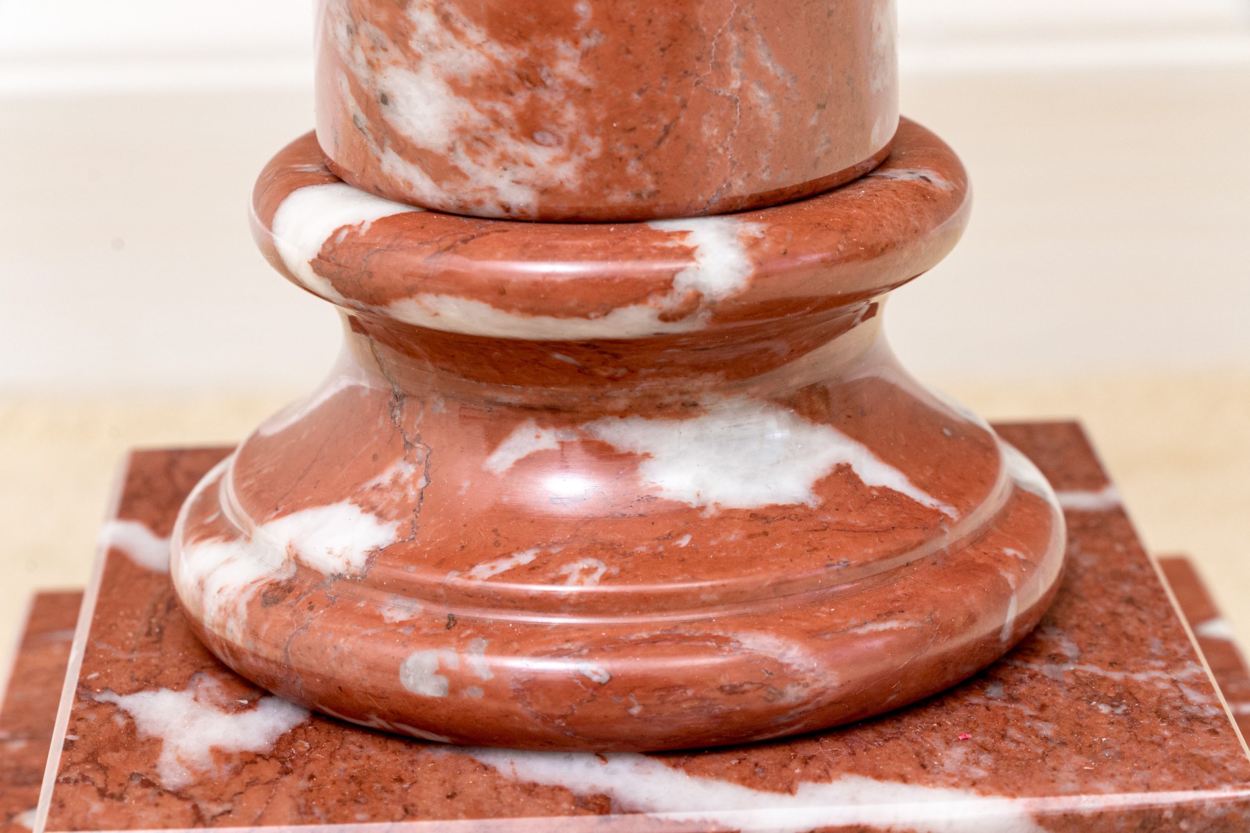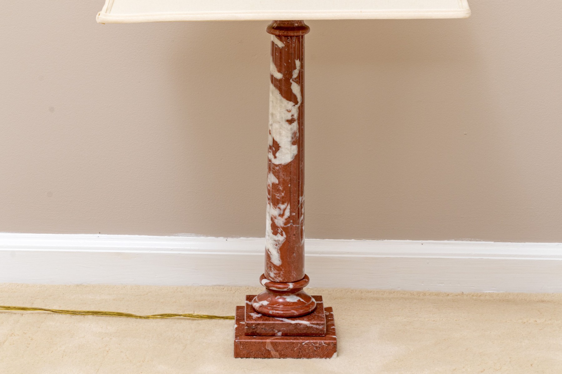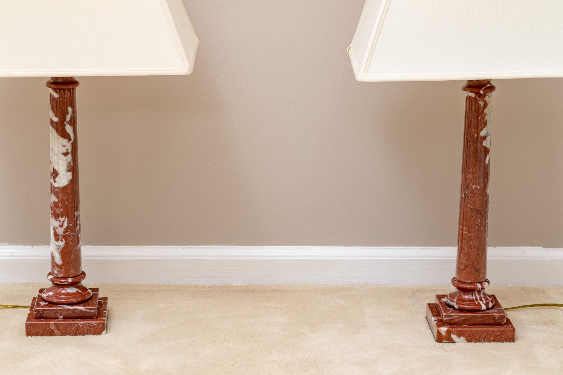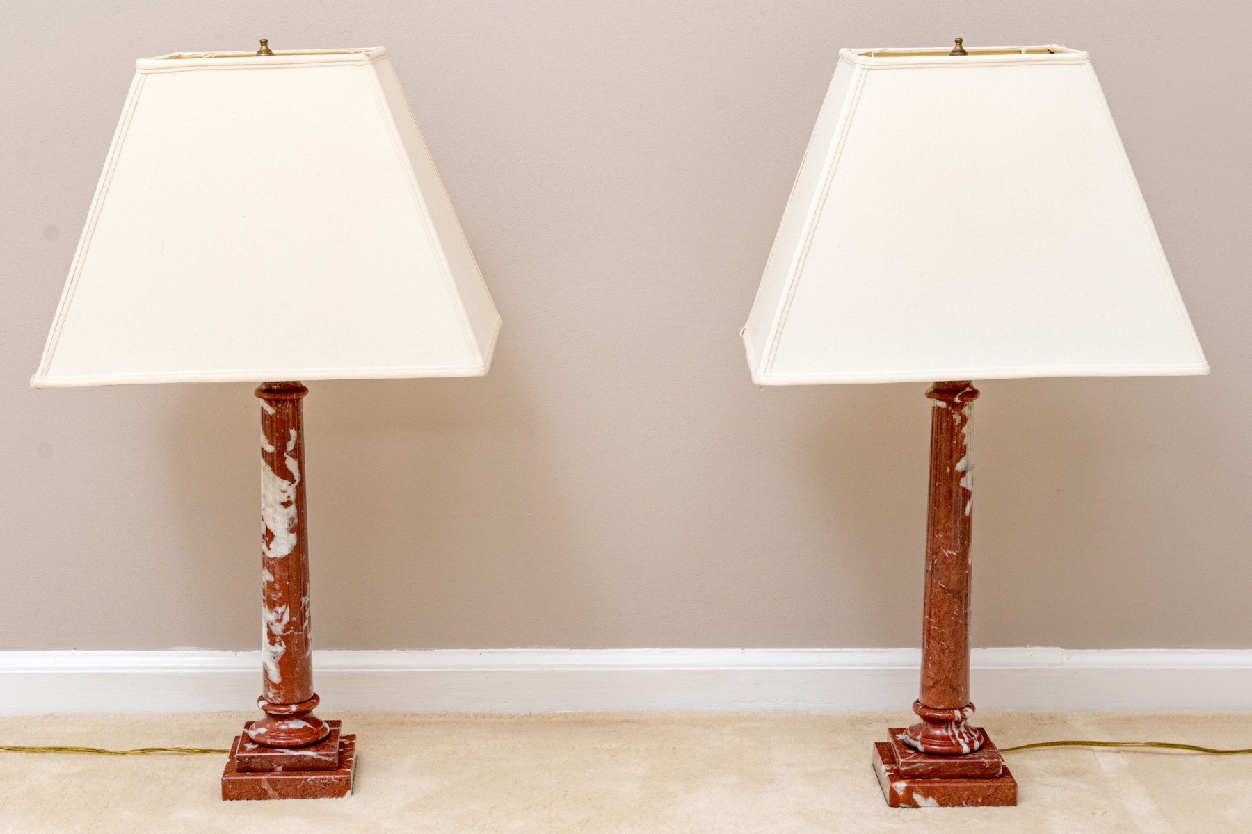 A pair of stately table lamps with Neoclassical appeal, displaying carved red and white marble columns on tiered square bases. Surmounted with white linen empire shades.