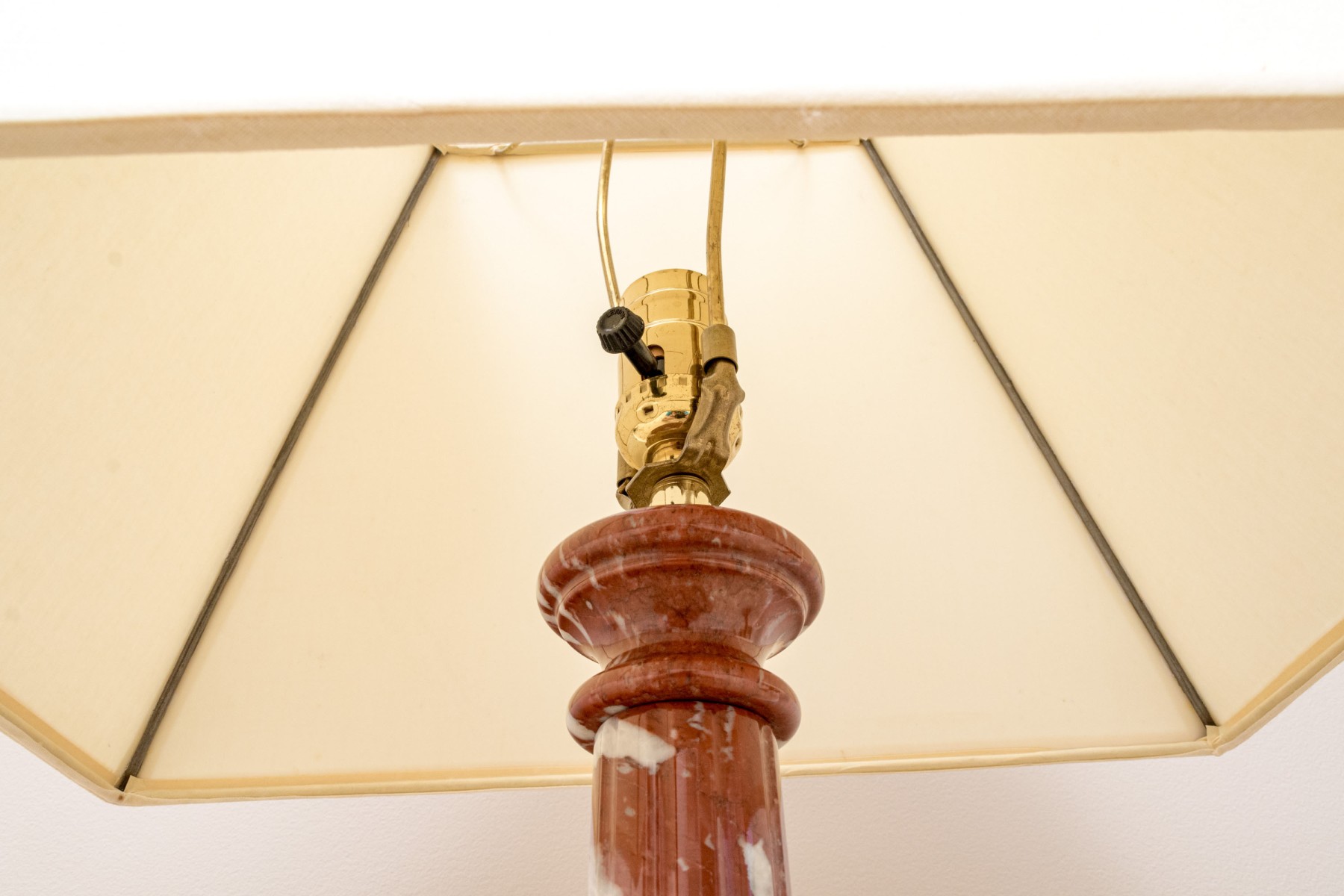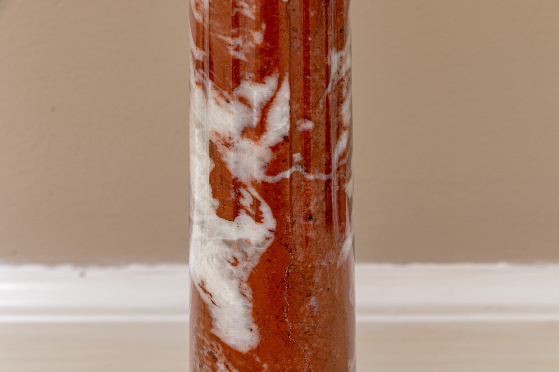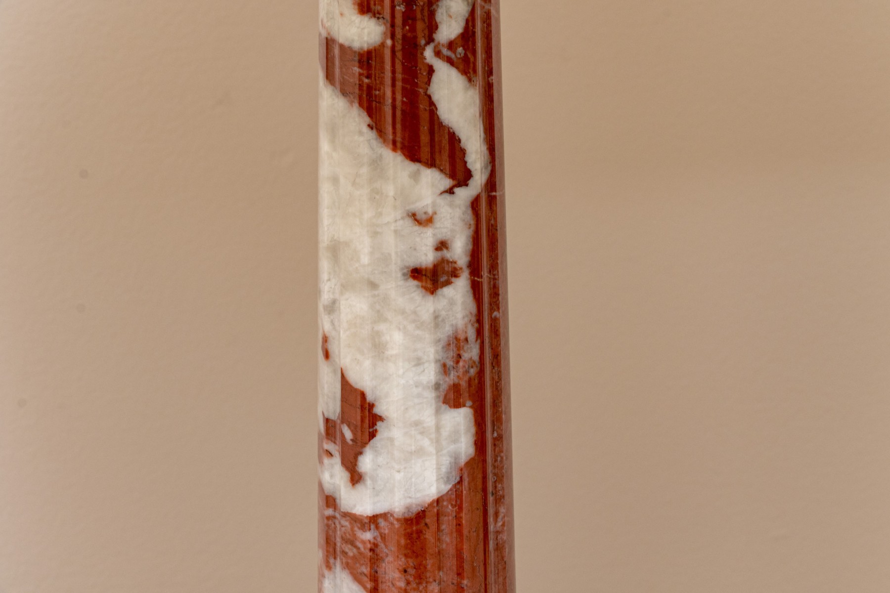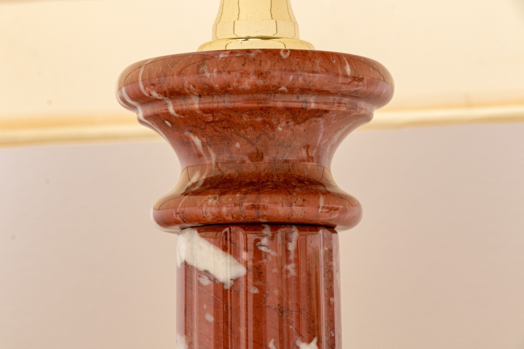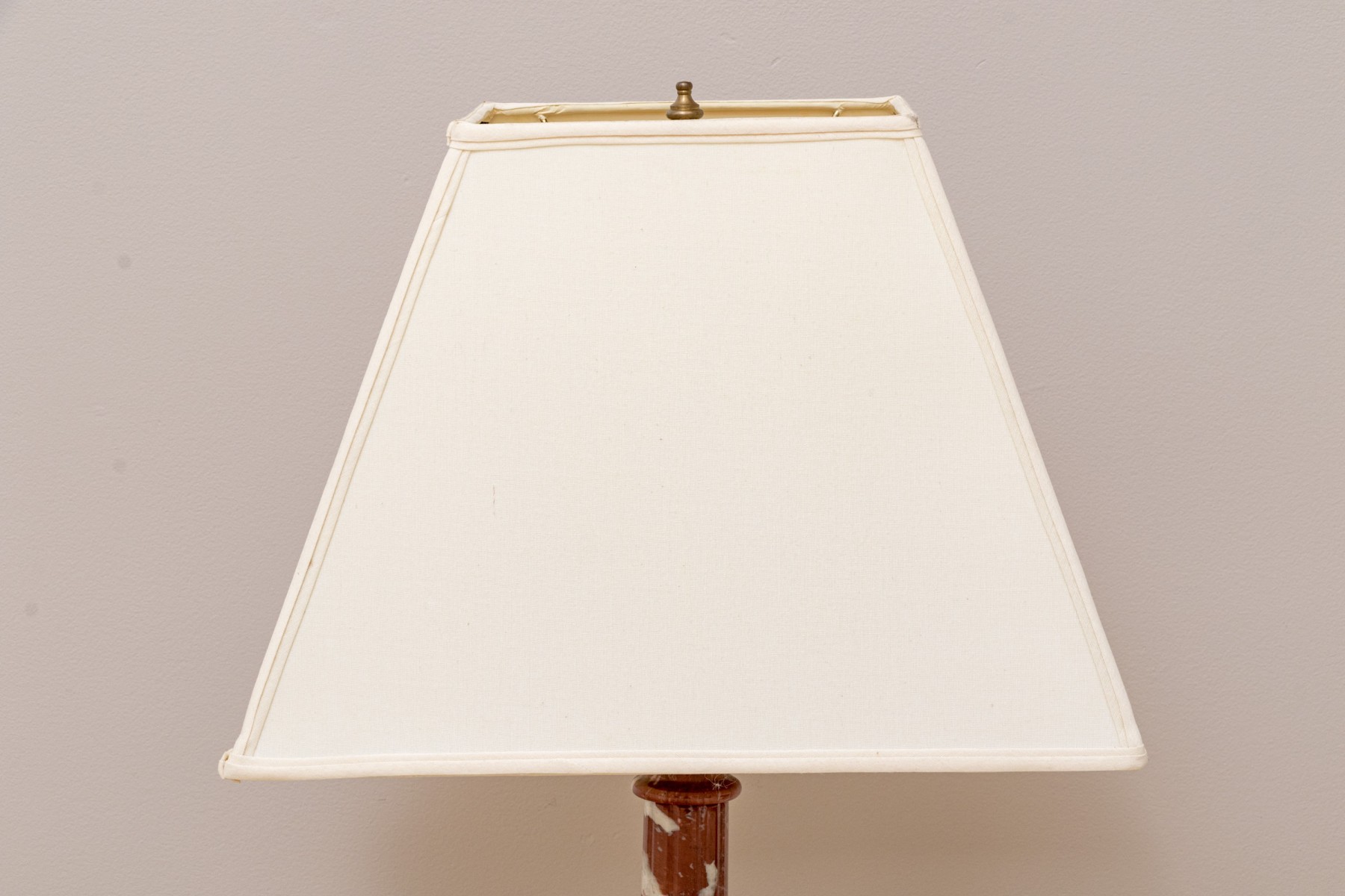 A pair of stately table lamps with Neoclassical appeal, displaying carved red and white marble columns on tiered square bases. Surmounted with white linen empire shades.