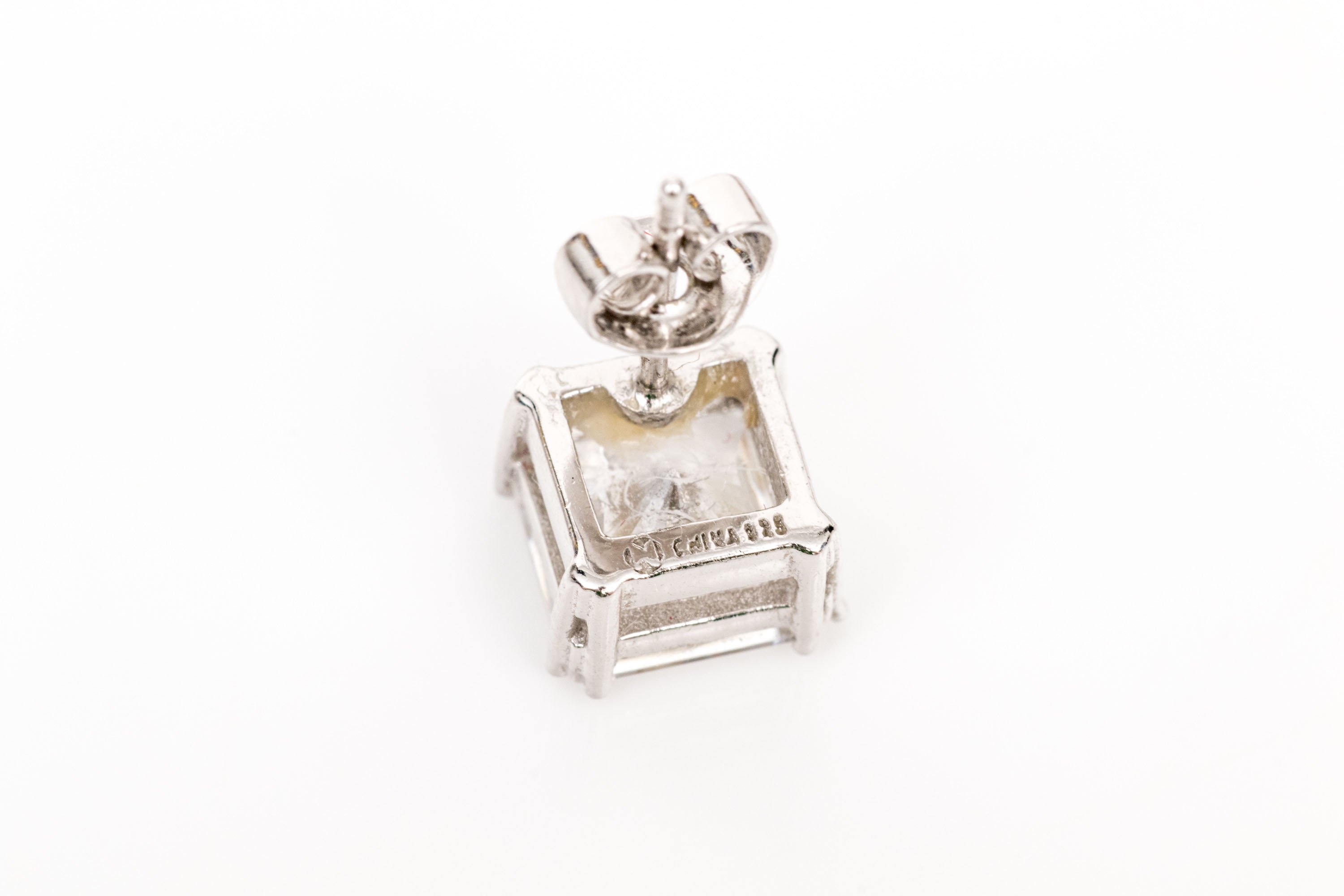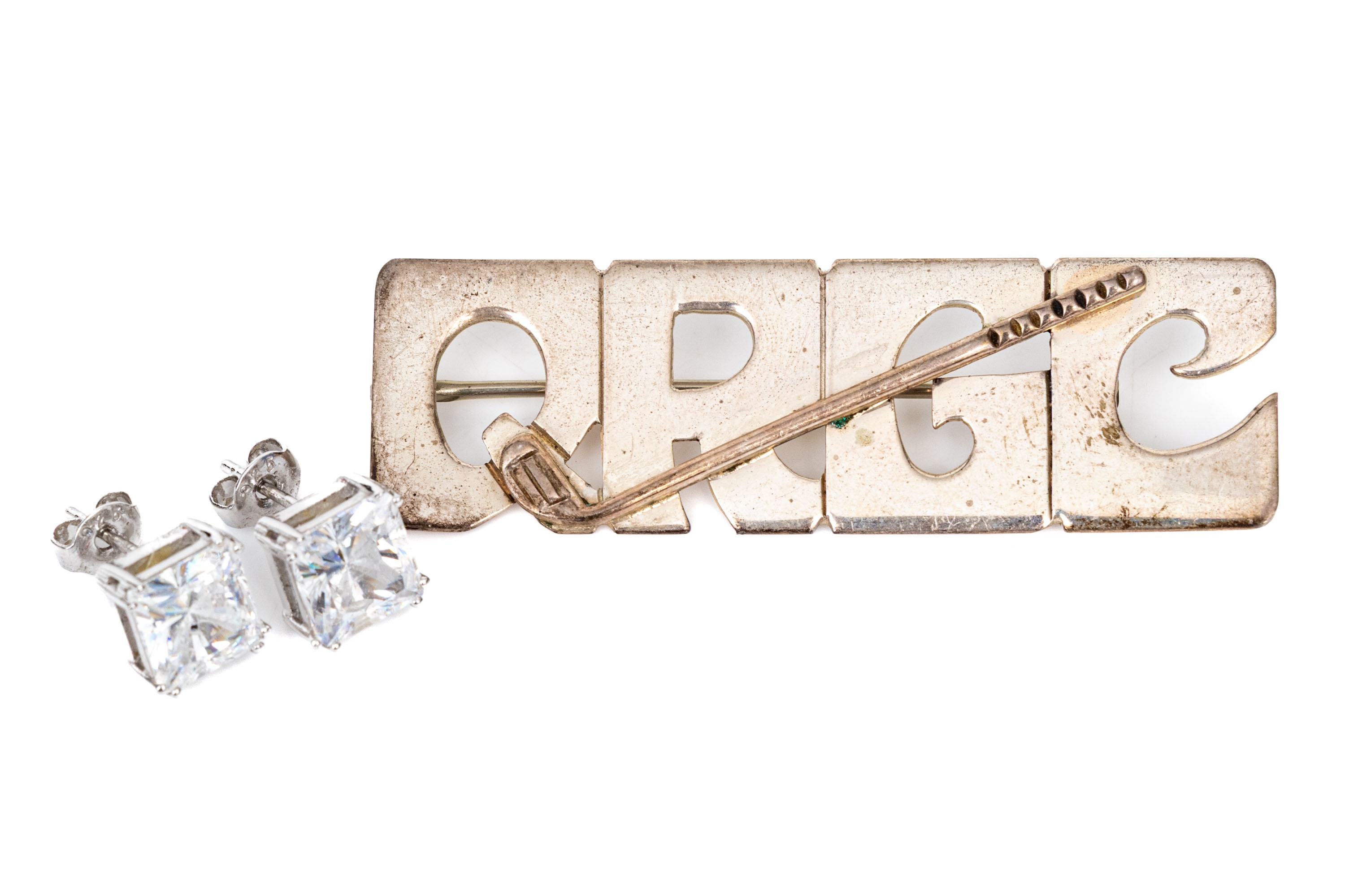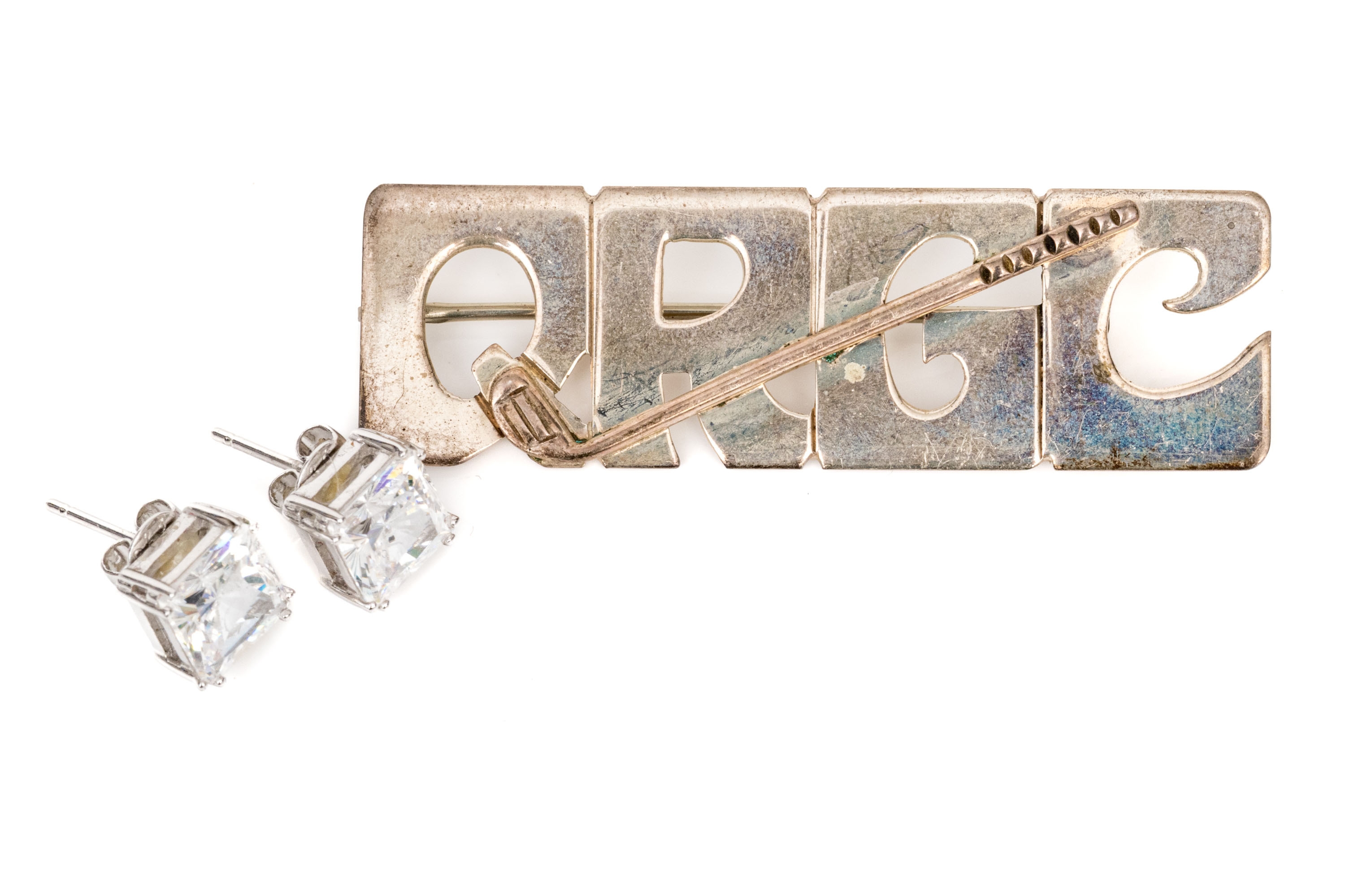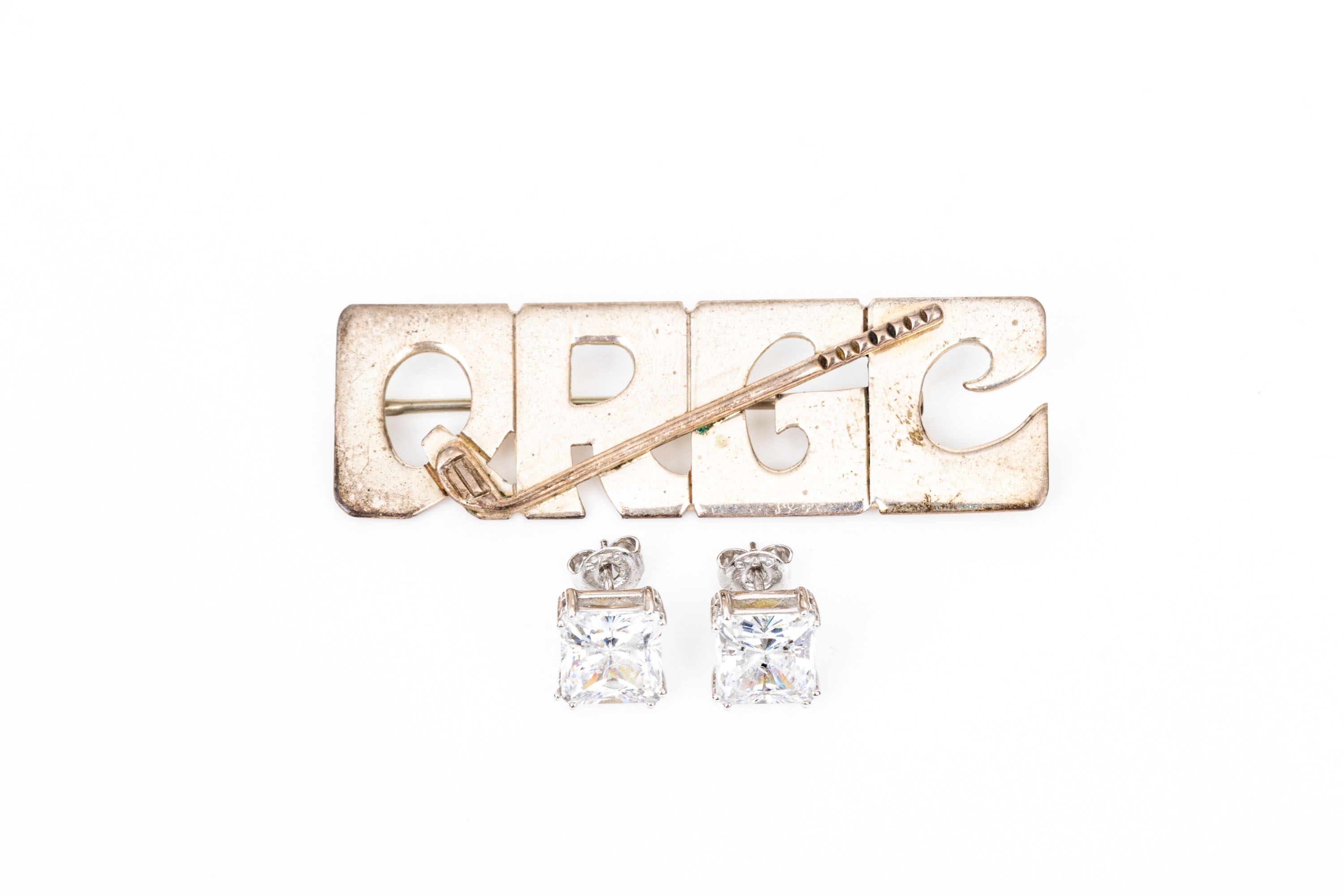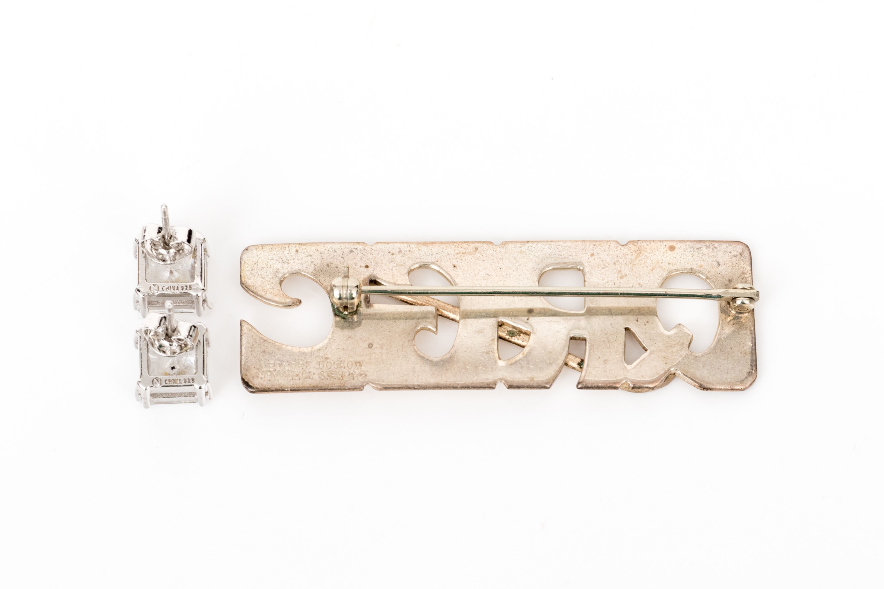Pair of sterling silver jewelry pieces, including stud CZ earrings and a brooch
