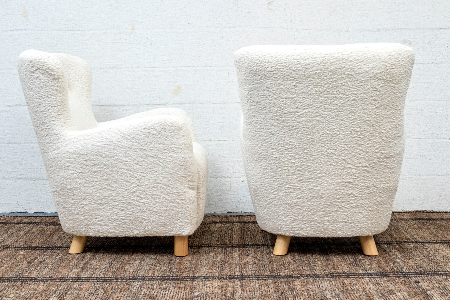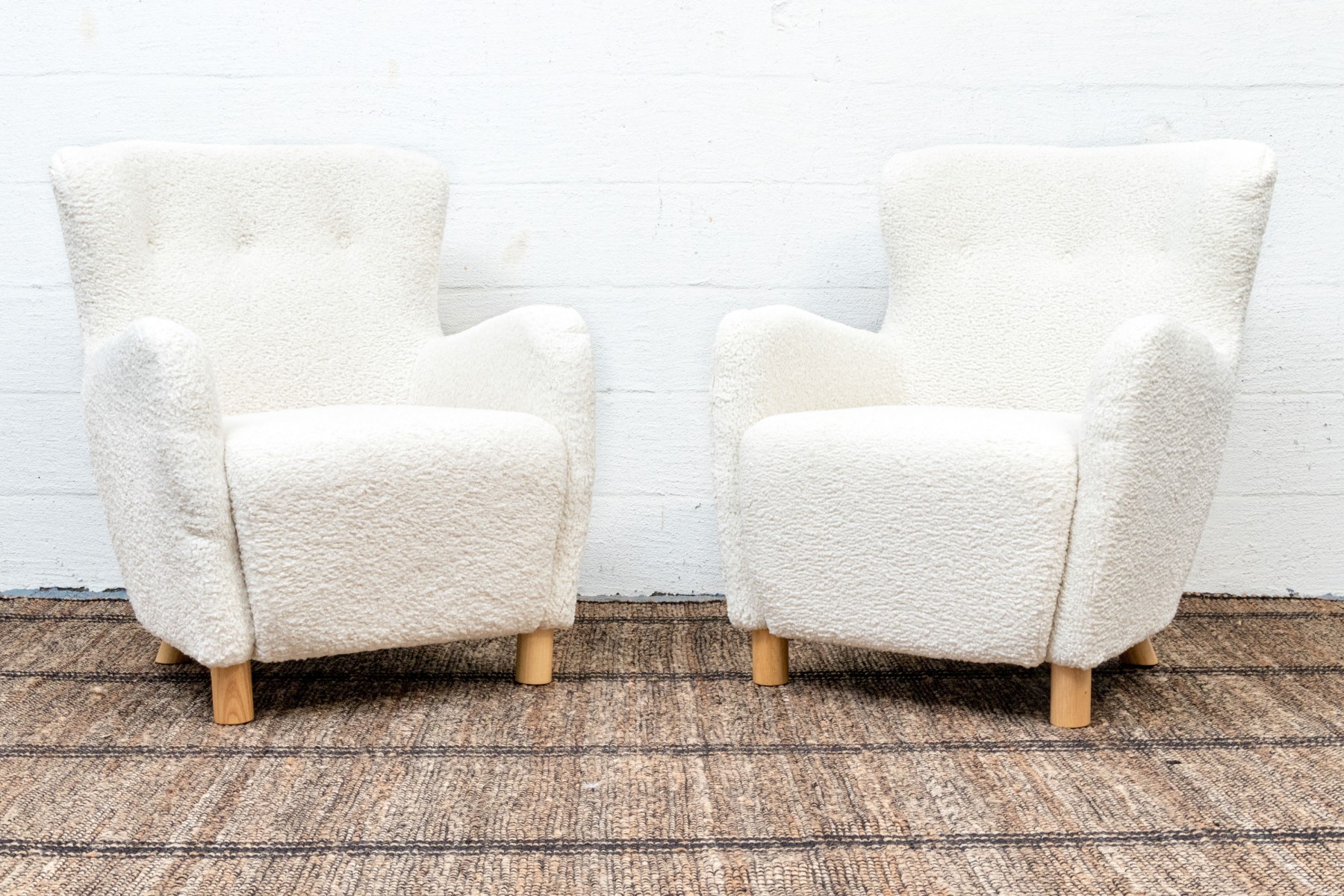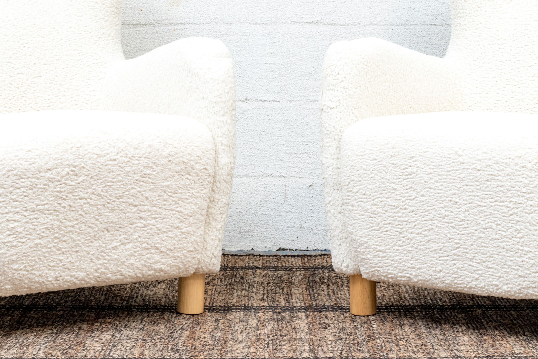 A fabulous pair of Studio McGee and Threshold "Kessler" wingback accent chairs. The traditional forms are elevated with luxurious modernity through comfortable white boucle upholstery, adding a touch of faux shearling elegance. Detailed with three button tufts along the backs and raised on honeyed light brown angled wood legs.