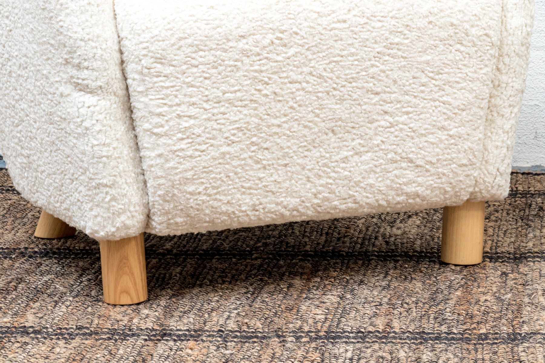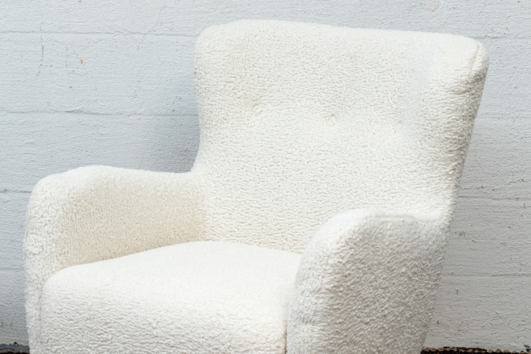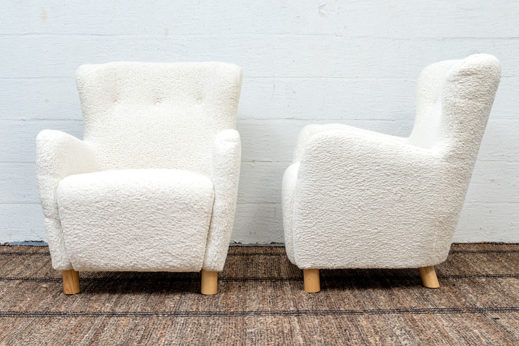 A fabulous pair of Studio McGee and Threshold "Kessler" wingback accent chairs. The traditional forms are elevated with luxurious modernity through comfortable white boucle upholstery, adding a touch of faux shearling elegance. Detailed with three button tufts along the backs and raised on honeyed light brown angled wood legs.