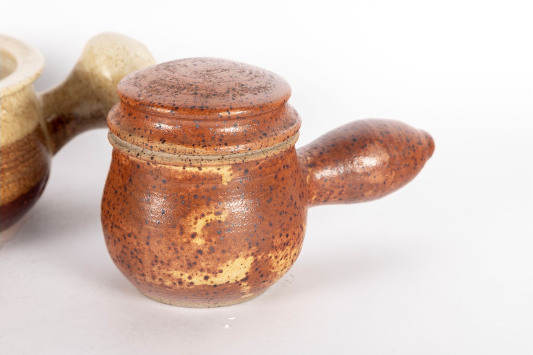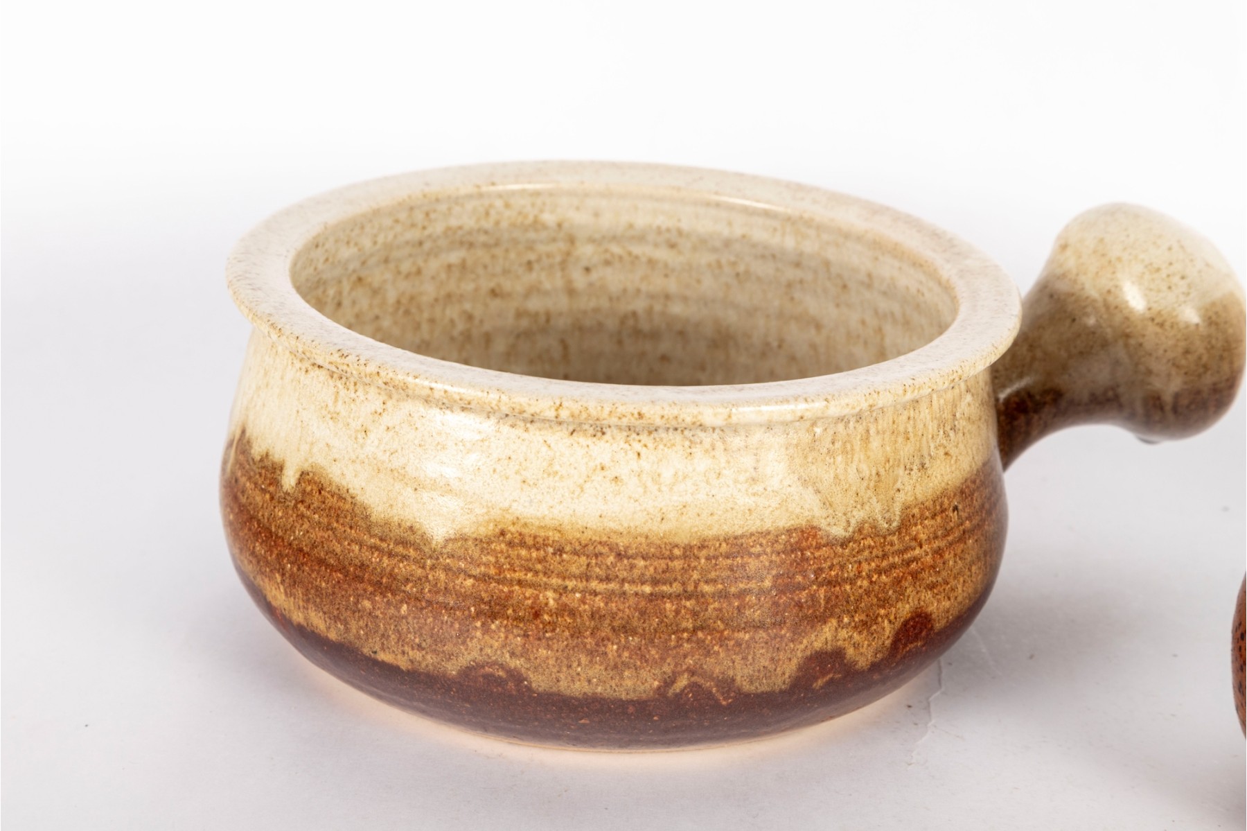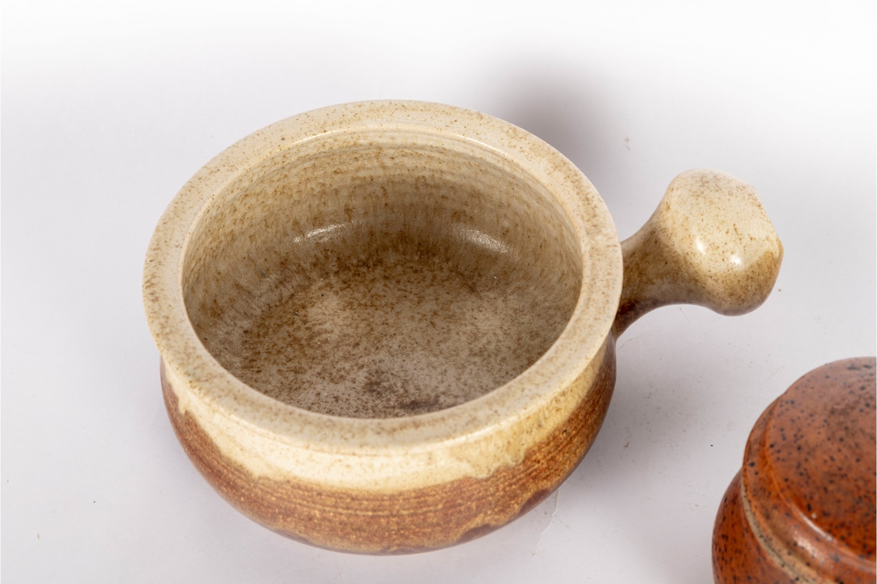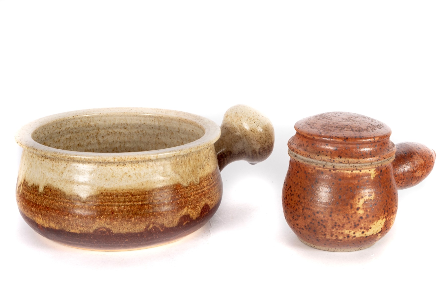 Two lovely studio pottery examples — stoneware soup bowls with mottled matte glazes and large handles. The smaller example is signed with original lid.