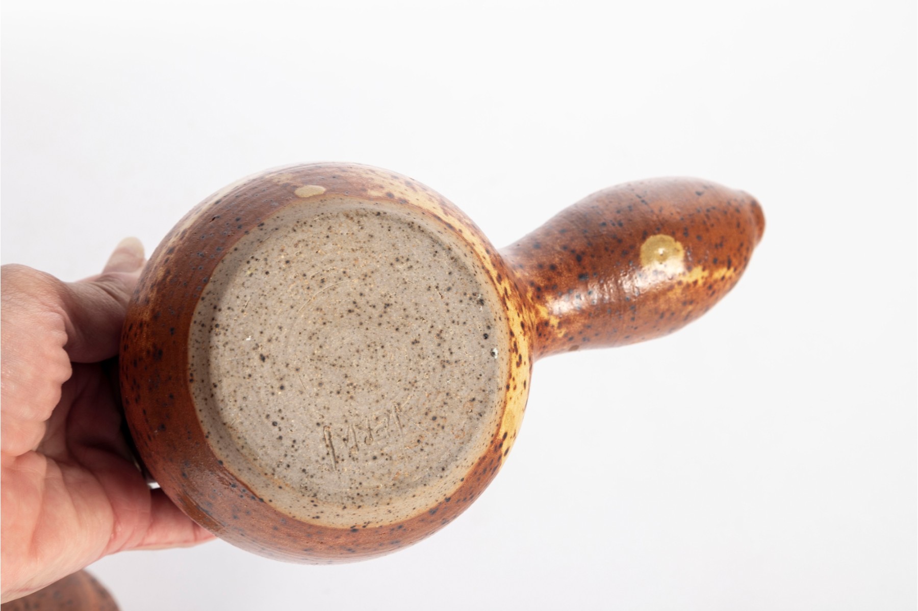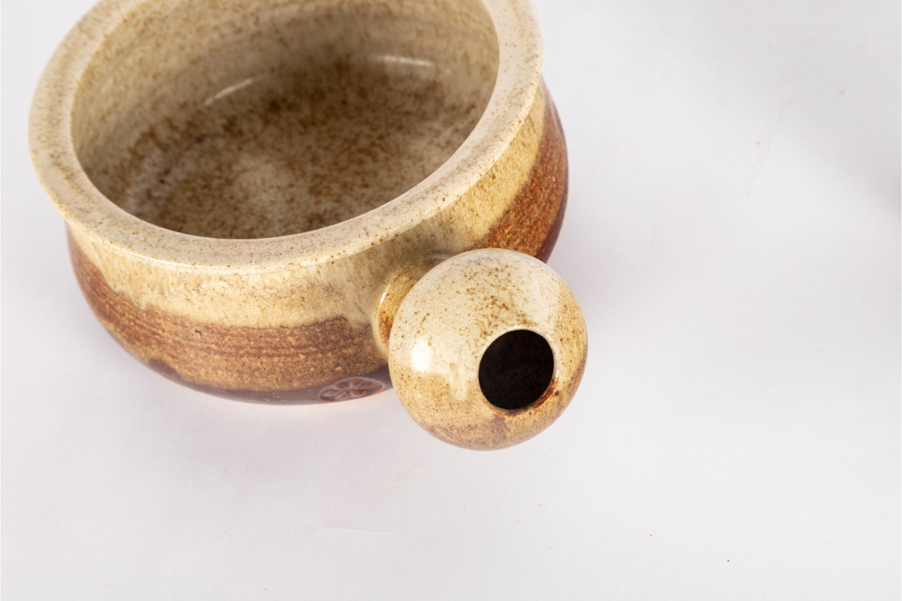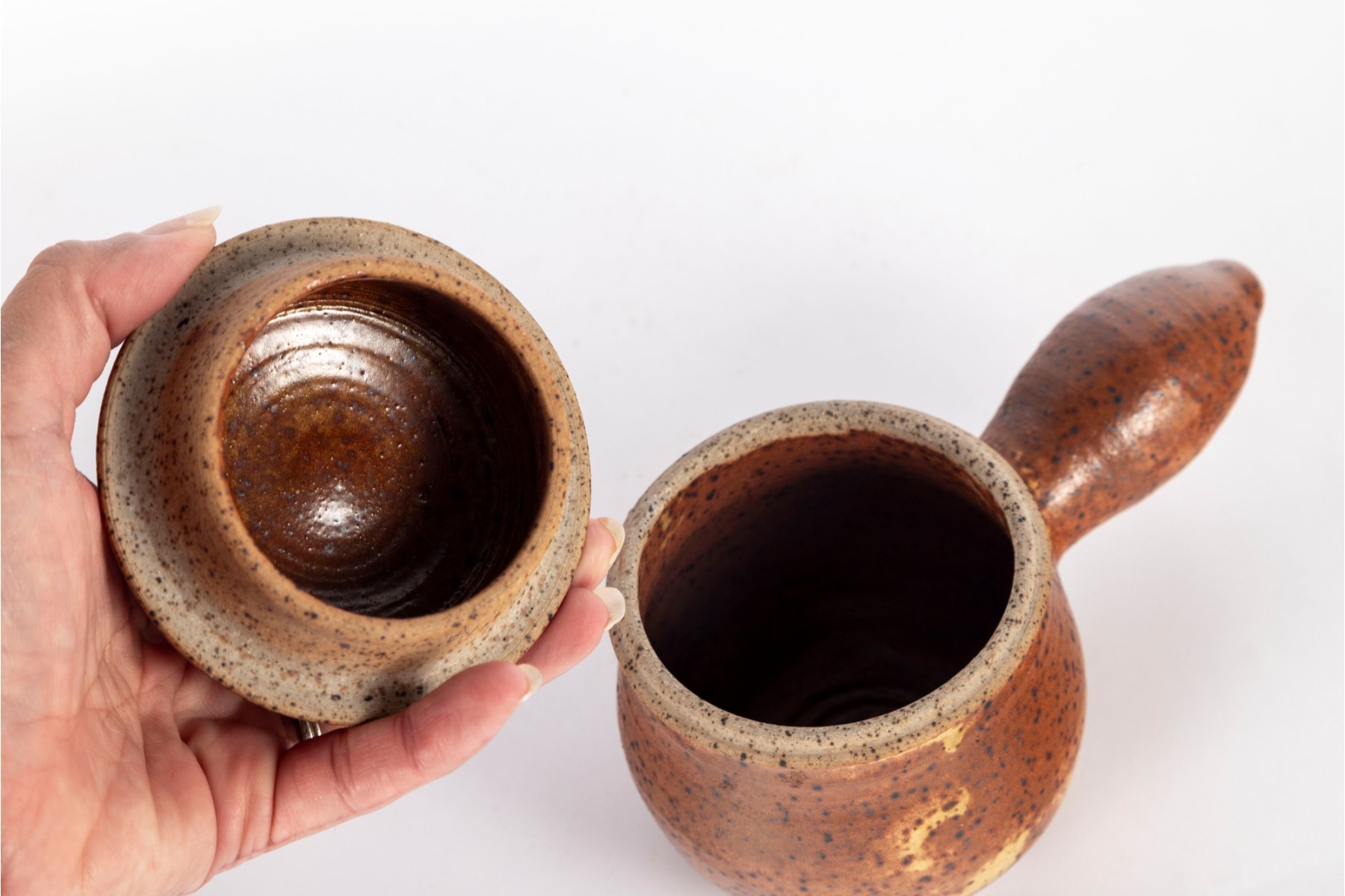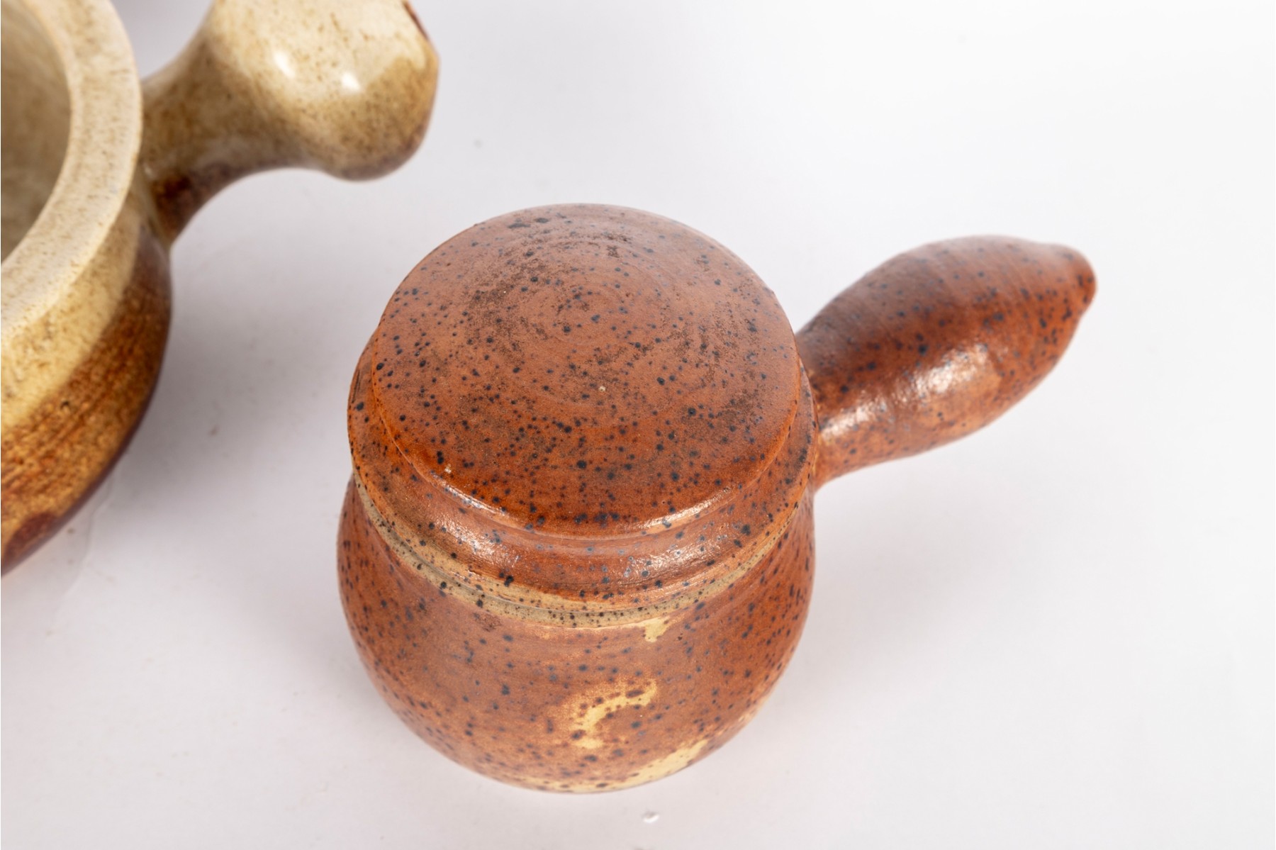 Two lovely studio pottery examples — stoneware soup bowls with mottled matte glazes and large handles. The smaller example is signed with original lid.