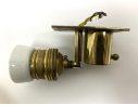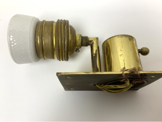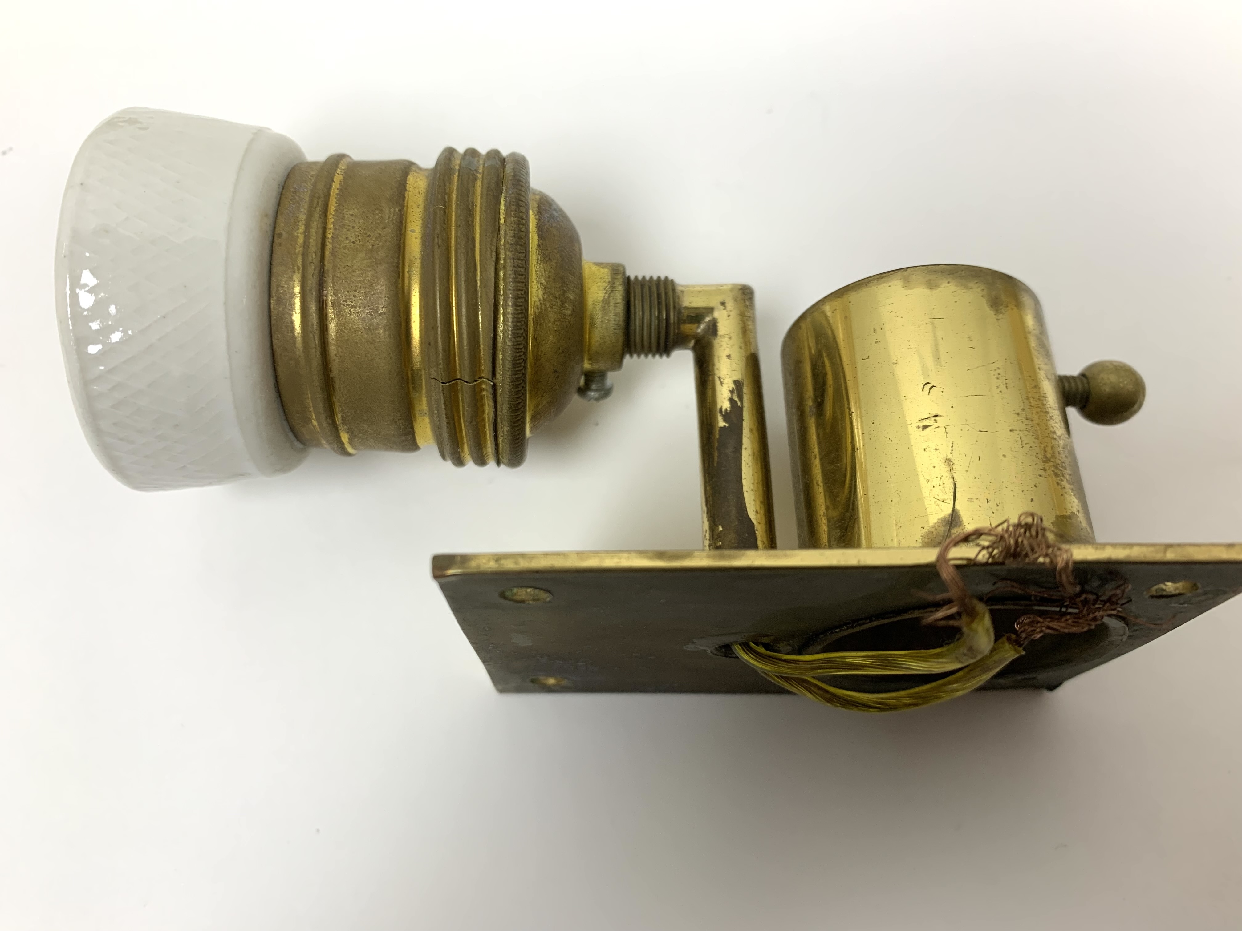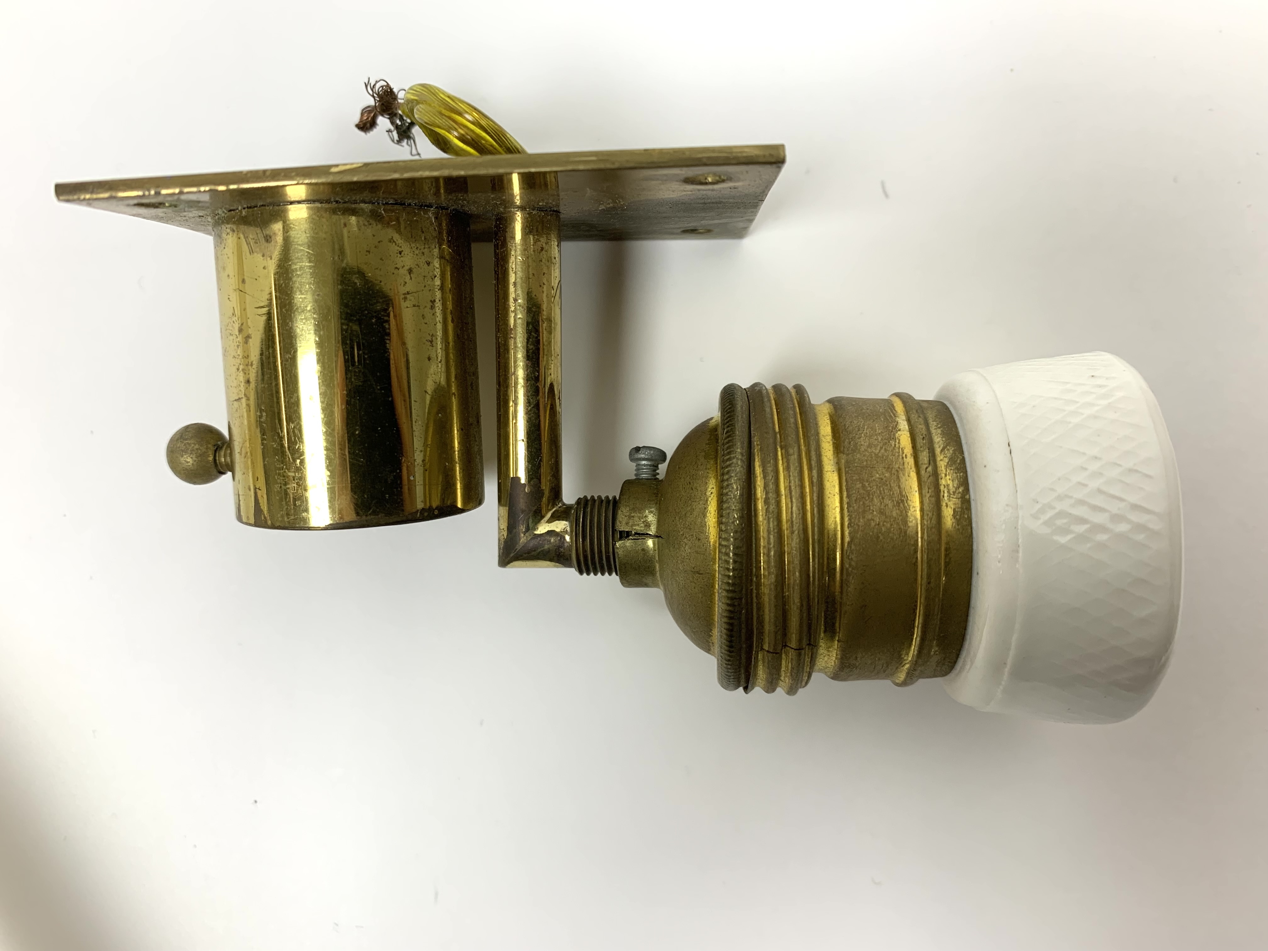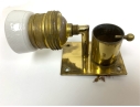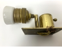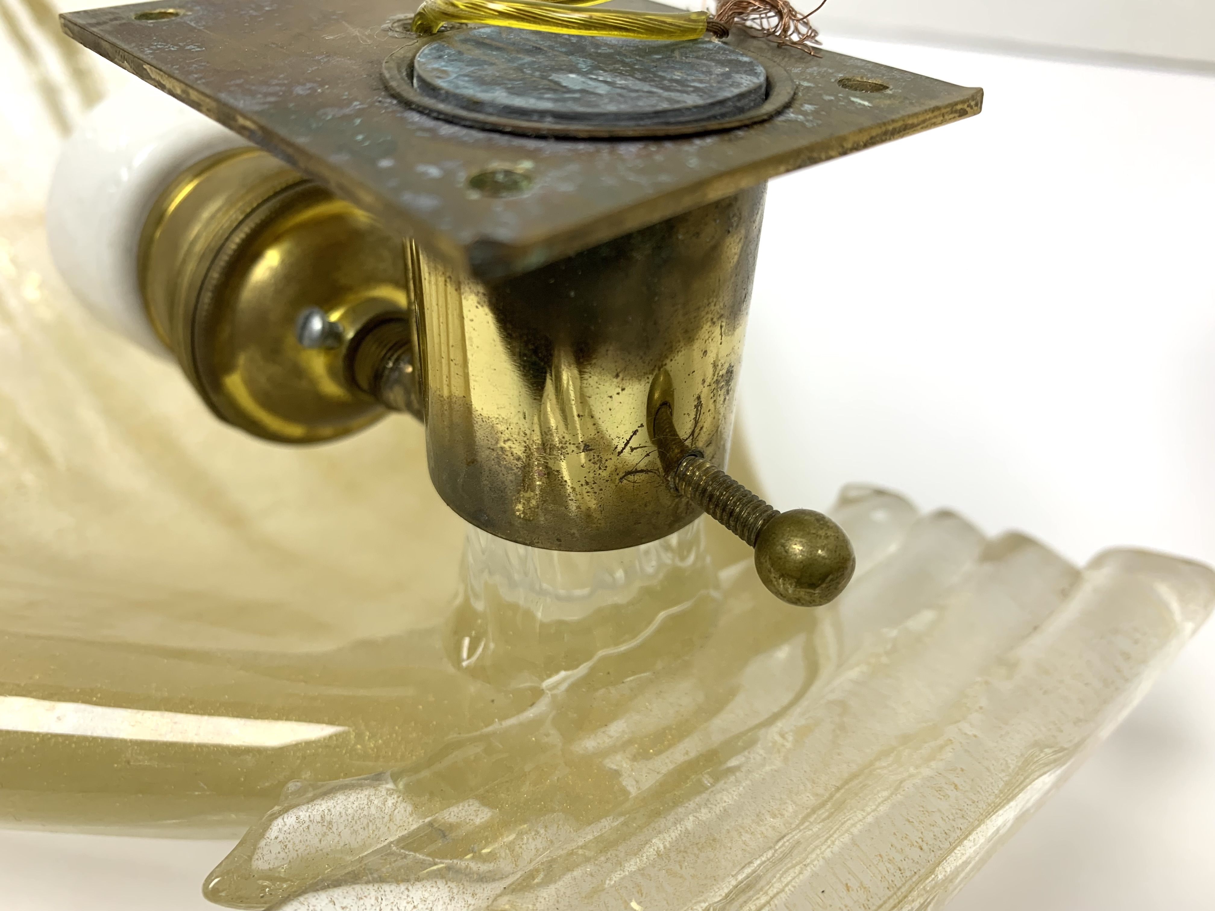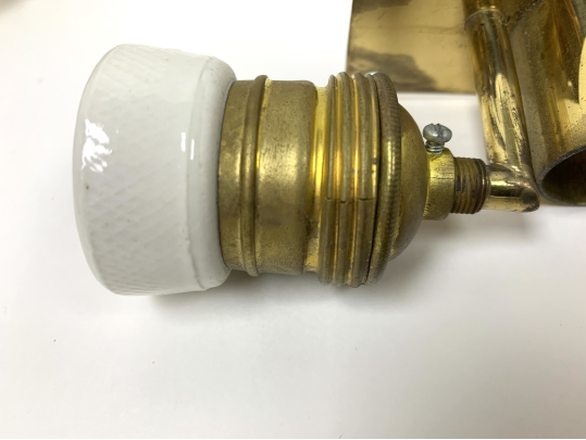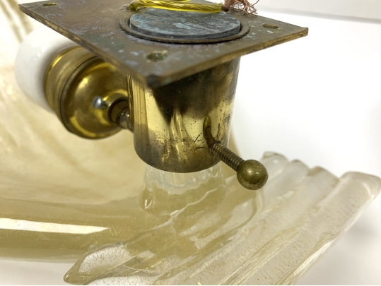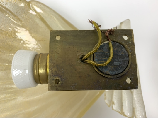 Condition: one sconce with an 3/8" internal fracture (see photo), fine hairlines to both of the brass sockets, oxidation to the brass back-plates and sockets.