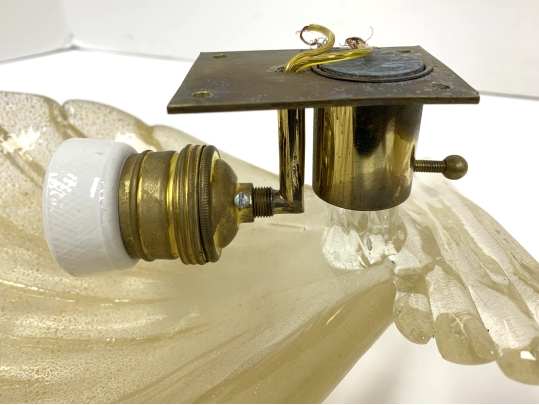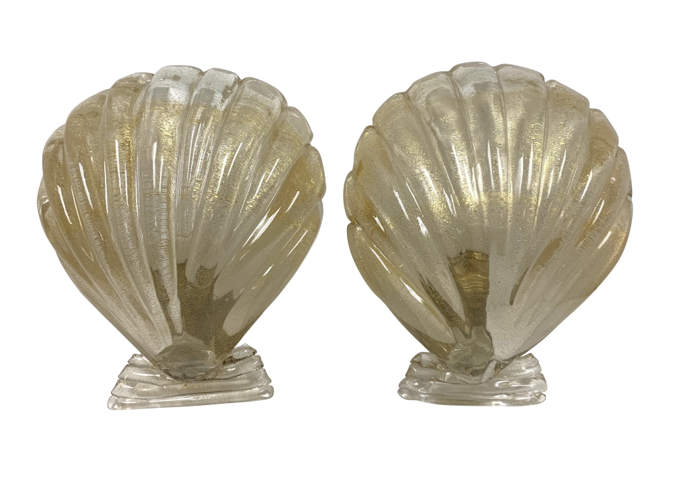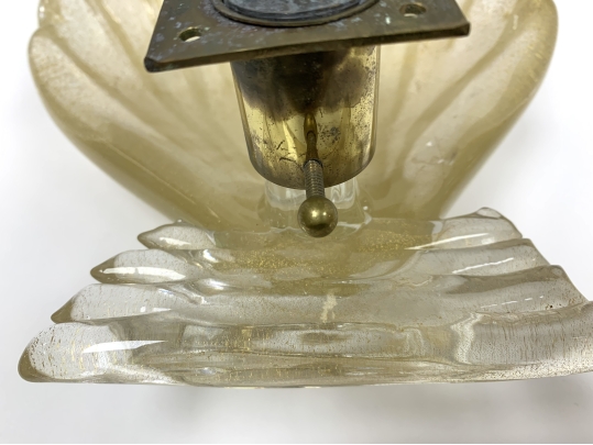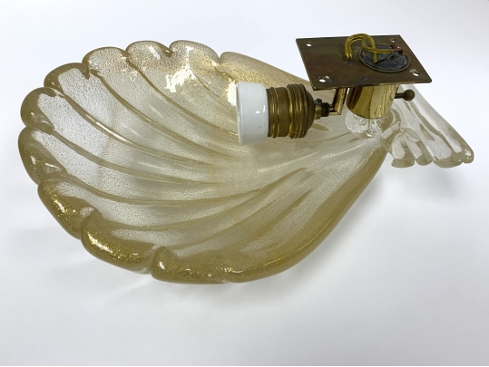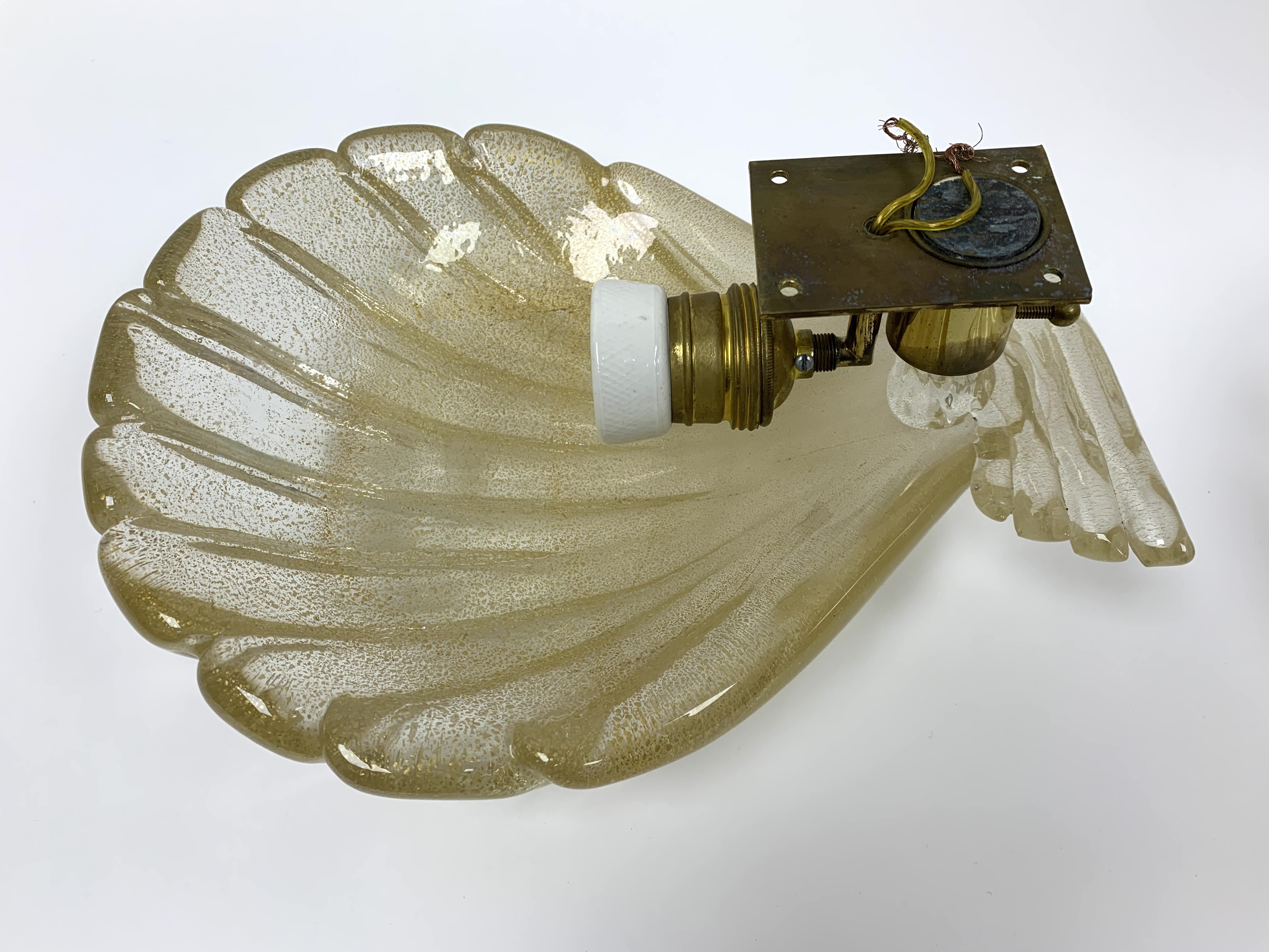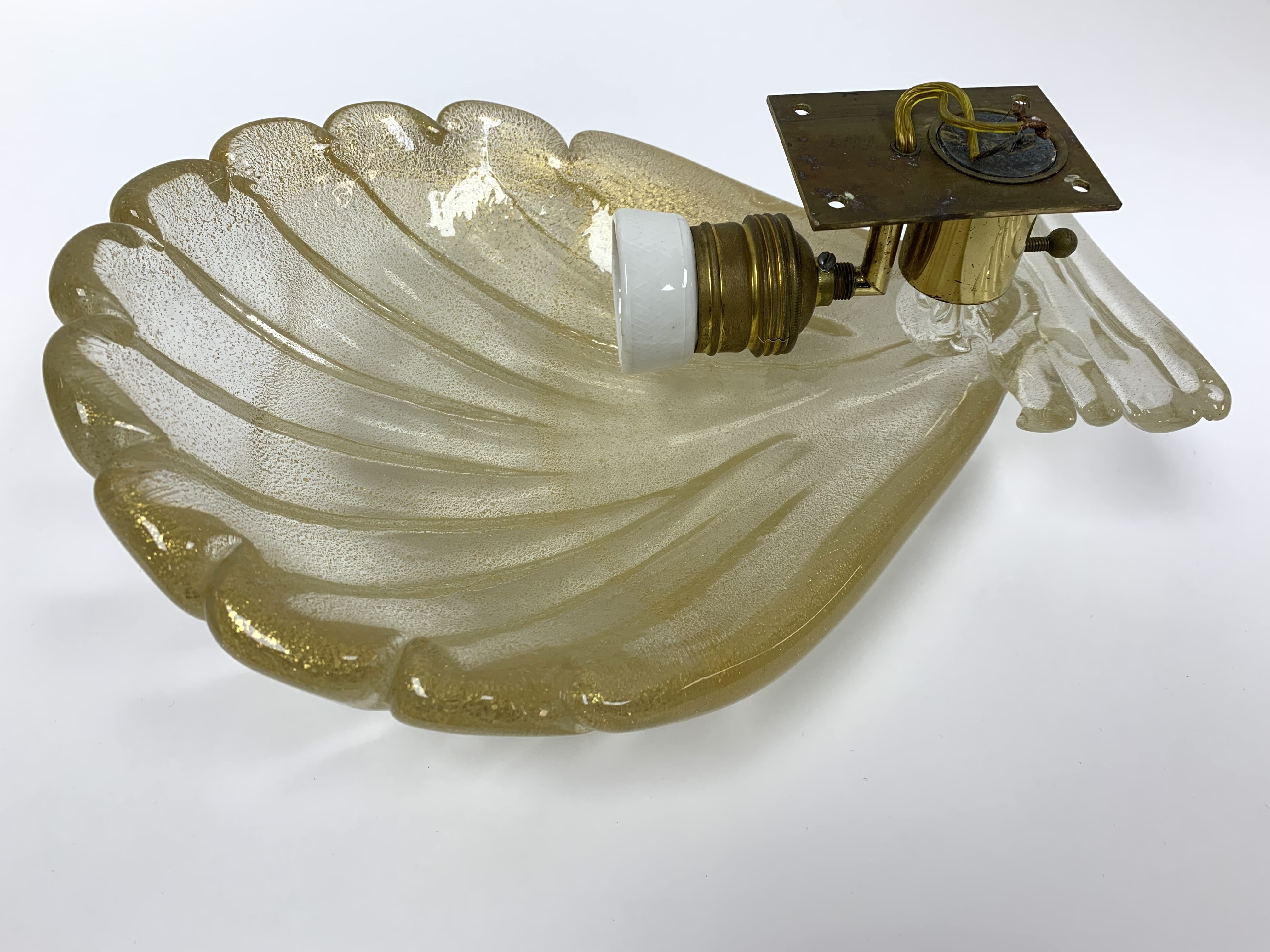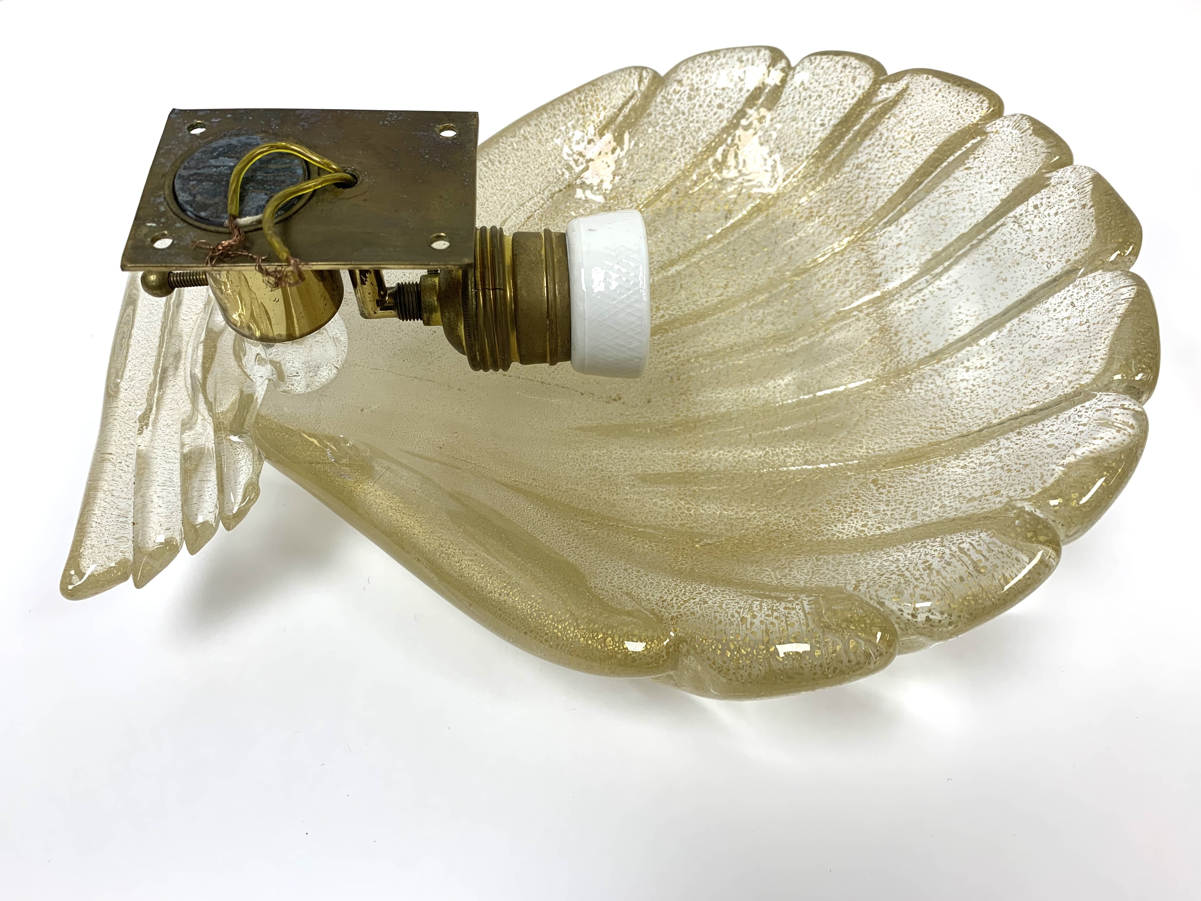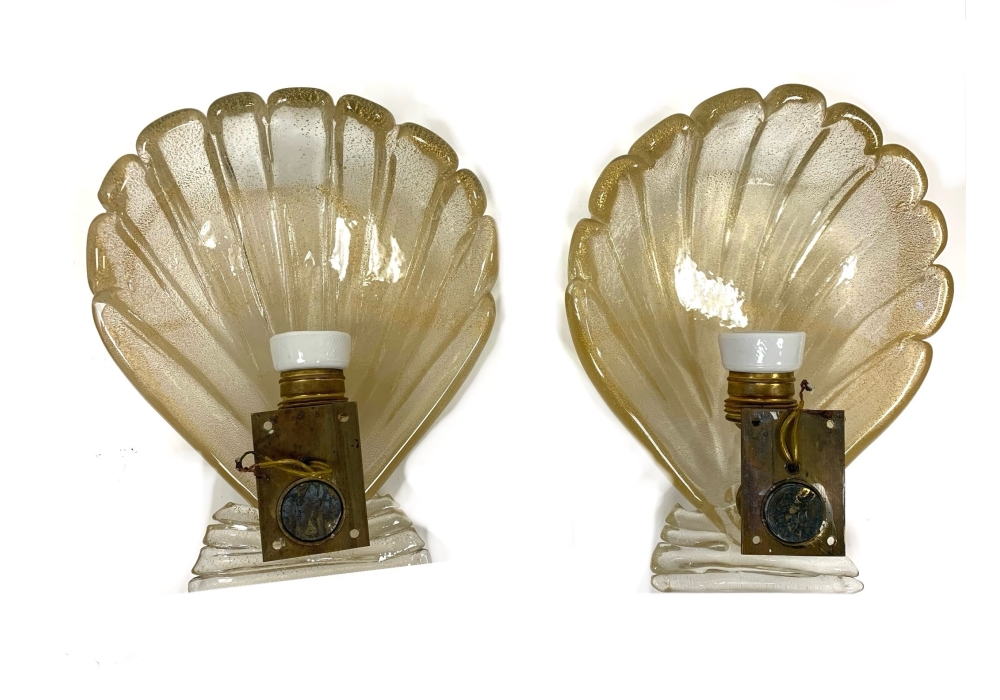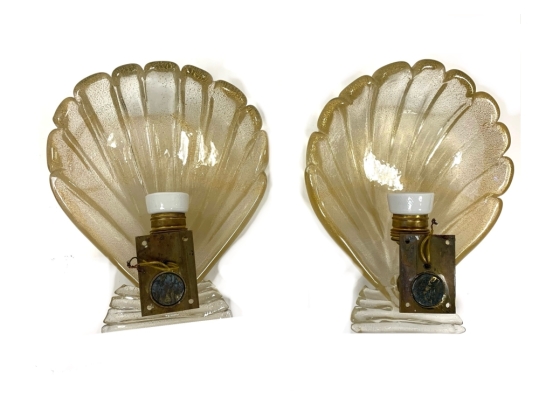 Pair of Murano art glass wall sconces with shell form having distinctive gold flecks throughout. The shell is surmounted on a horizontal reeded base. Comes with brass backplate with a porcelain socket.