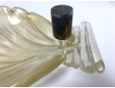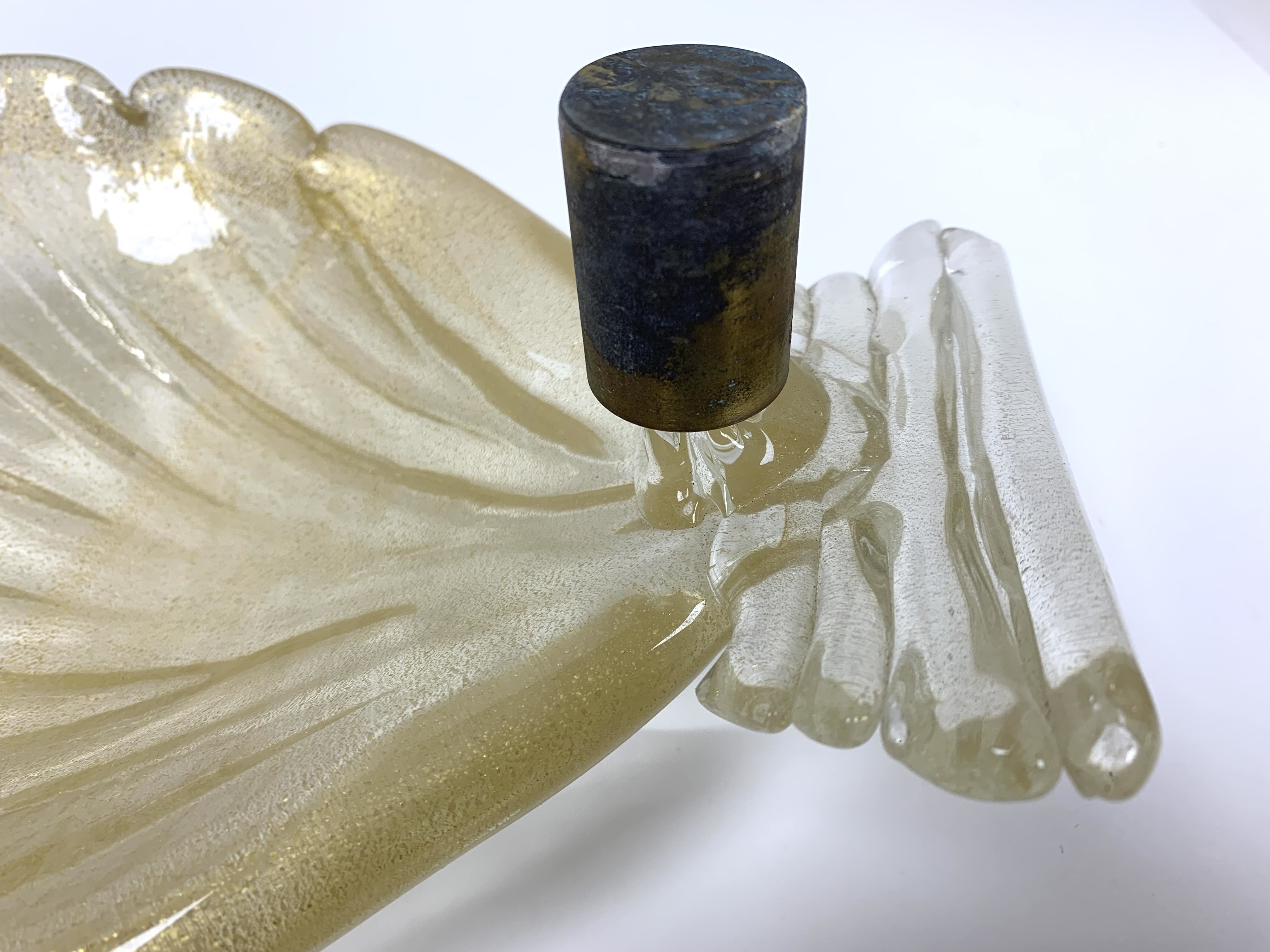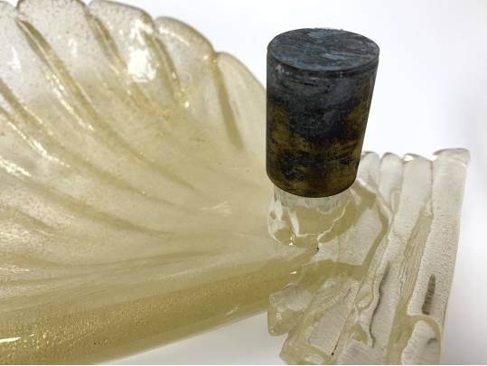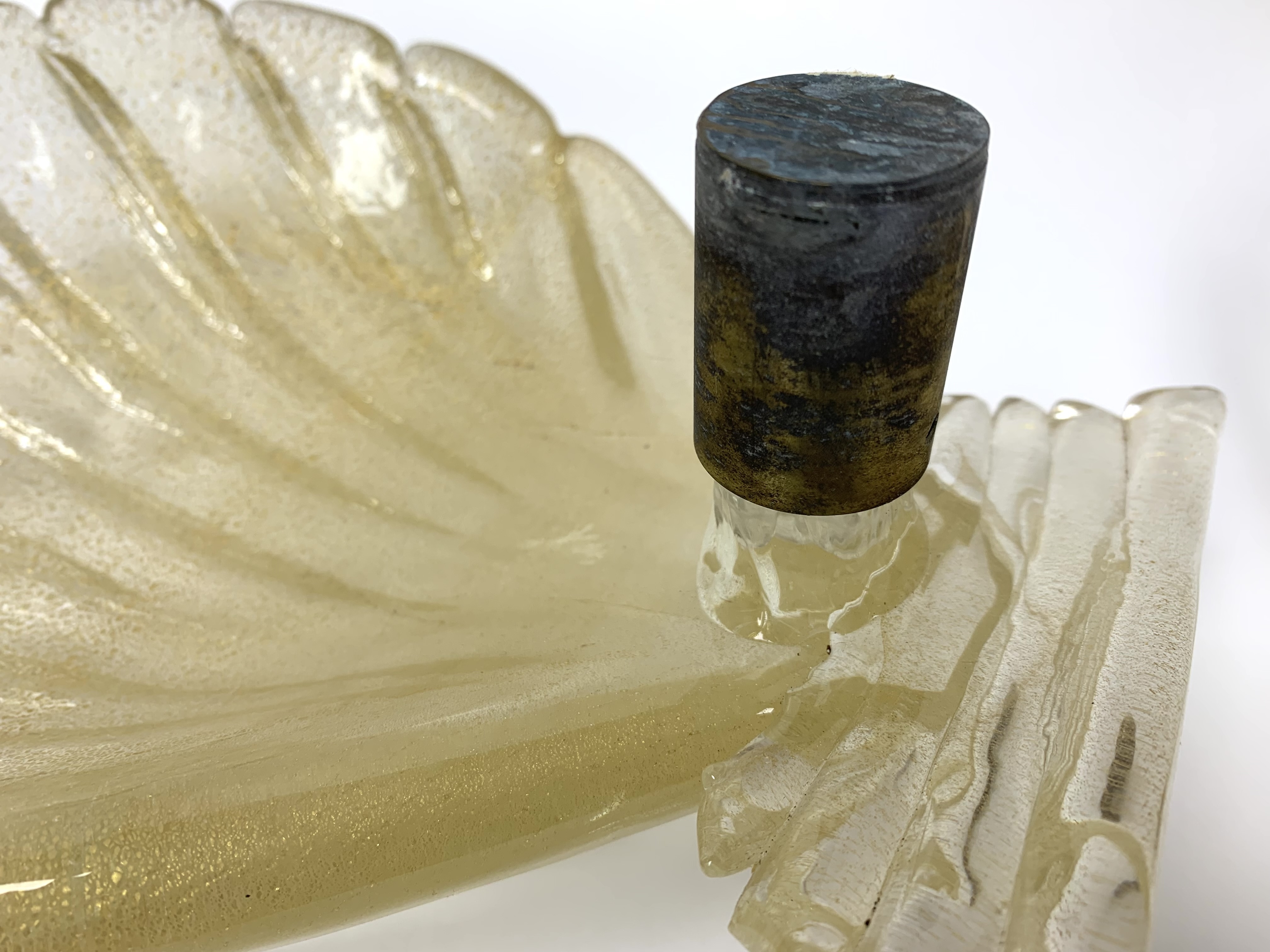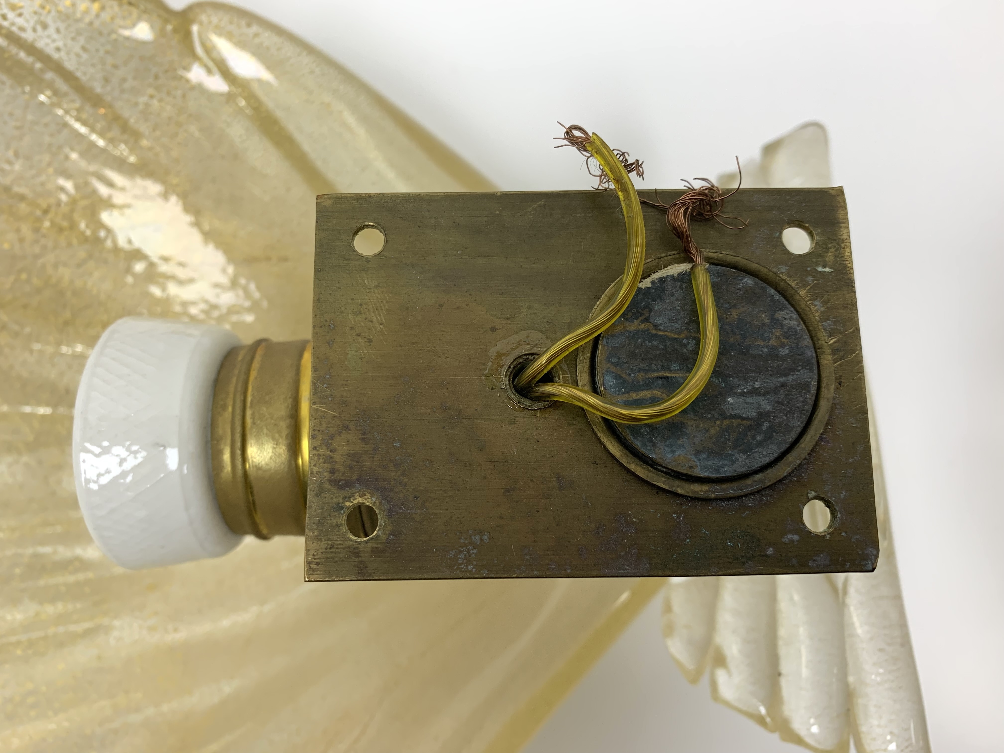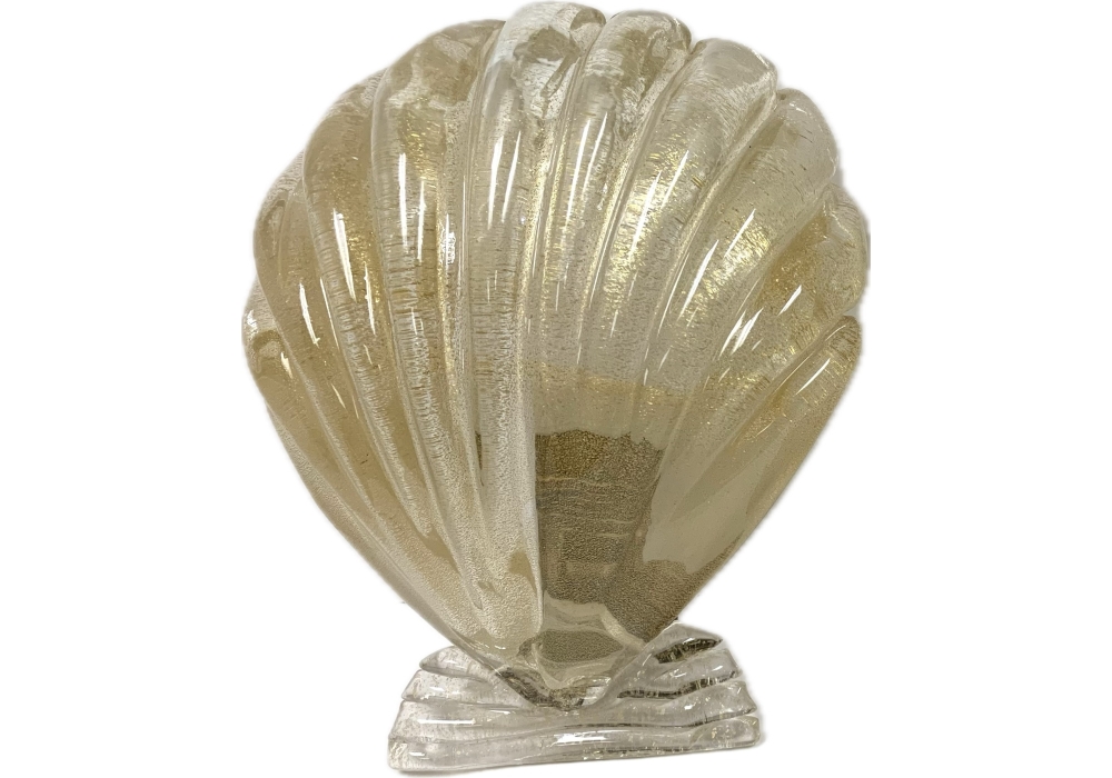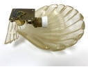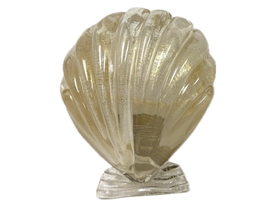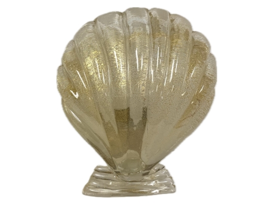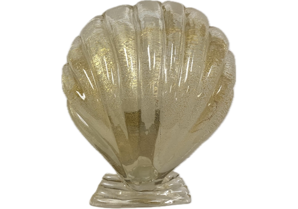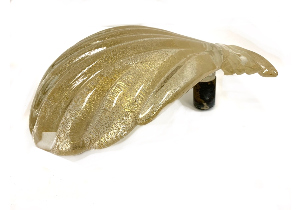 Pair of Murano art glass wall sconces with shell form having distinctive gold flecks throughout. The shell is surmounted on a horizontal reeded base. Comes with brass backplate with a porcelain socket.