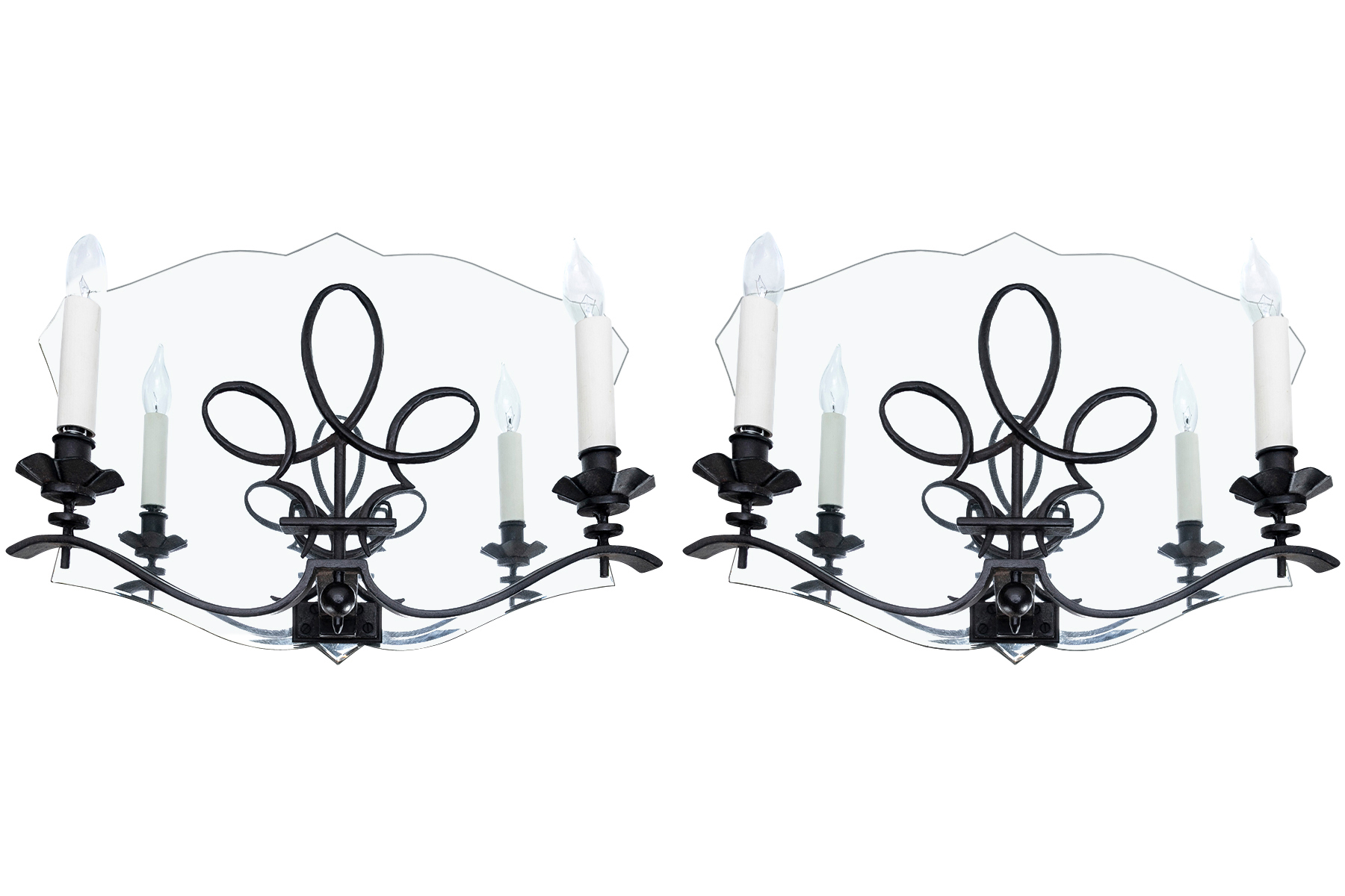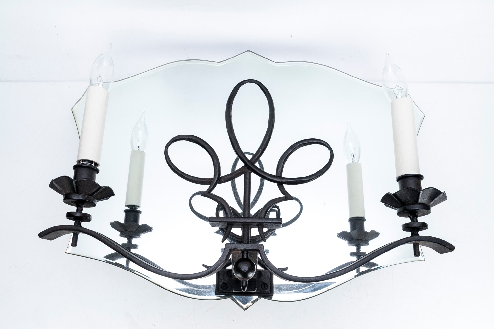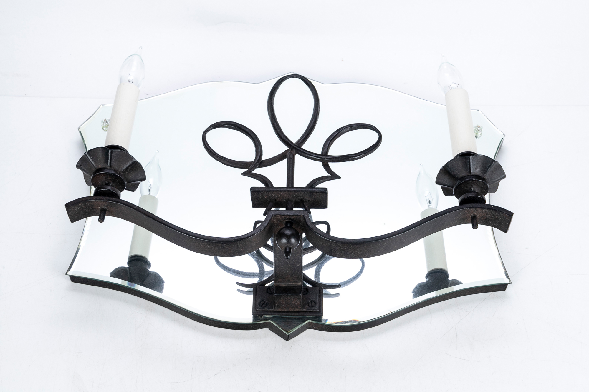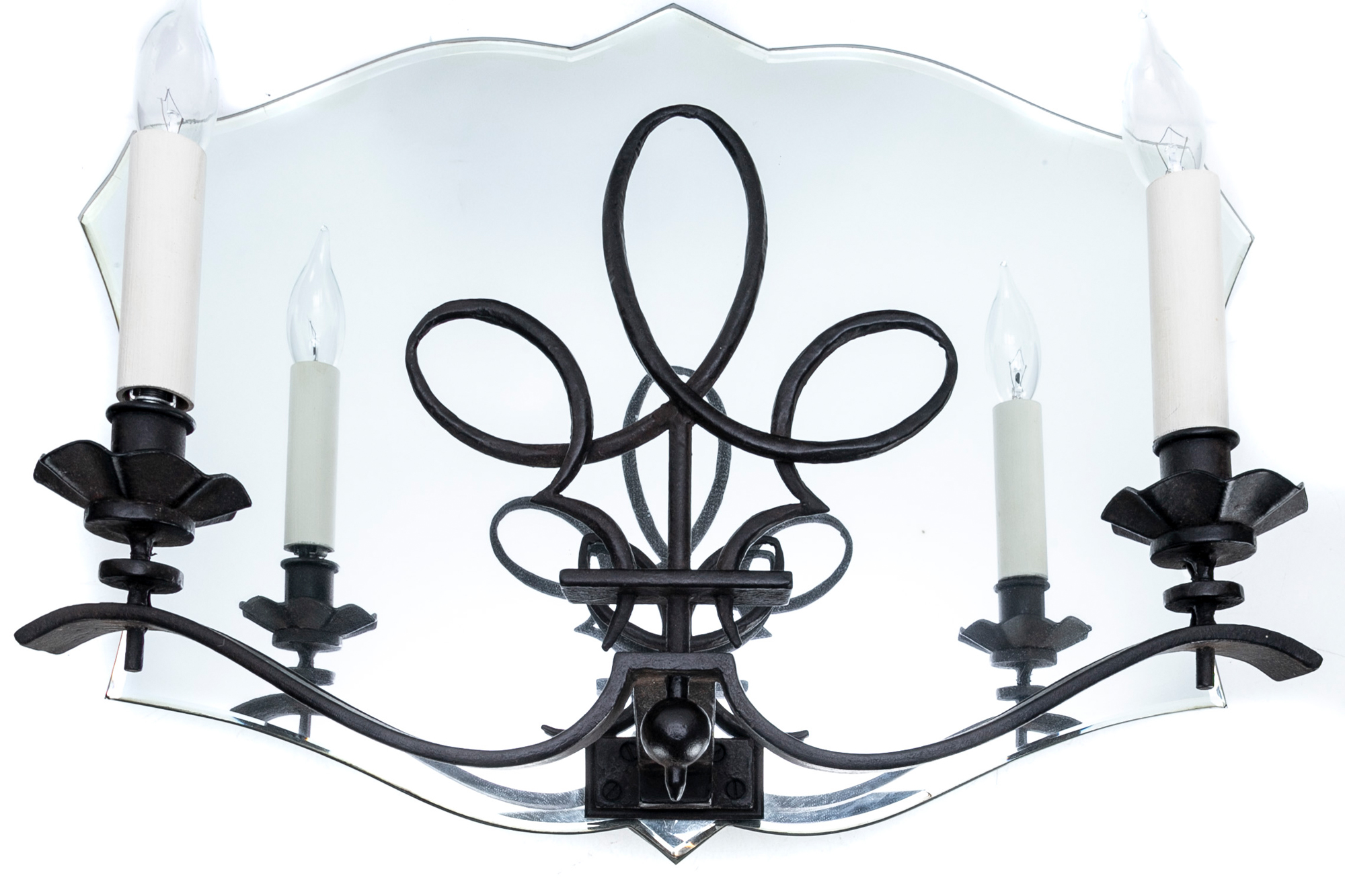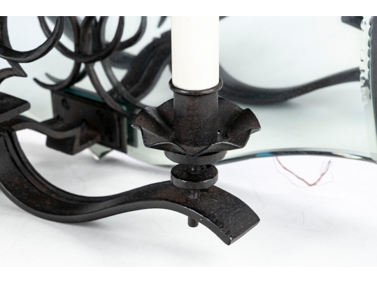 Pair of Paul Ferrante mirrored shield form wall sconces with two lights having a center trefoil motif. The mirrors with bevel cut edge throughout, cut crescent design to left and right side and secured with two glass rosettes. The sconces are heavy with a prominent center band holding the scalloped bobeches and having a center ball terminal. A second lens shaped double loop iron motif lies against the mirror behind the center band.