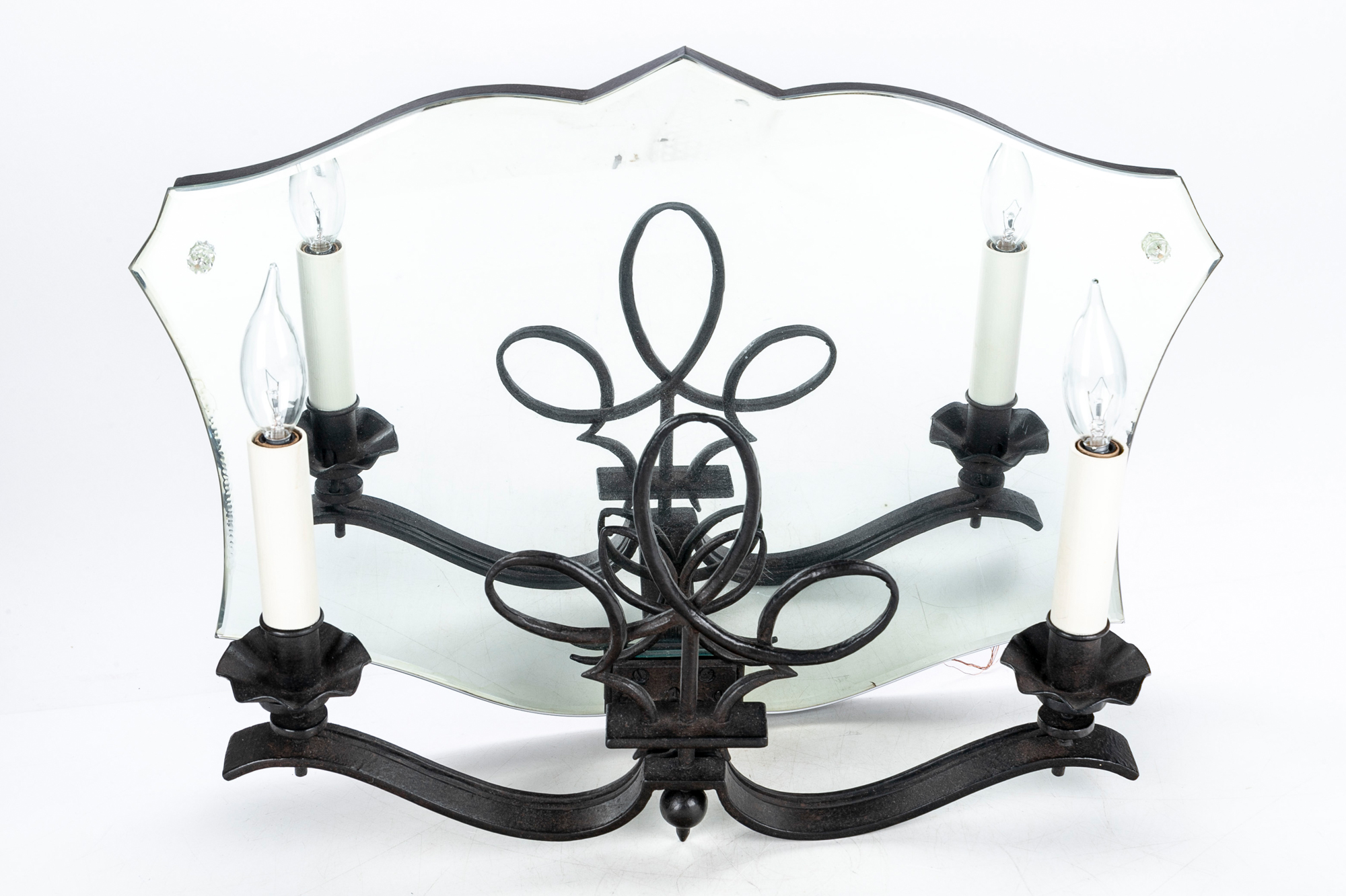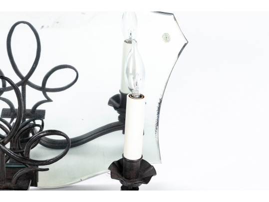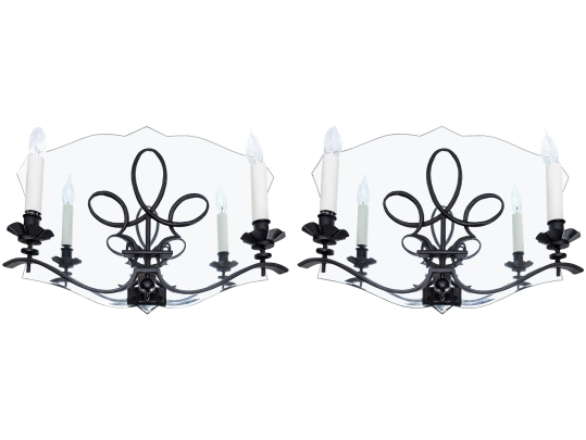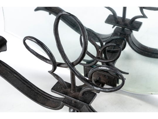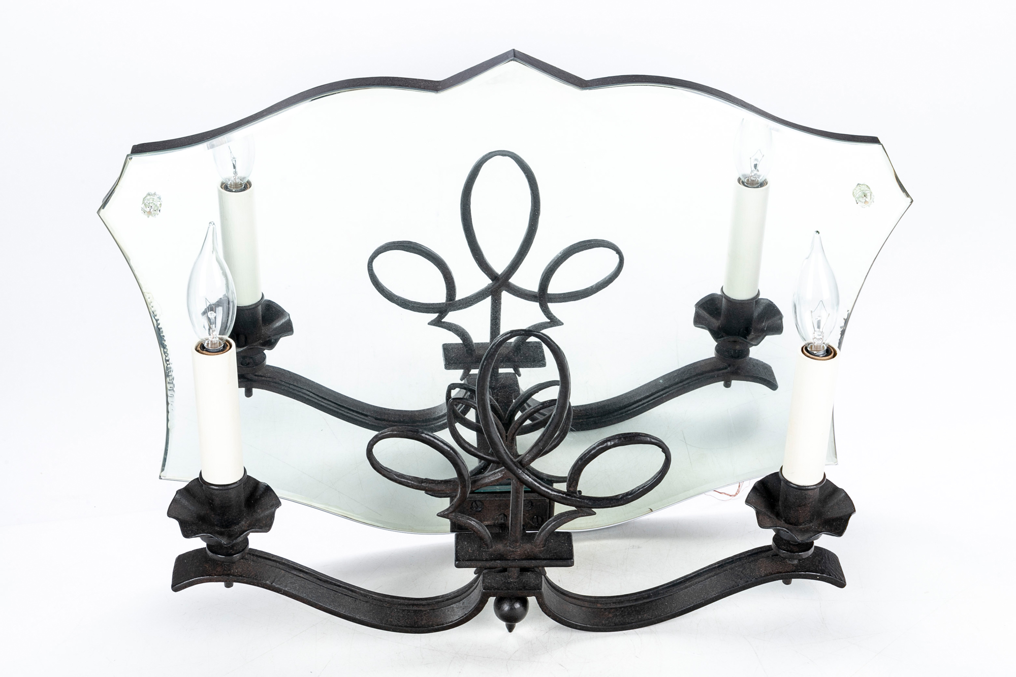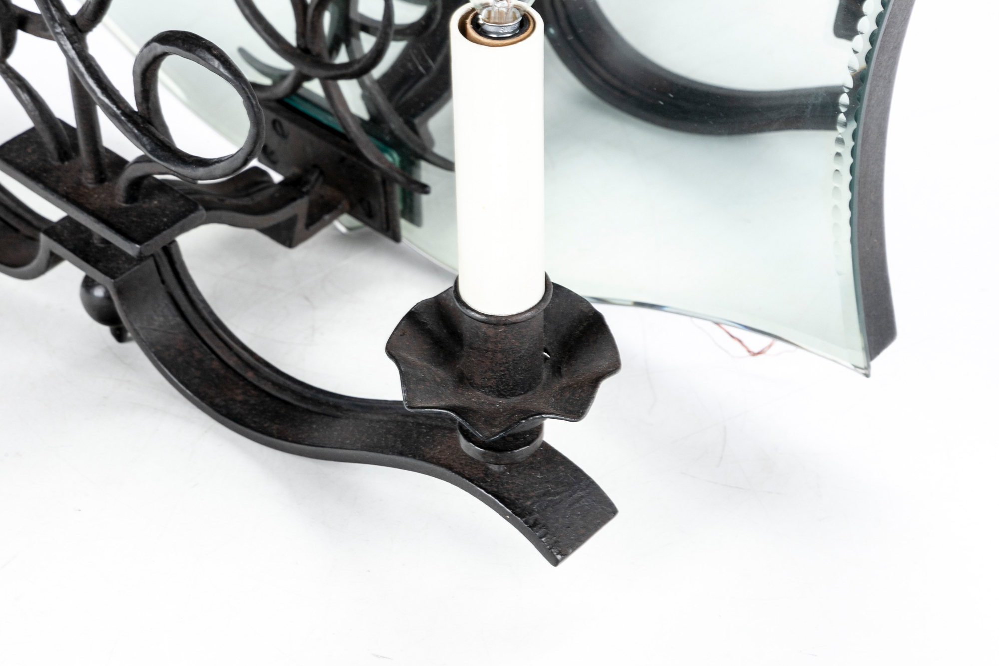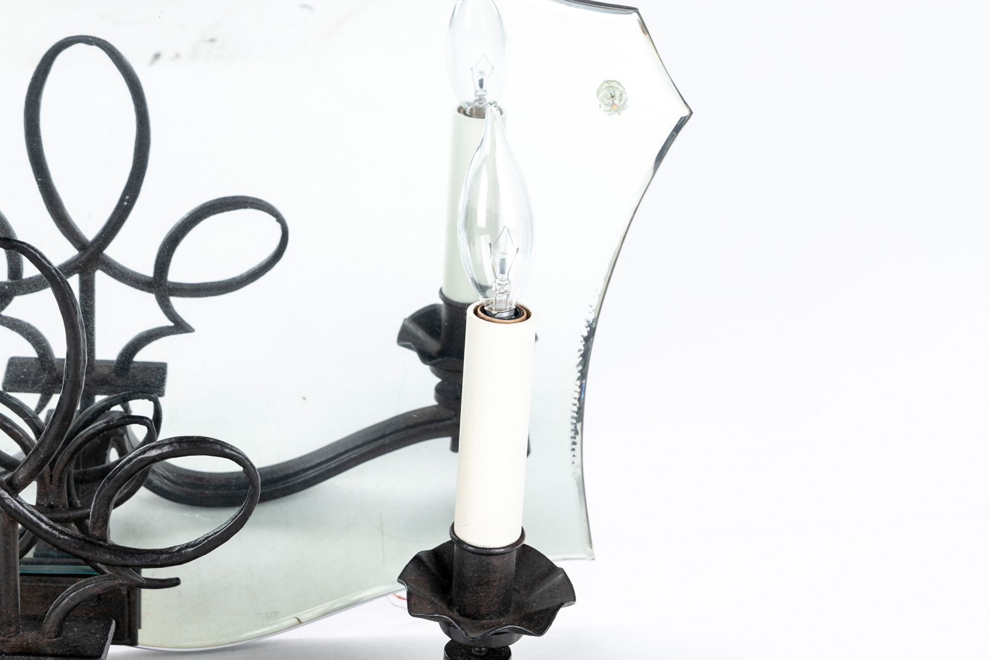 Pair of Paul Ferrante mirrored shield form wall sconces with two lights having a center trefoil motif. The mirrors with bevel cut edge throughout, cut crescent design to left and right side and secured with two glass rosettes. The sconces are heavy with a prominent center band holding the scalloped bobeches and having a center ball terminal. A second lens shaped double loop iron motif lies against the mirror behind the center band.