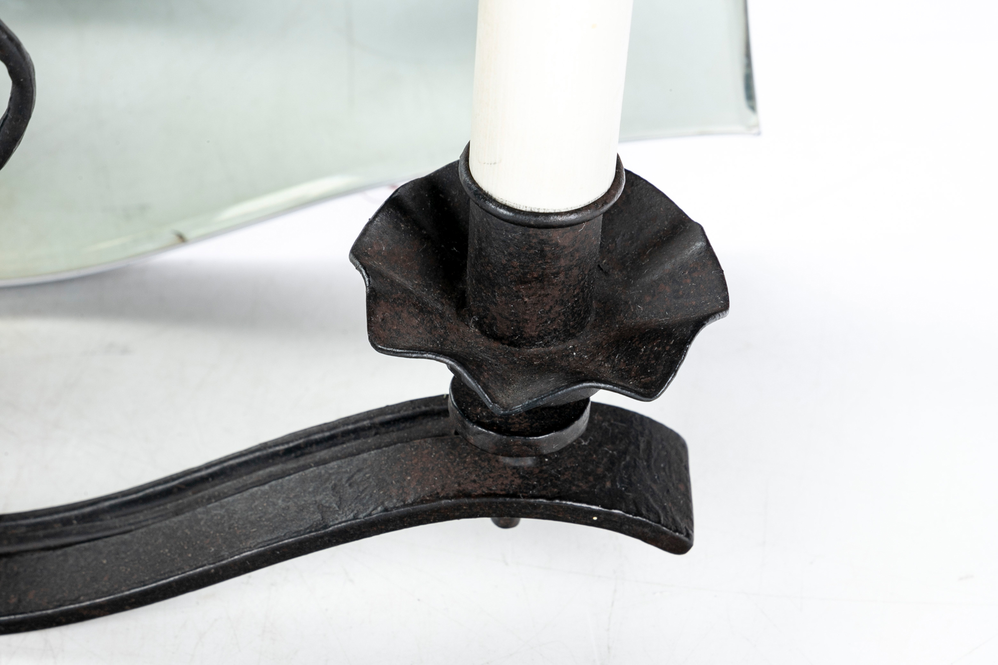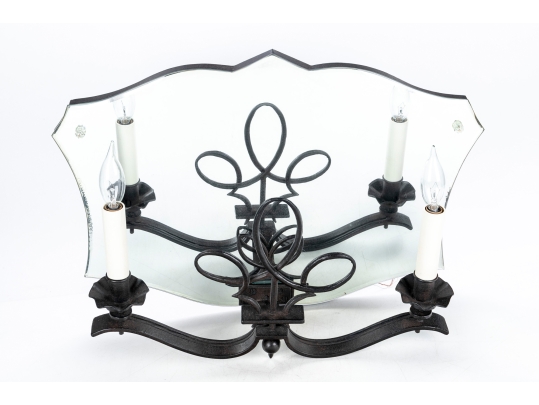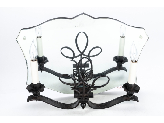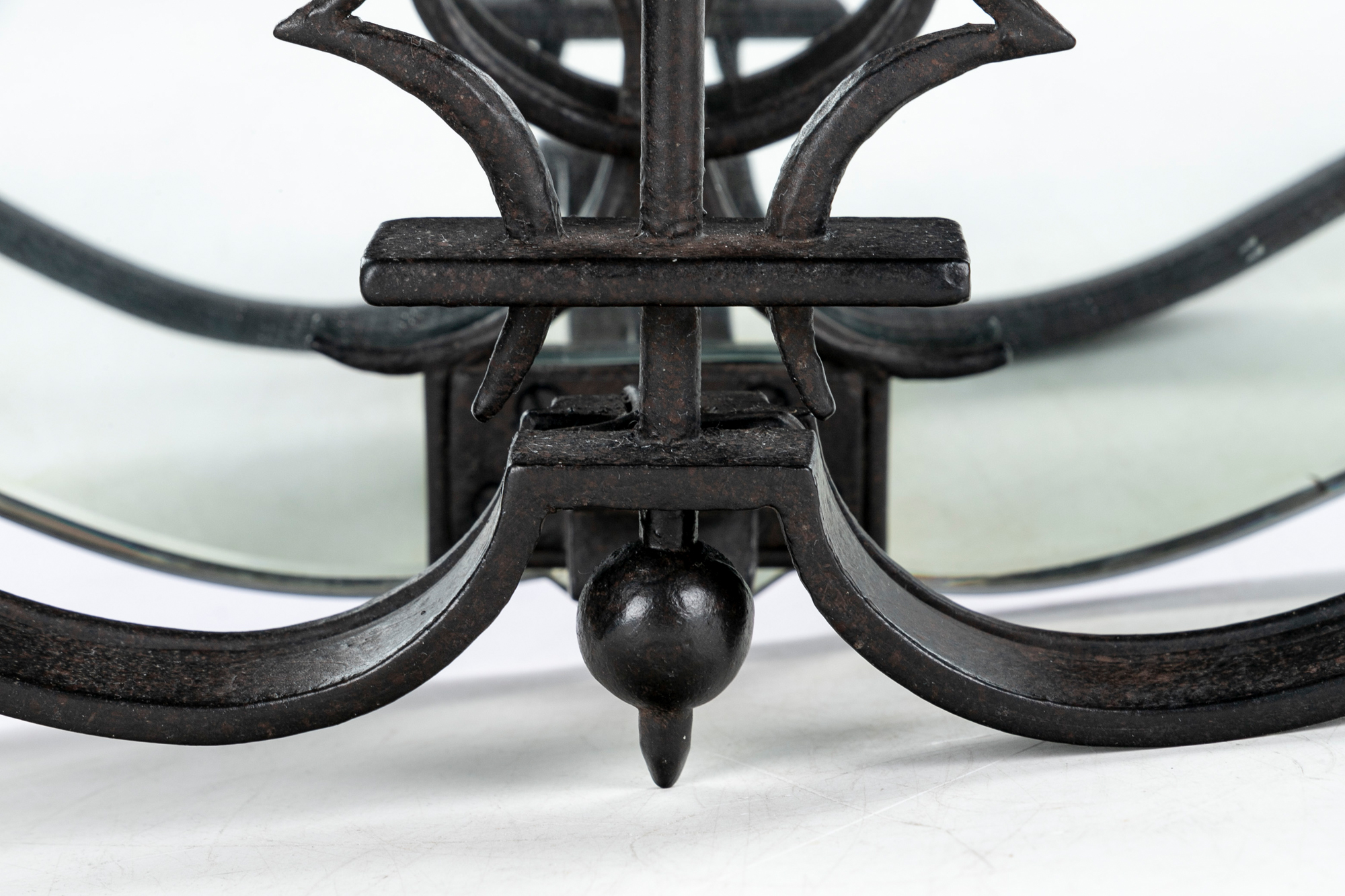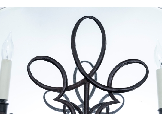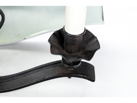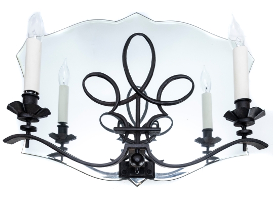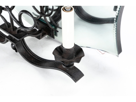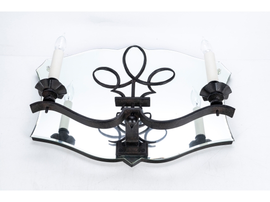 Pair of Paul Ferrante mirrored shield form wall sconces with two lights having a center trefoil motif. The mirrors with bevel cut edge throughout, cut crescent design to left and right side and secured with two glass rosettes. The sconces are heavy with a prominent center band holding the scalloped bobeches and having a center ball terminal. A second lens shaped double loop iron motif lies against the mirror behind the center band.
