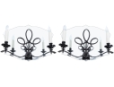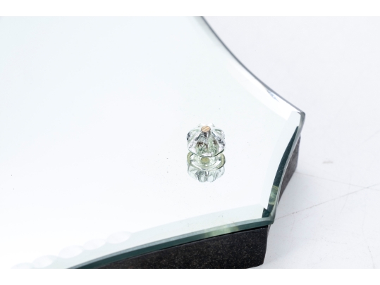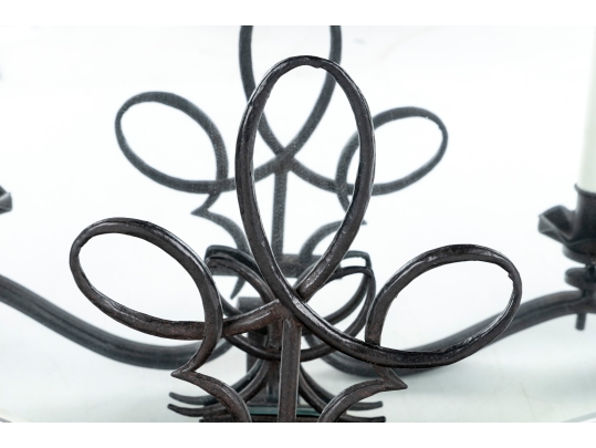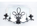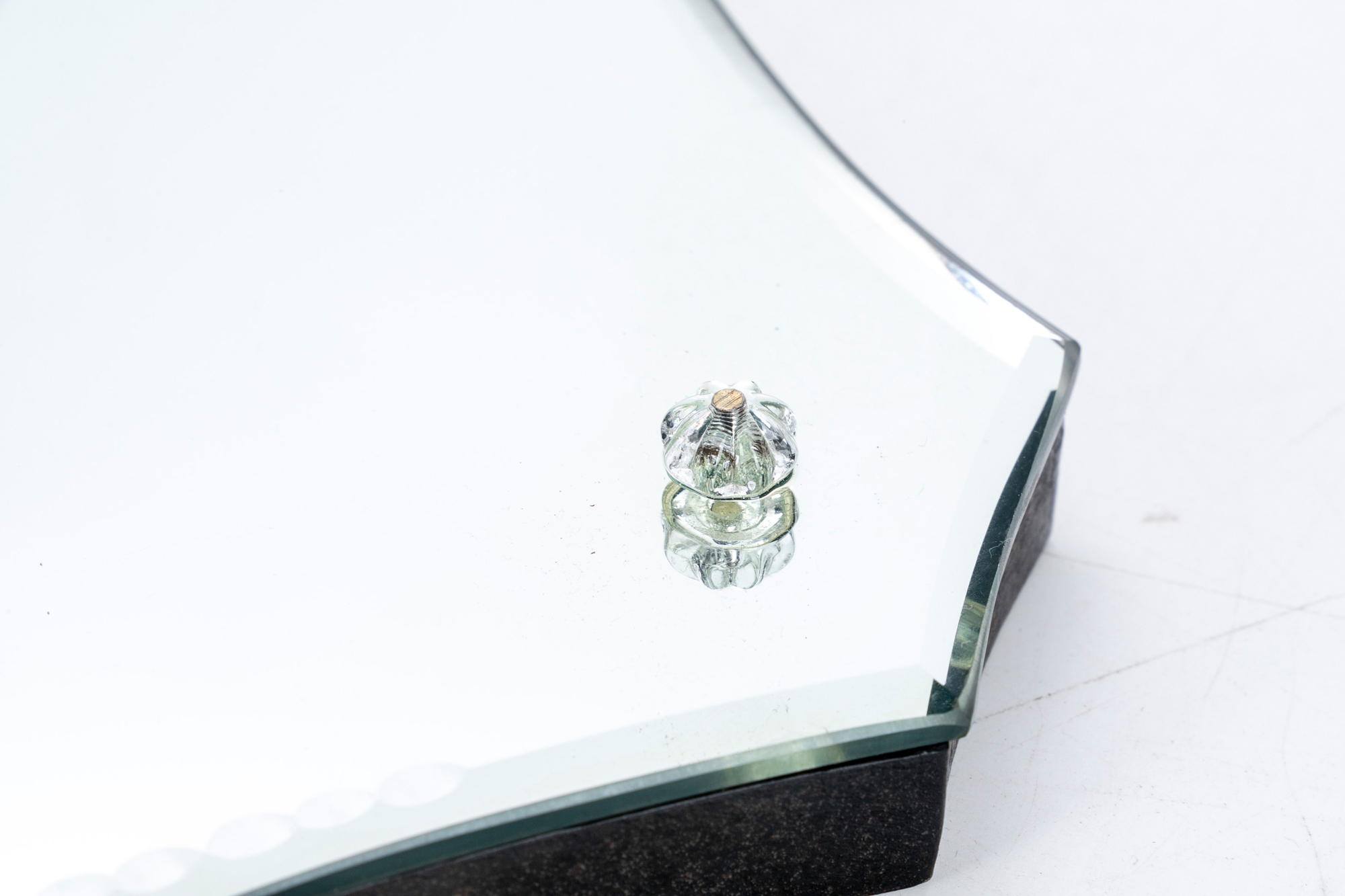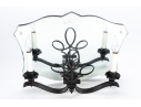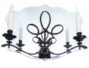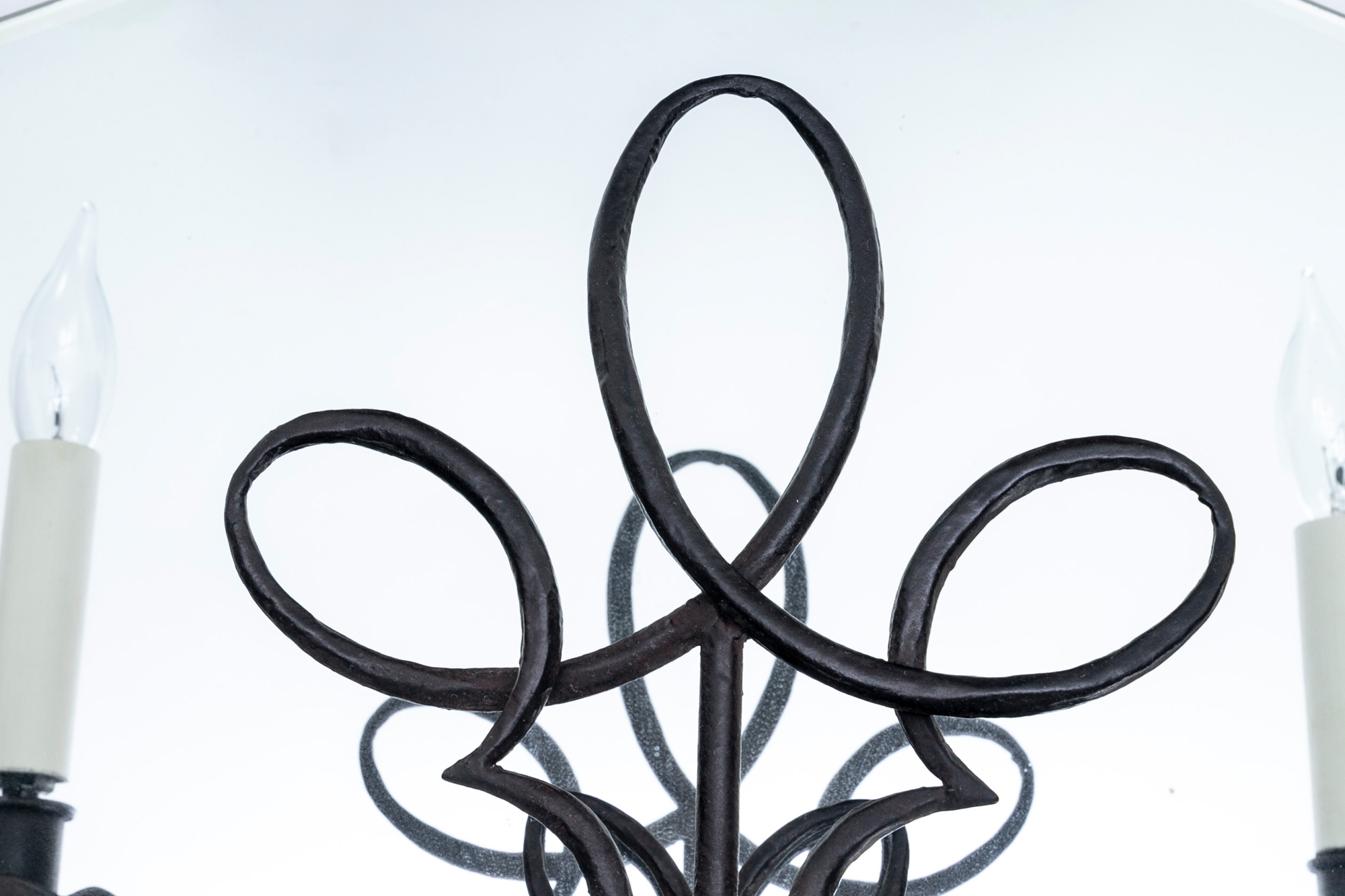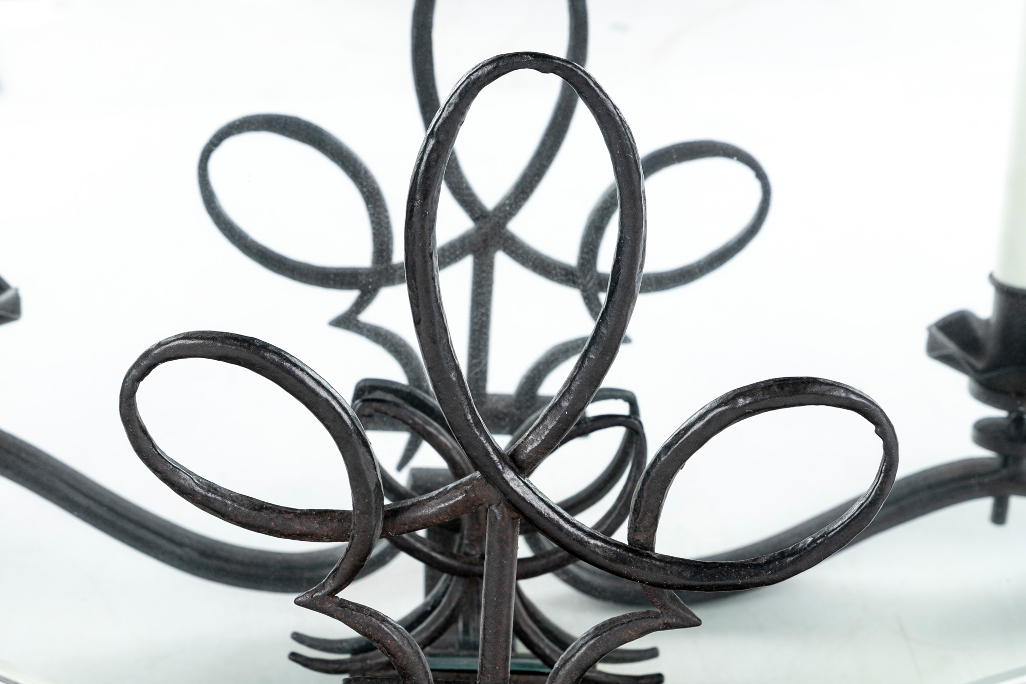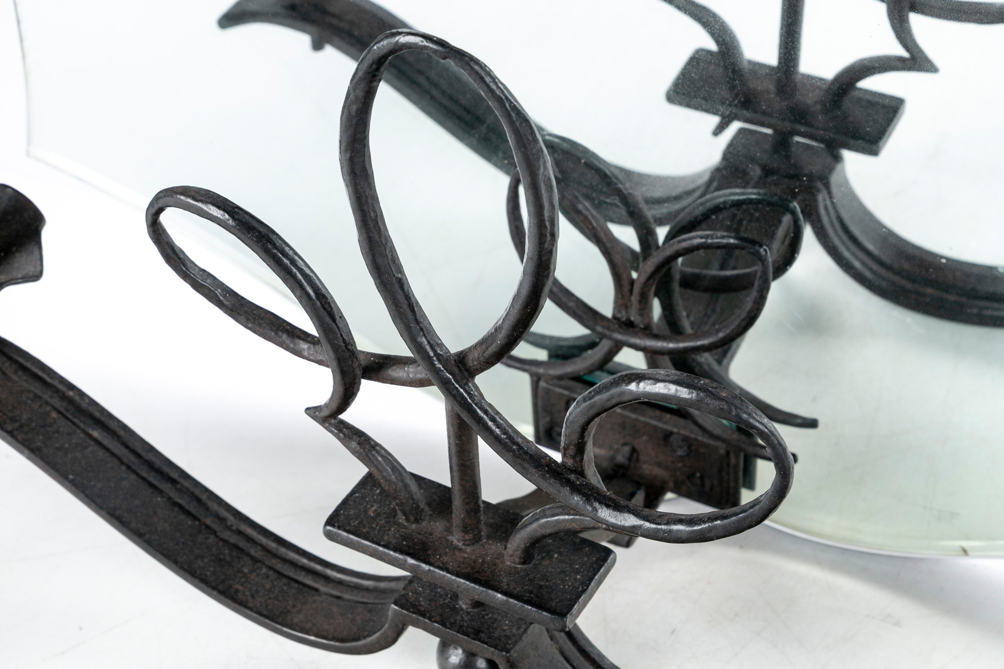 Pair of Paul Ferrante mirrored shield form wall sconces with two lights having a center trefoil motif. The mirrors with bevel cut edge throughout, cut crescent design to left and right side and secured with two glass rosettes. The sconces are heavy with a prominent center band holding the scalloped bobeches and having a center ball terminal. A second lens shaped double loop iron motif lies against the mirror behind the center band.