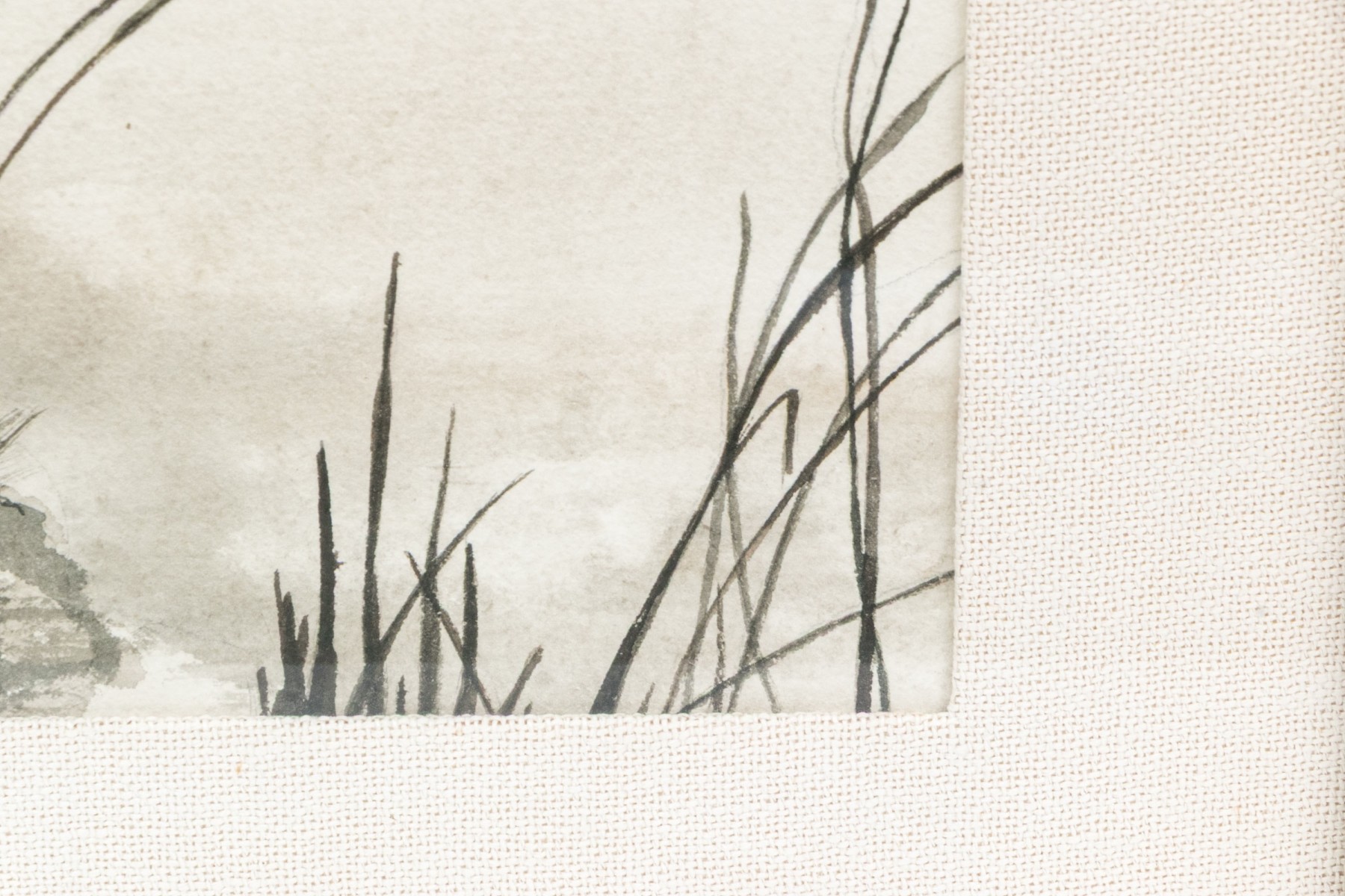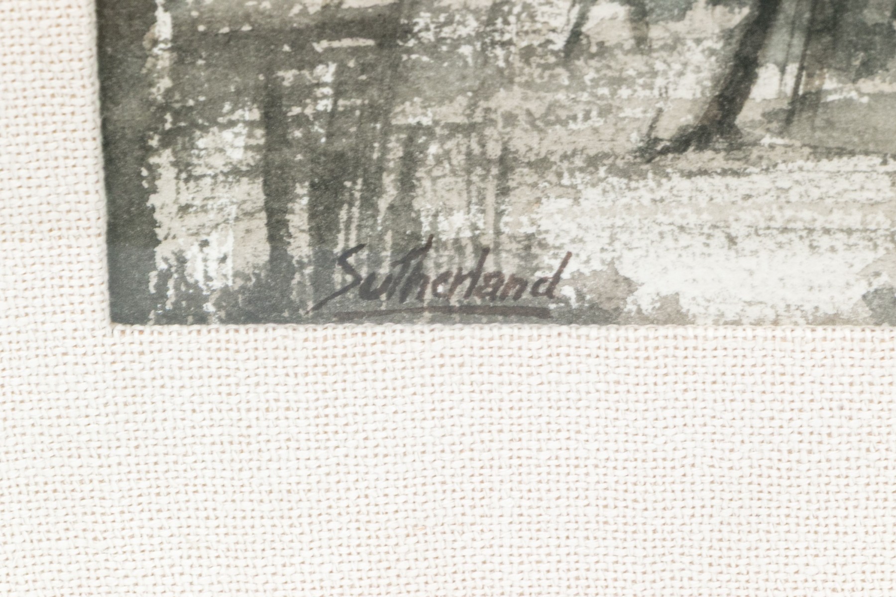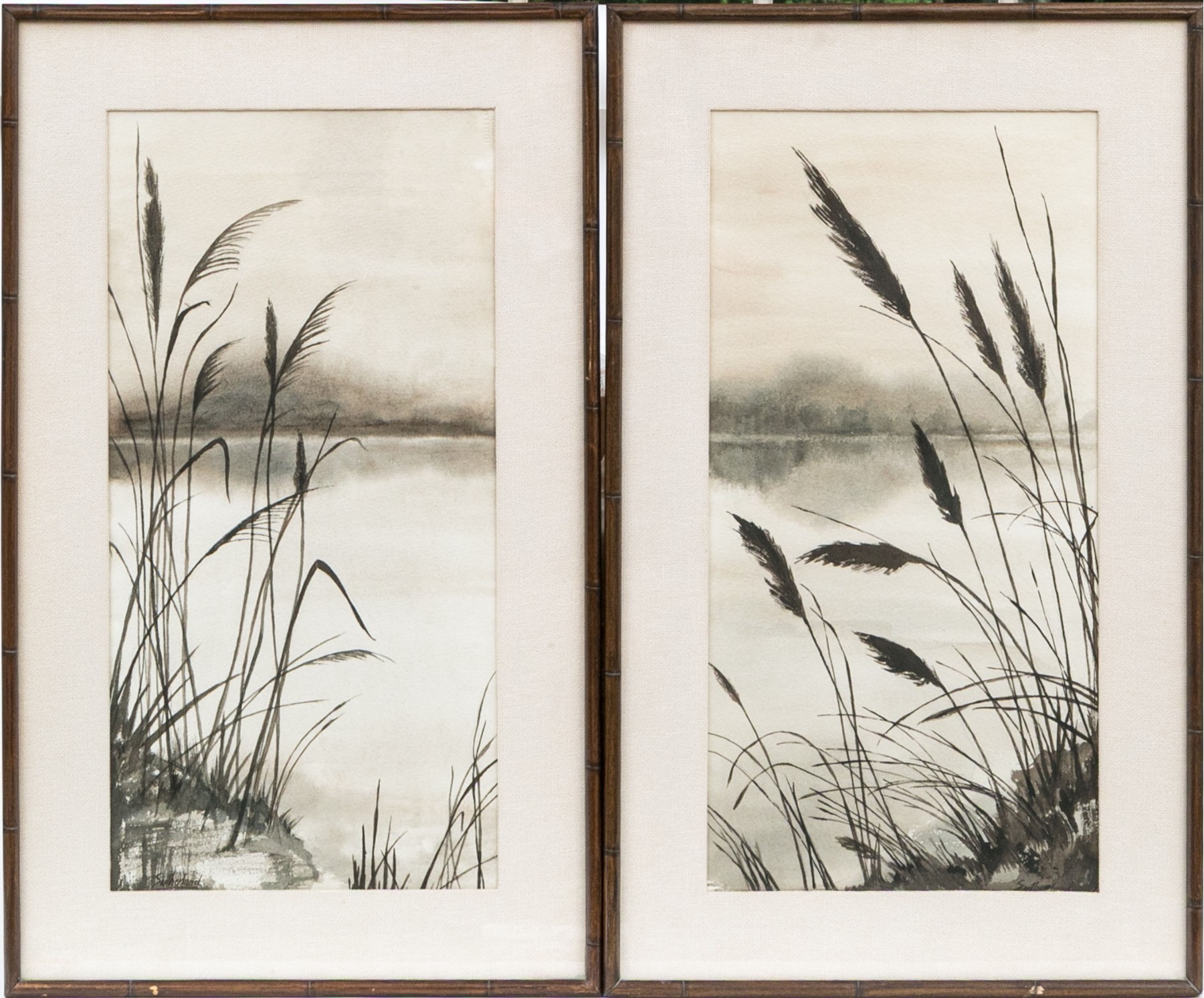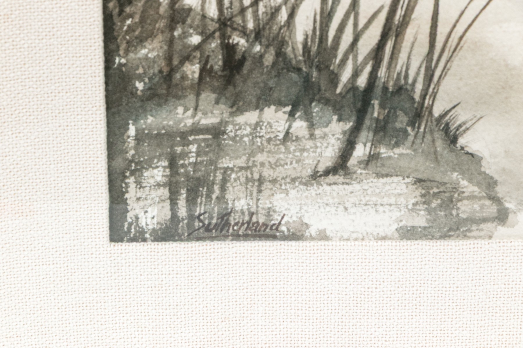 An eye-catching diptych watercolor painting on paper depicting two scenes of opposing foliage overlooking calm, pale water reflecting hazy hills on the horizon. Signed Sutherland lower left.