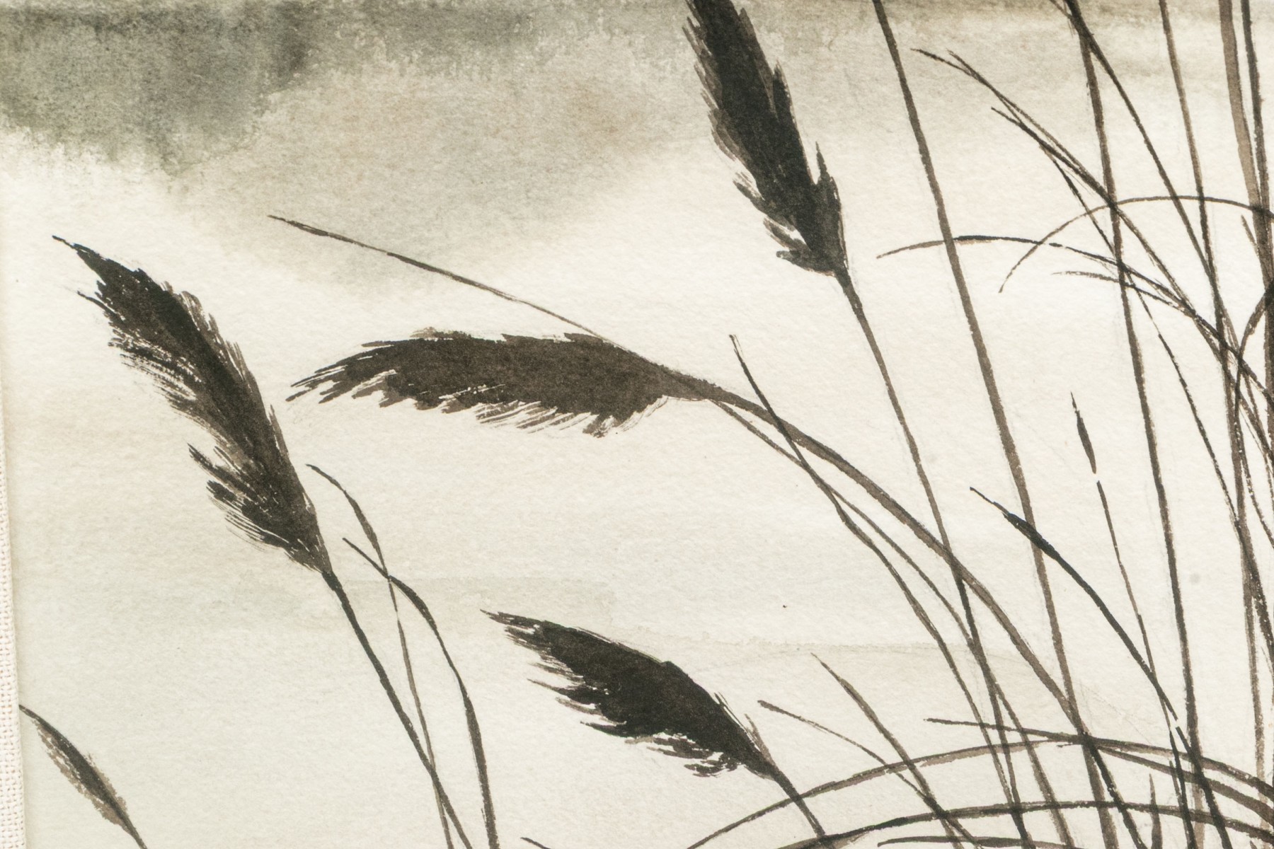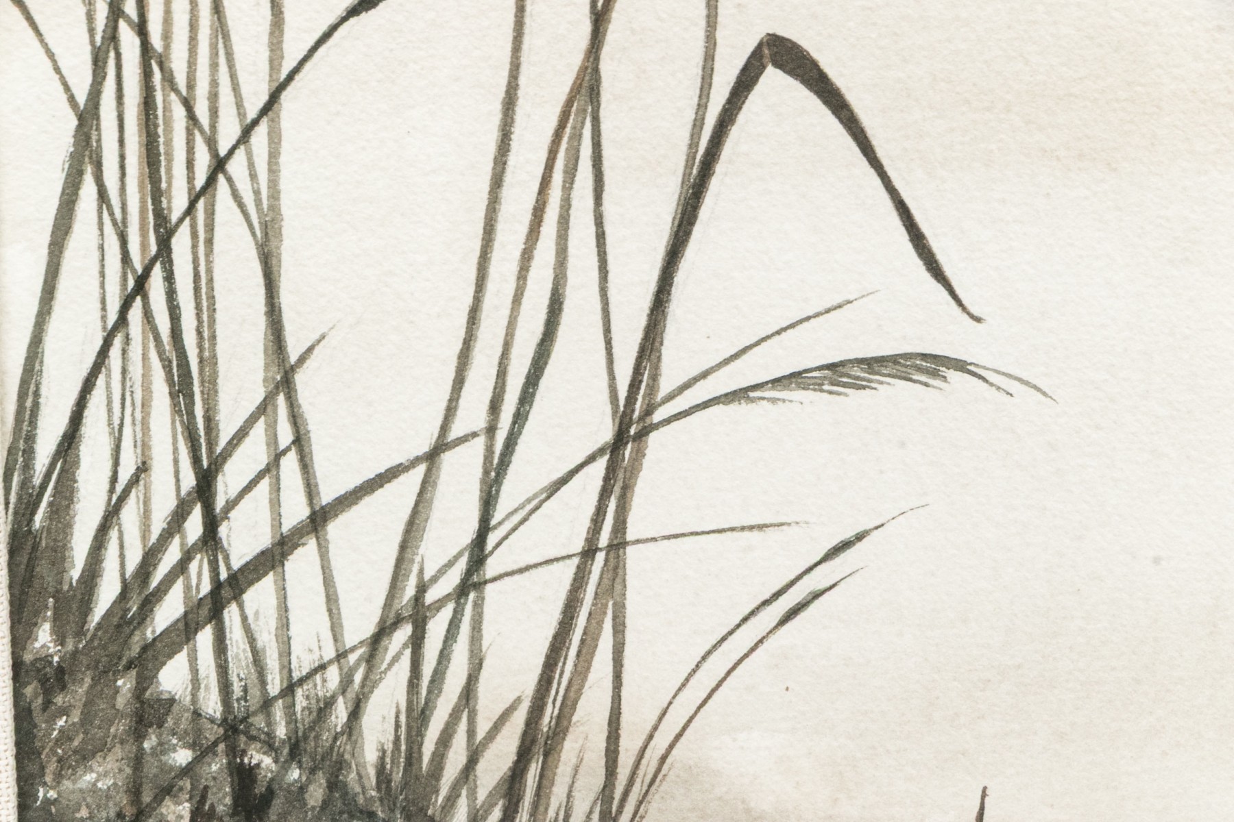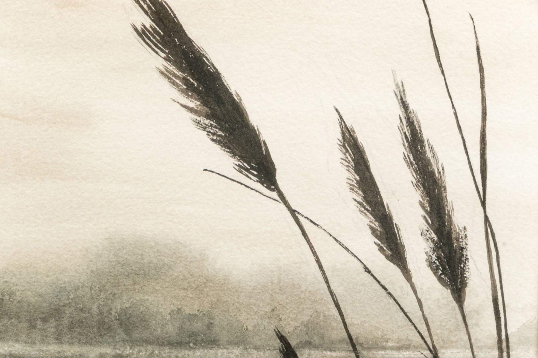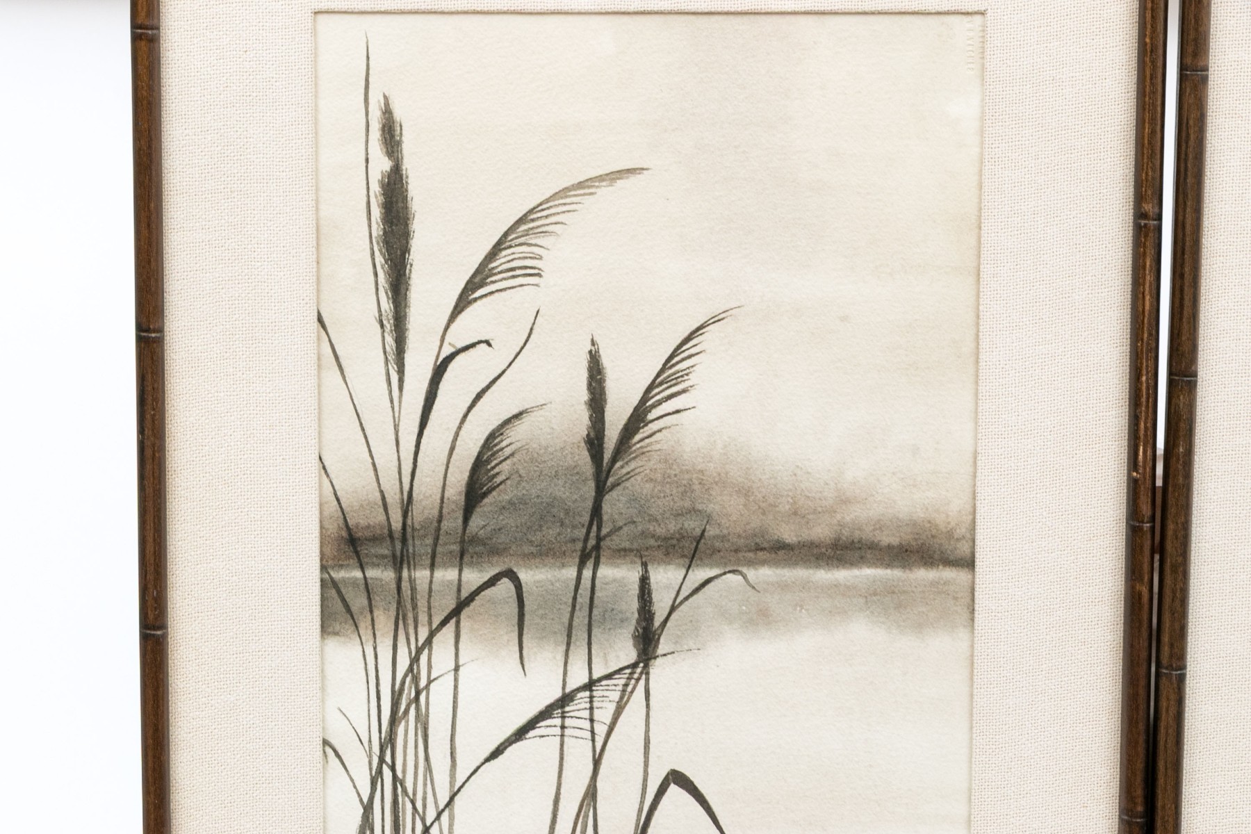 An eye-catching diptych watercolor painting on paper depicting two scenes of opposing foliage overlooking calm, pale water reflecting hazy hills on the horizon. Signed Sutherland lower left.