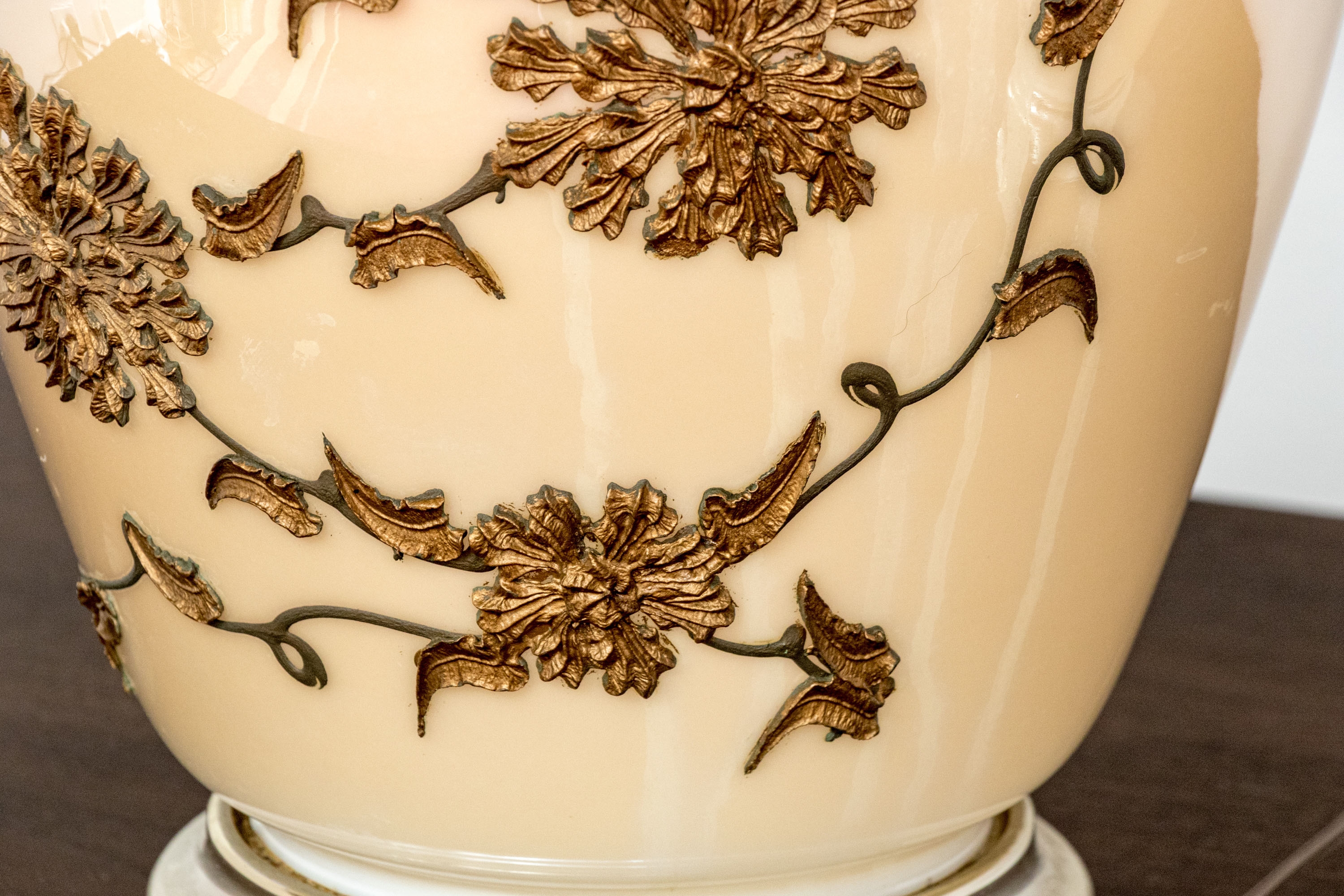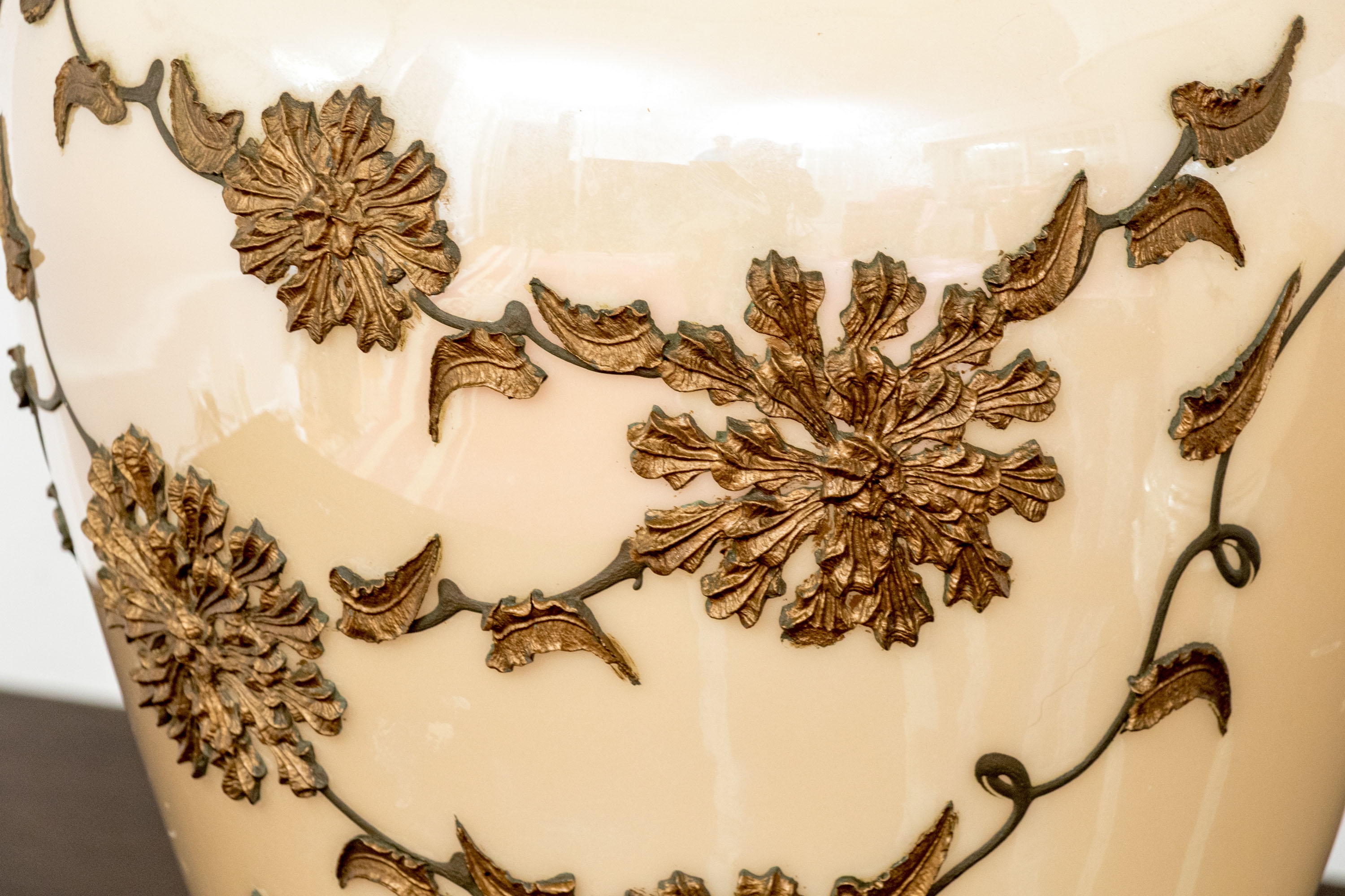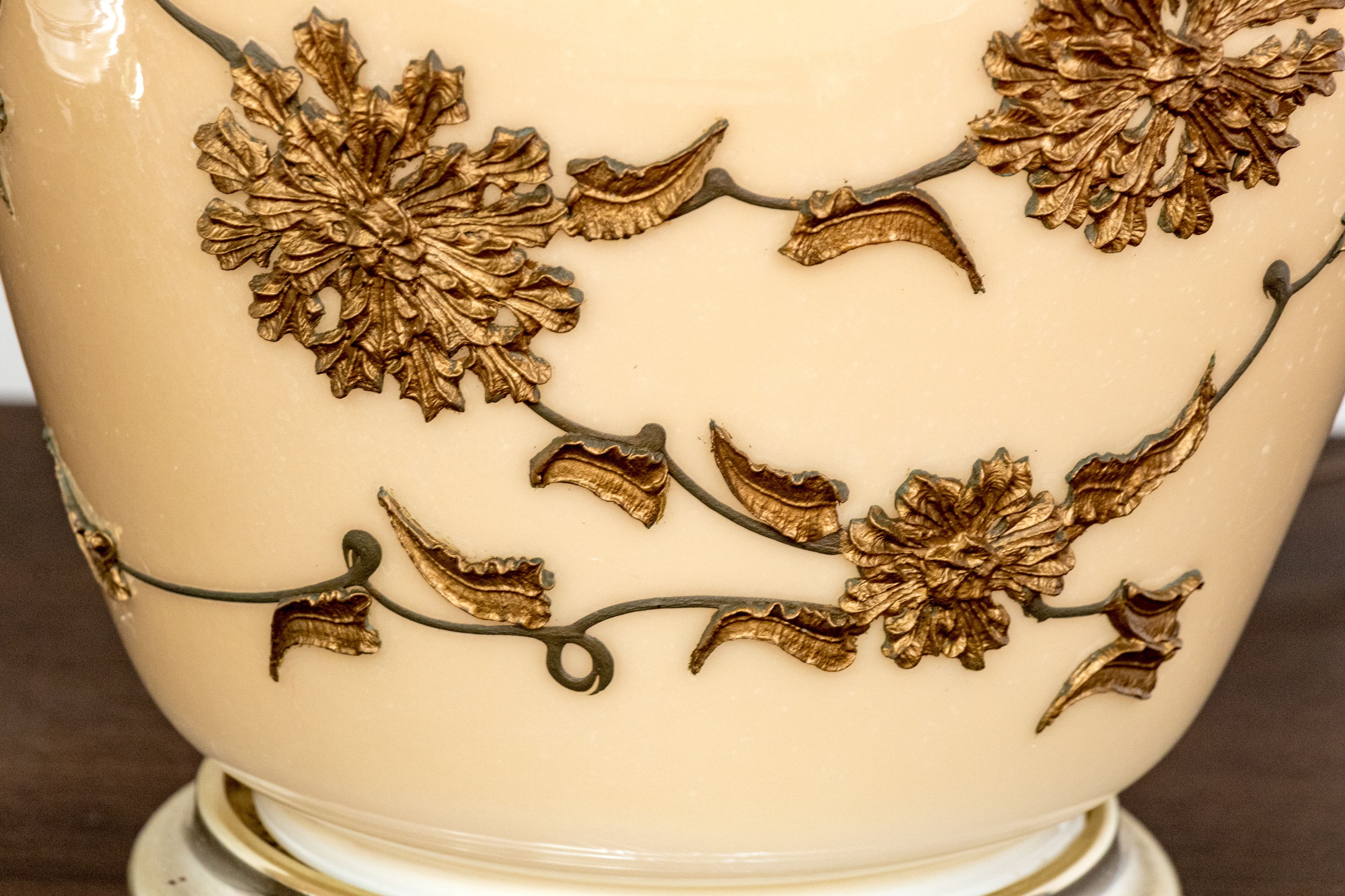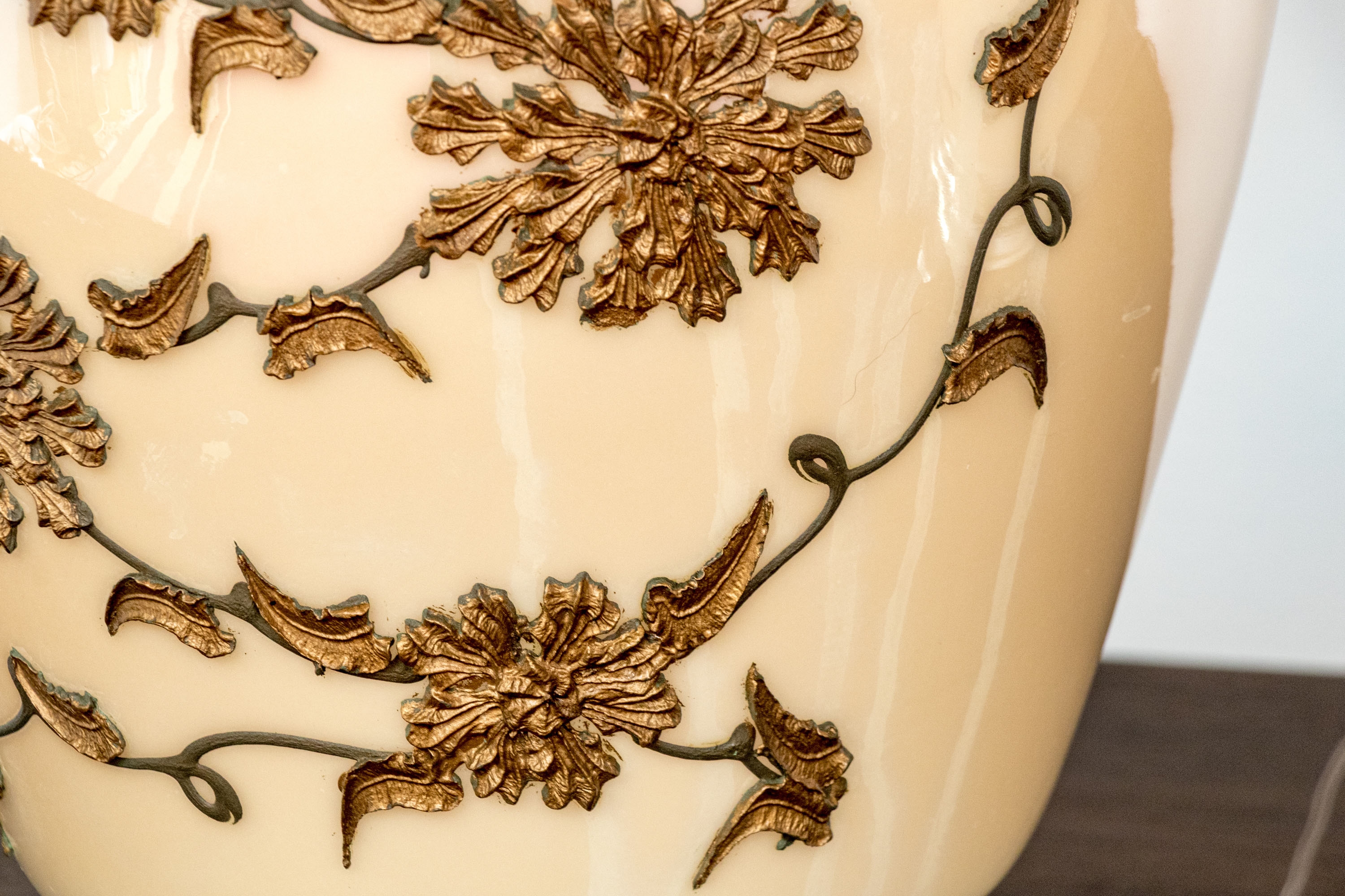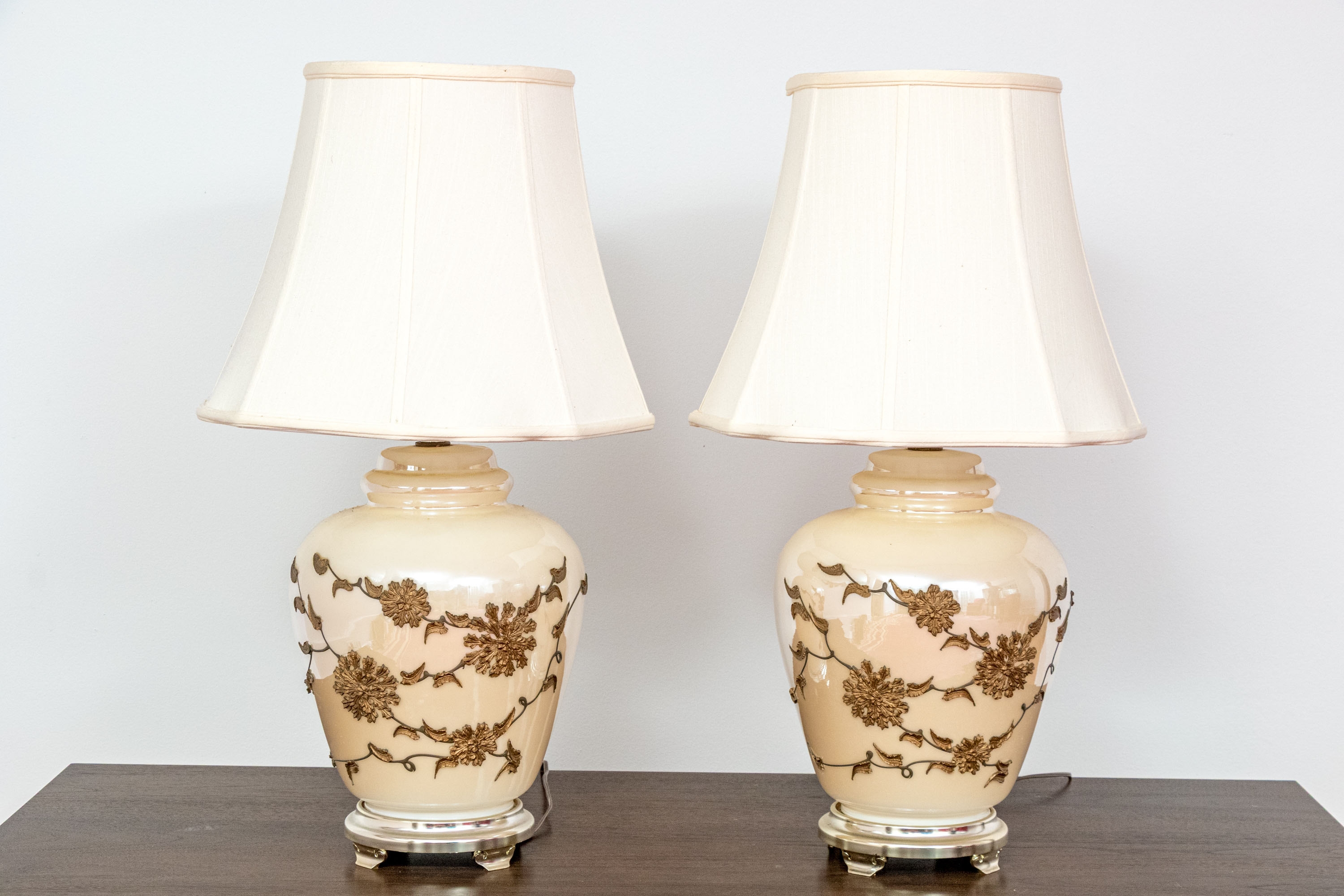 Pair of decorative table lamps on footed bases with vase form bodies, each with shades and finials. Glass vase form bodies with overlaid gilt metal floral motifs in low relief.