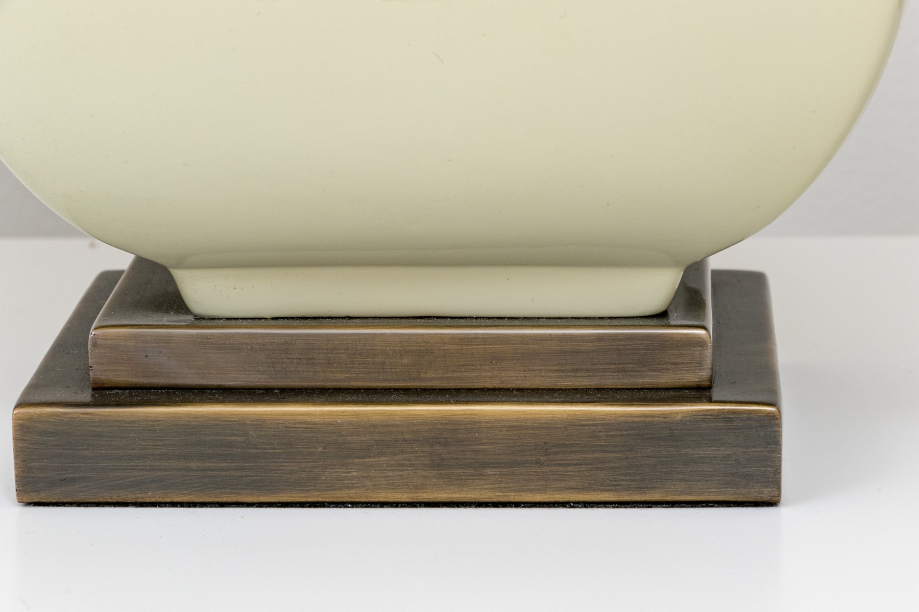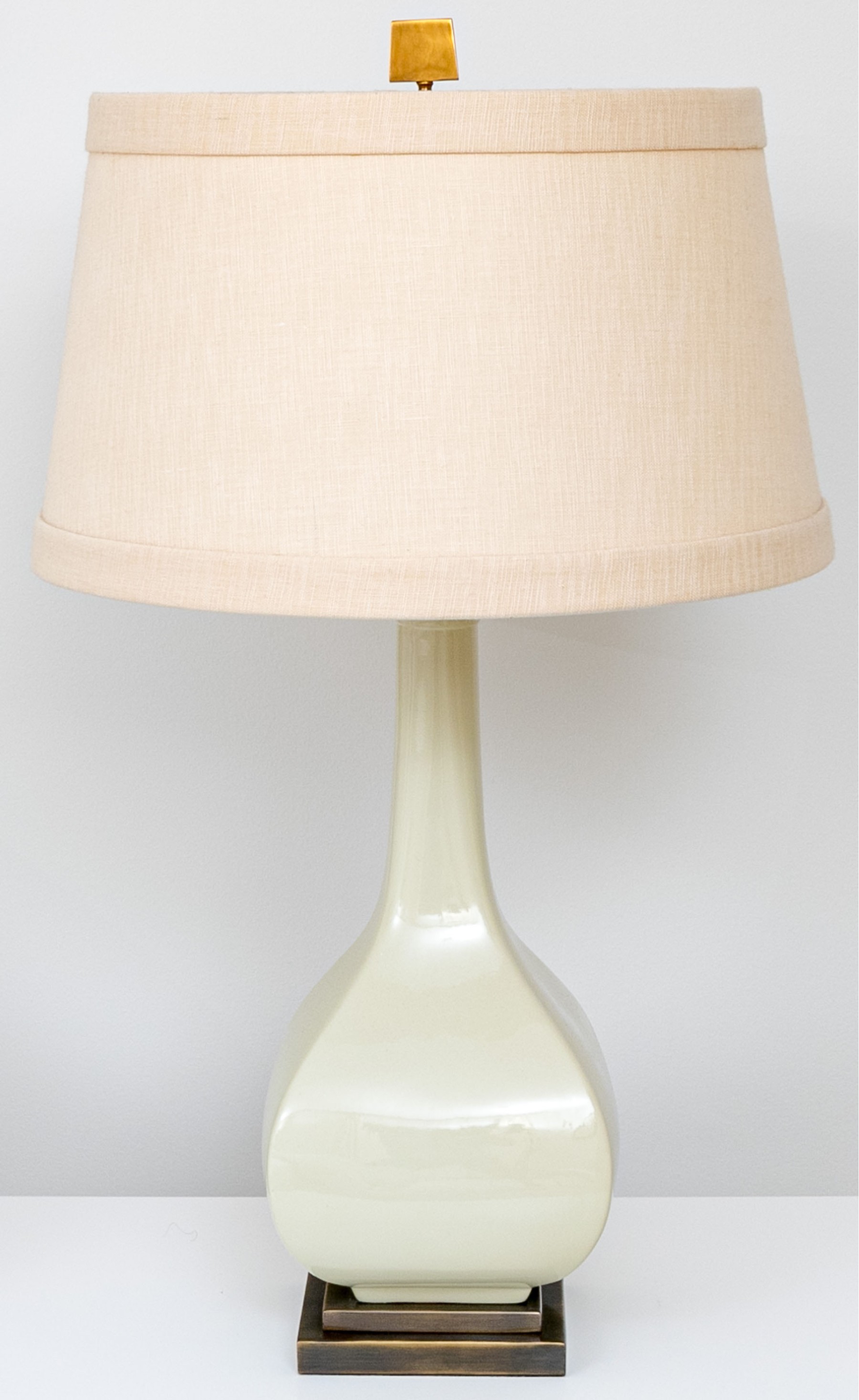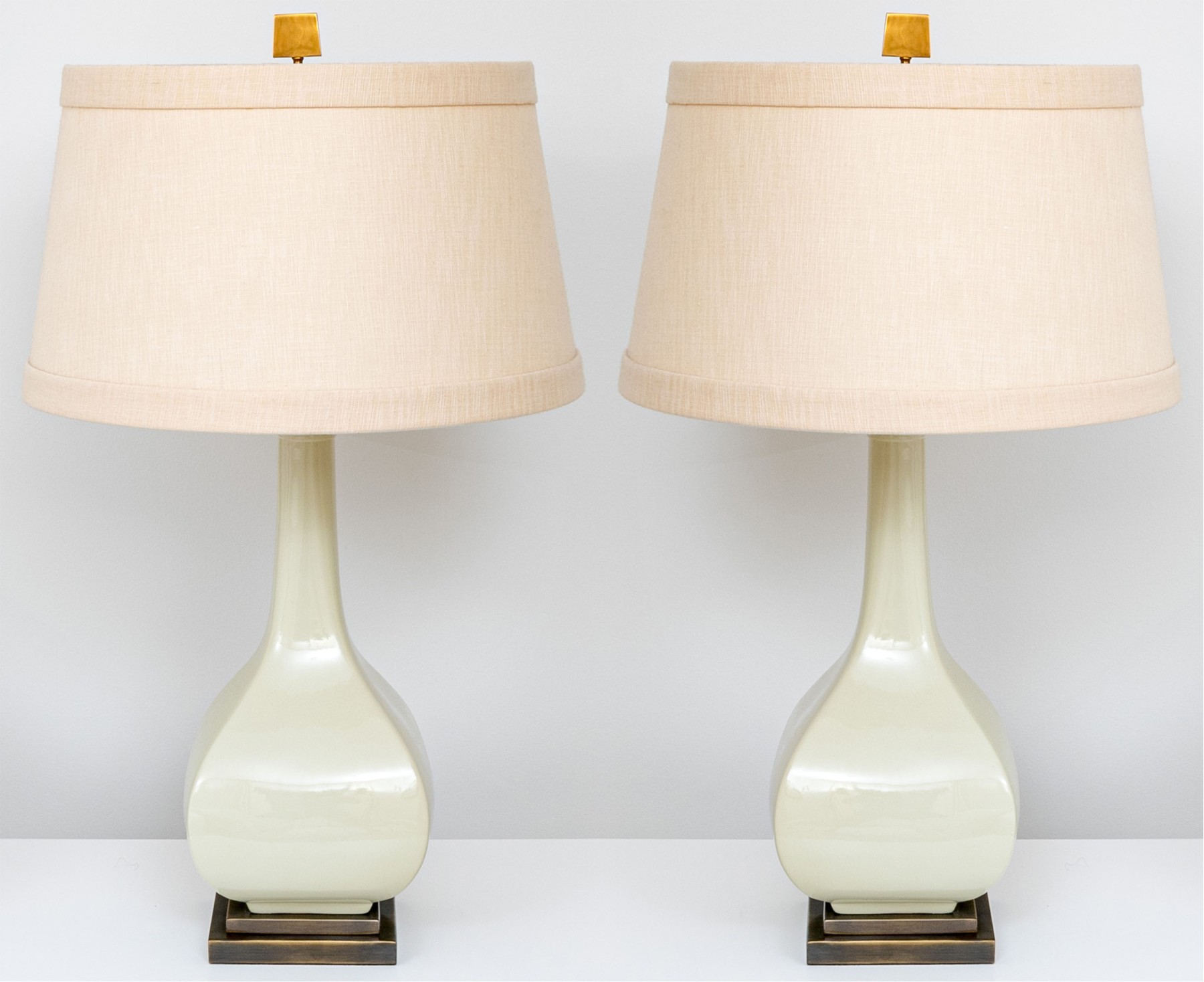 A tasteful pair of Wildwood "Dawson" table lamps featuring ceramic bottle forms with narrow necks tapering to faceted pear-shaped bodies glazed cream white. raised on tiered brasstone square bases. surmounted with warm cream fabric drum shades with gilt square finials for an elegant finish.