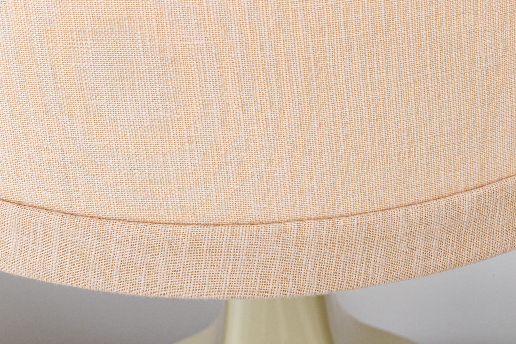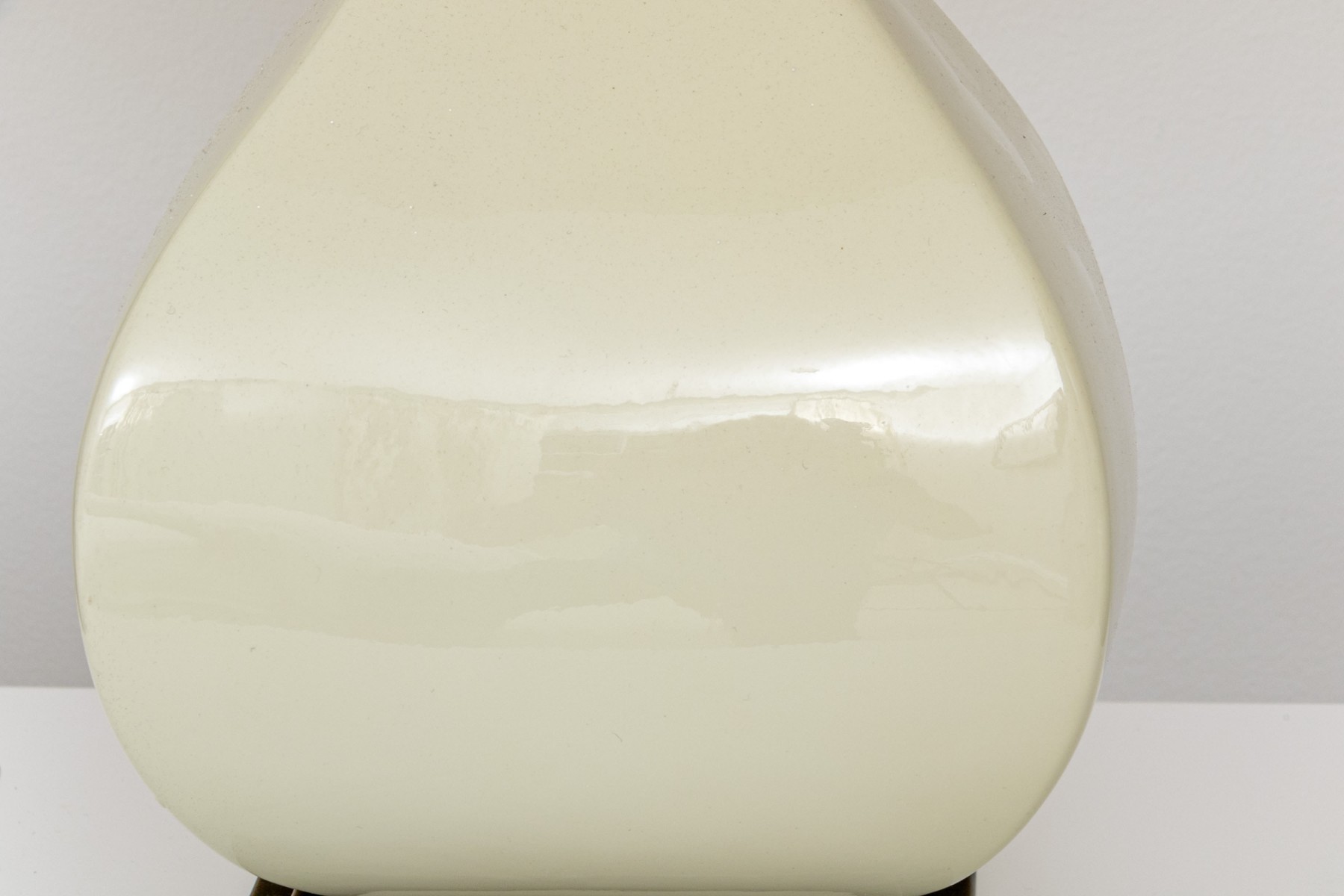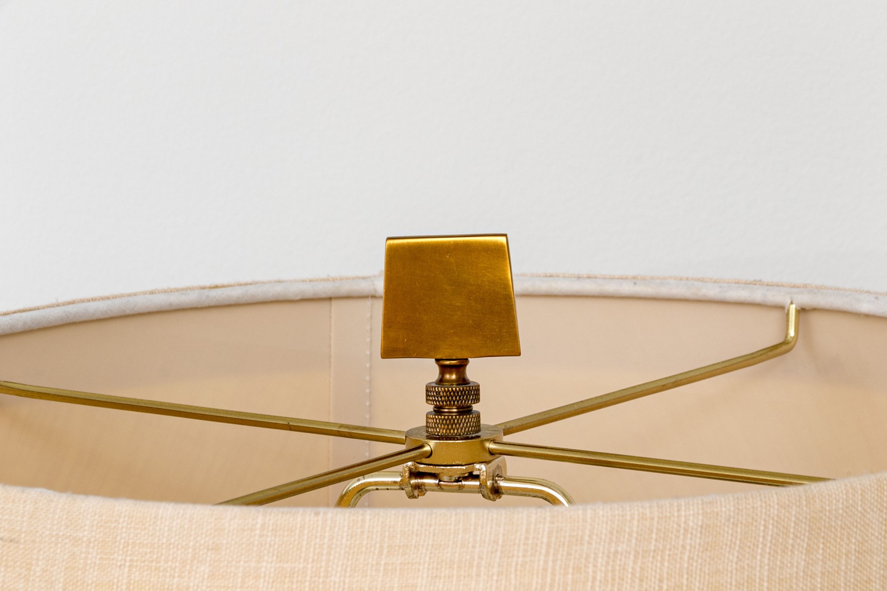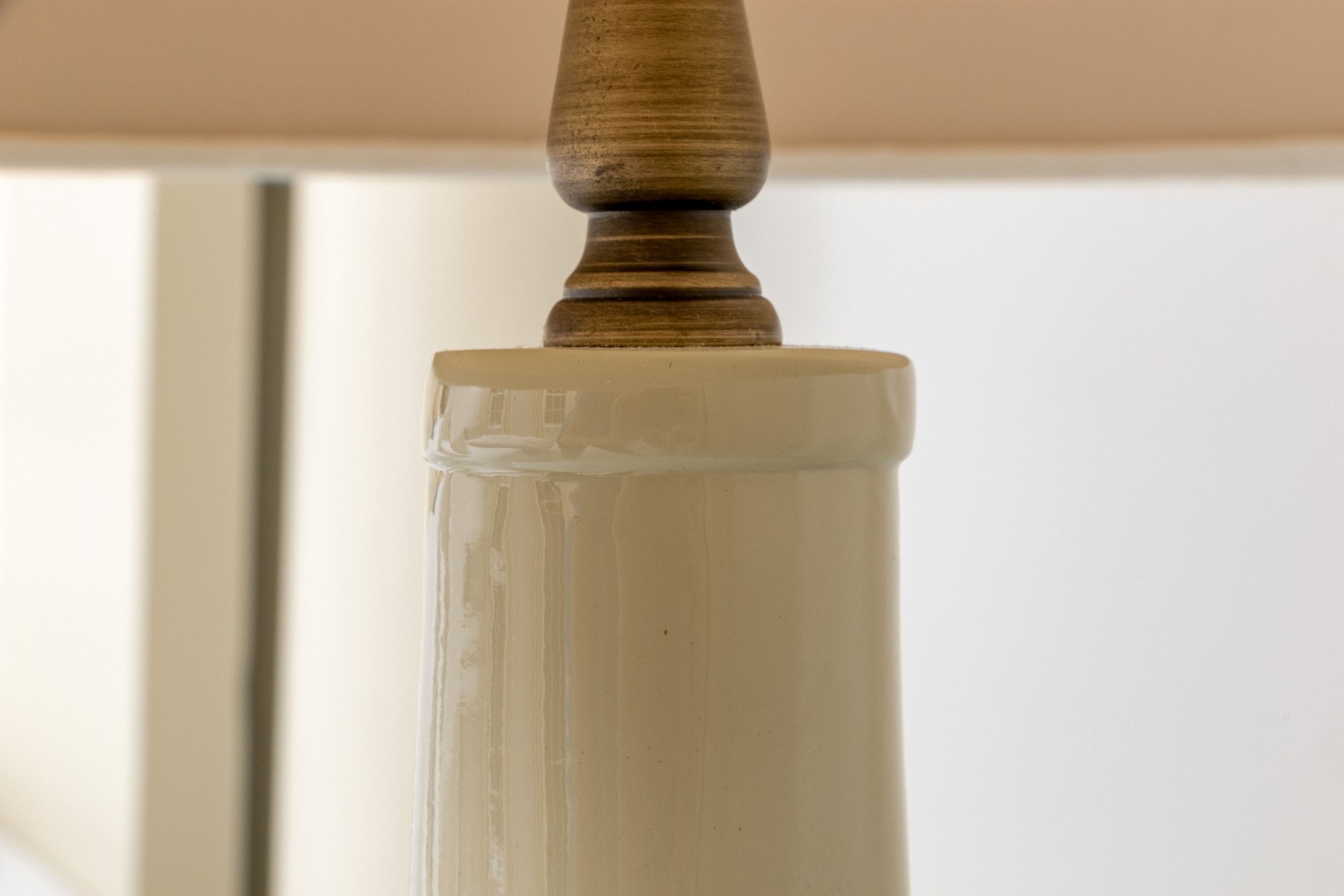 A tasteful pair of Wildwood "Dawson" table lamps featuring ceramic bottle forms with narrow necks tapering to faceted pear-shaped bodies glazed cream white. raised on tiered brasstone square bases. surmounted with warm cream fabric drum shades with gilt square finials for an elegant finish.