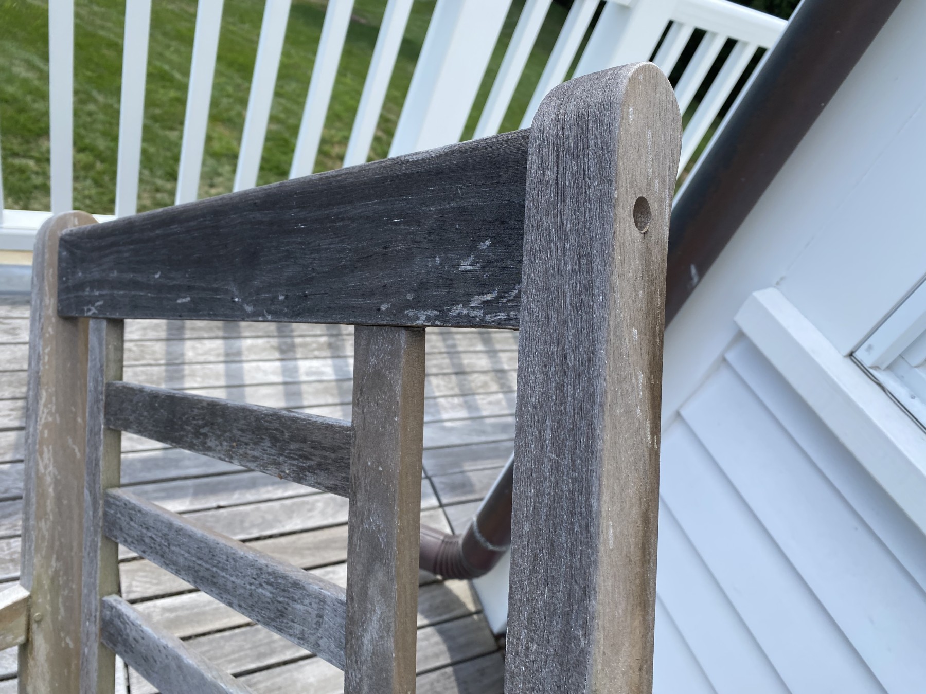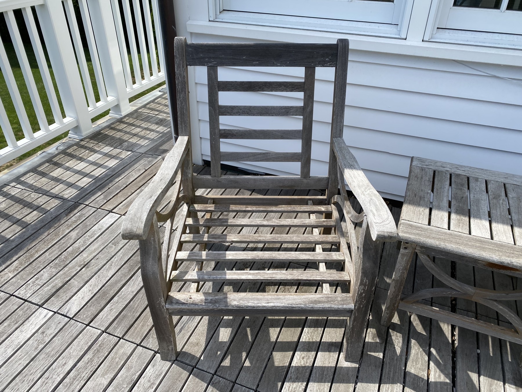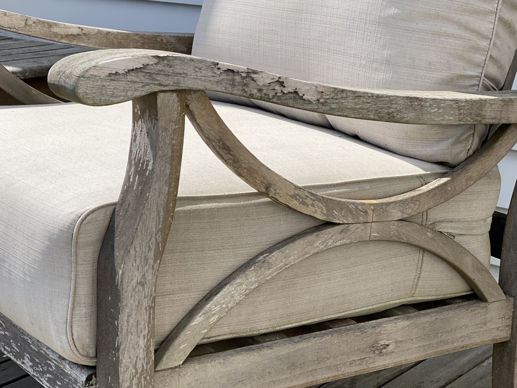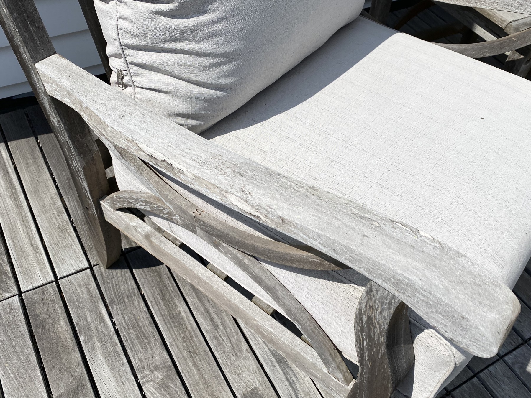 Very dry Teak along with dry cushions. The pair of chairs are really in the rough, and should be refinished.rnWear is commensurate with age, use and exposure to the outdoor elements.