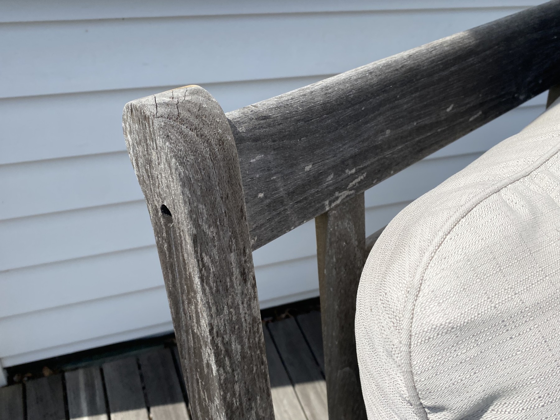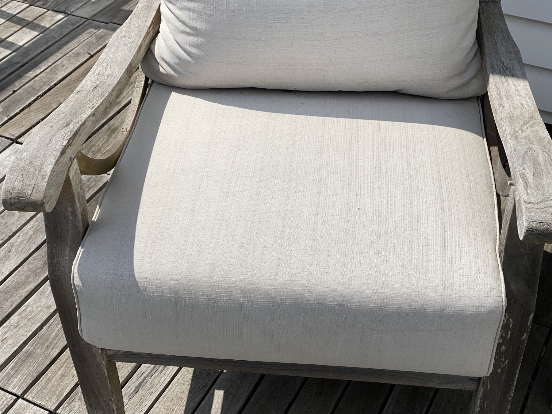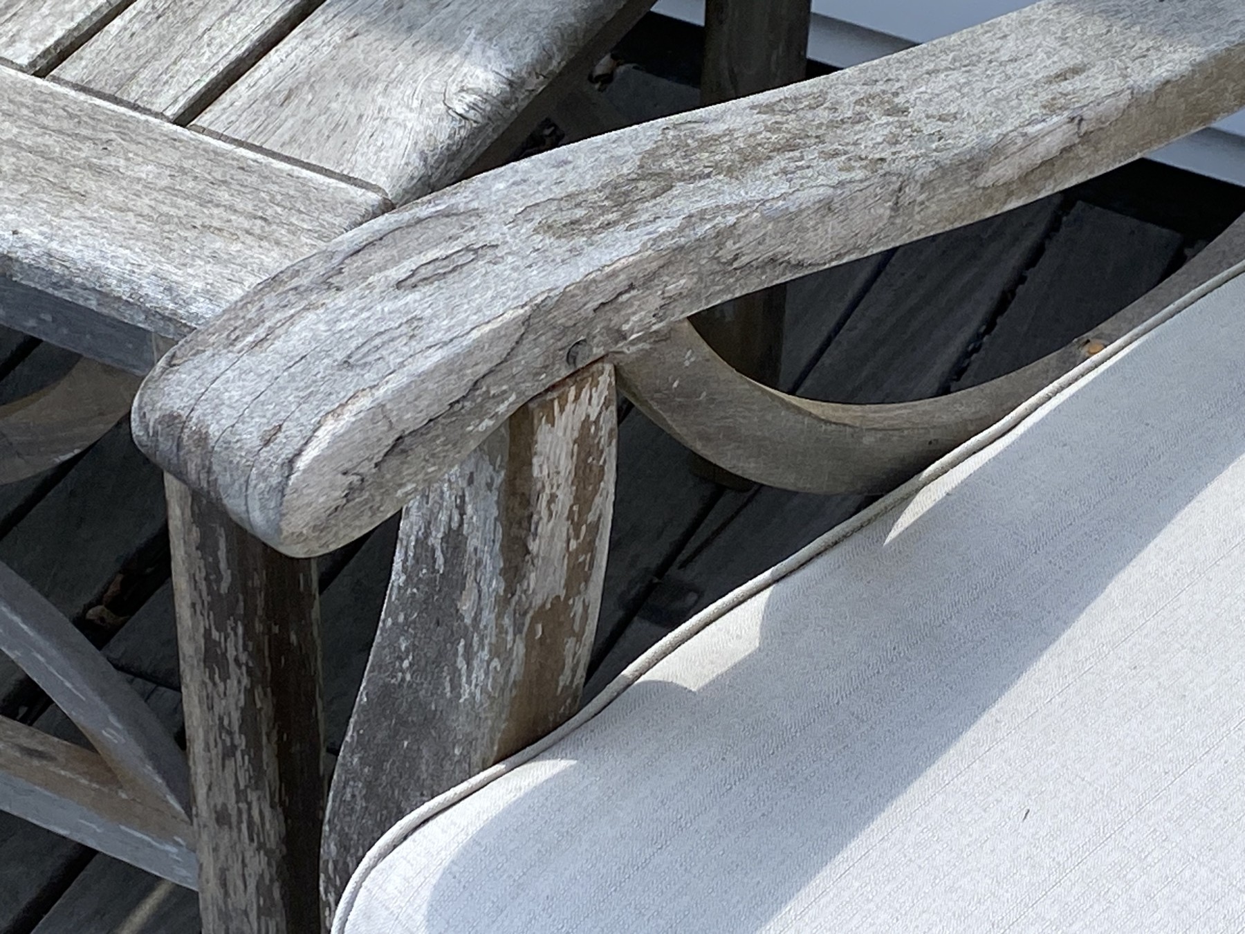 Very dry Teak along with dry cushions. The pair of chairs are really in the rough, and should be refinished.rnWear is commensurate with age, use and exposure to the outdoor elements.
