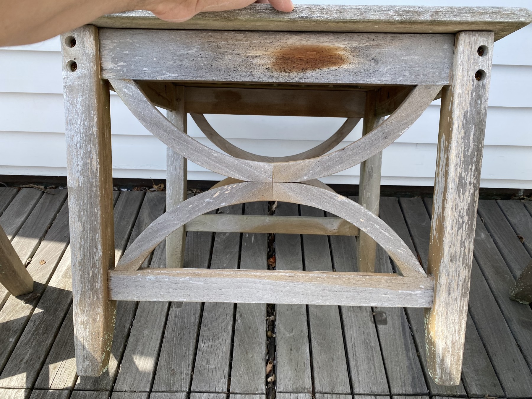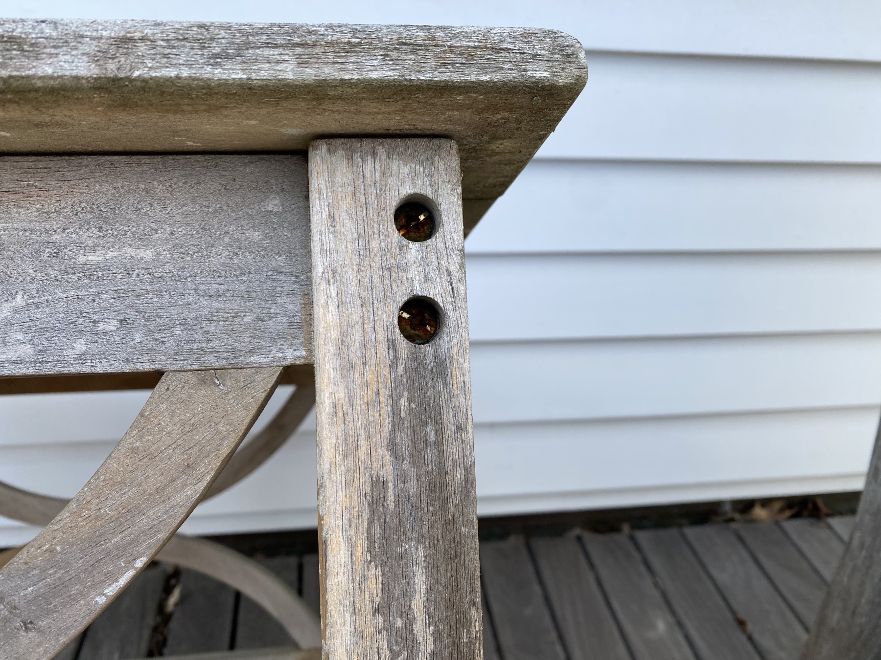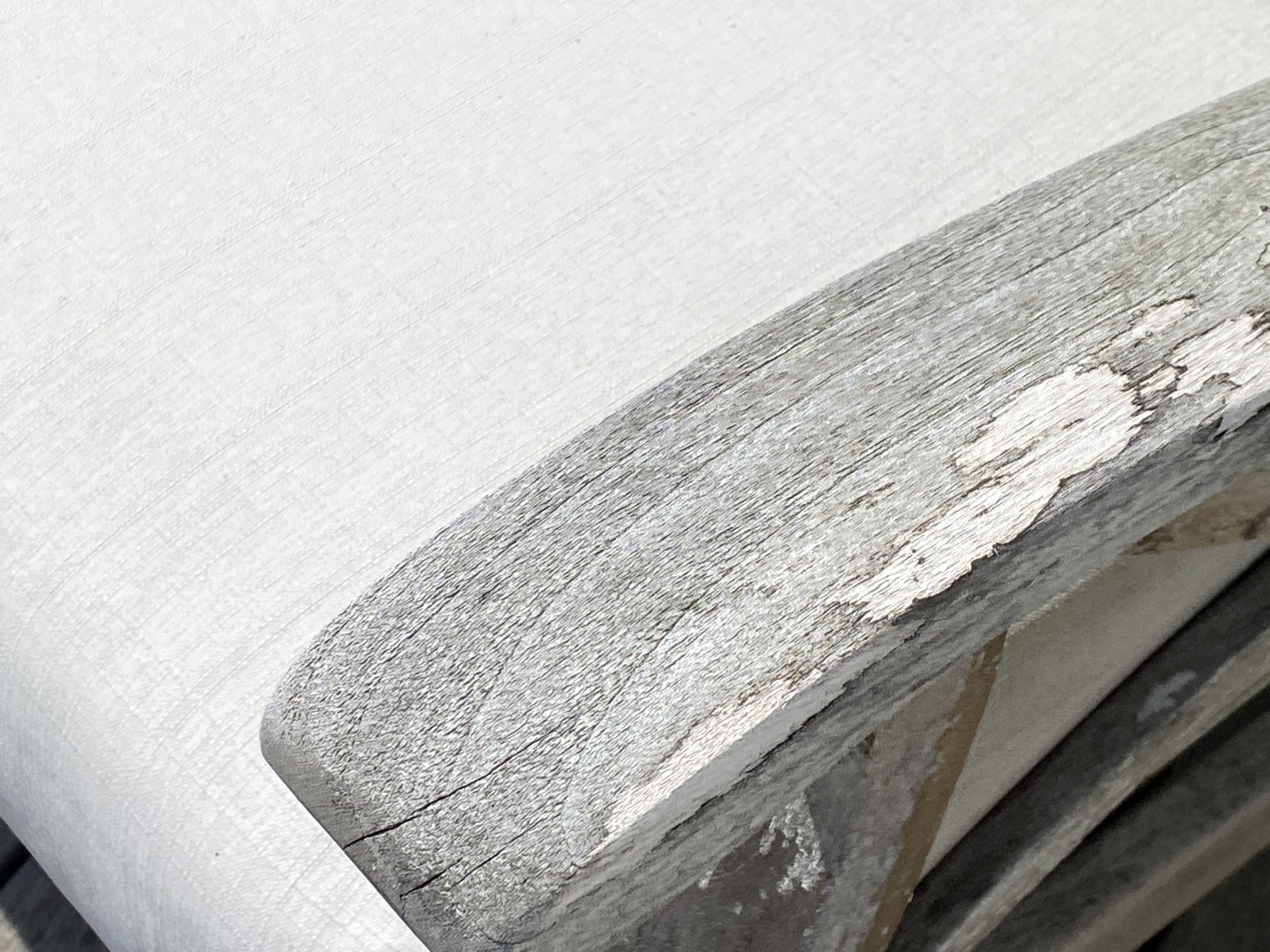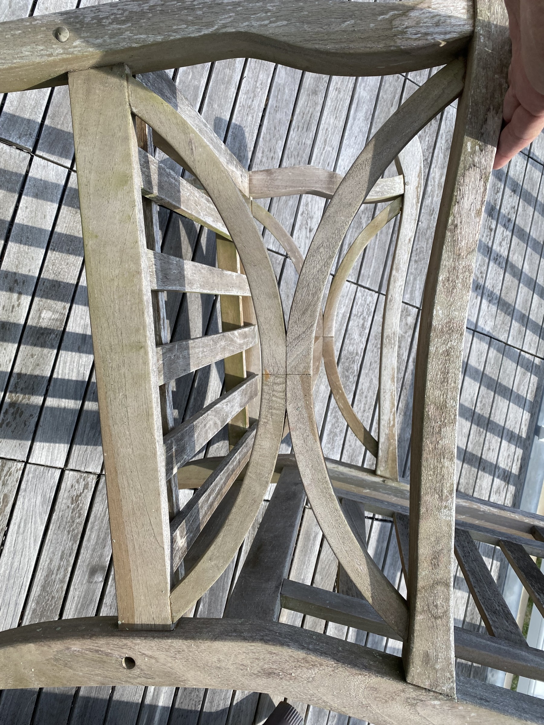 Very dry Teak along with dry cushions. The pair of chairs are really in the rough, and should be refinished.rnWear is commensurate with age, use and exposure to the outdoor elements.