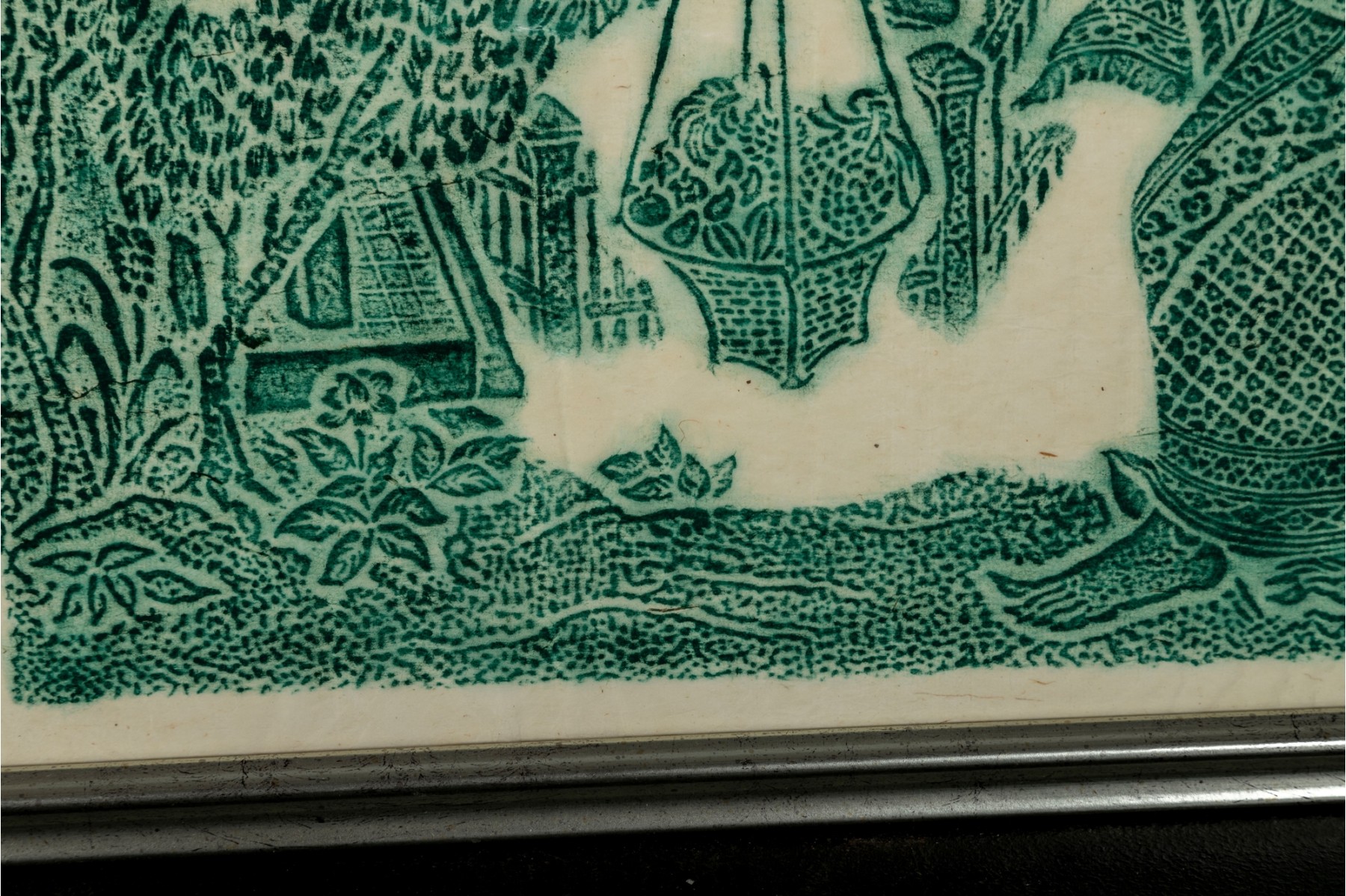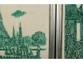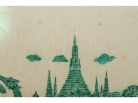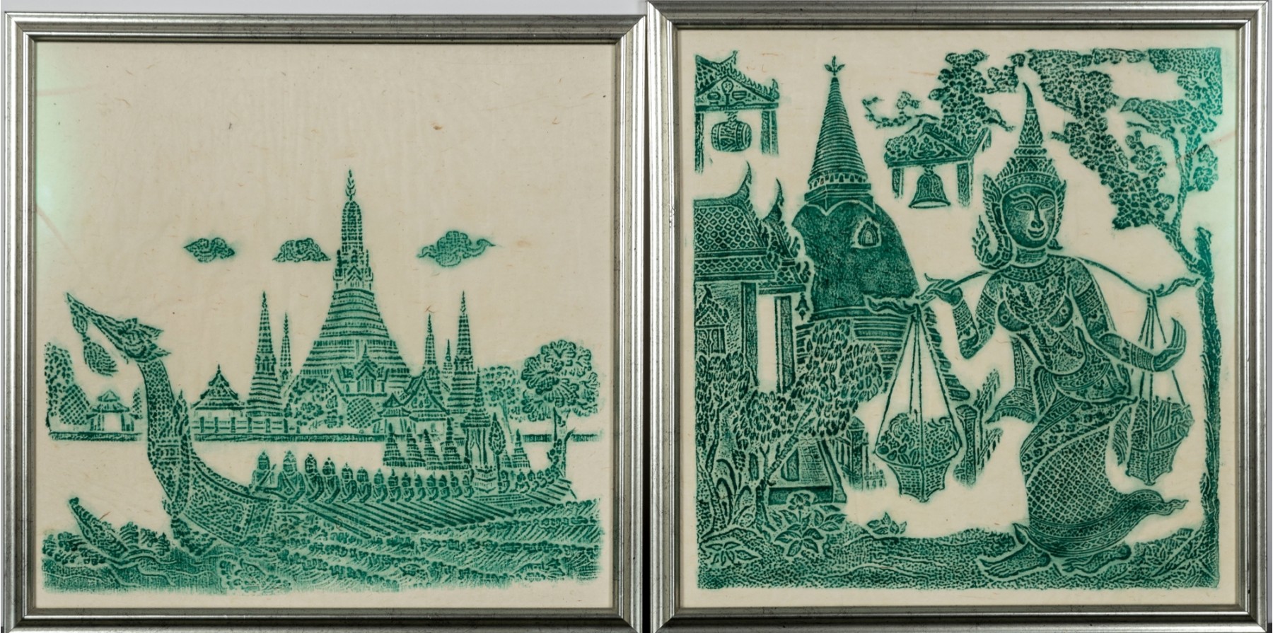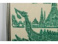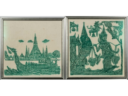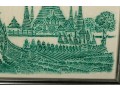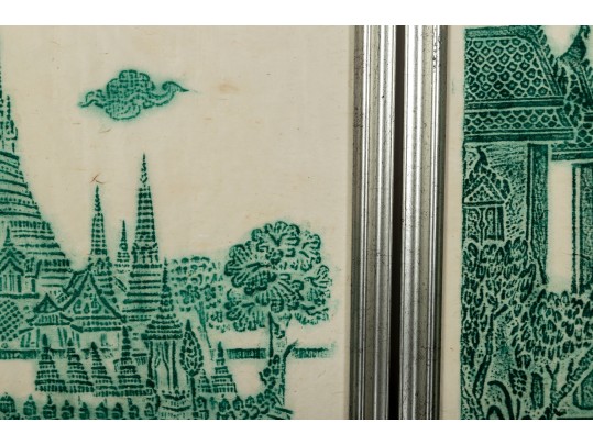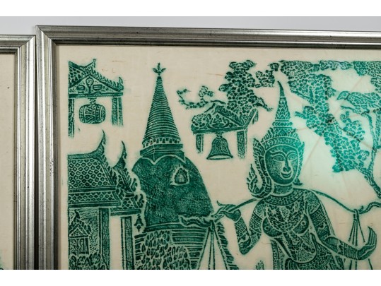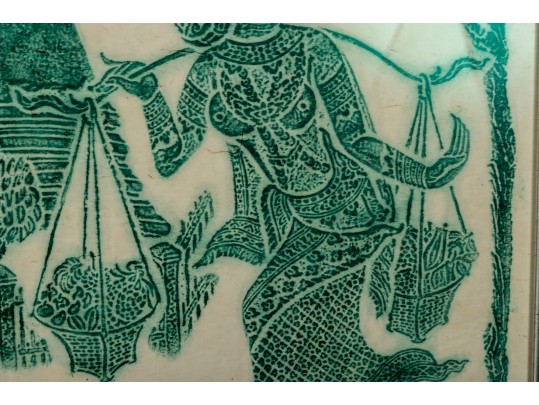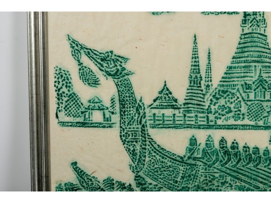 A wonderful pair of Thai temple rubbings in rich, verdant green. The first depicts figures in an impressive rowboat passing in front of the Wat Arun against a vast sky with a trio of swirling clouds. The second depicts a woman carrying baskets surrounded by lush nature and traditional architecture. Both are displayed glazed in matching silvered wood frames.