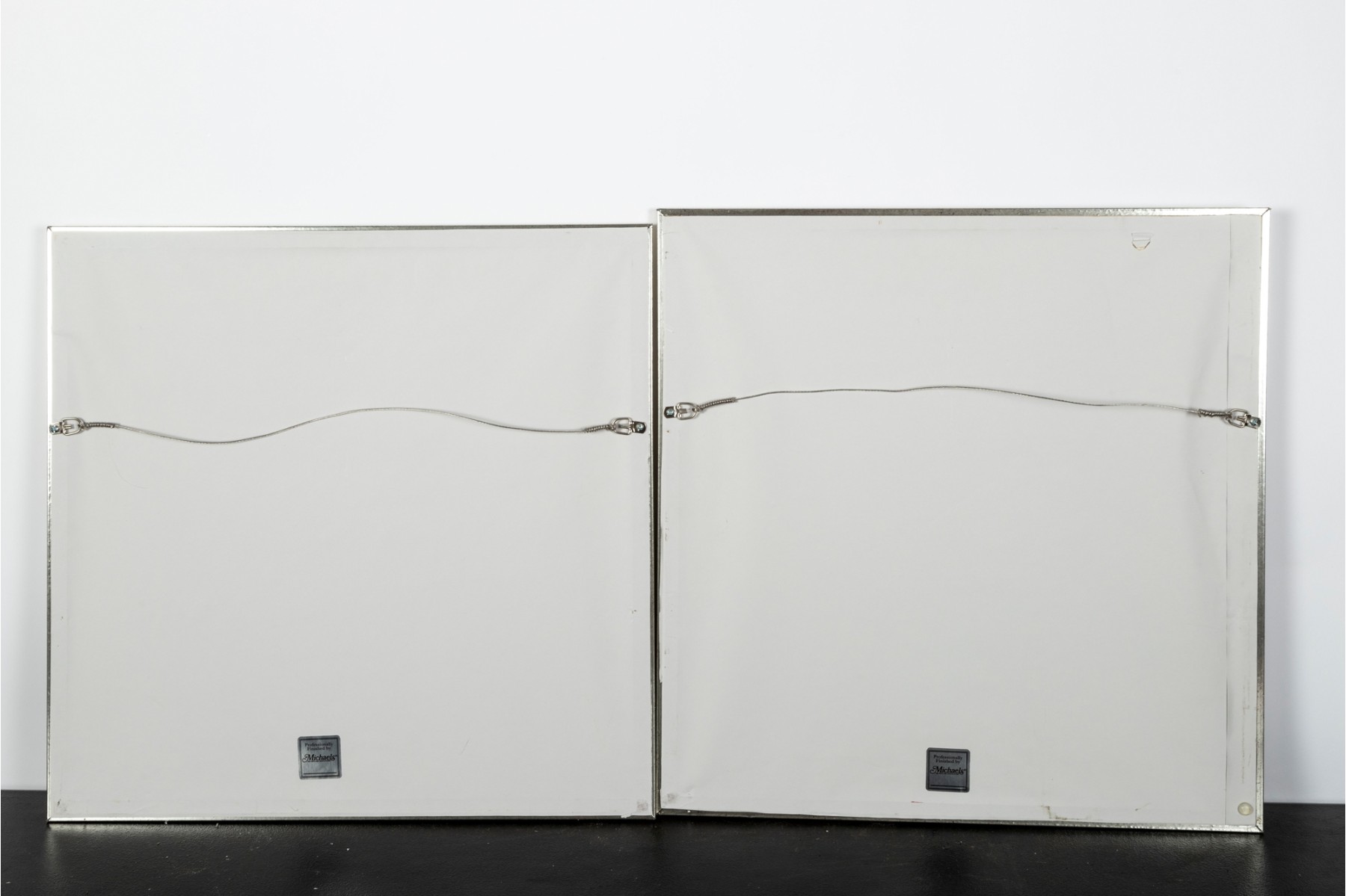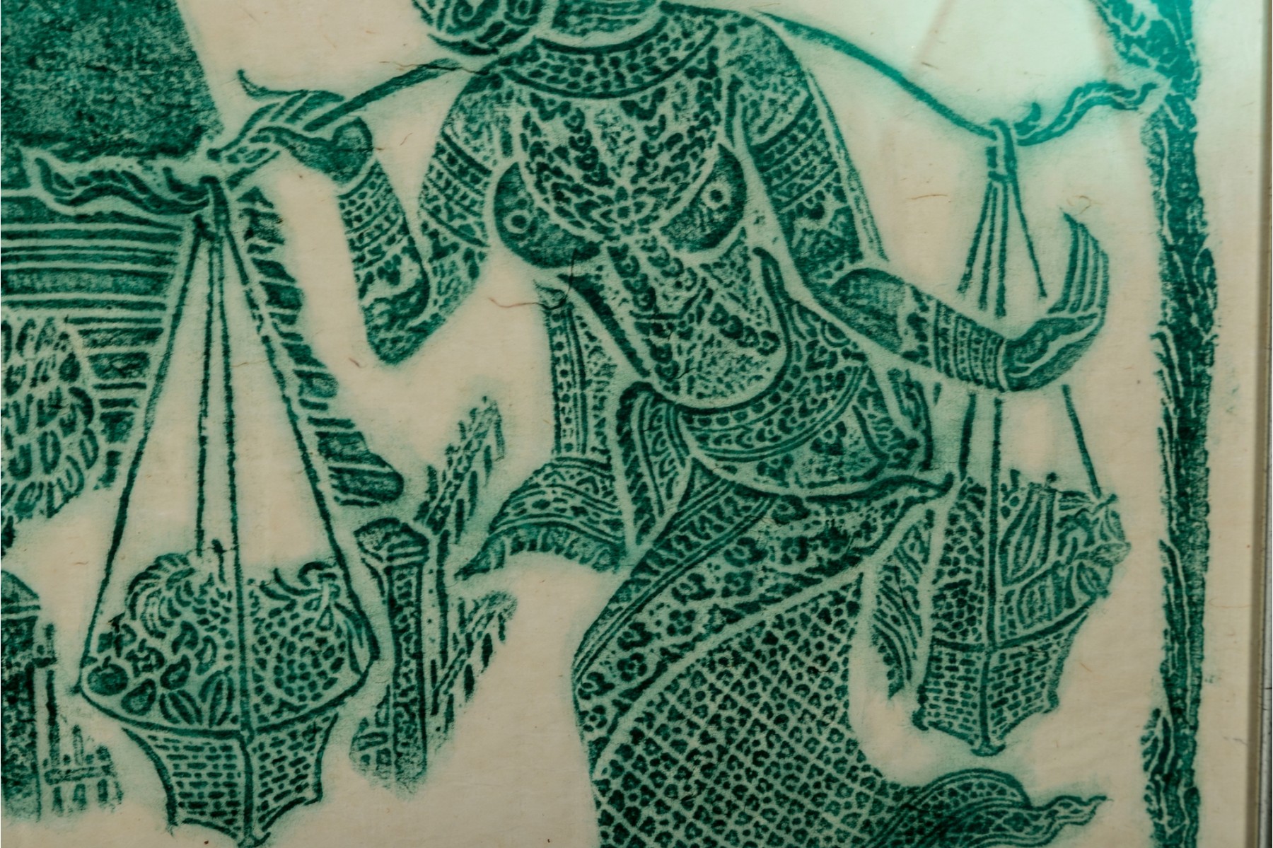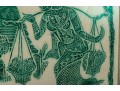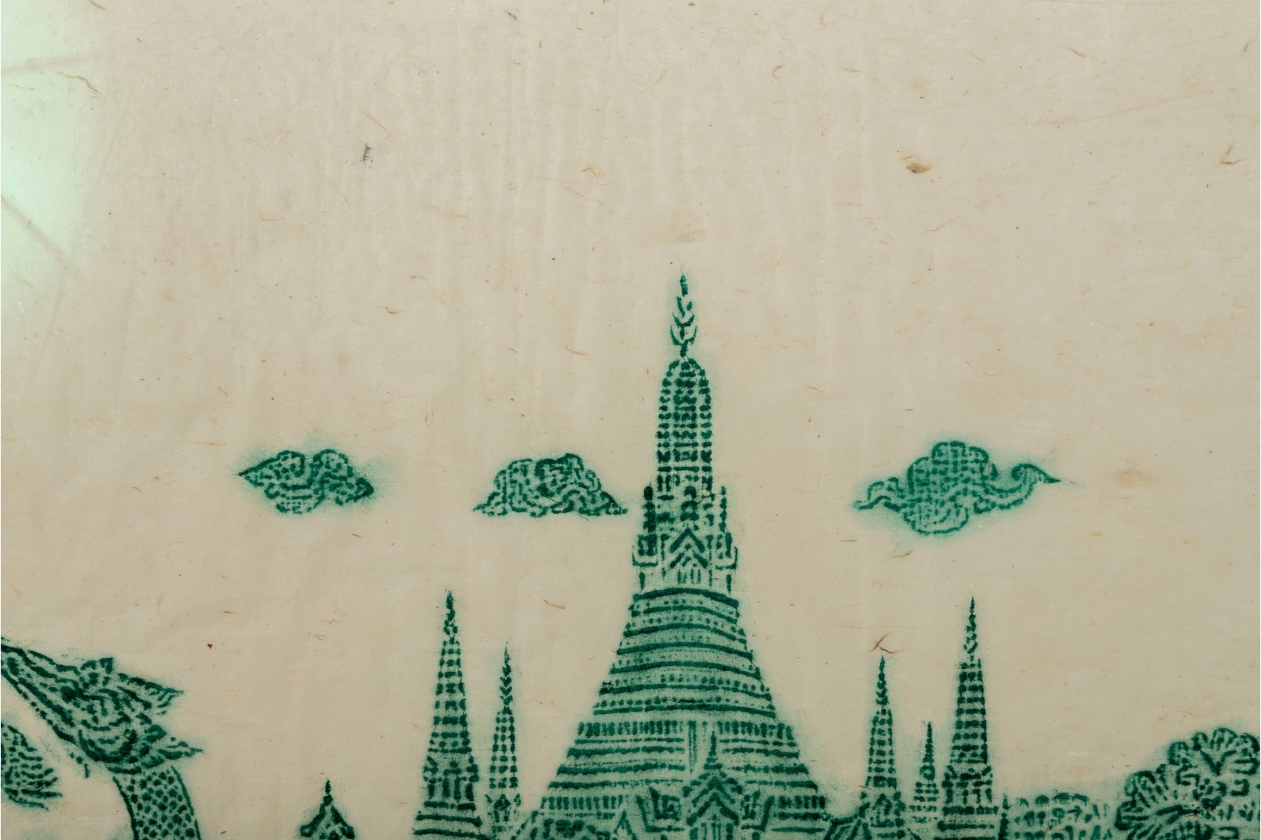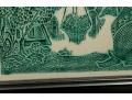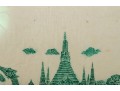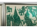 A wonderful pair of Thai temple rubbings in rich, verdant green. The first depicts figures in an impressive rowboat passing in front of the Wat Arun against a vast sky with a trio of swirling clouds. The second depicts a woman carrying baskets surrounded by lush nature and traditional architecture. Both are displayed glazed in matching silvered wood frames.