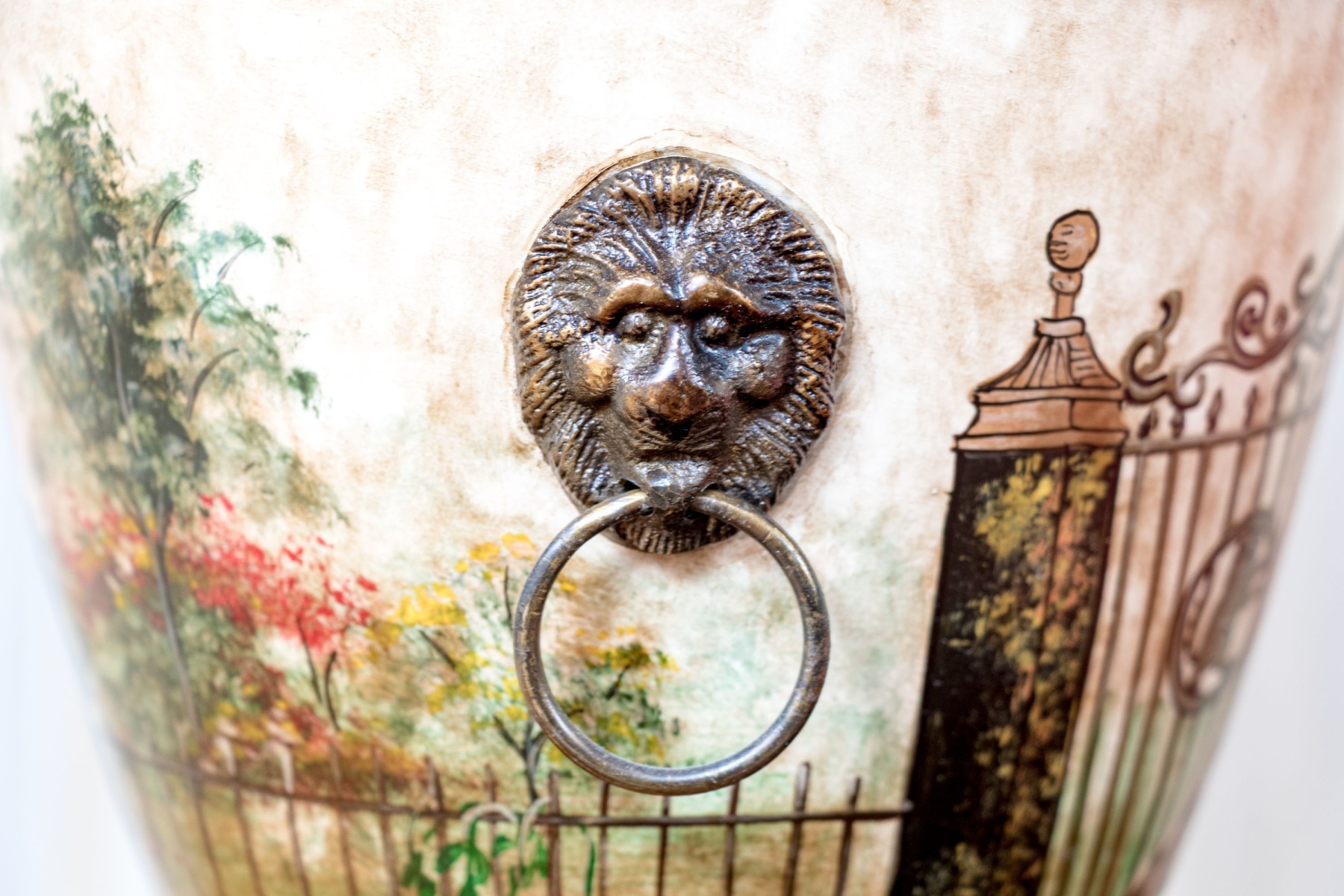 Each standing on square base, with circular foot and pedestal with the affixed lidded urn form body having a pair of brass lion mask and ring handles. Each is decorated with landscape motifs on square bases with shades and urn form finials in gilt.