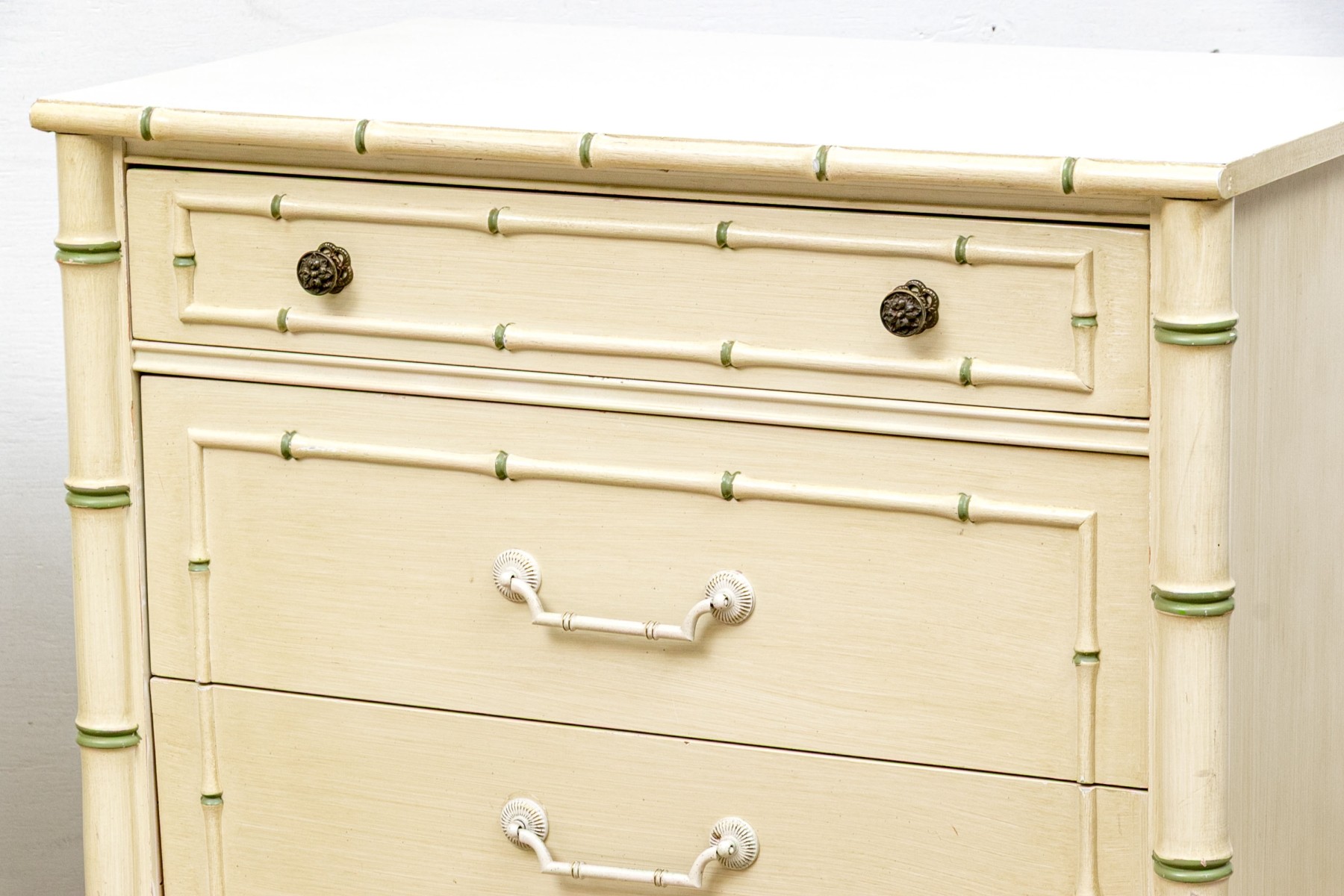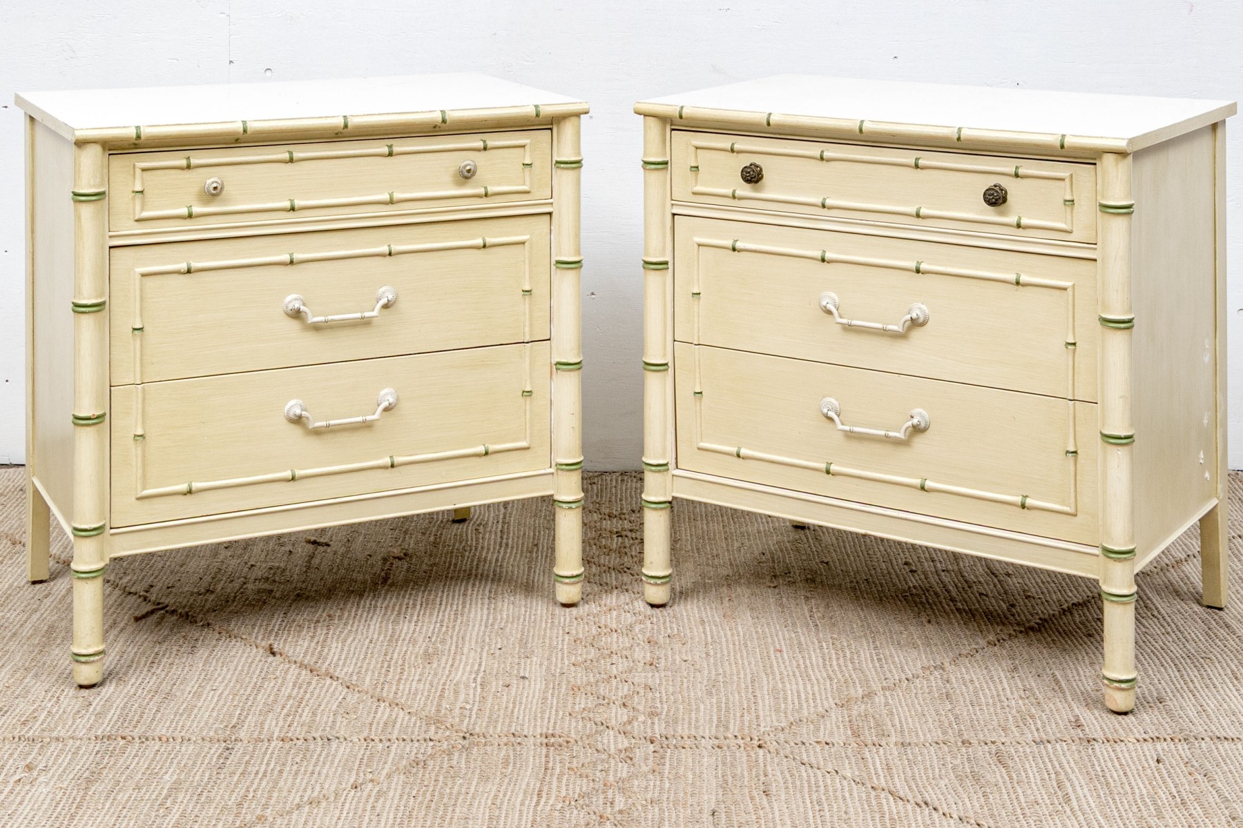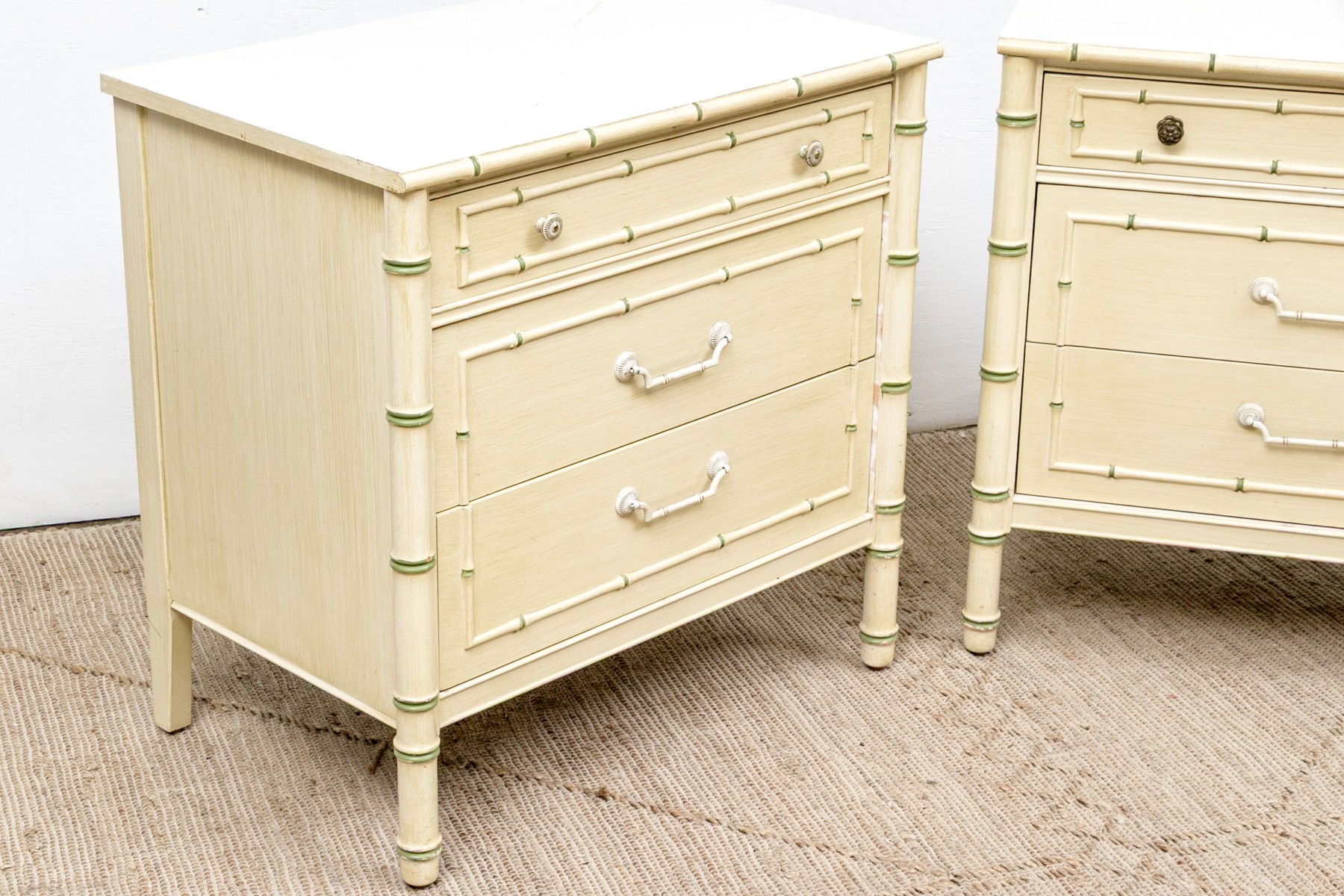 Elegant chests in pale yellow paint with faux bamboo with green ring details on the drawers and front legs. White tops over a frieze drawer with brass knob pulls on one. The other chest frieze with white painted metal knobs. The two long drawers with white painted metal bales, the top drawer with a divider, Raised on faux bamboo front legs and square curved back legs.