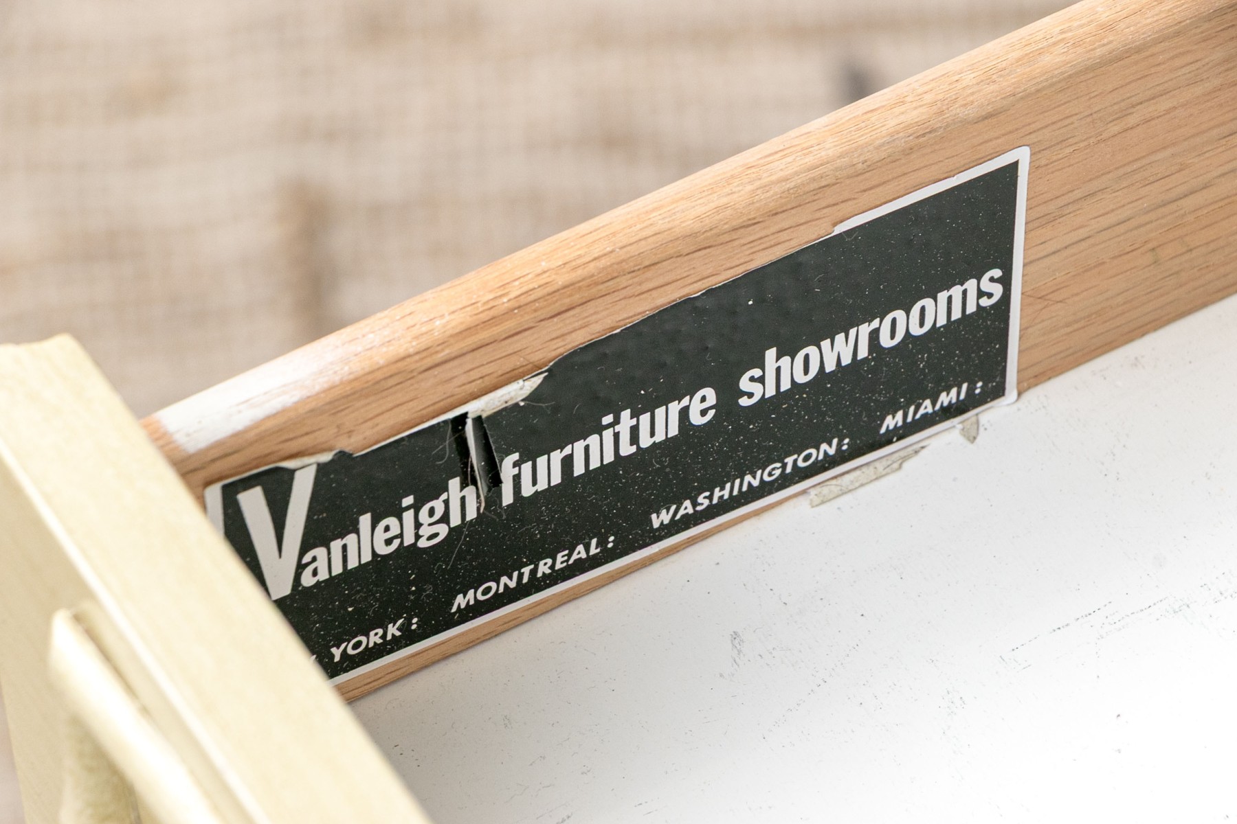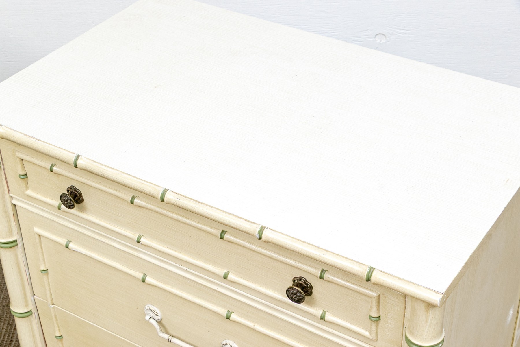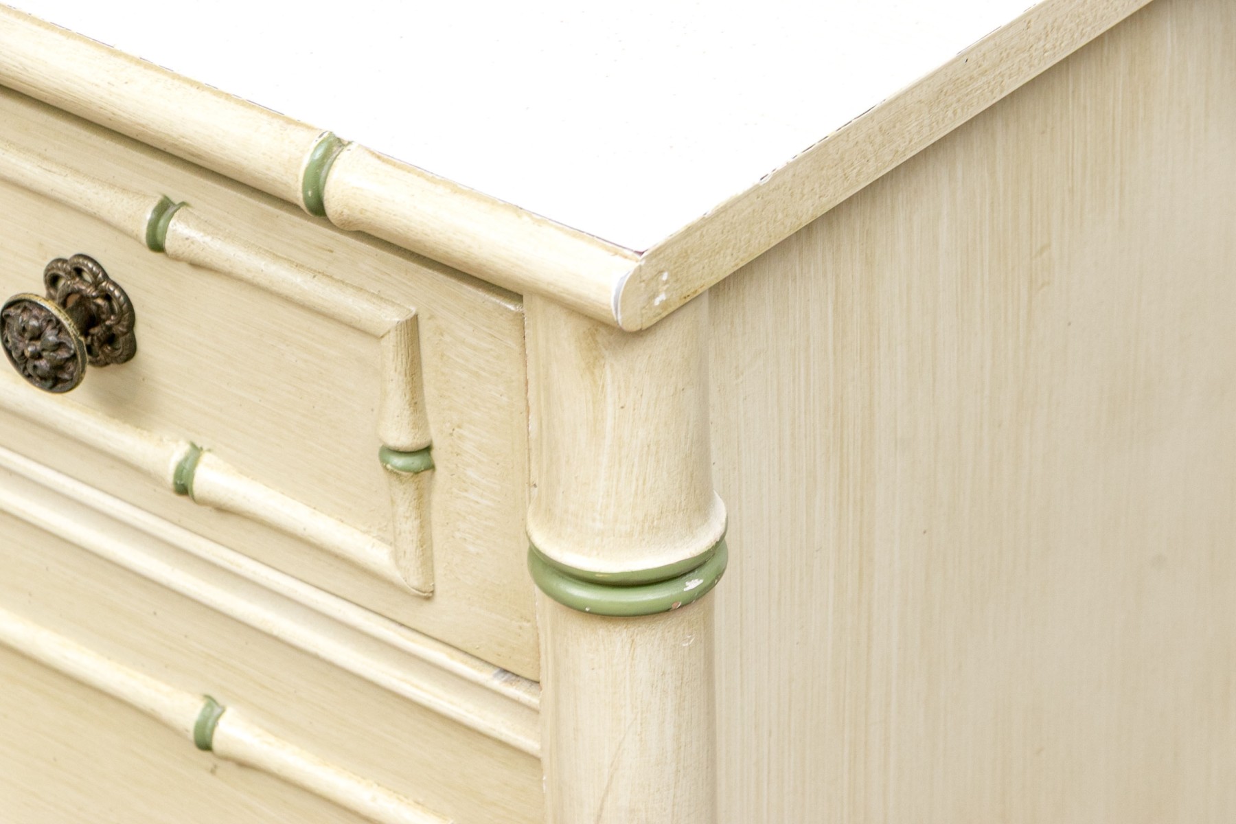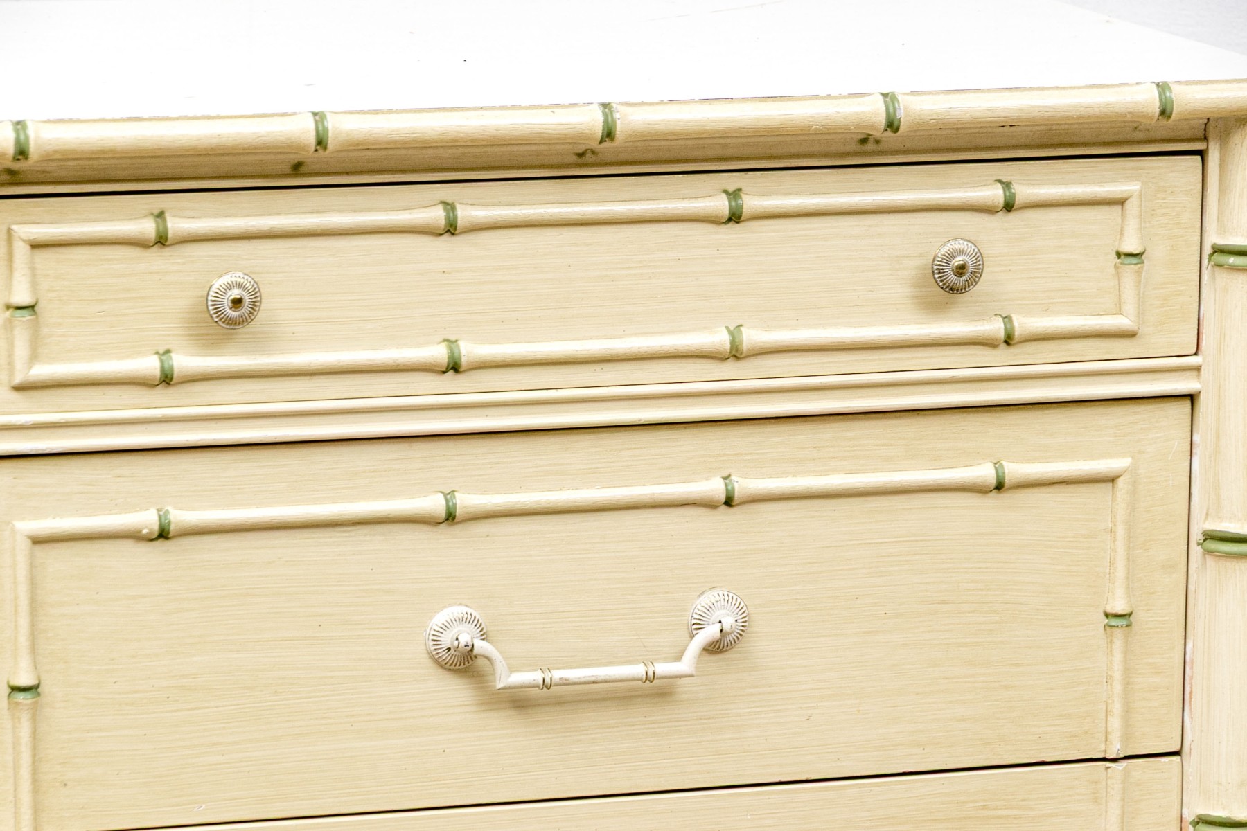 Elegant chests in pale yellow paint with faux bamboo with green ring details on the drawers and front legs. White tops over a frieze drawer with brass knob pulls on one. The other chest frieze with white painted metal knobs. The two long drawers with white painted metal bales, the top drawer with a divider, Raised on faux bamboo front legs and square curved back legs.