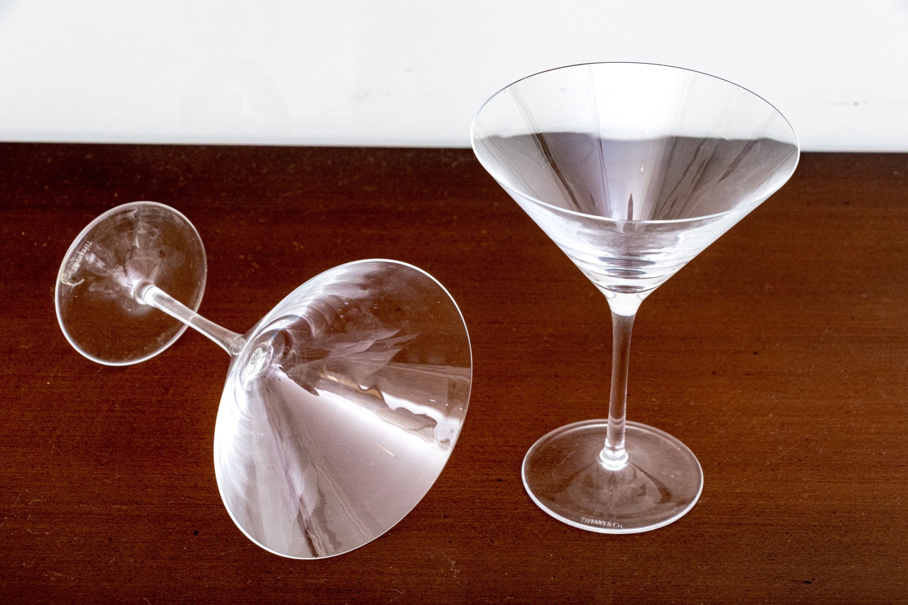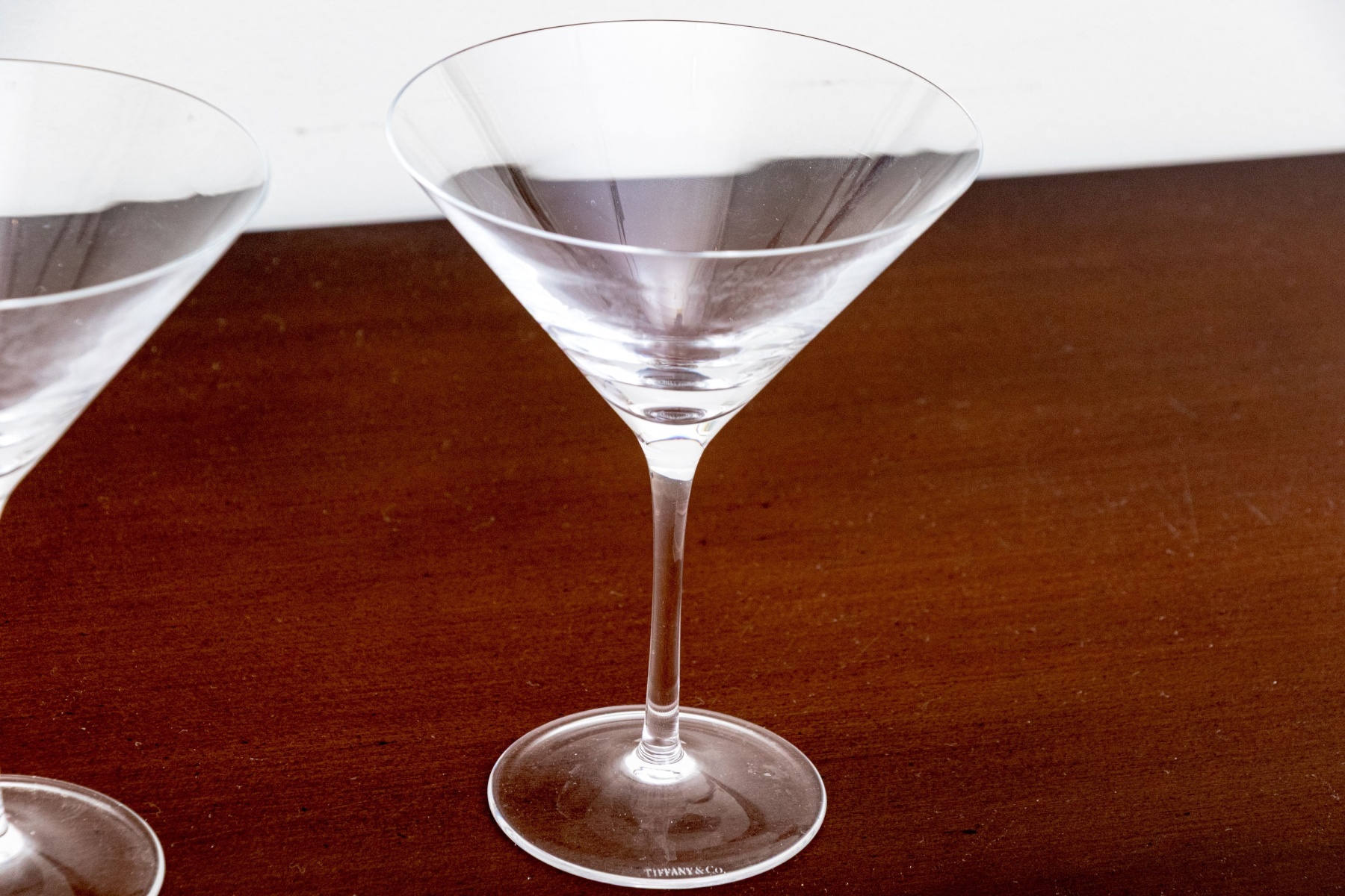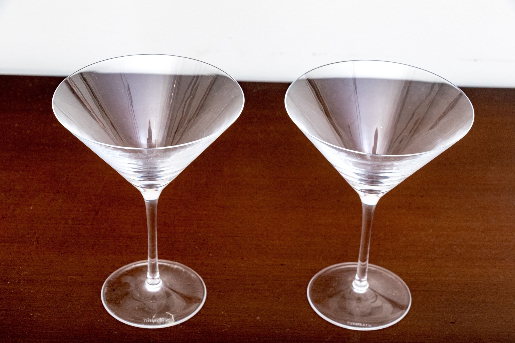 An elegant pair of Tiffany & Co. crystal martini glasses in classic form with thin stems balanced on circular feet. Both marked underfoot.