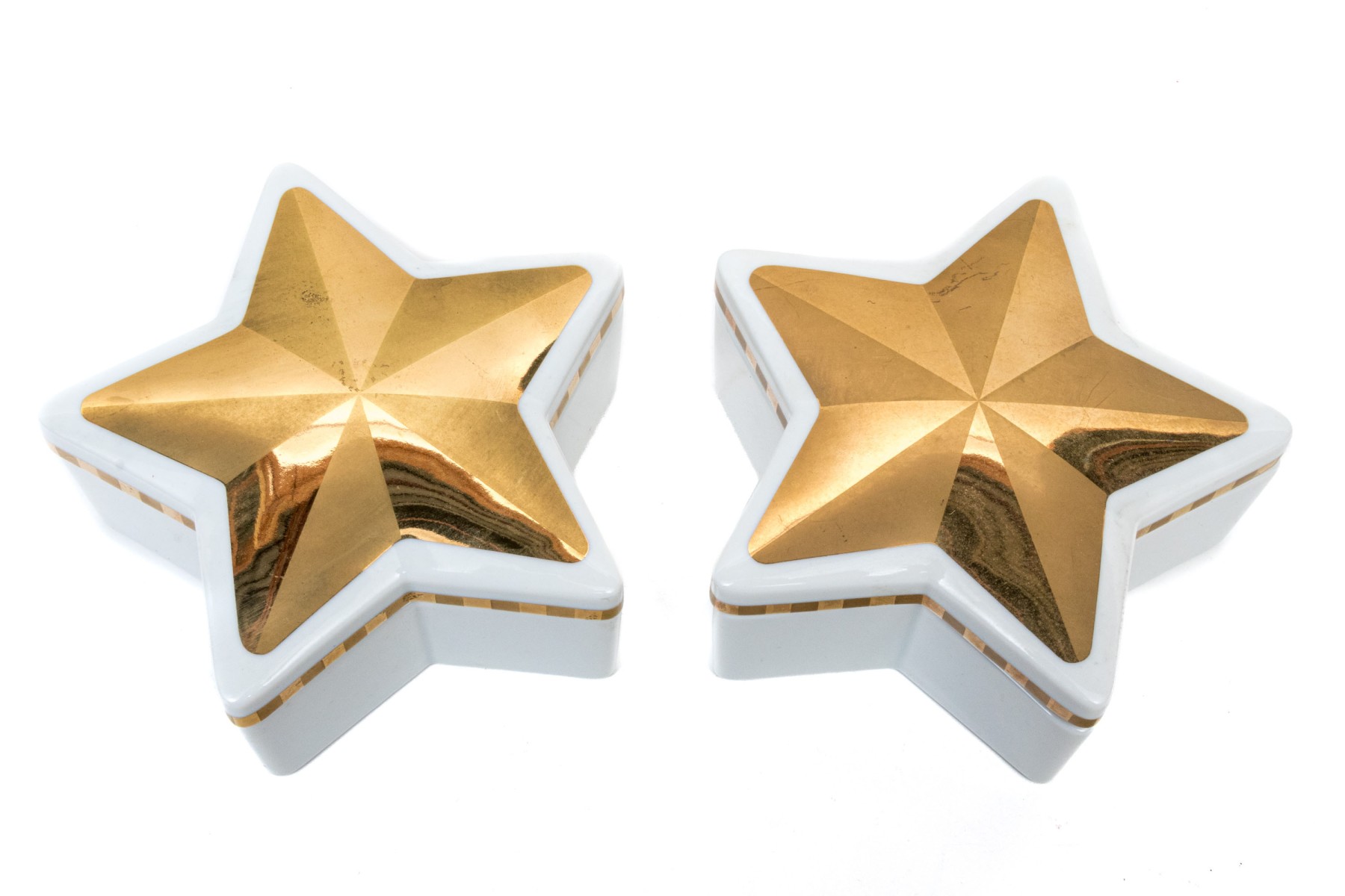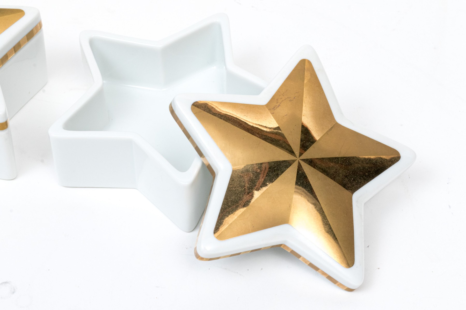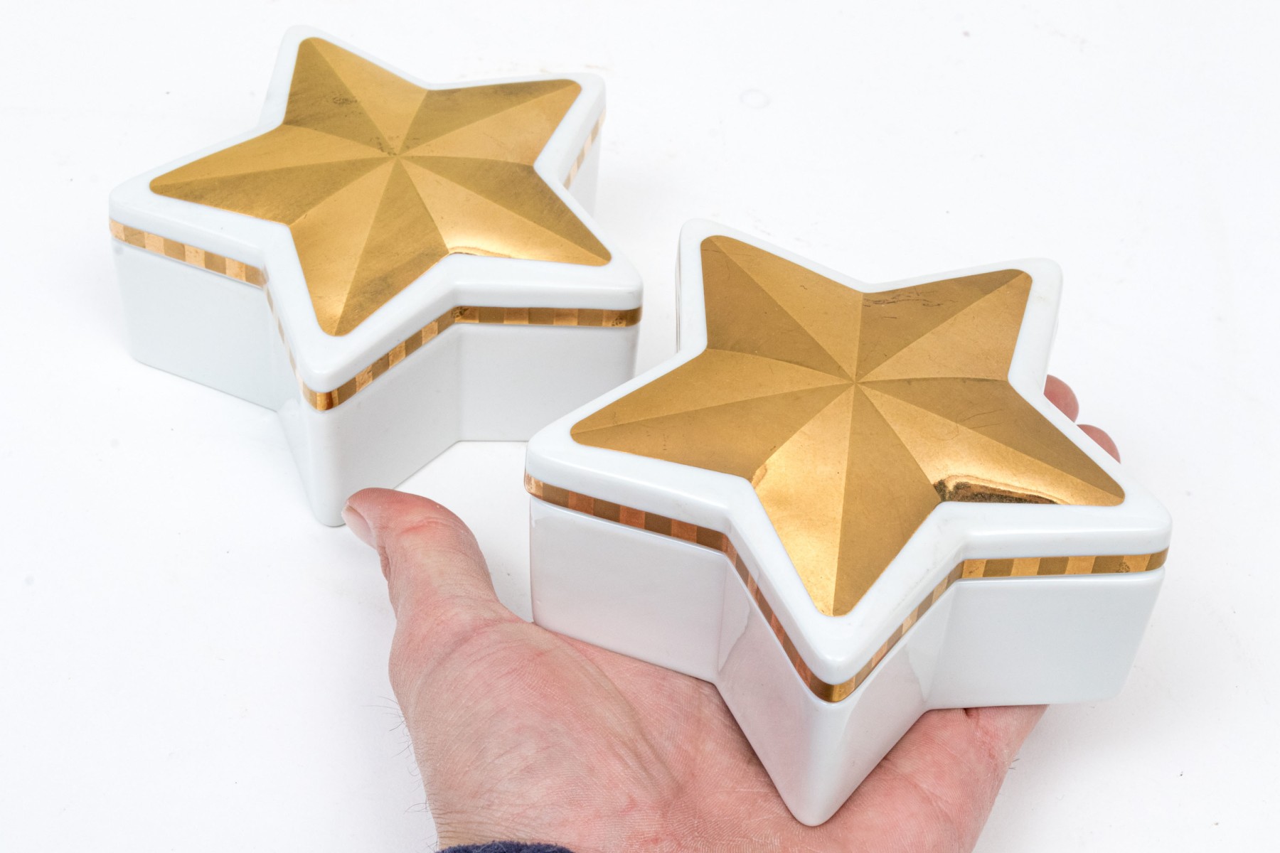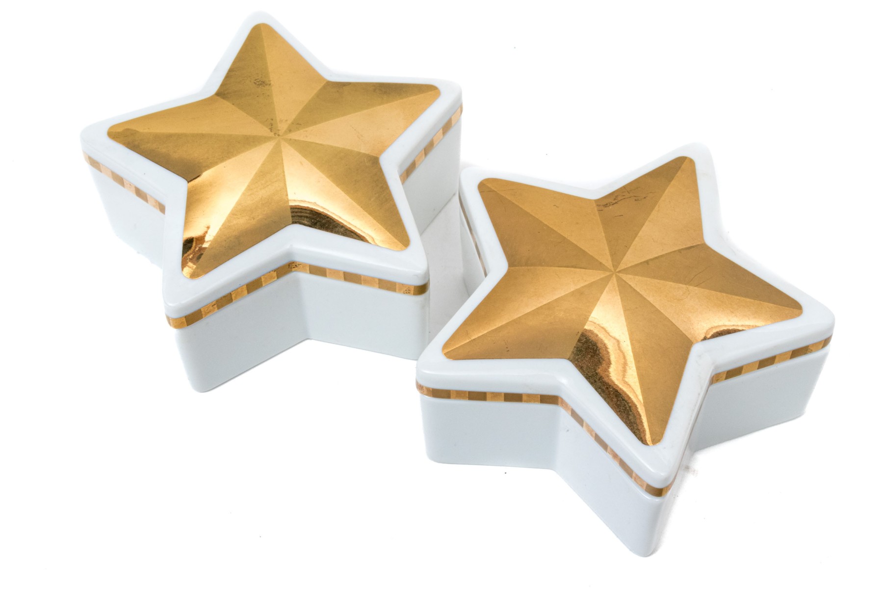 Pretty white star shapes with raised two- tone gilt lids. Made in Japan.