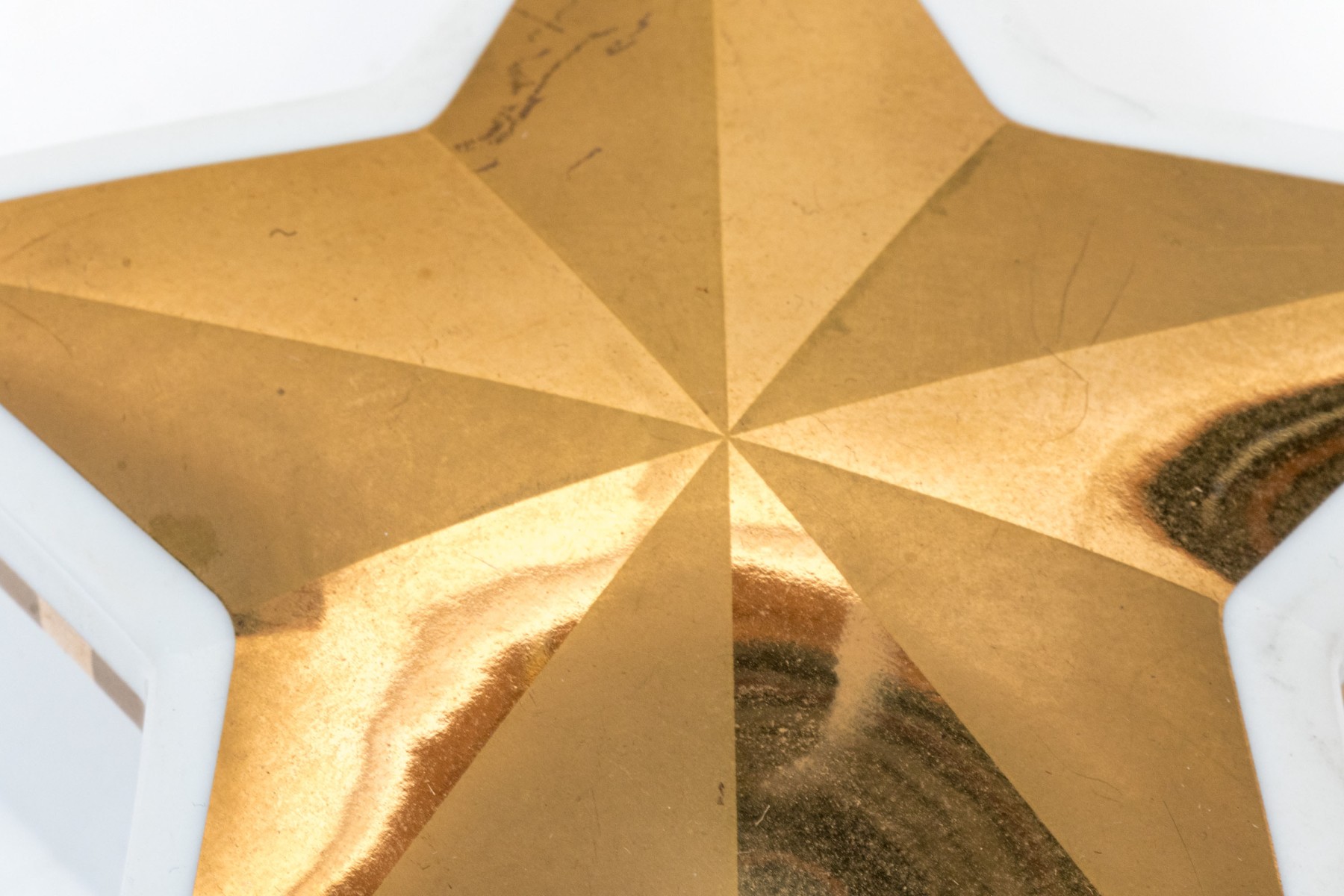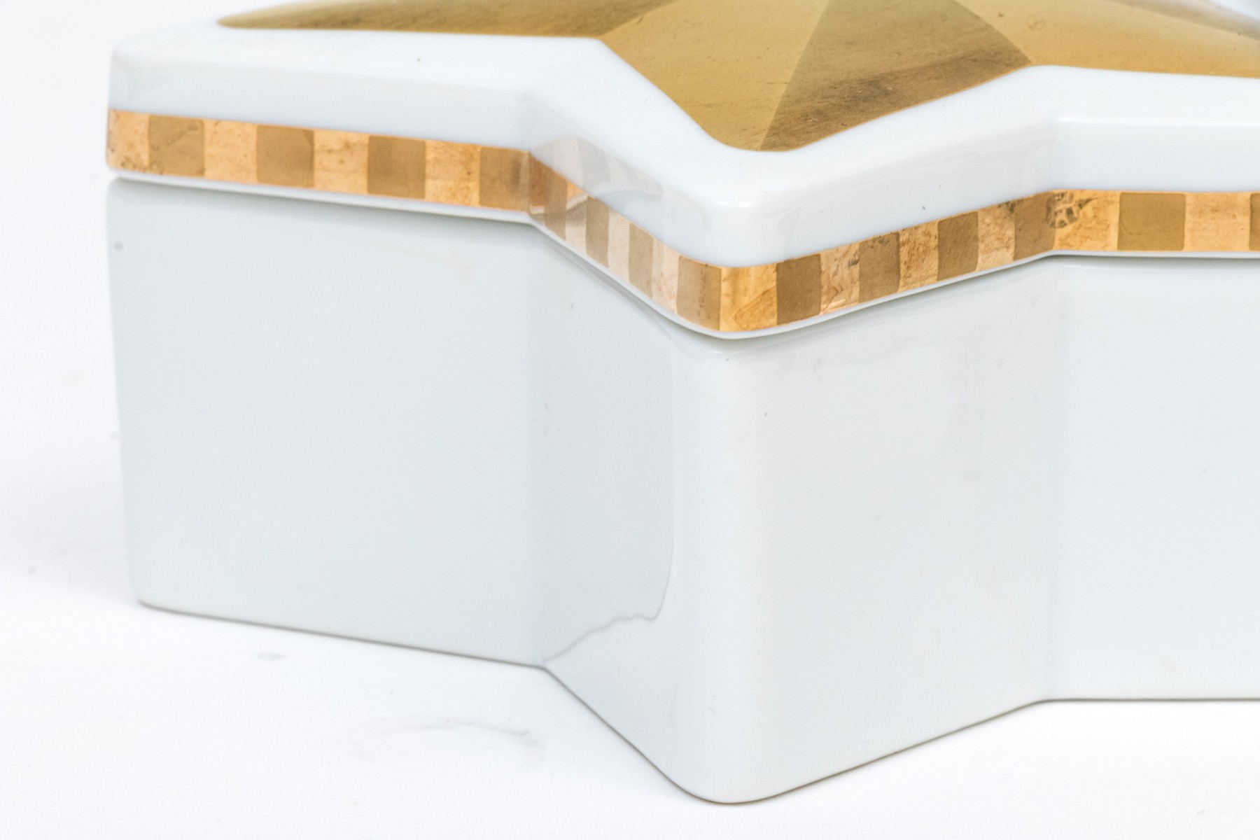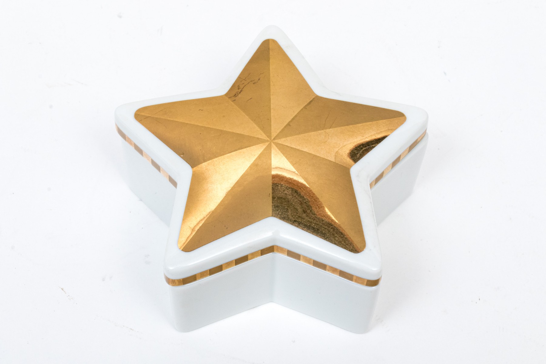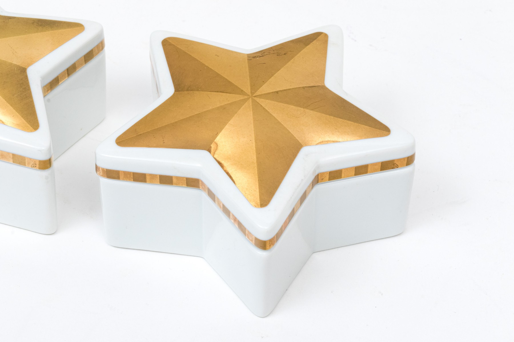 Pretty white star shapes with raised two- tone gilt lids. Made in Japan.