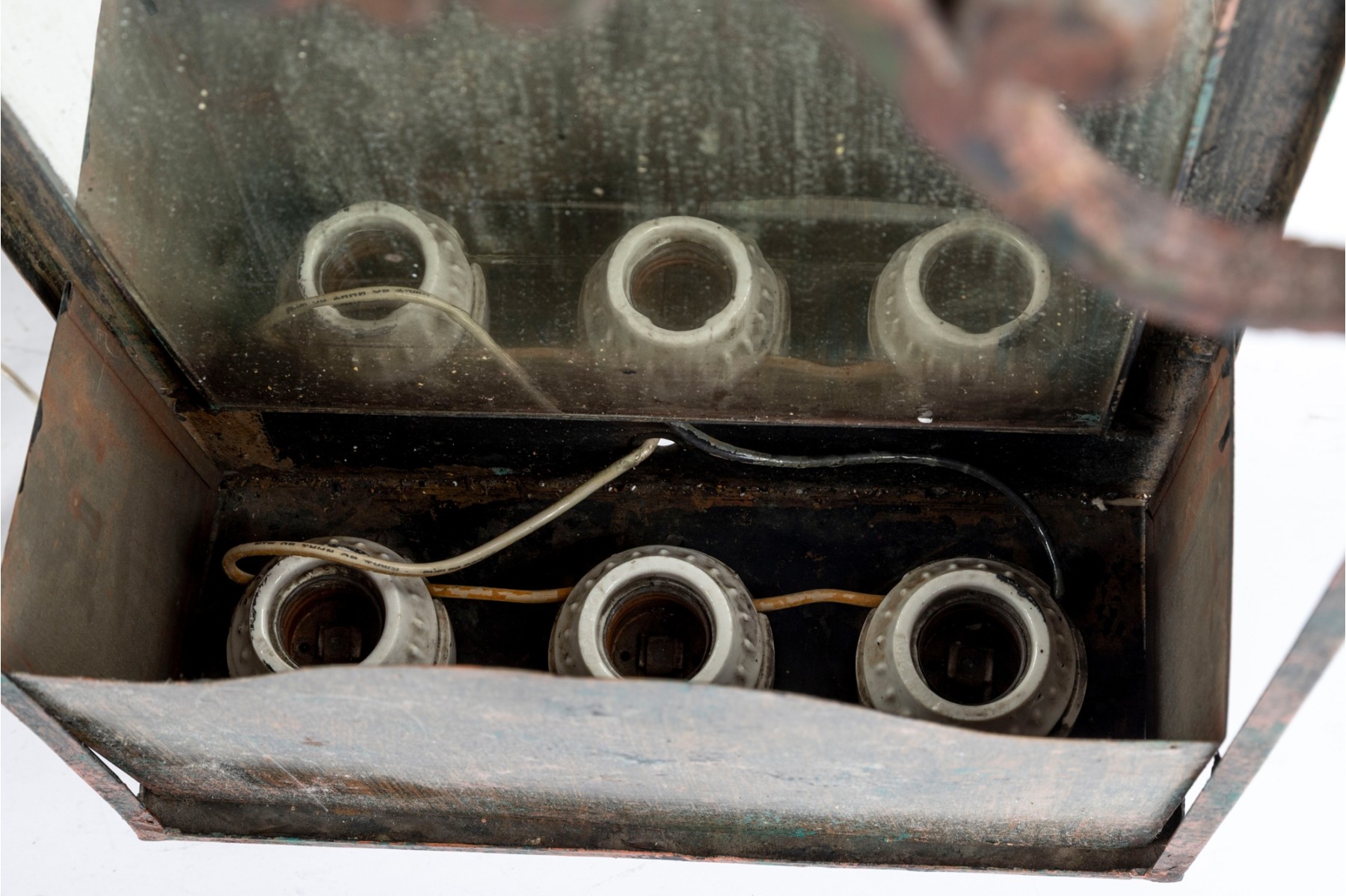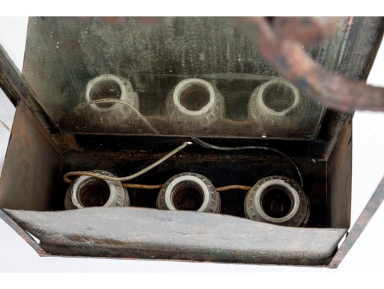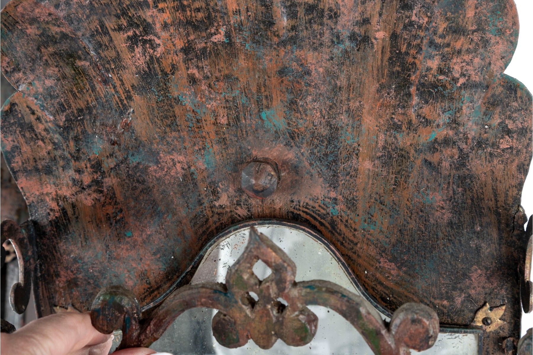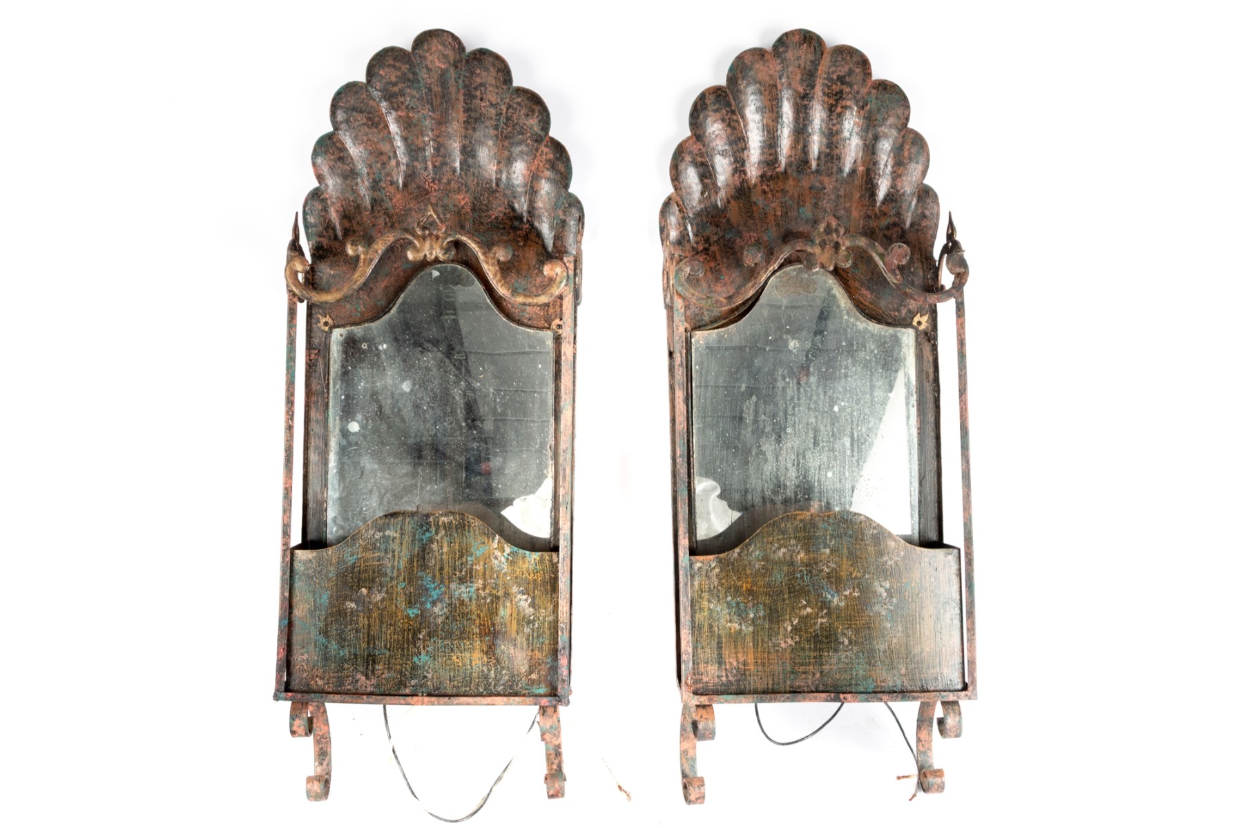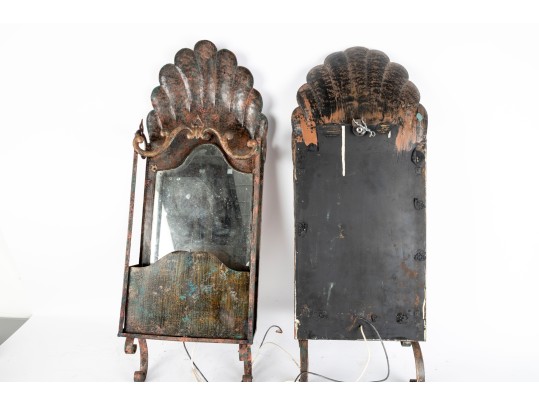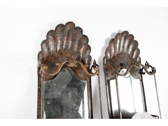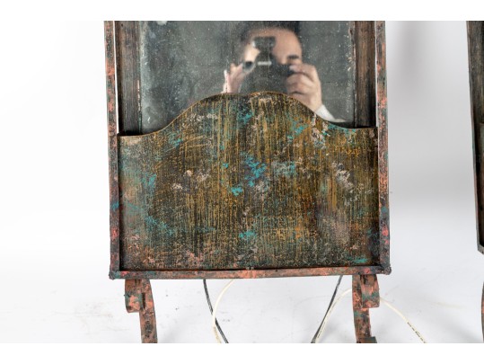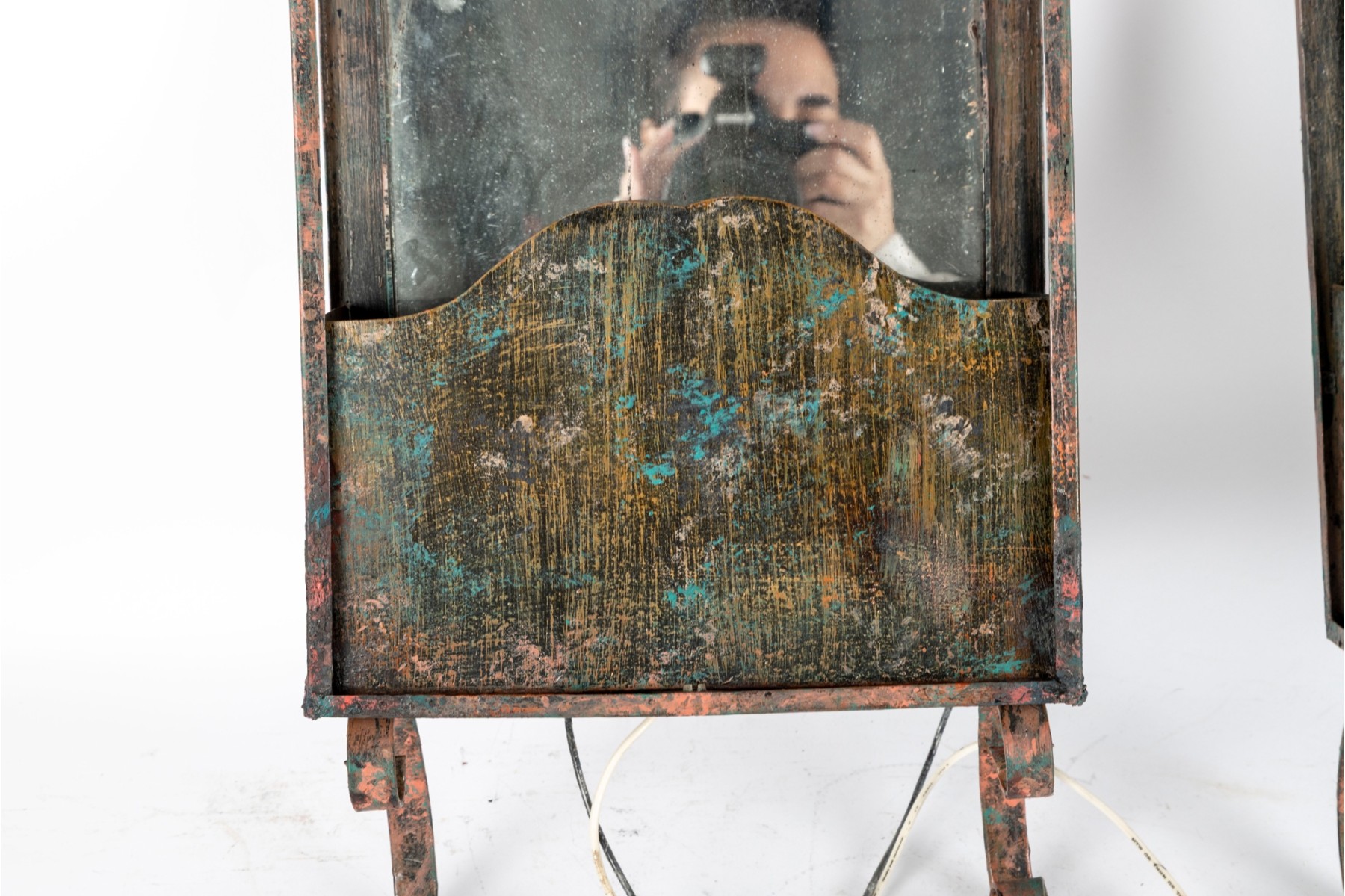 With intentional distressing to the mirrors and finishes. Untested. One sconce has wooden front trim -- replacing the tole metal original.