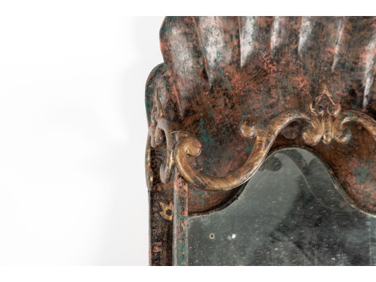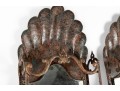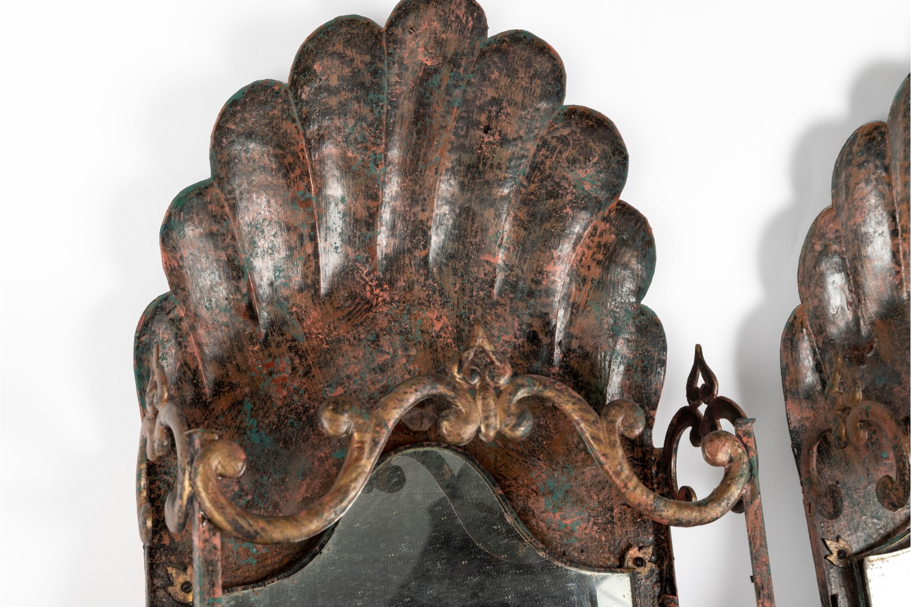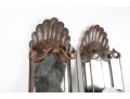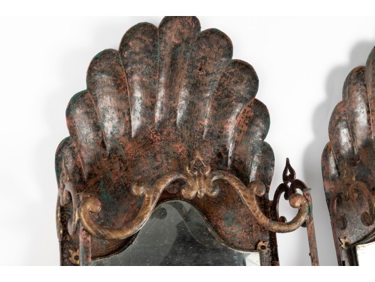 A delightful pair of wall sconces exuding Art Deco and Hollywood Regency glamour with arched shell form pediments over serpentine mirror plaques on rectangular bodies leading to three bulb sockets within curved front panels adorned with elegant scrolled posts over palmier scrolled finial brackets. In beautifully antiqued finishes with orange, blue, and yellow dappled tones.