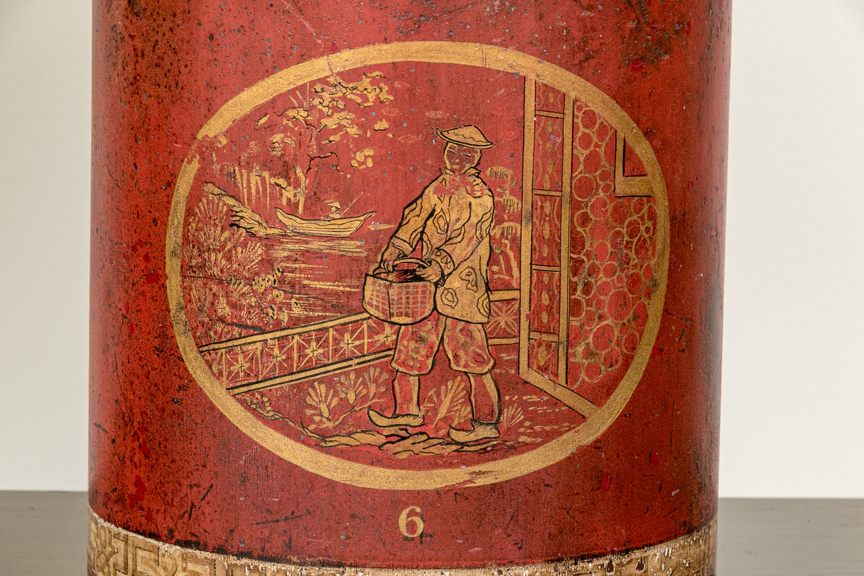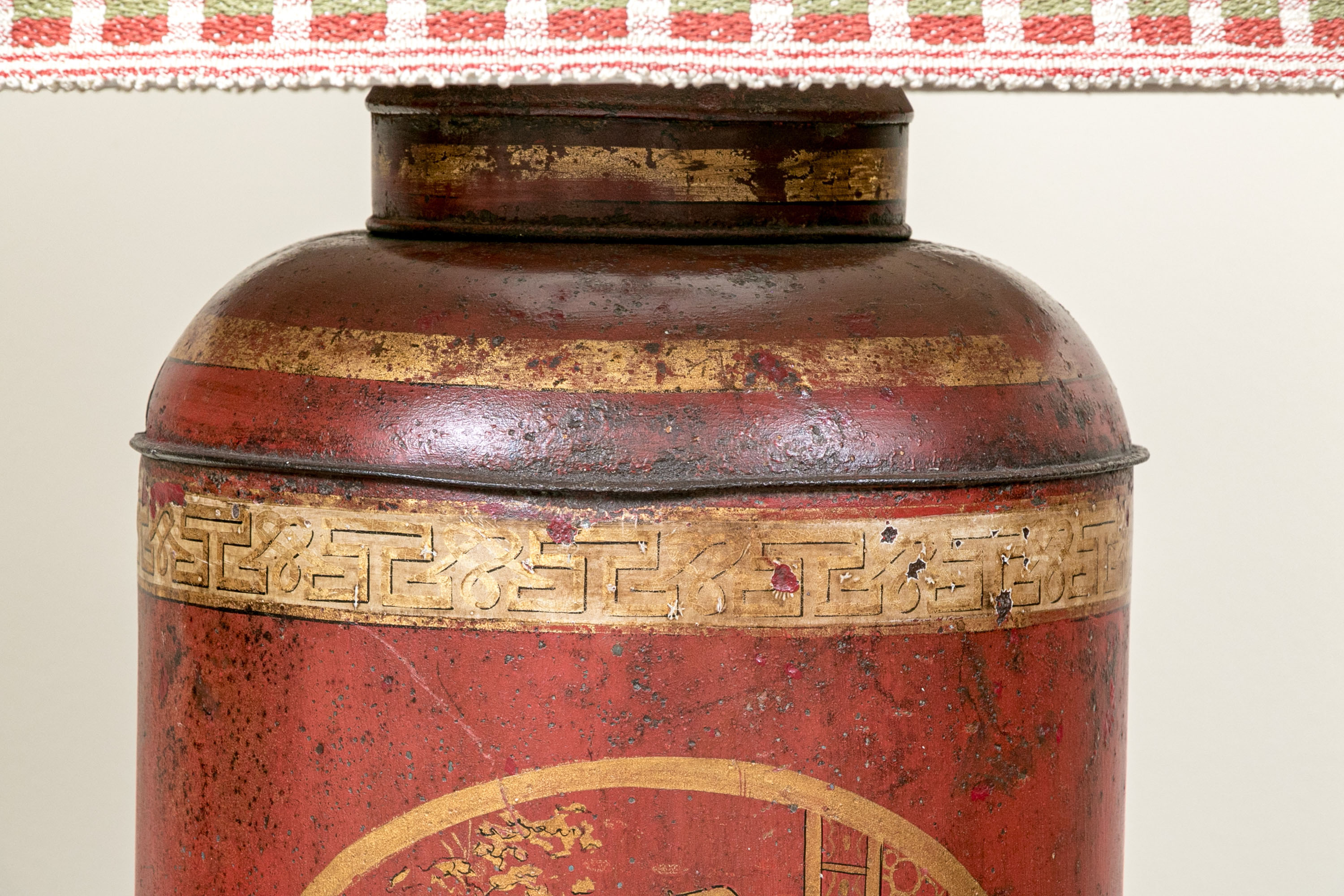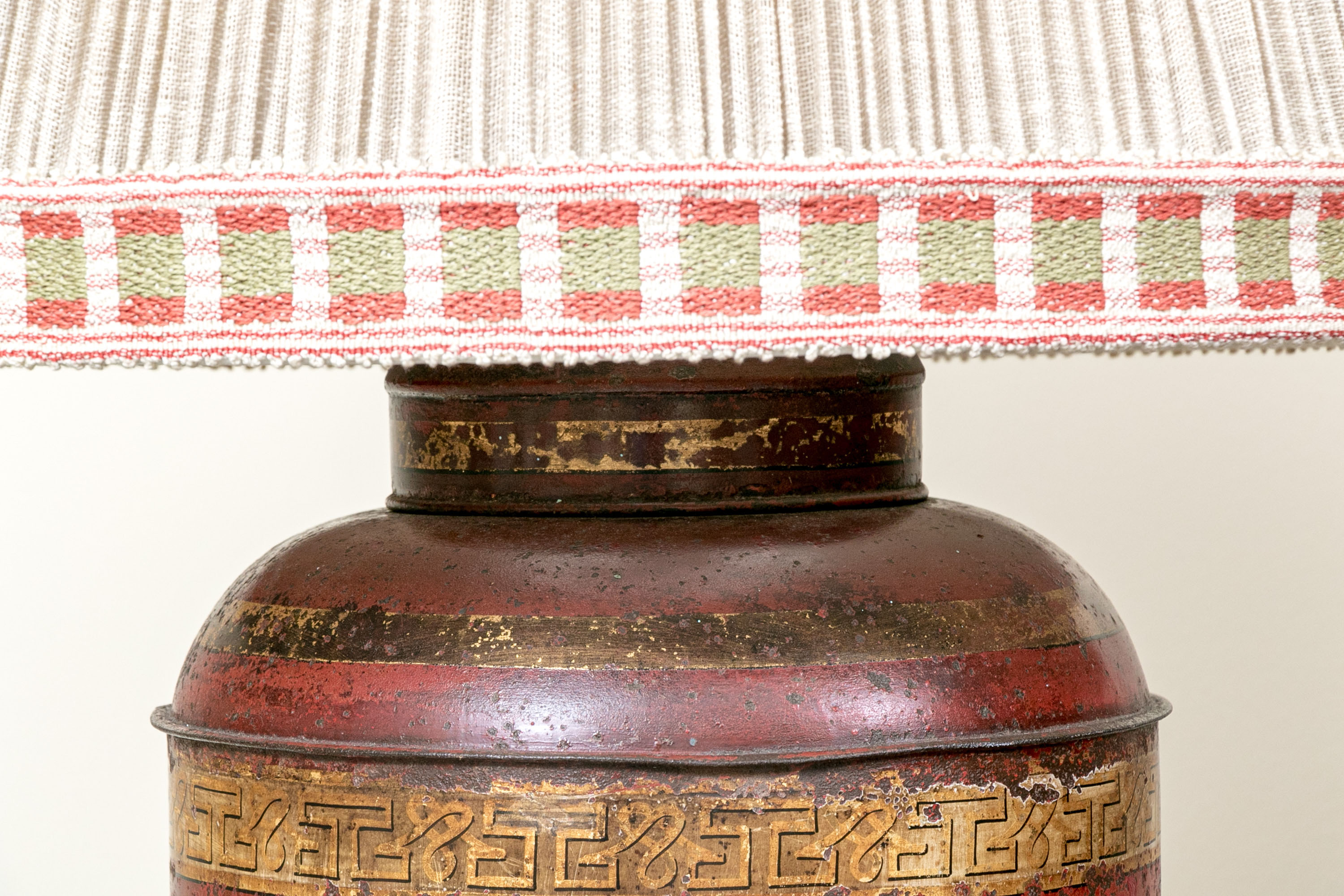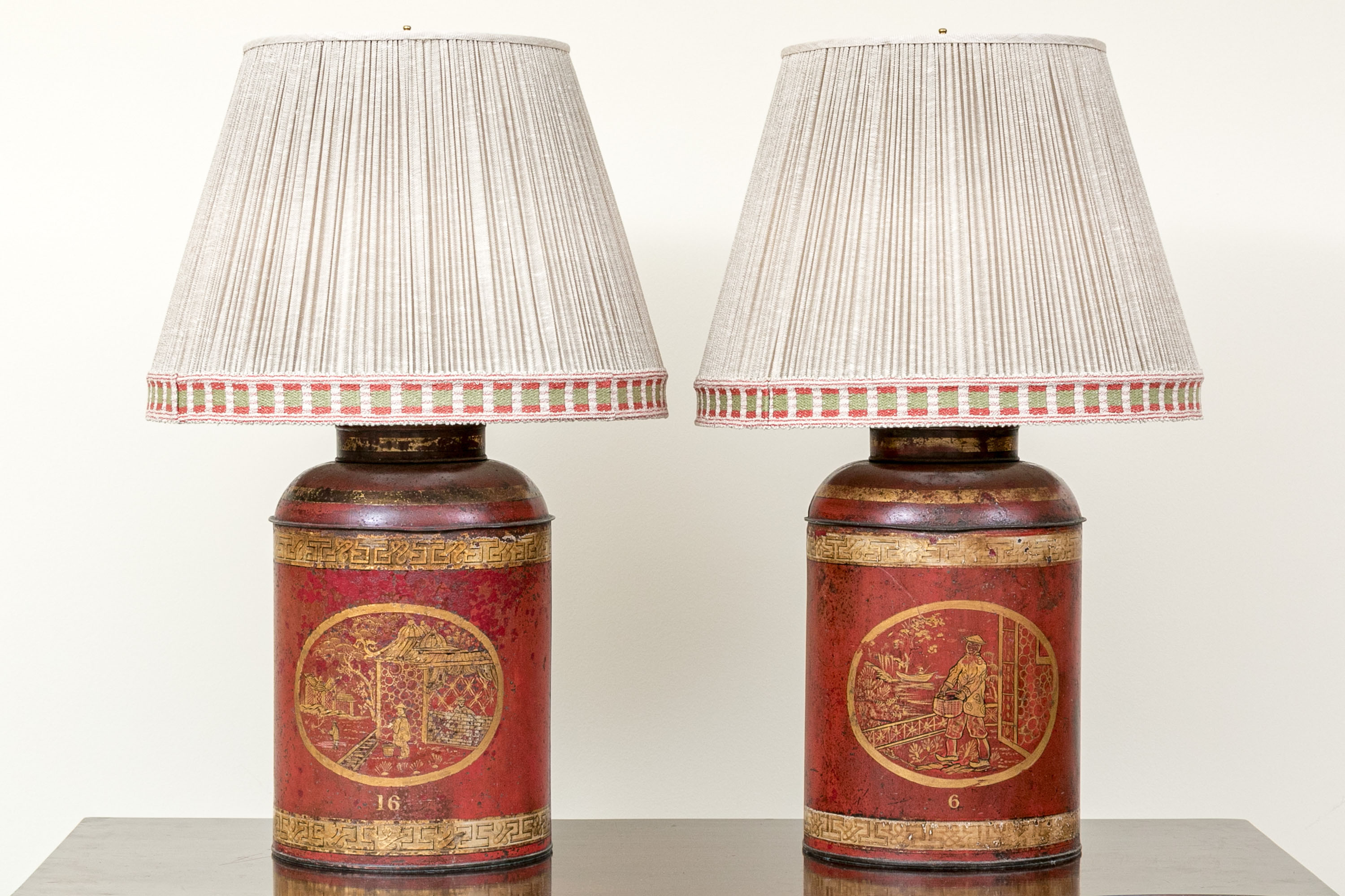 A fabulous pair of chinoiserie tea caddy form table lamps tole red with gilt decoration. Topped with pleated gauzy white fabric empire shaded detailed with red and green borders.