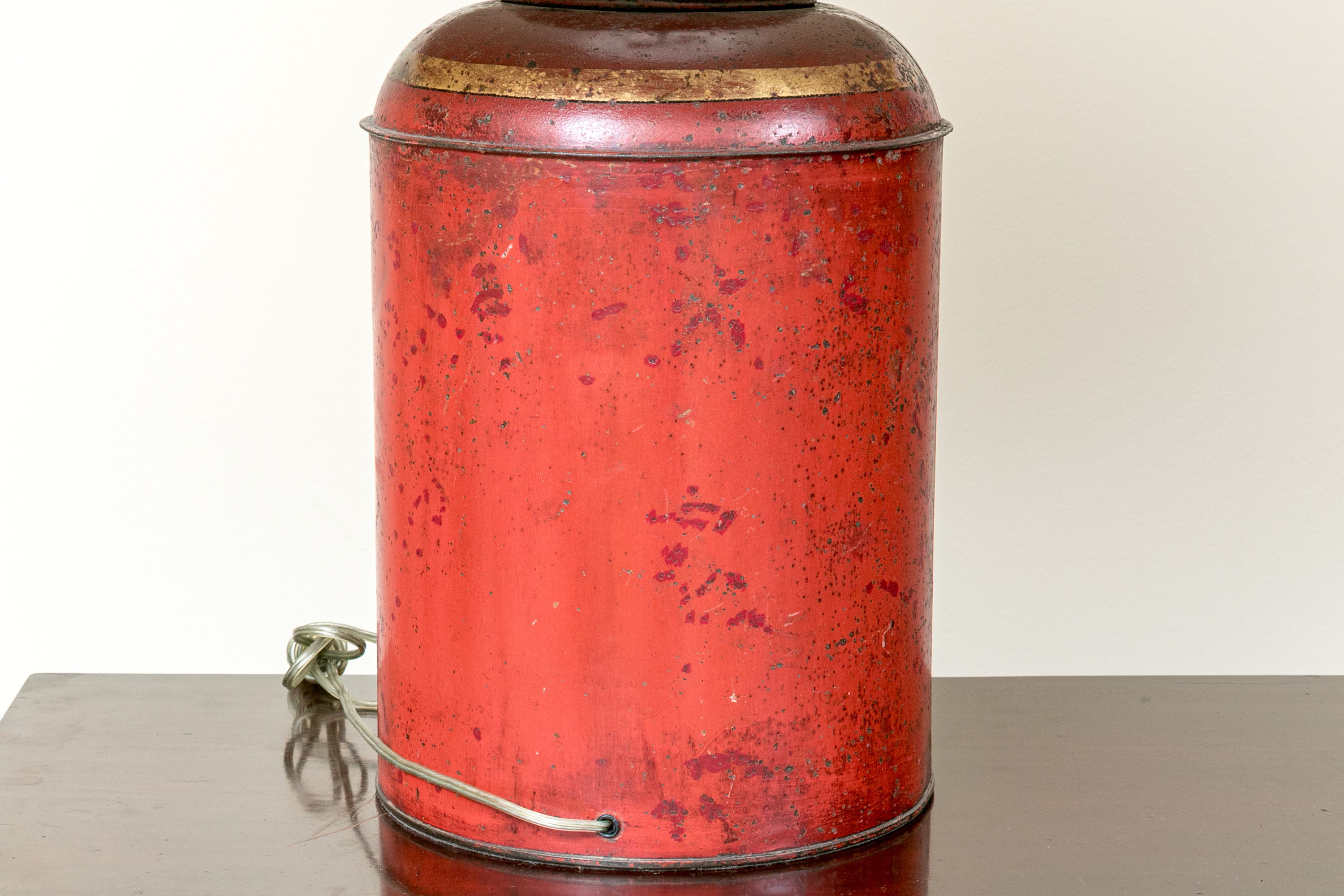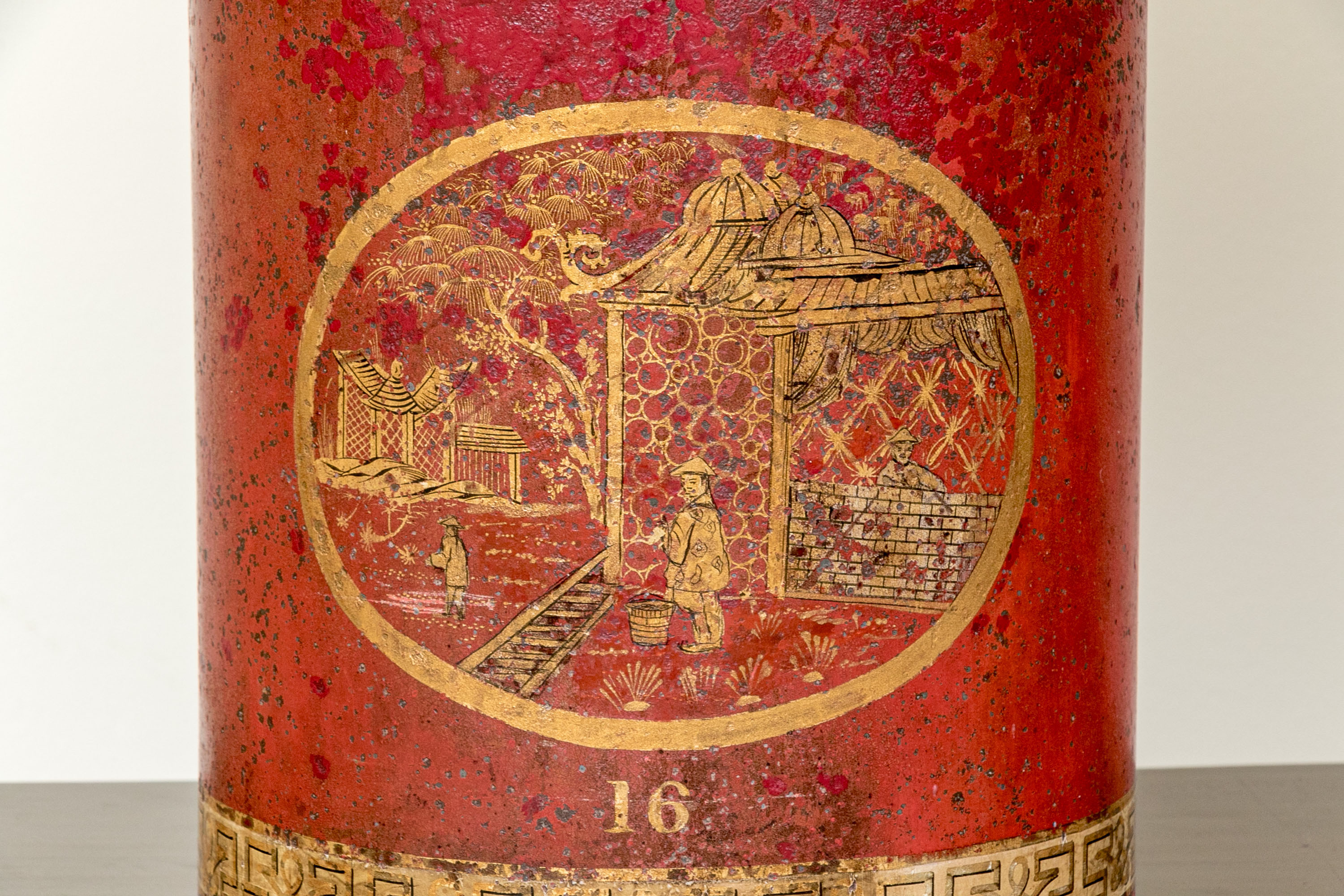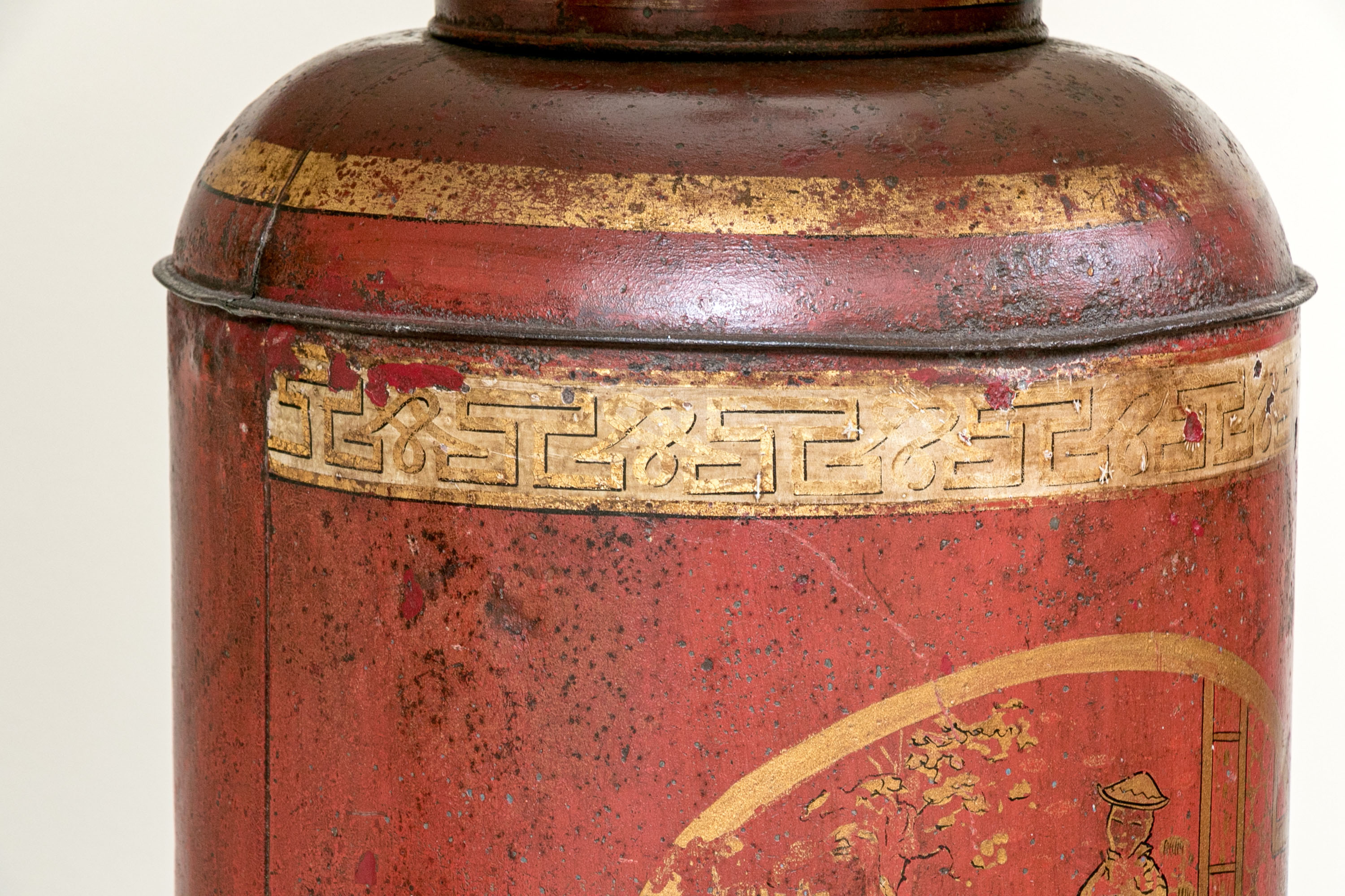 A fabulous pair of chinoiserie tea caddy form table lamps tole red with gilt decoration. Topped with pleated gauzy white fabric empire shaded detailed with red and green borders.
