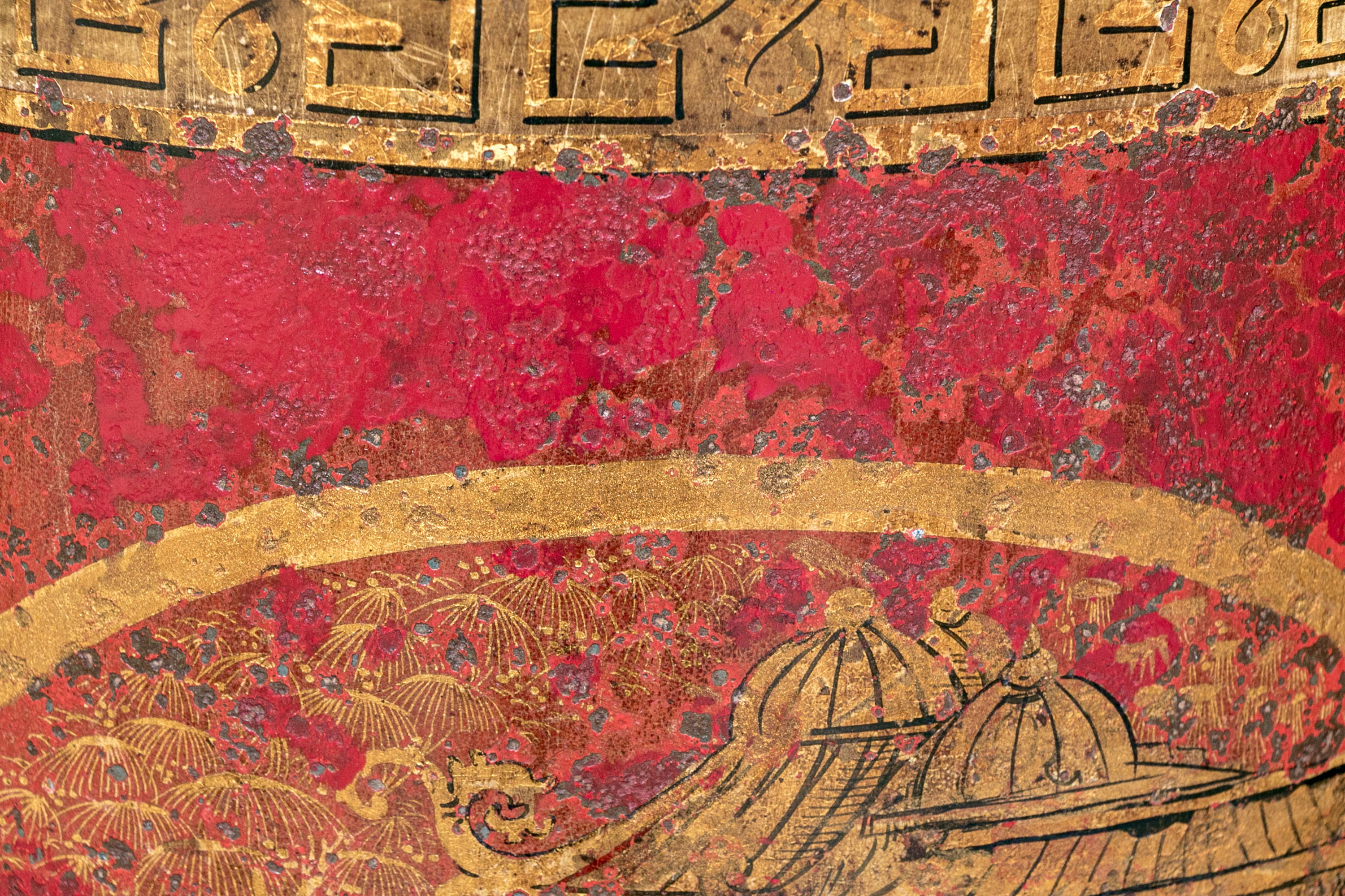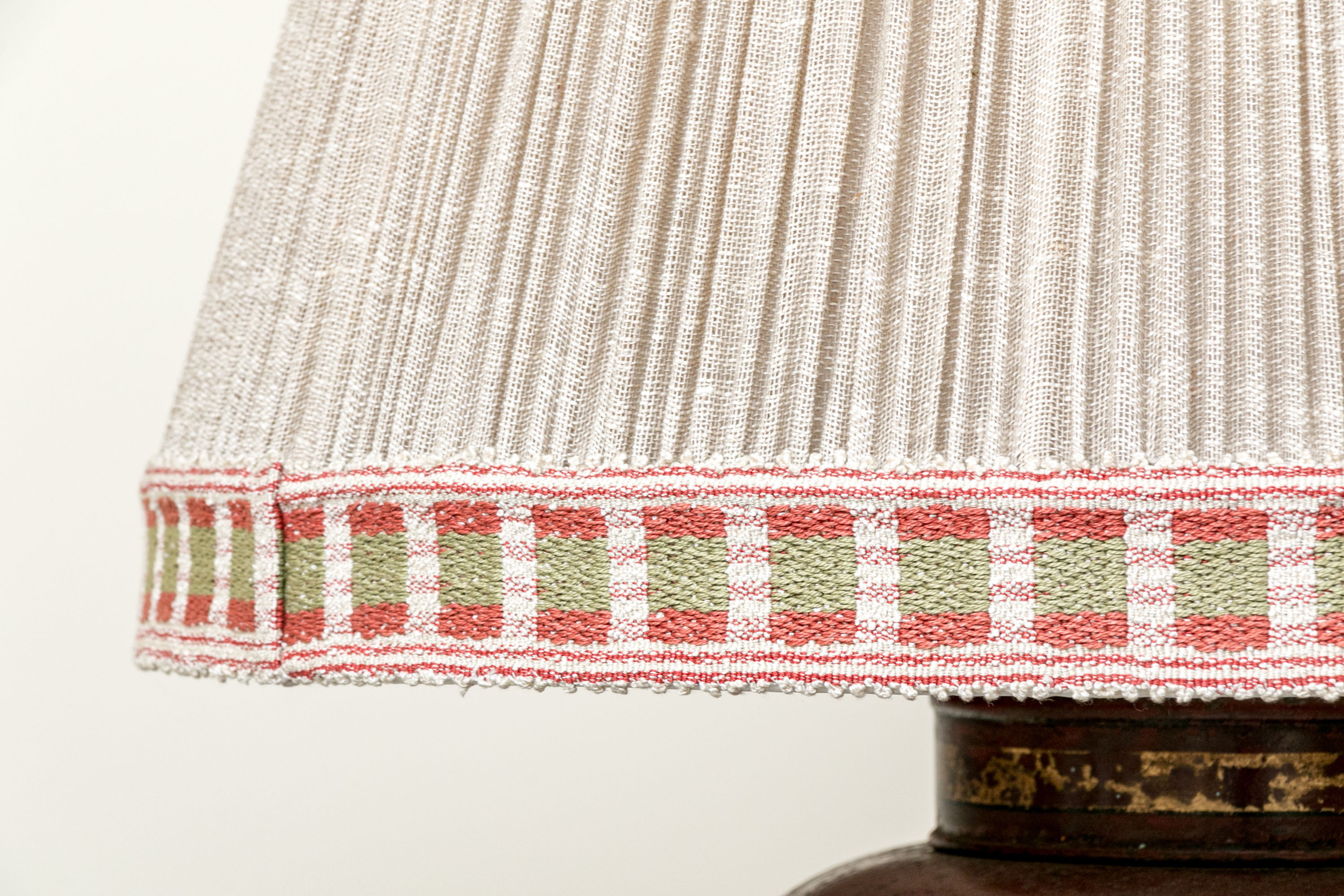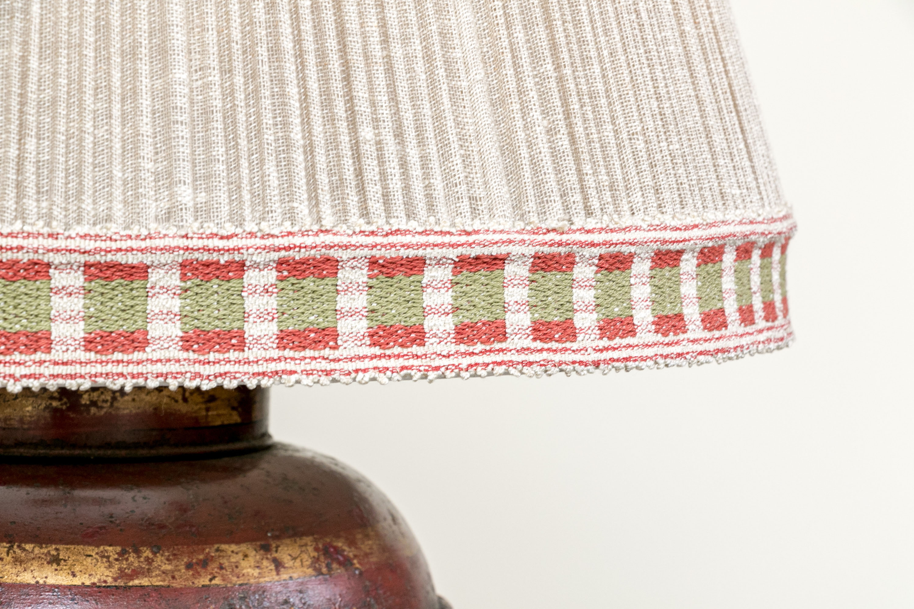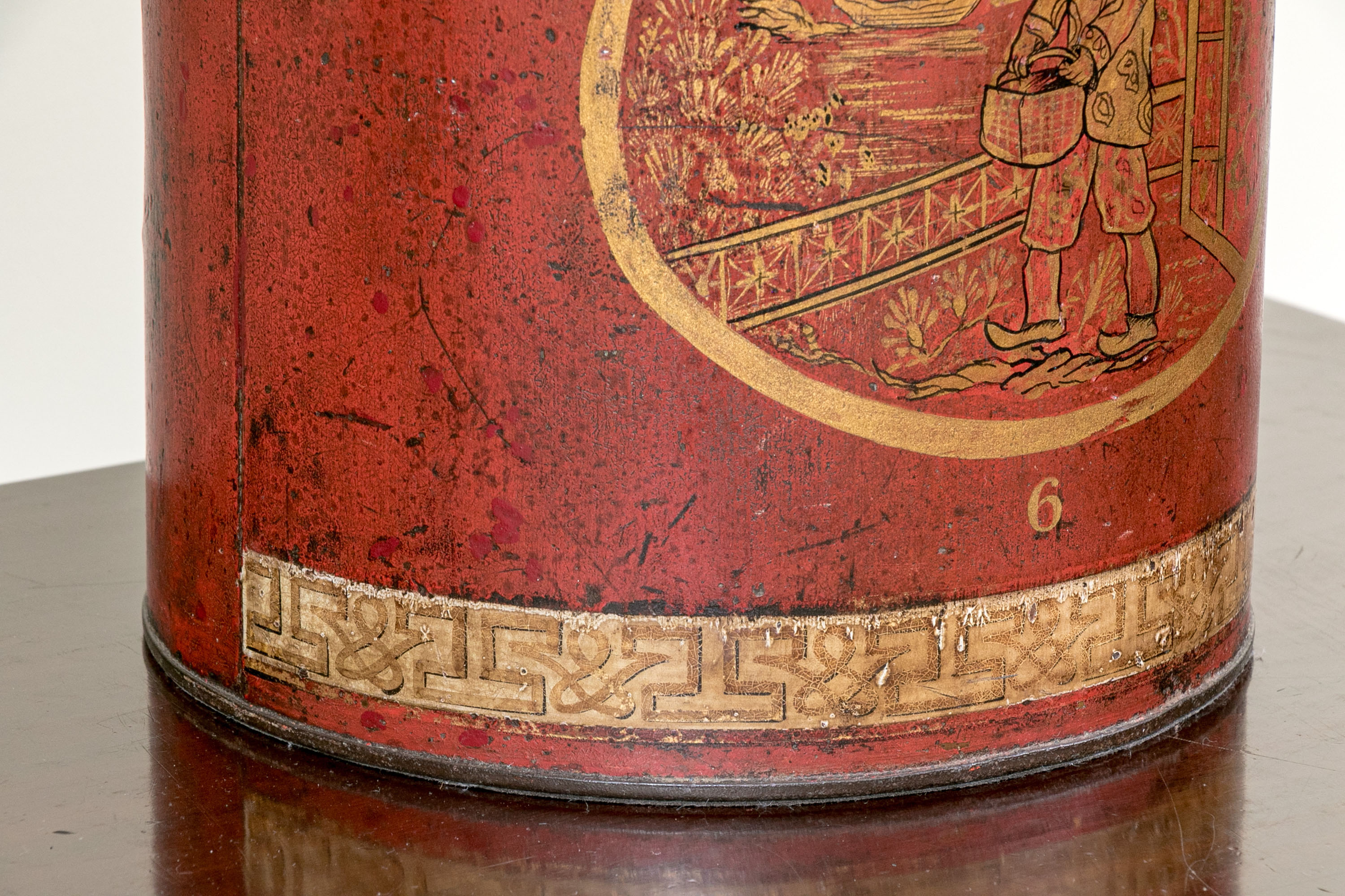 A fabulous pair of chinoiserie tea caddy form table lamps tole red with gilt decoration. Topped with pleated gauzy white fabric empire shaded detailed with red and green borders.