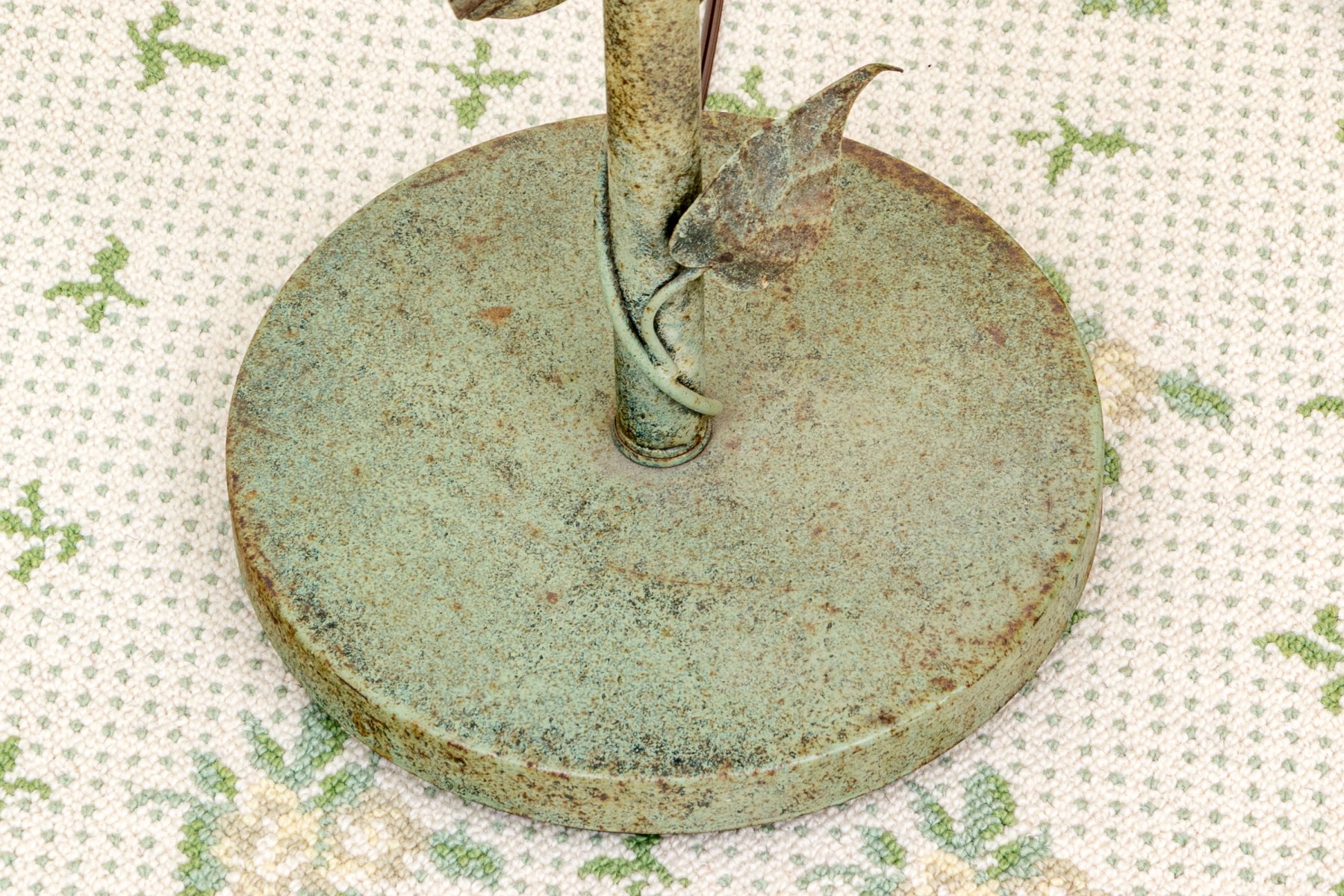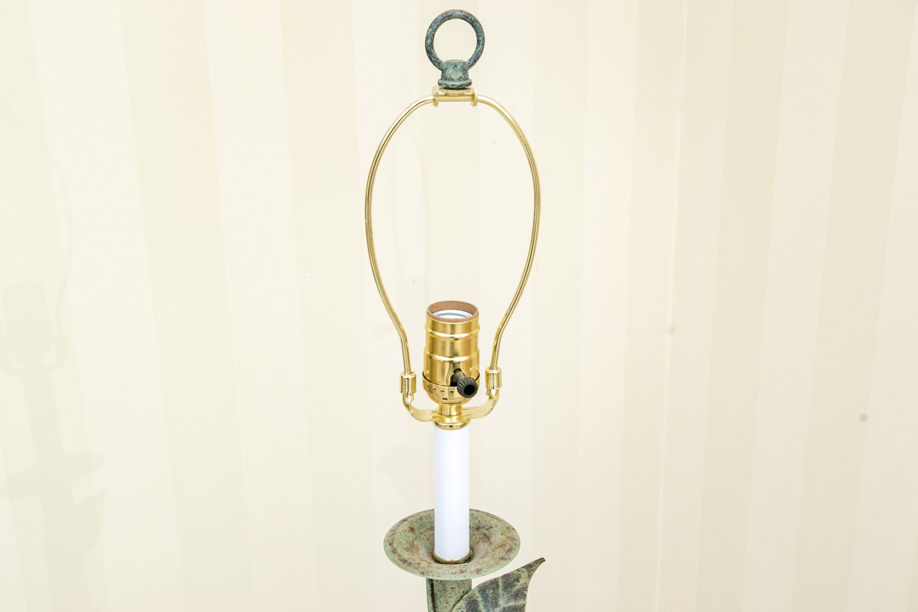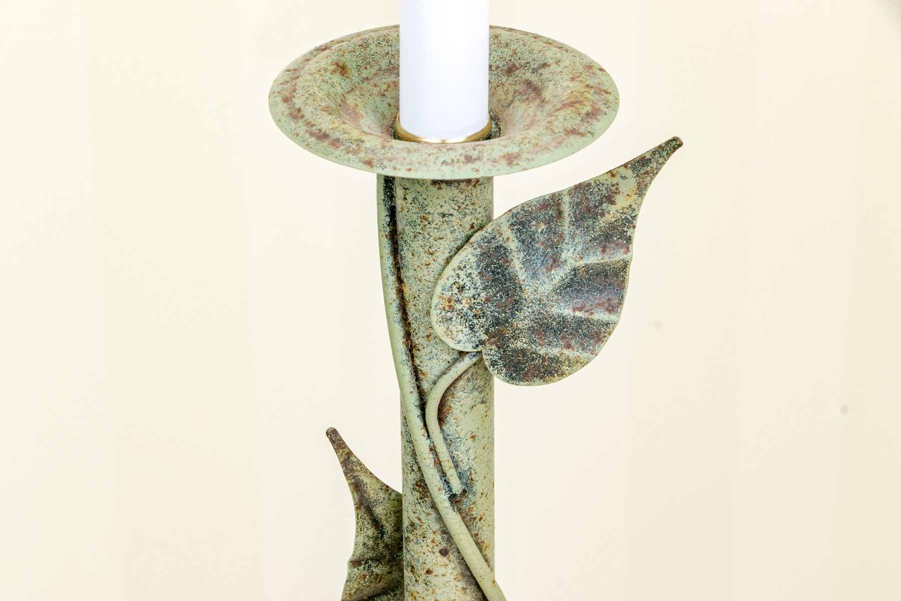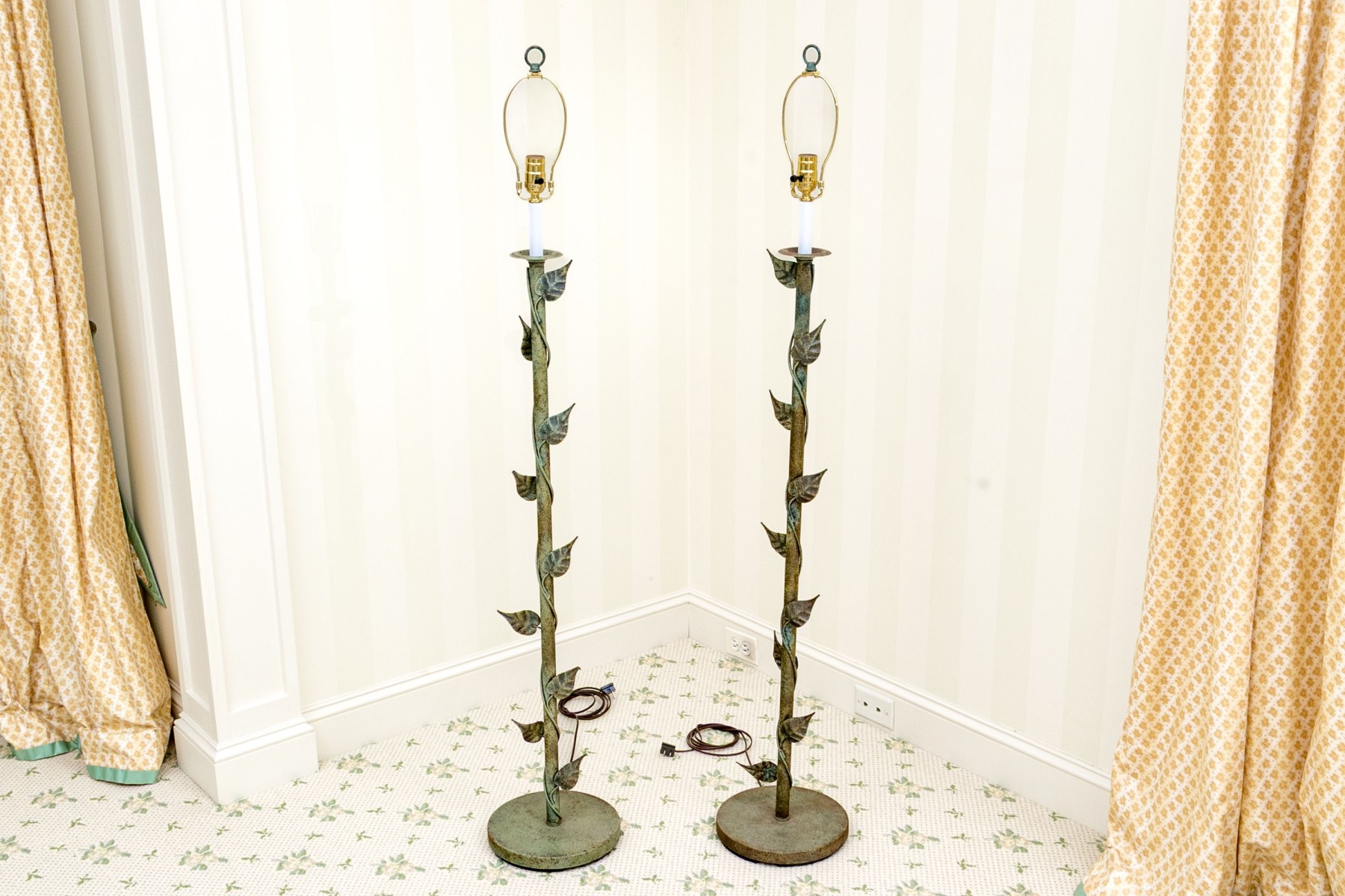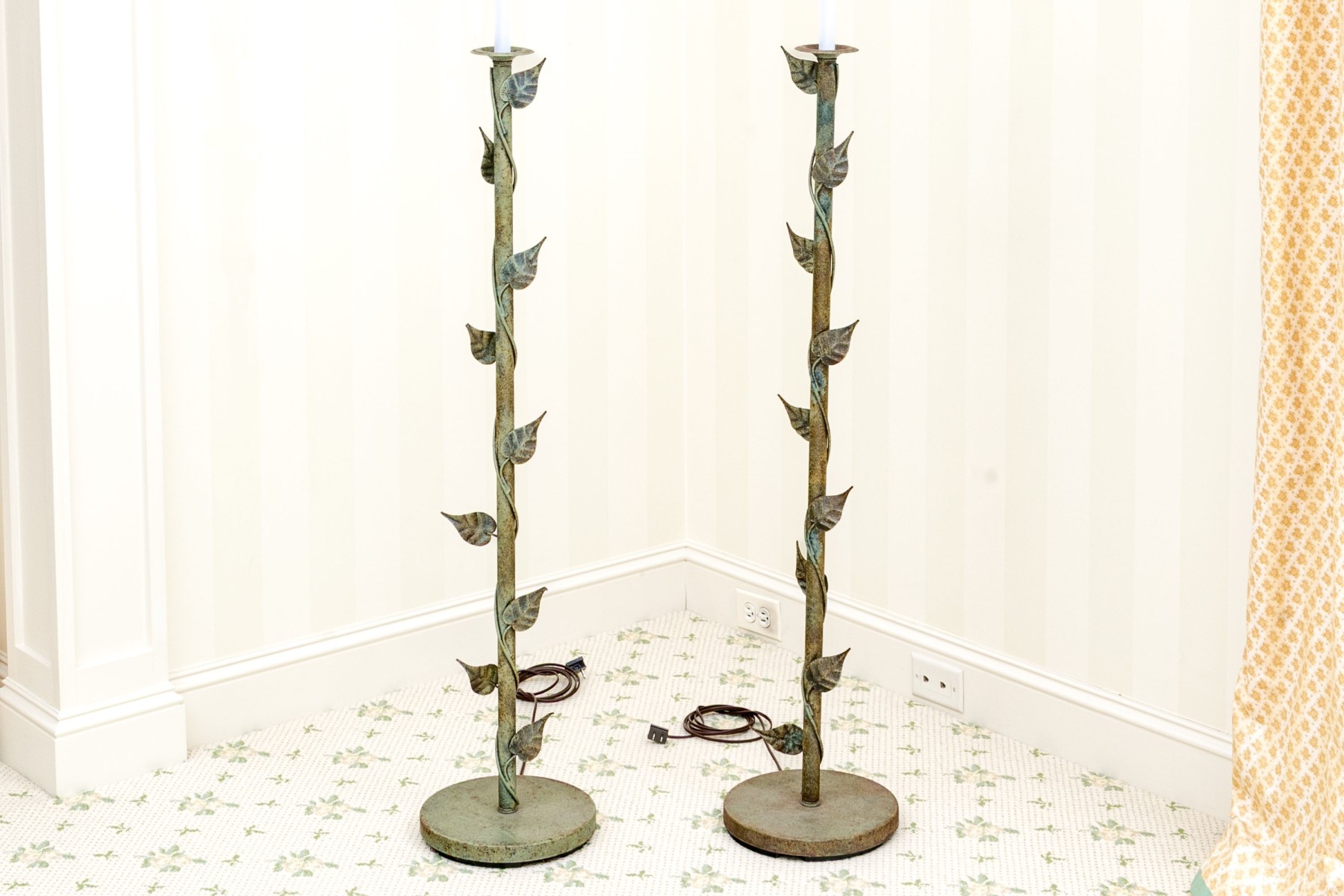 A charming pair of floor standing candlestick form lamps featuring rustic green and brown dappled tole columns wrapped with metal leaves leading up to candle sockets.