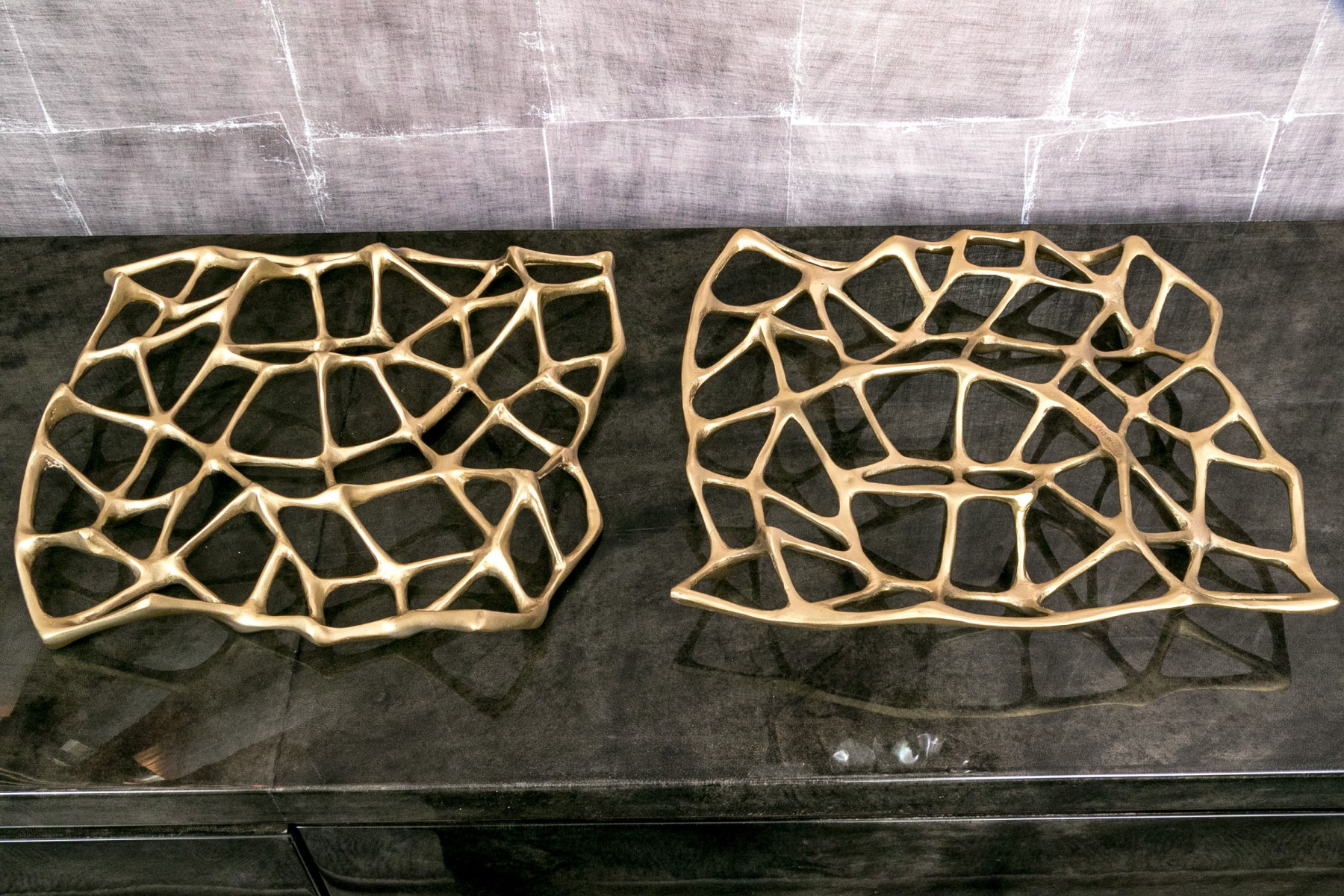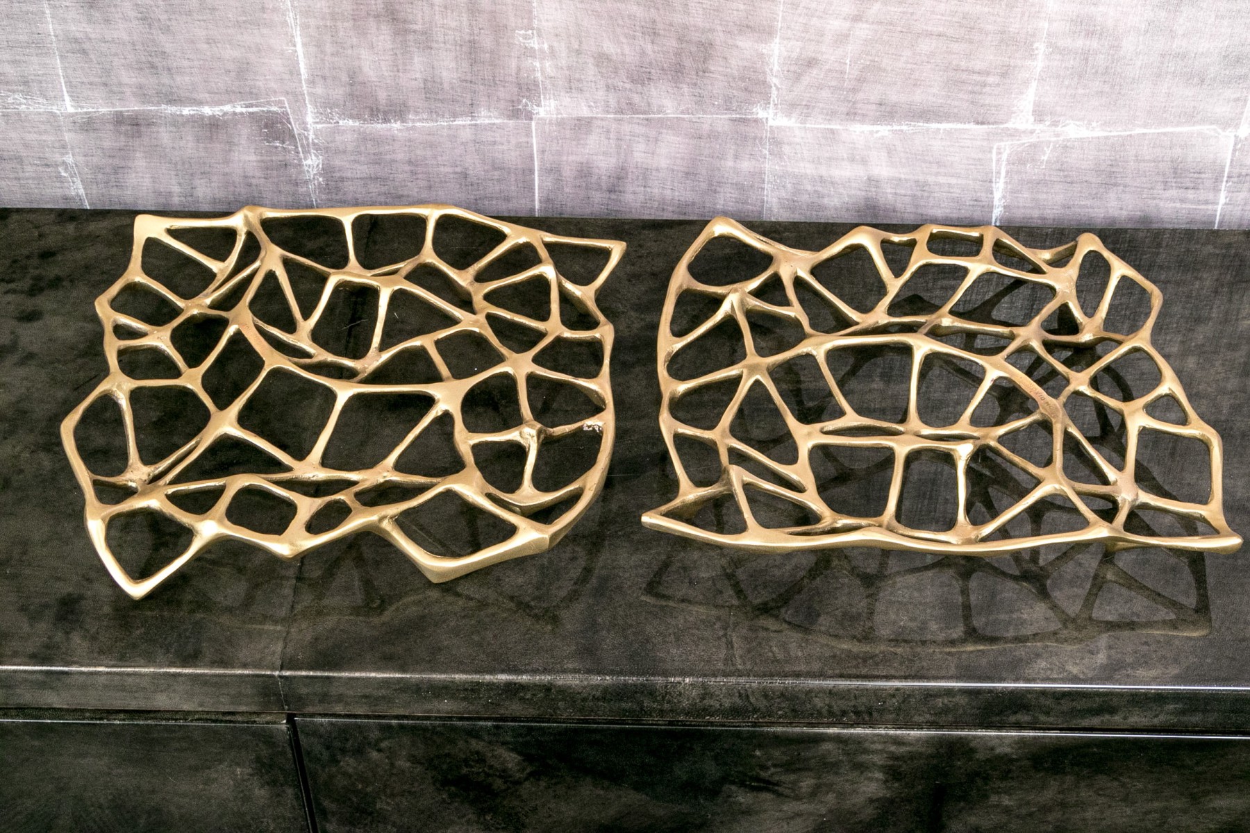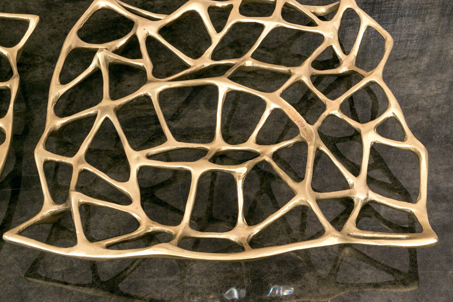 Each of the pair of trivets feature fantastic openwork web form, with sculptural aesthetic.