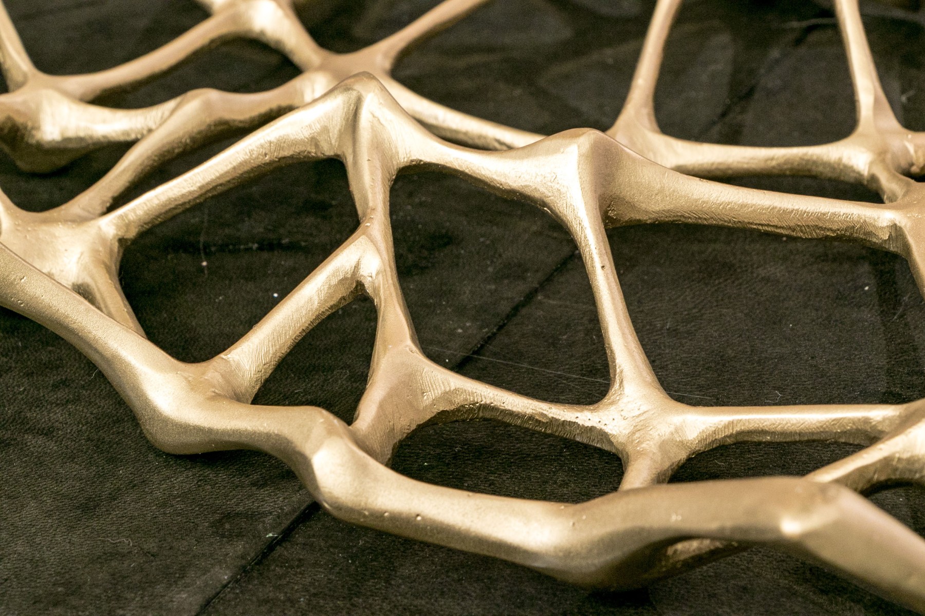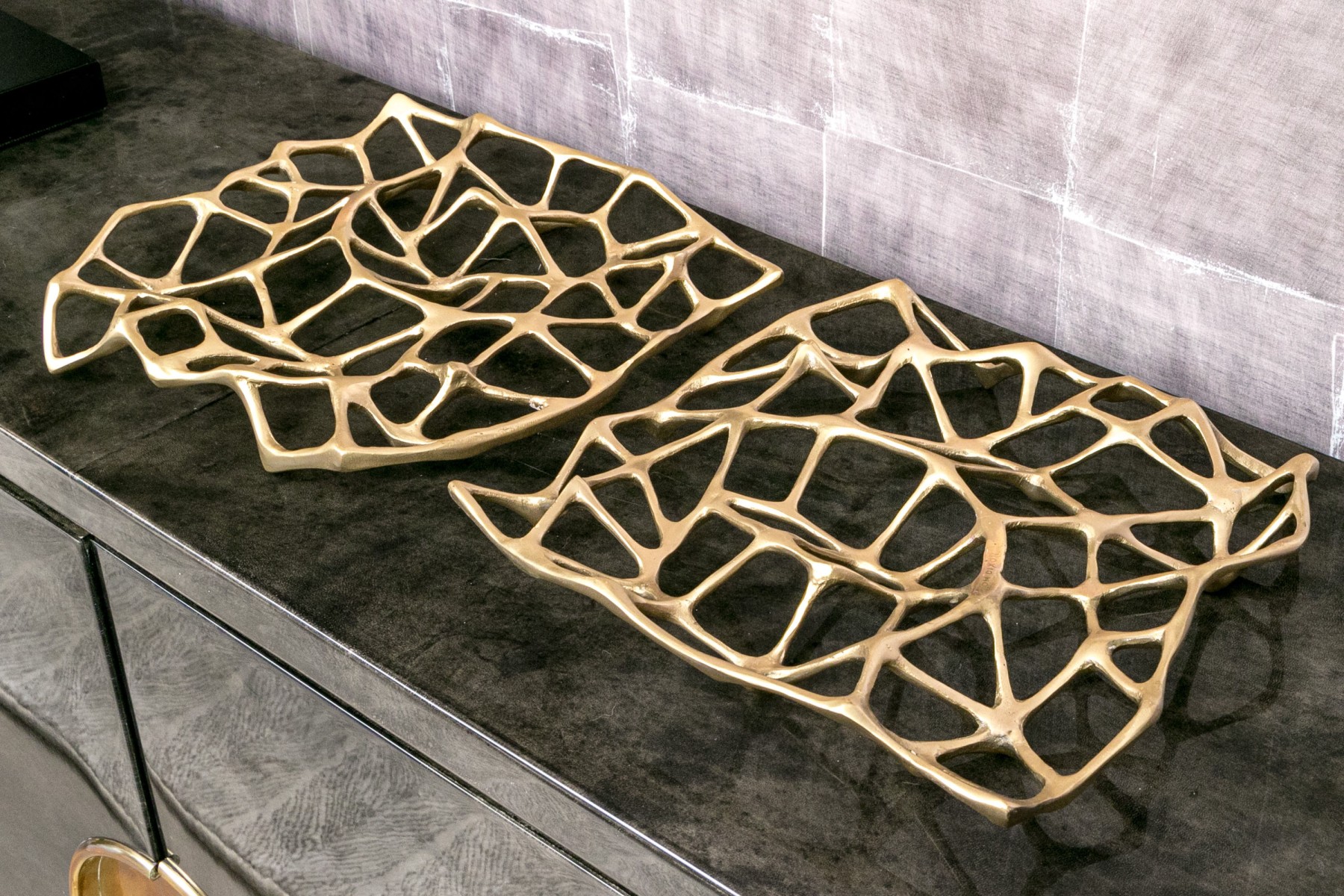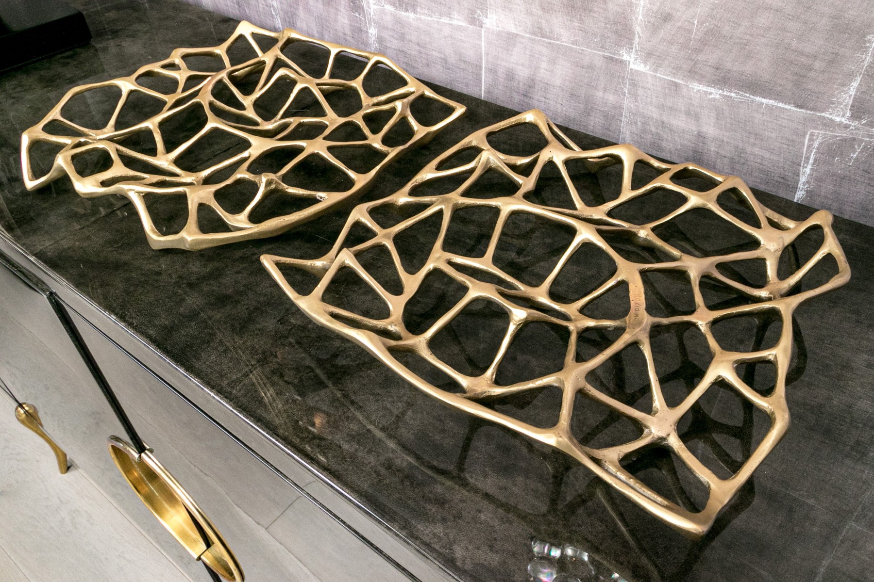 Each of the pair of trivets feature fantastic openwork web form, with sculptural aesthetic.