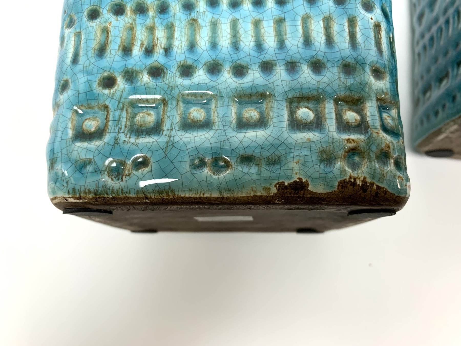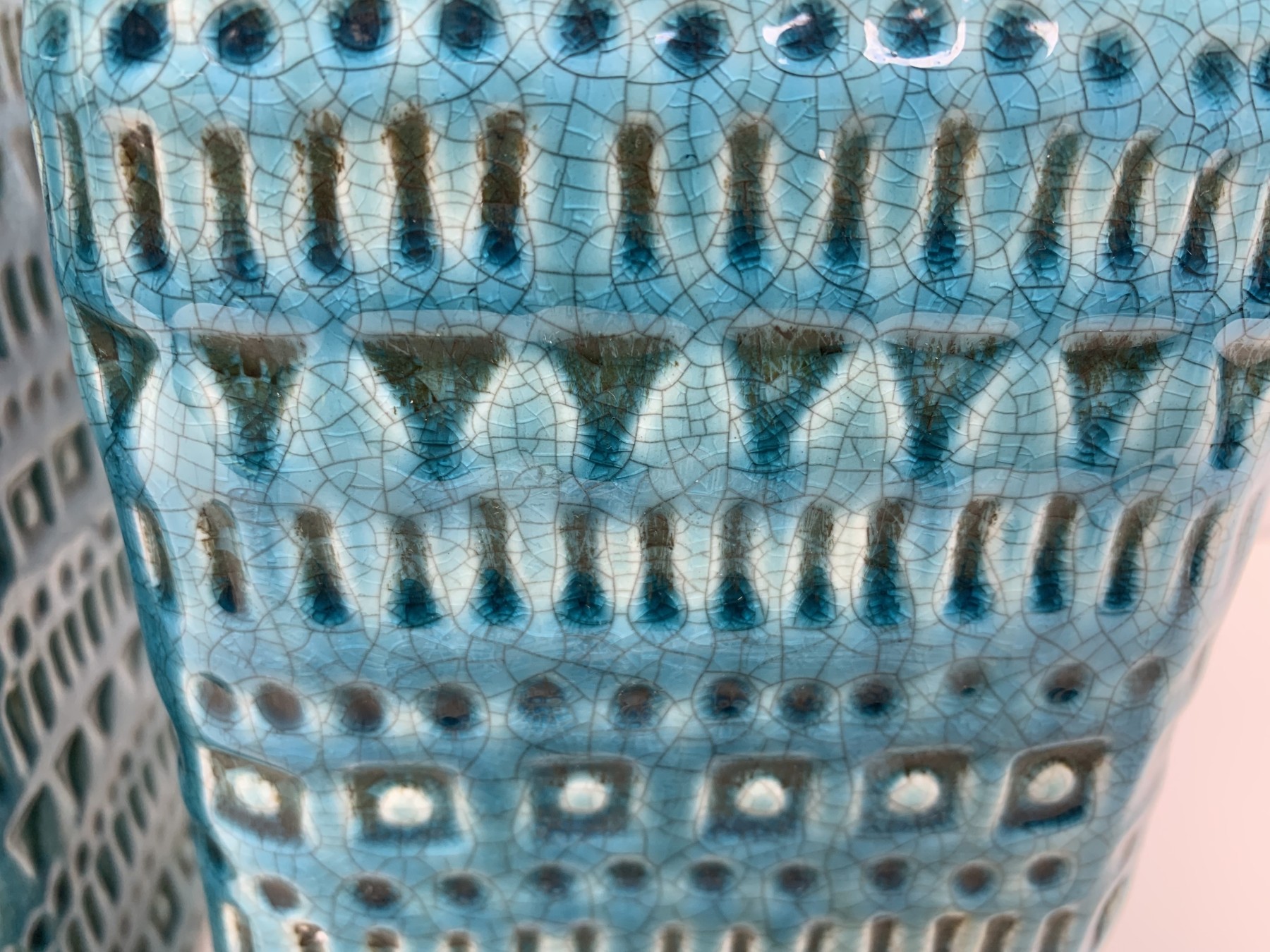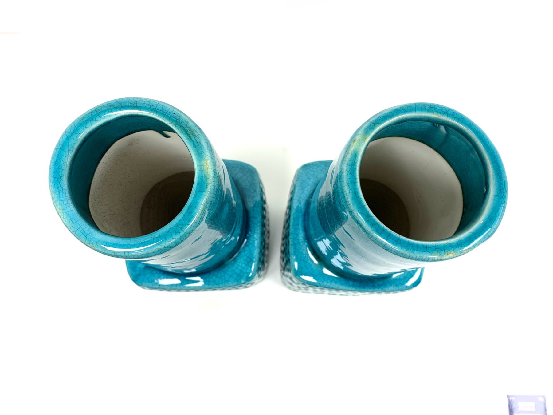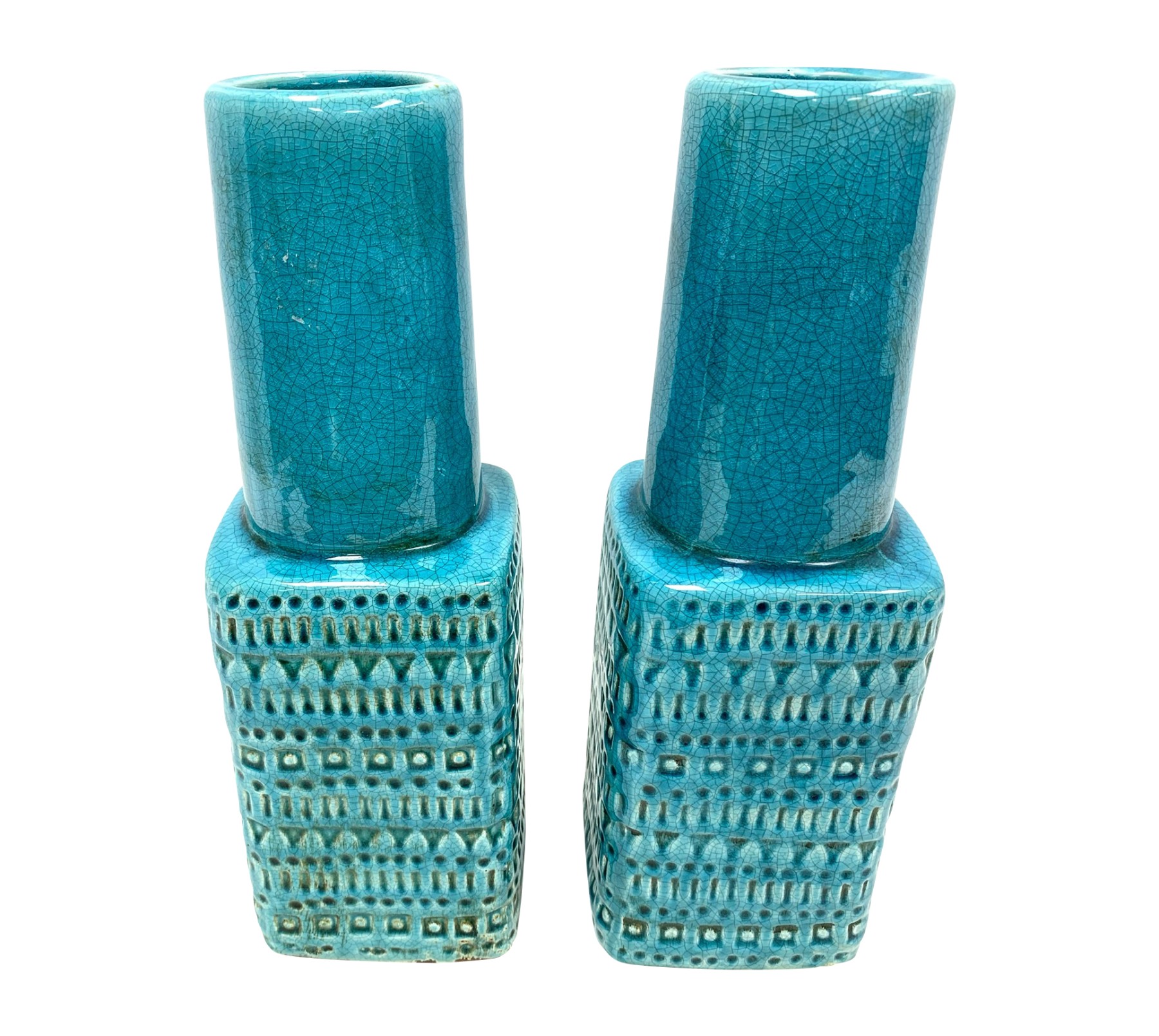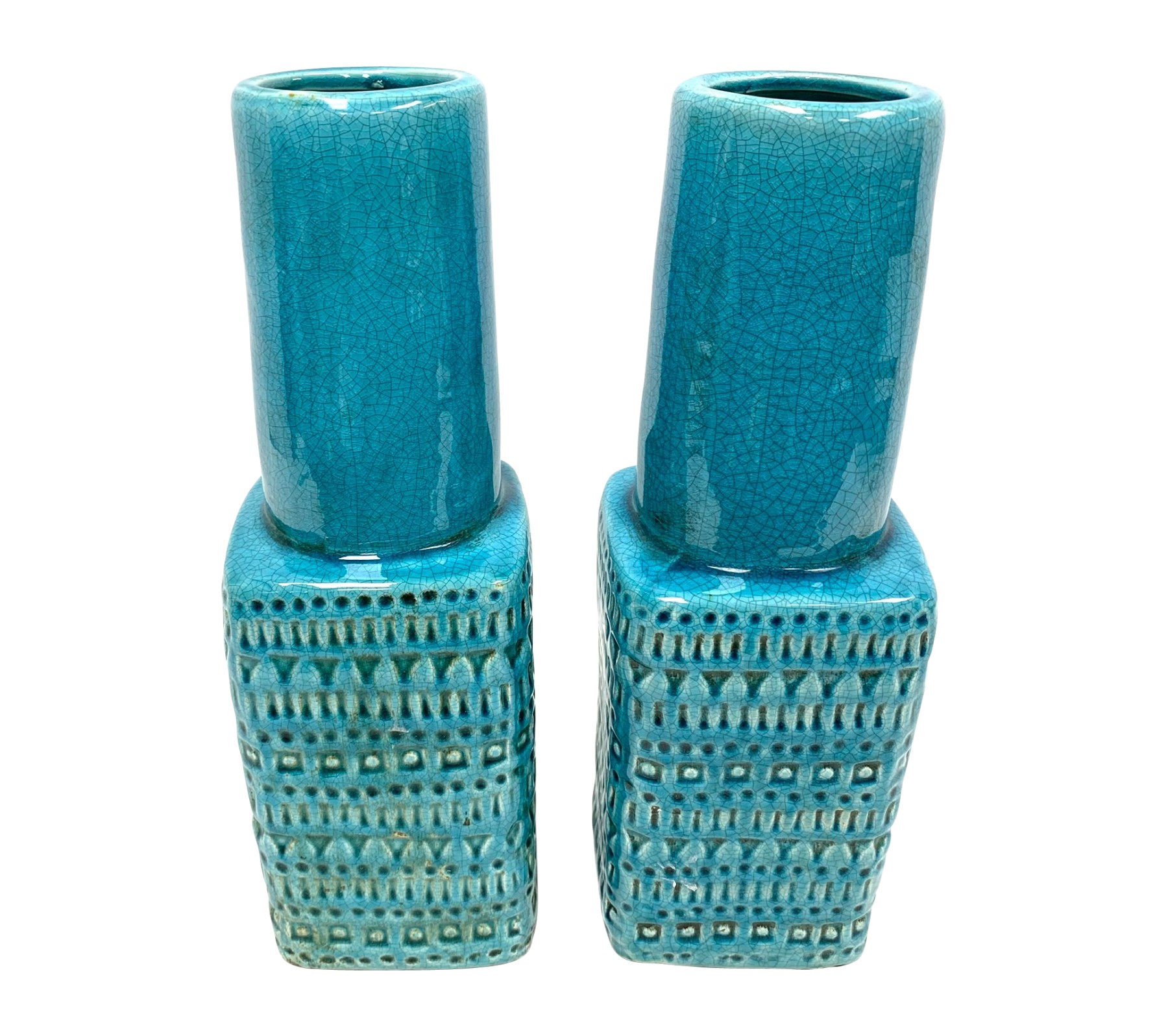 A pair of modern vases that are reminiscent of the celebrated Italian Mid Century Bistozzi ceramic line. Tall and sculptural with incised decoration to the base and a fine deep Turquoise crackle glaze.
