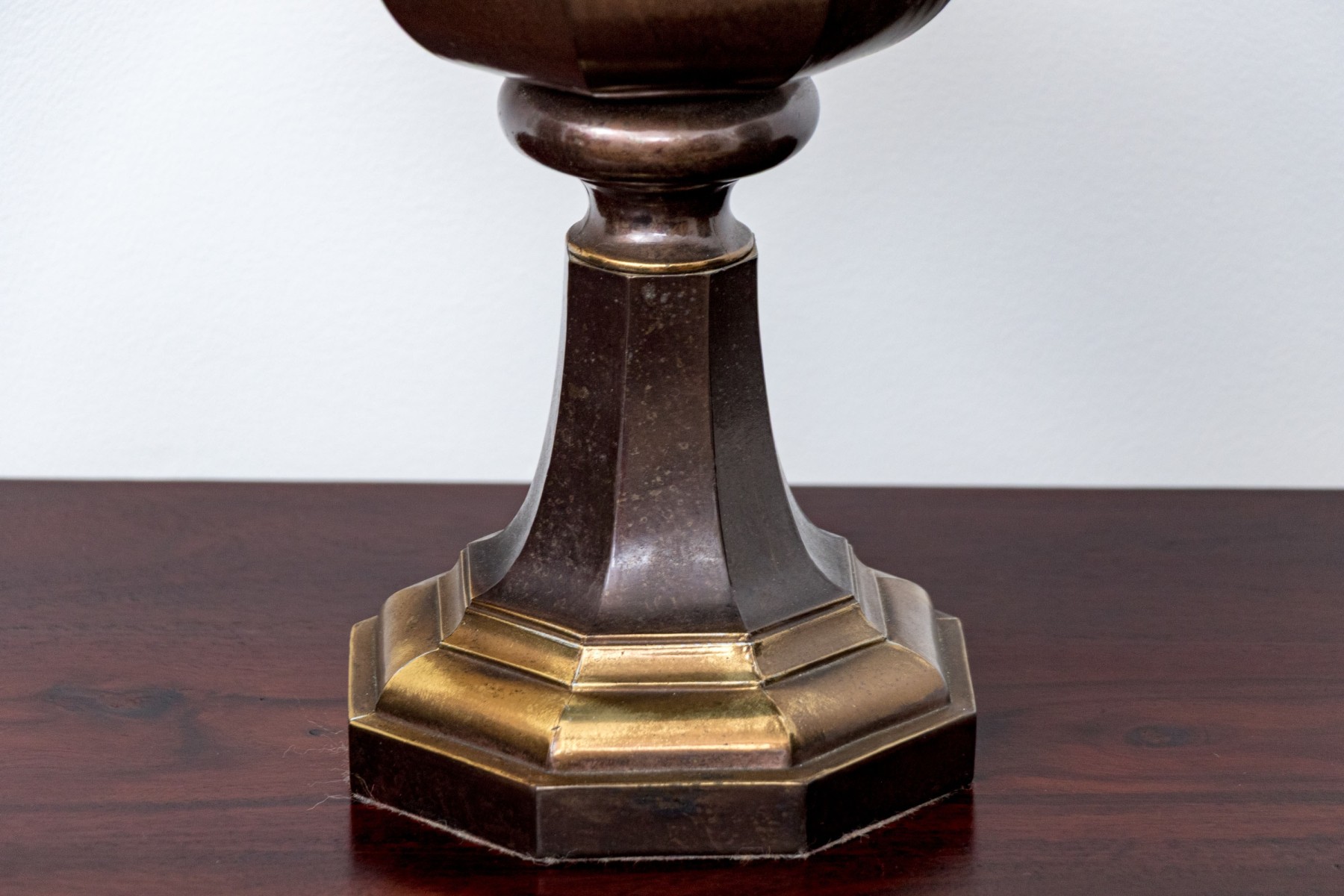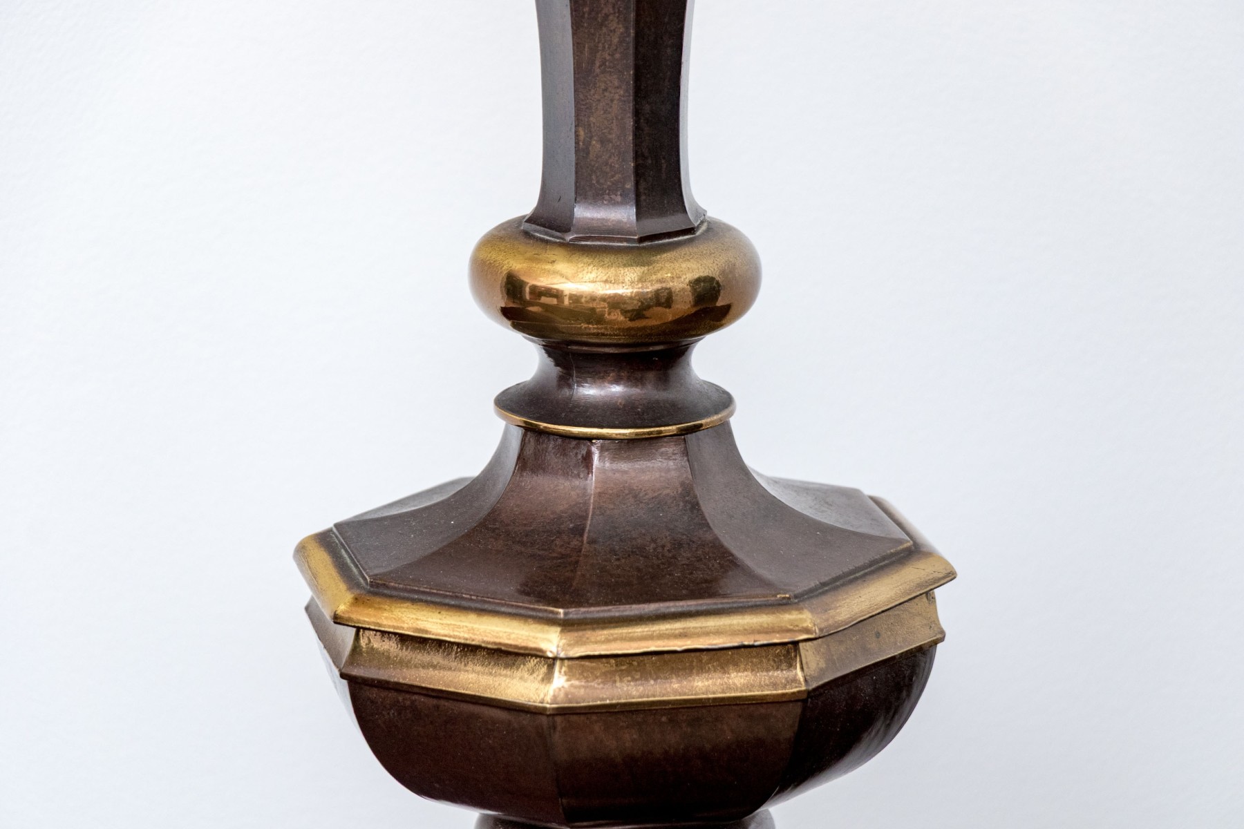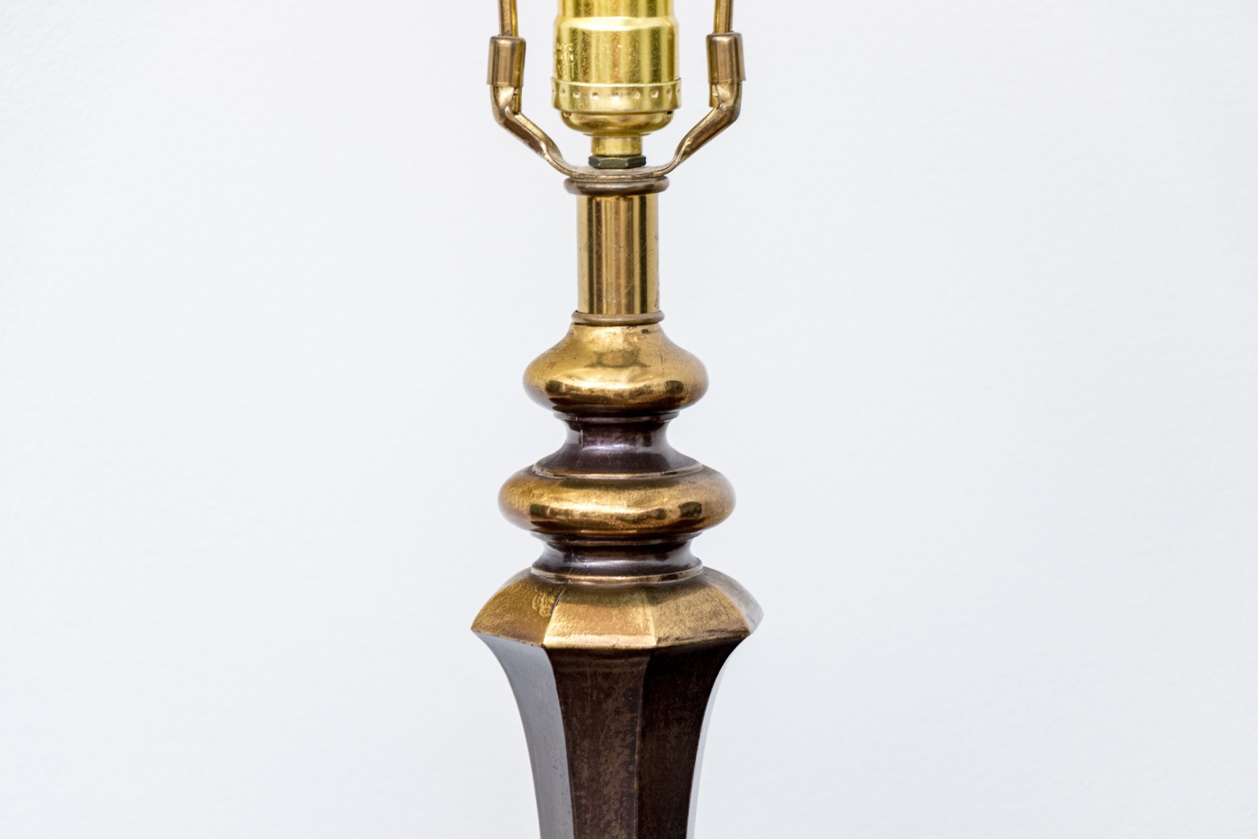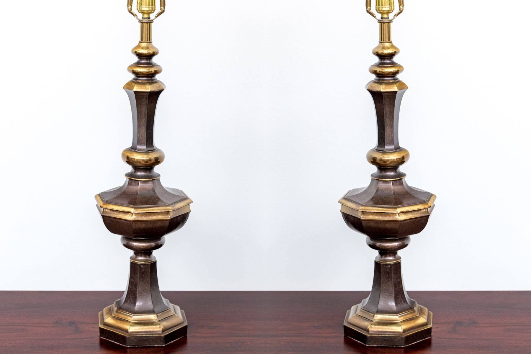 Pair of quality, elegant table lamps featuring sculptural hexagonal bases and columnar shafts in a rich dark bronze finish, accented with warm gilt bands and trim. Felted bottoms.