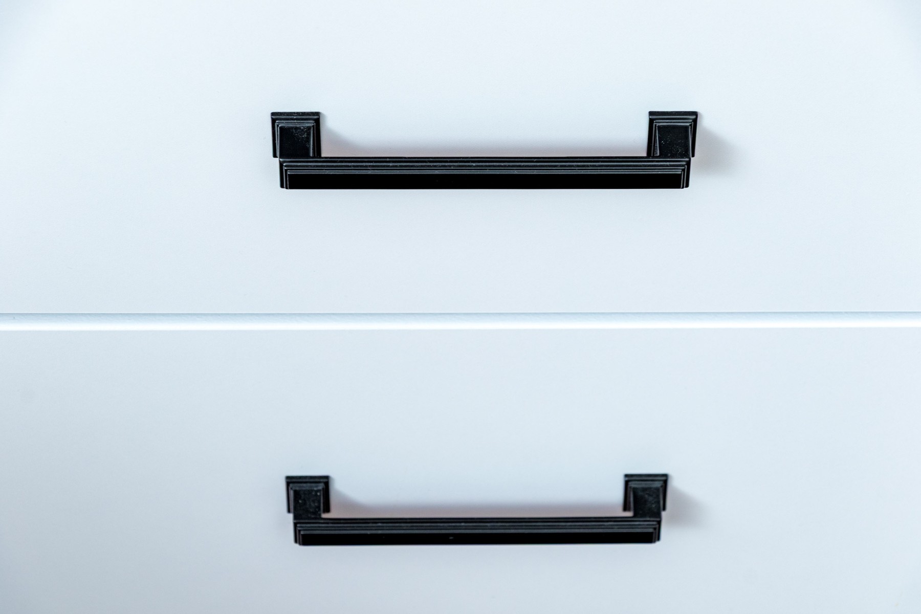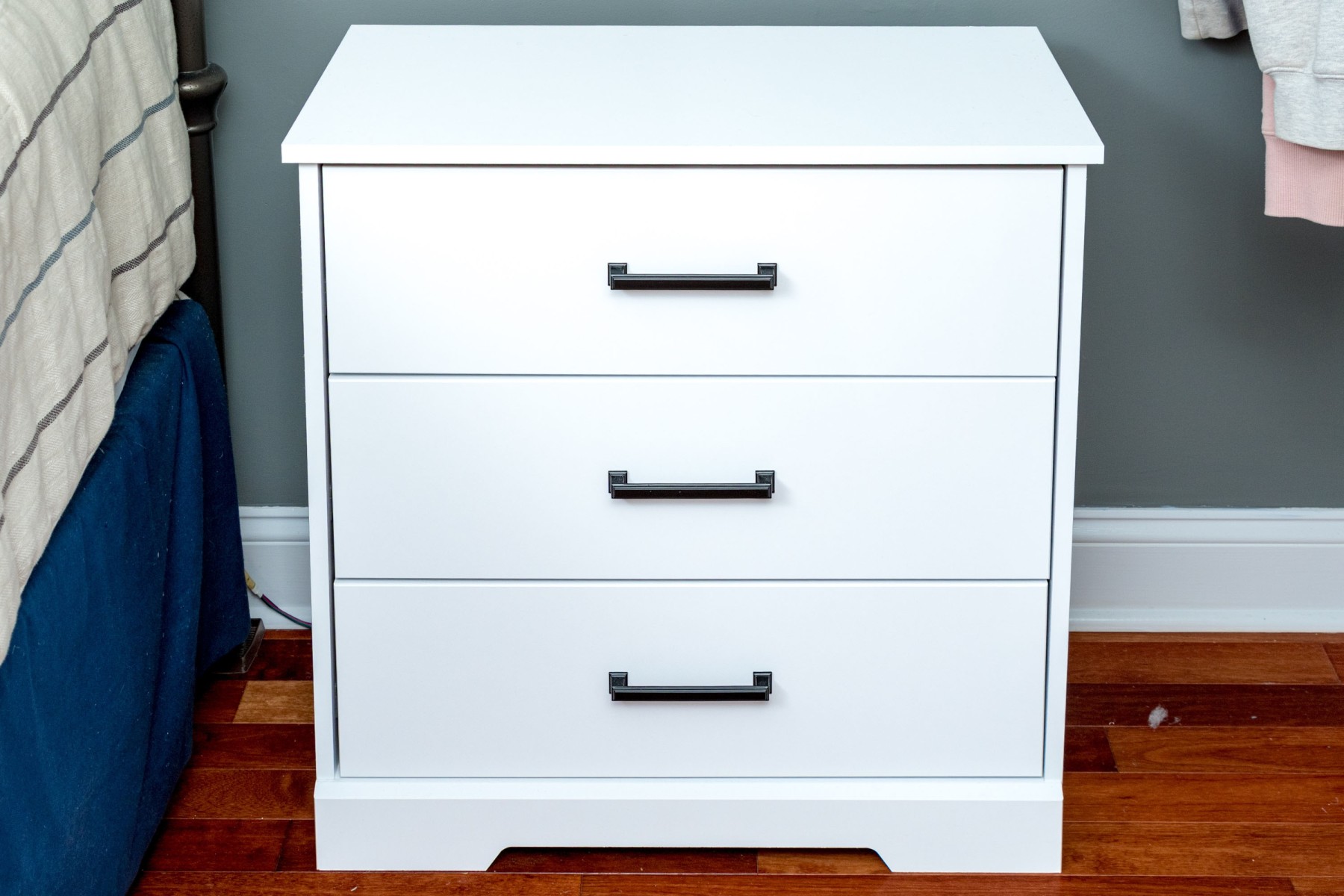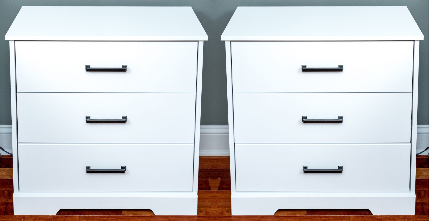 A wonderful pair of transitional and minimalist white finished nightstands with sleek rectangular tops and cases of three drawers adorned with stately black bar handles for great contrast. Raised over stout bracket feet.