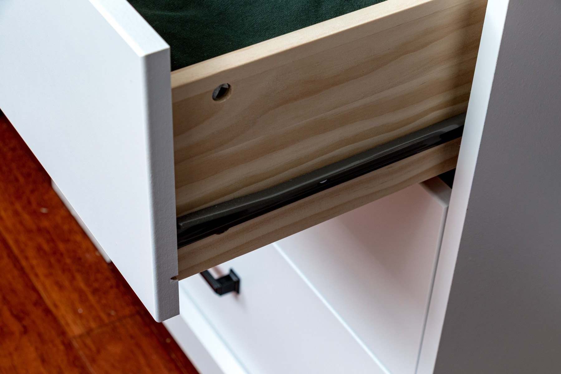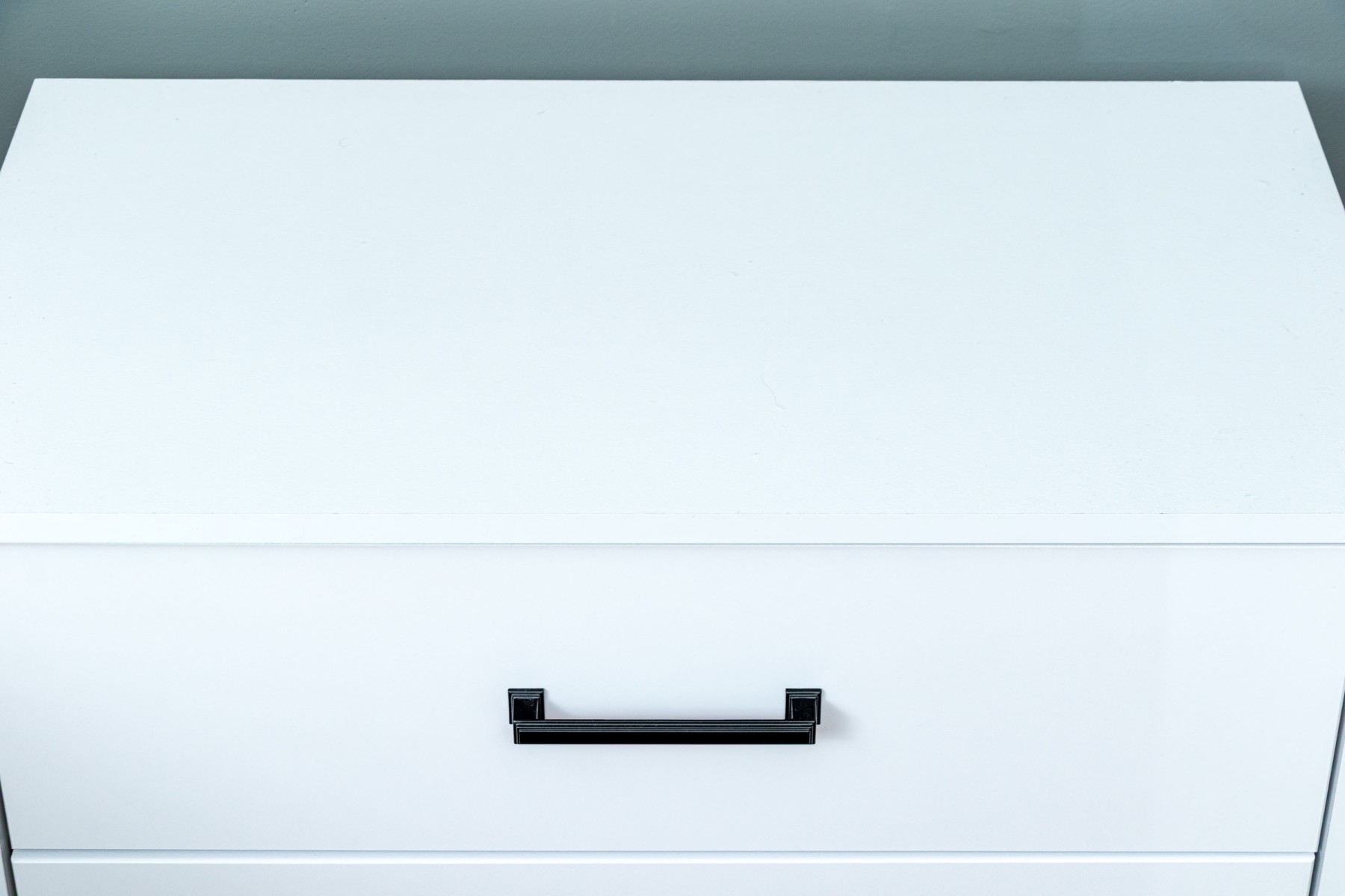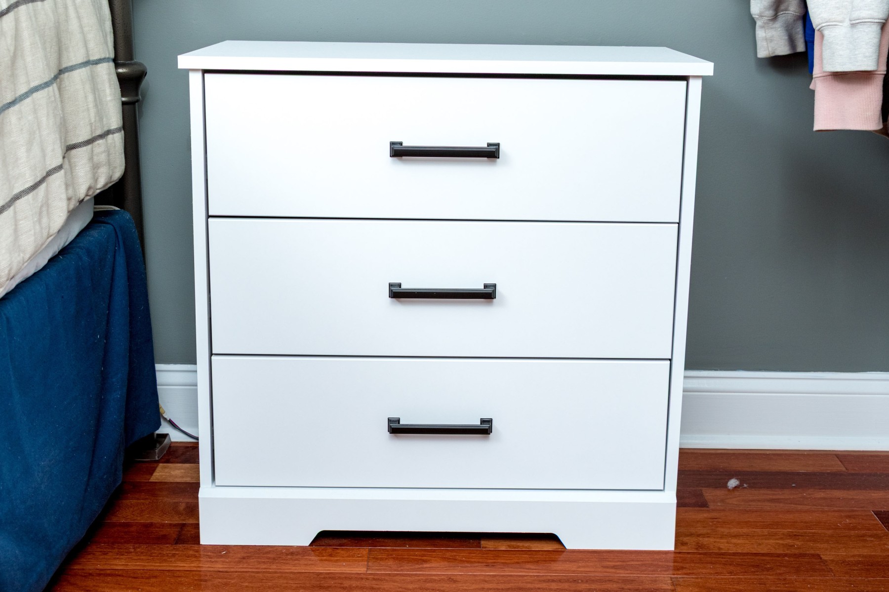A wonderful pair of transitional and minimalist white finished nightstands with sleek rectangular tops and cases of three drawers adorned with stately black bar handles for great contrast. Raised over stout bracket feet.