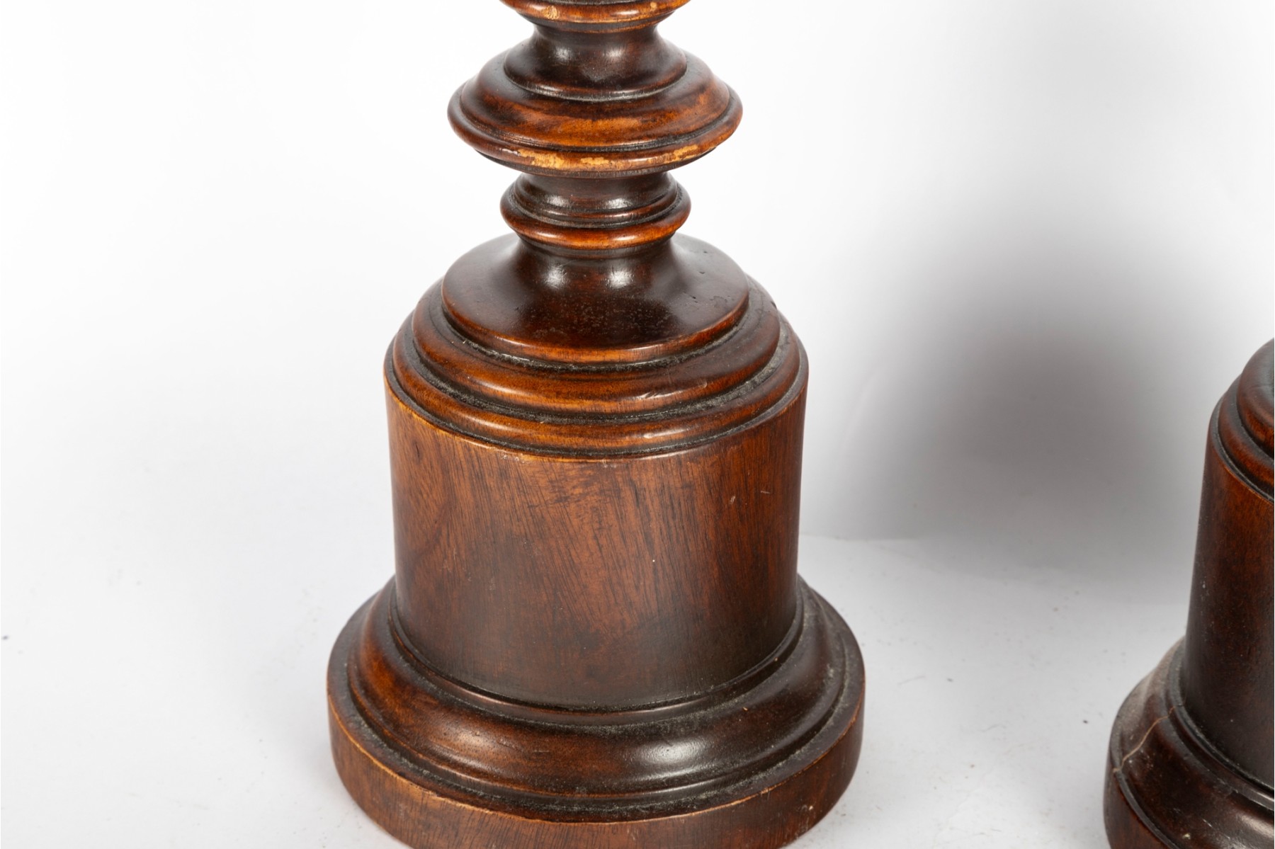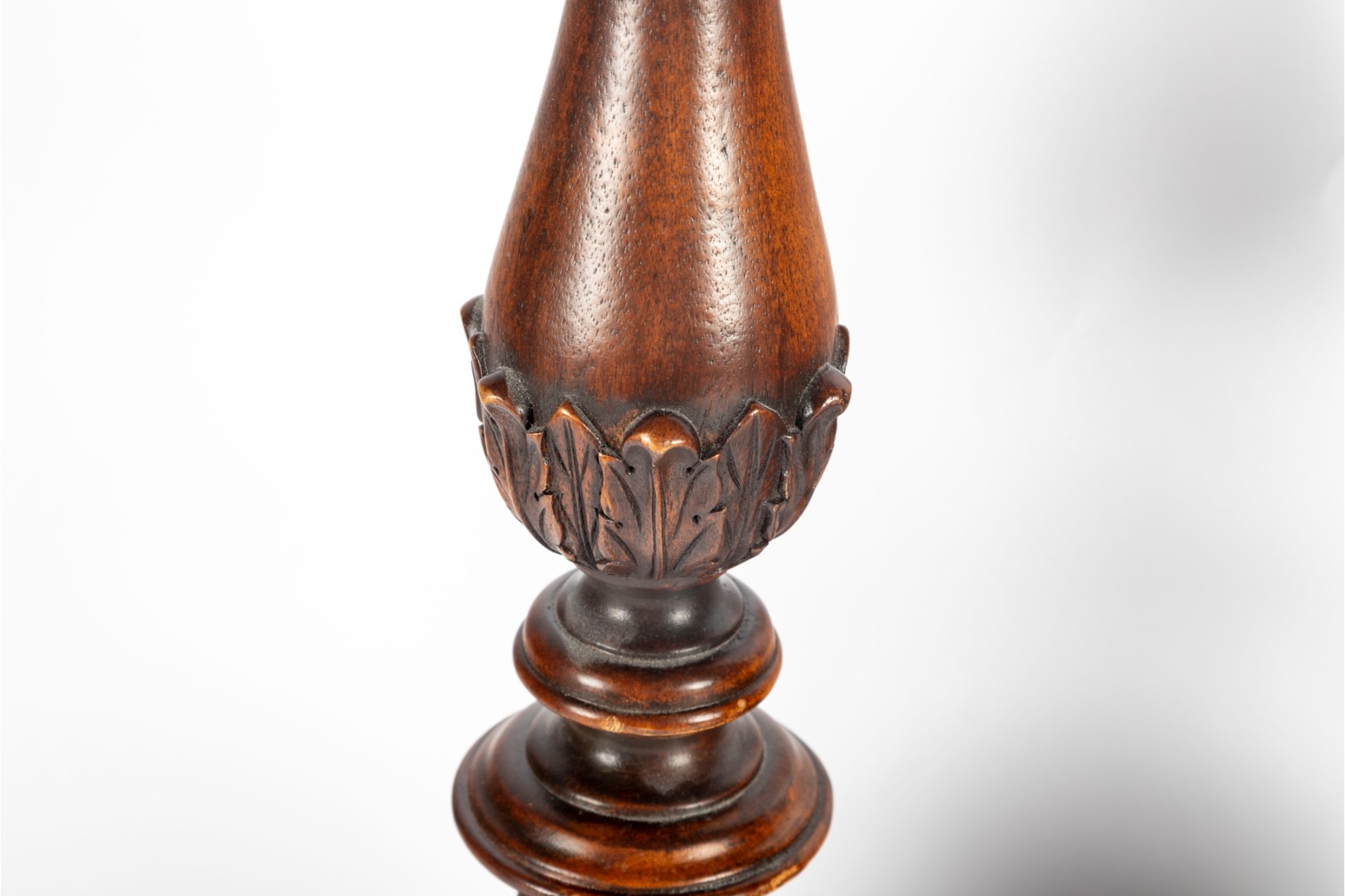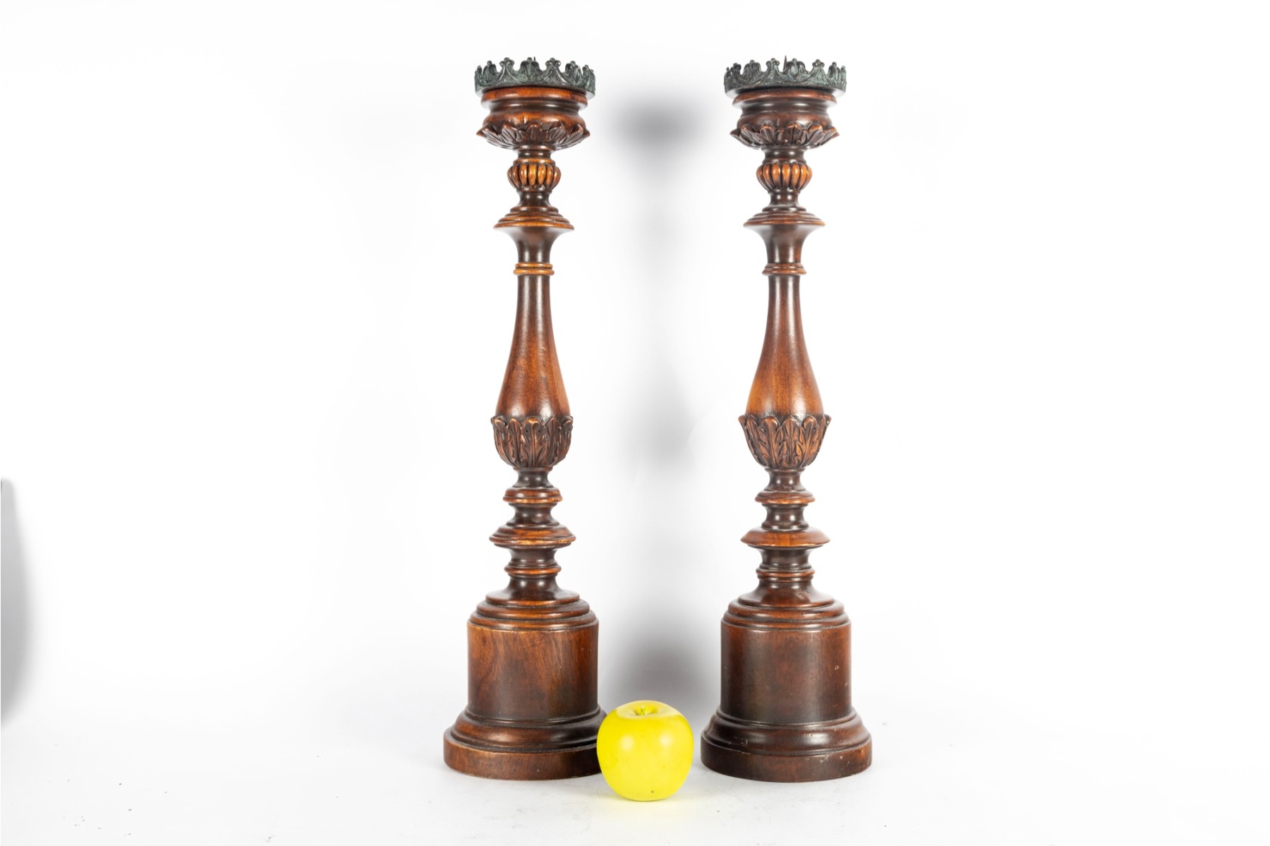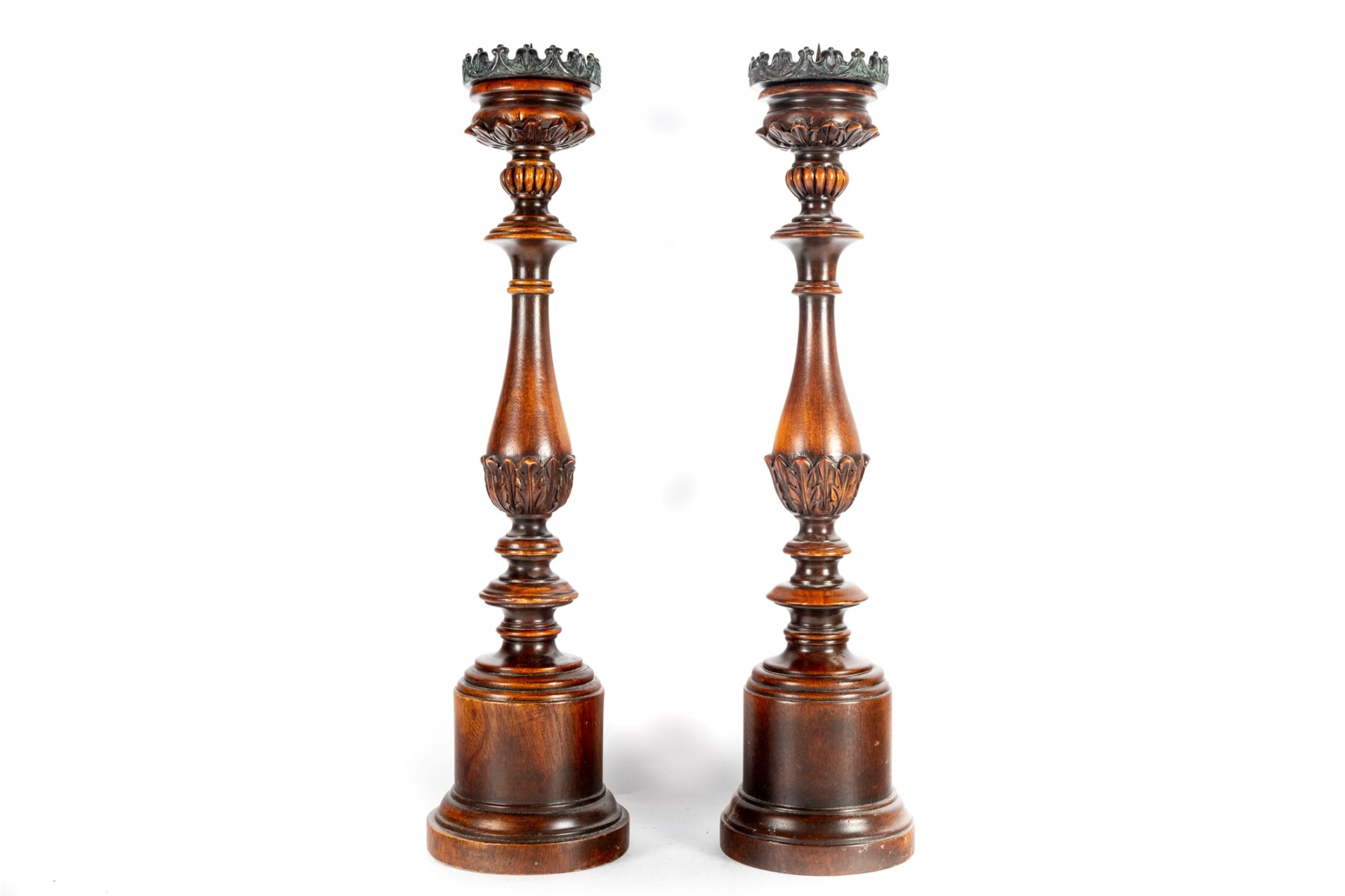 A handsome pair of tall, turned mahogany church candlesticks featuring elegant baluster-shaped columns, carved acanthus leaf decoration, and circular stepped bases. Each is topped with a metal pricket platform adorned with a decorative crown edge, designed to hold large candles.