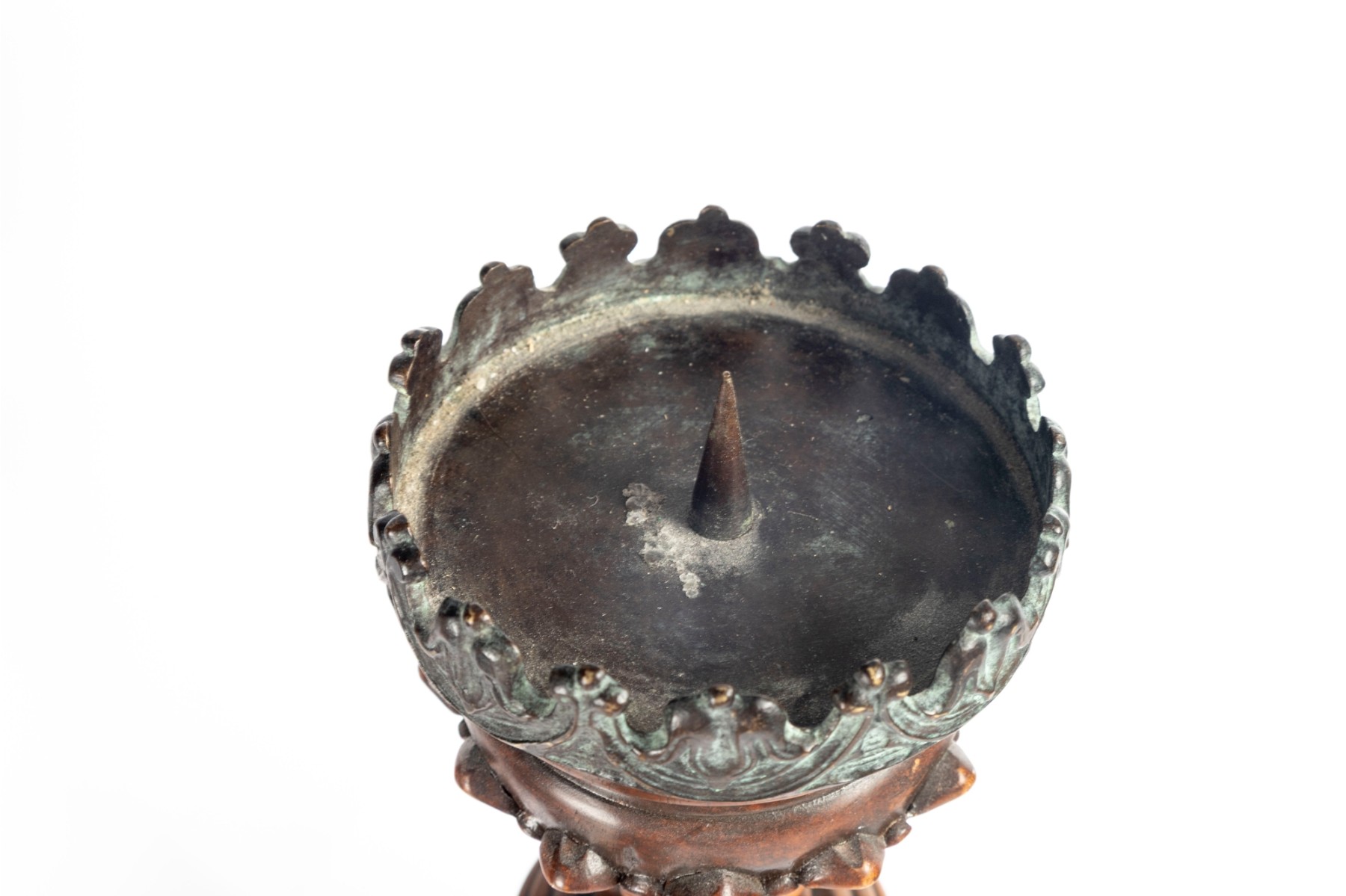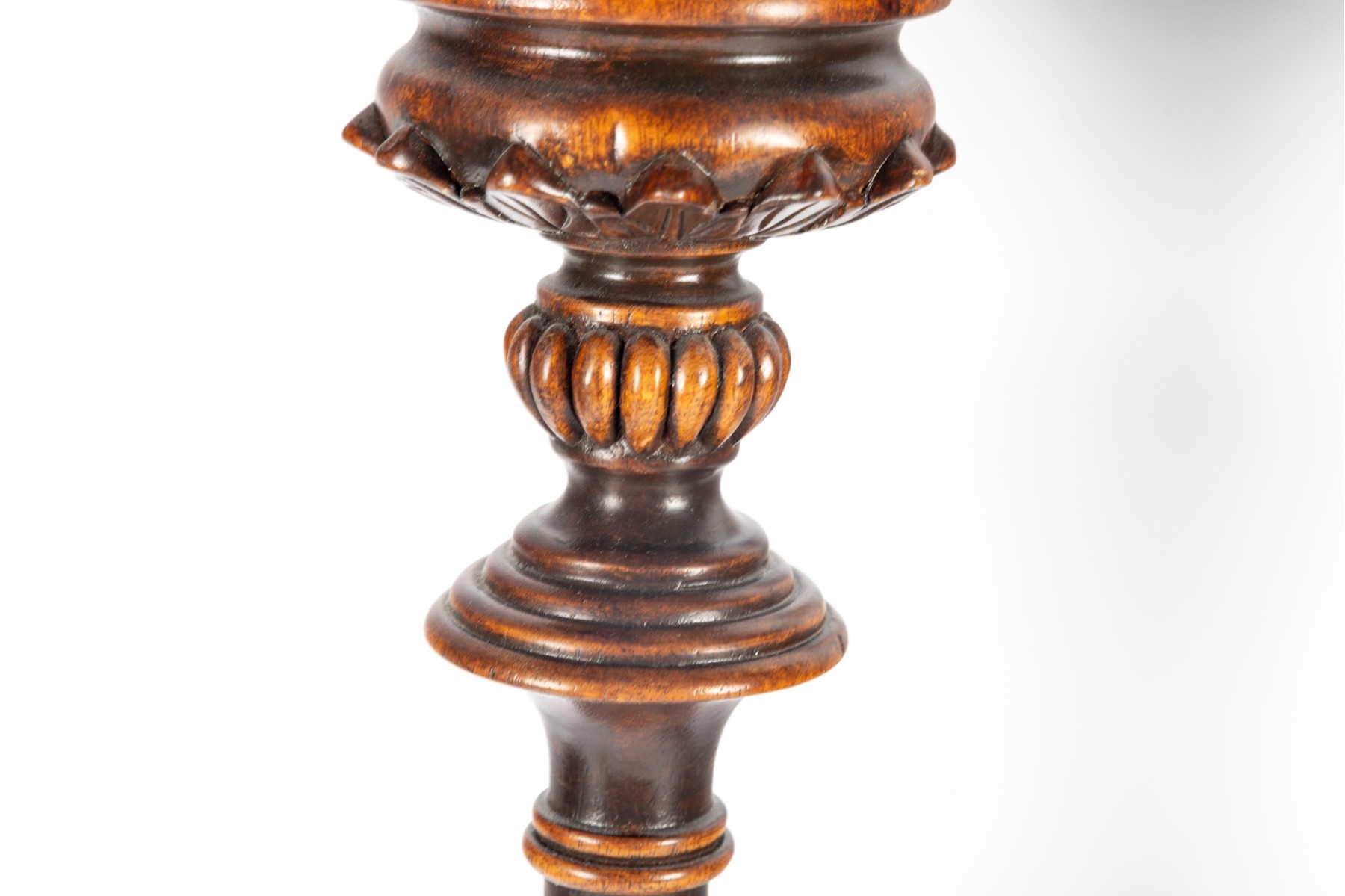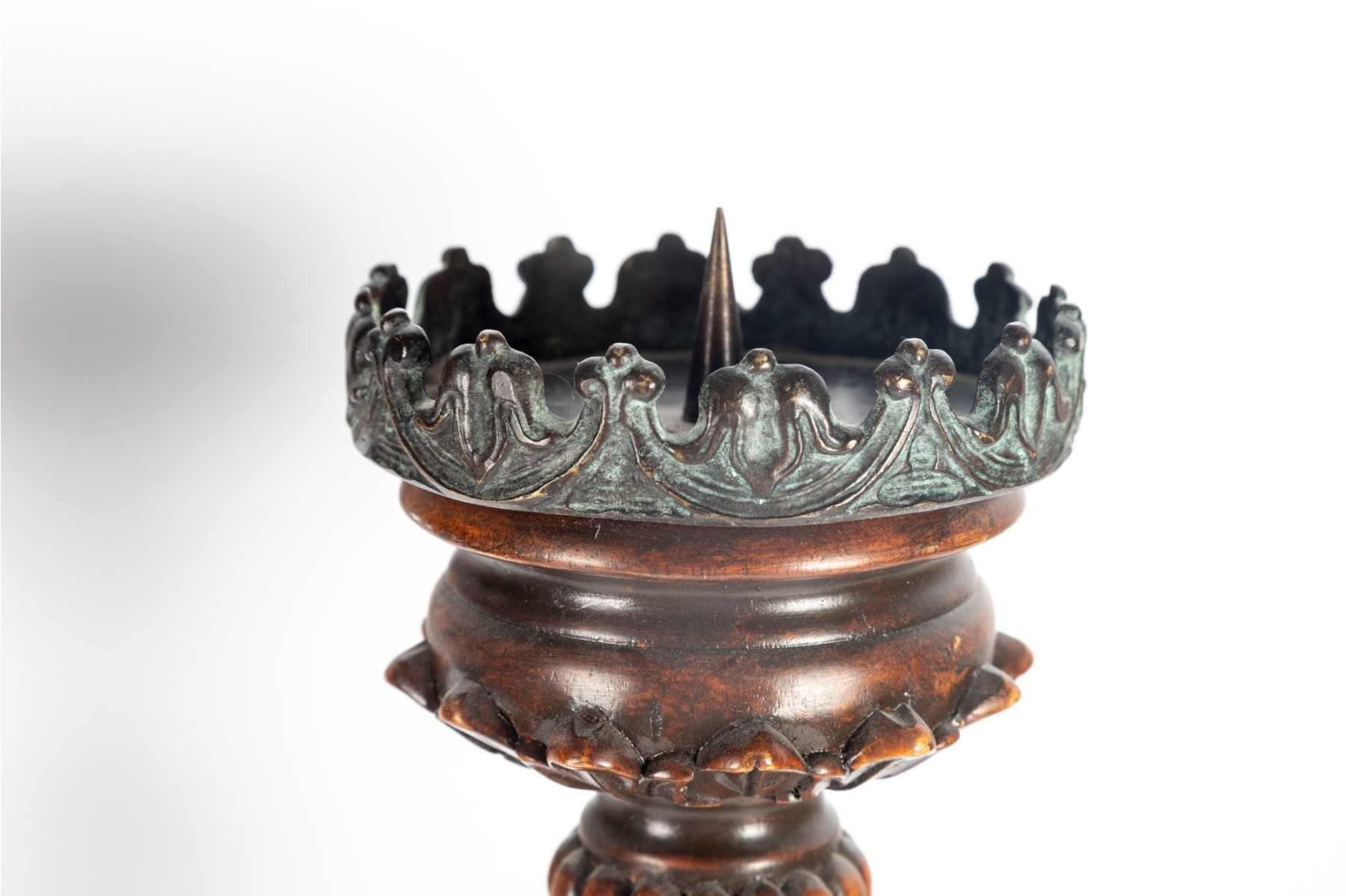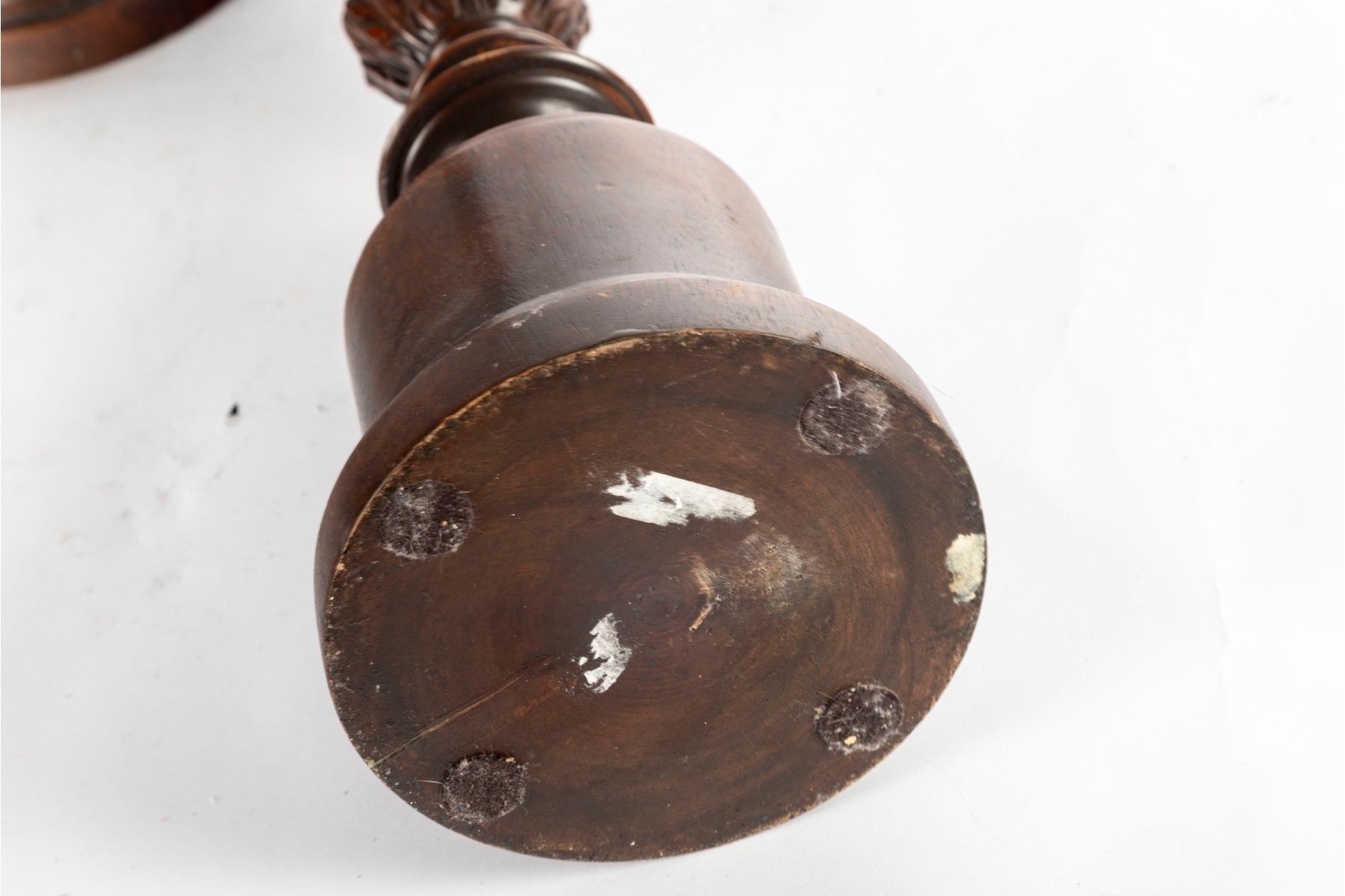 A handsome pair of tall, turned mahogany church candlesticks featuring elegant baluster-shaped columns, carved acanthus leaf decoration, and circular stepped bases. Each is topped with a metal pricket platform adorned with a decorative crown edge, designed to hold large candles.