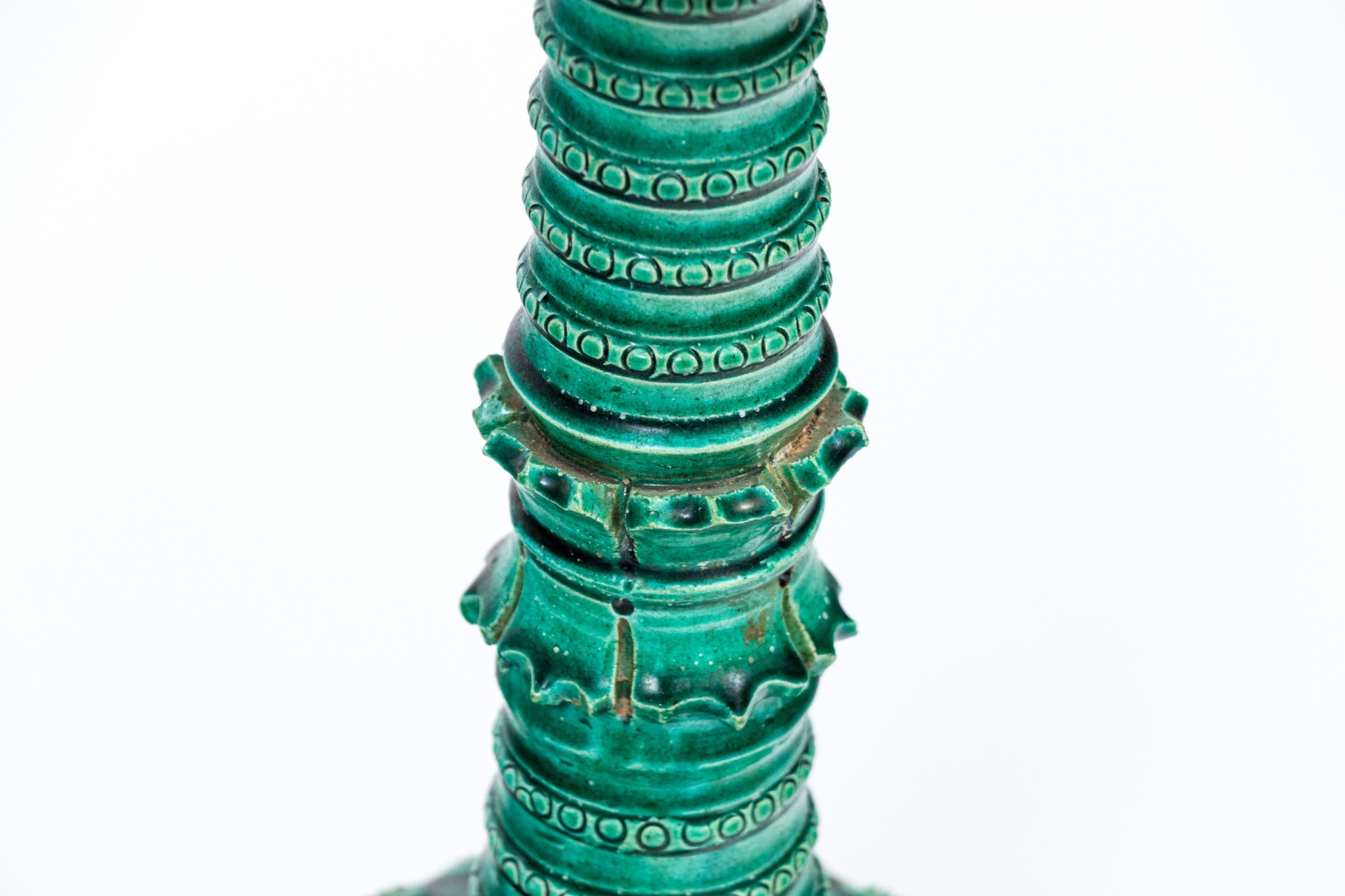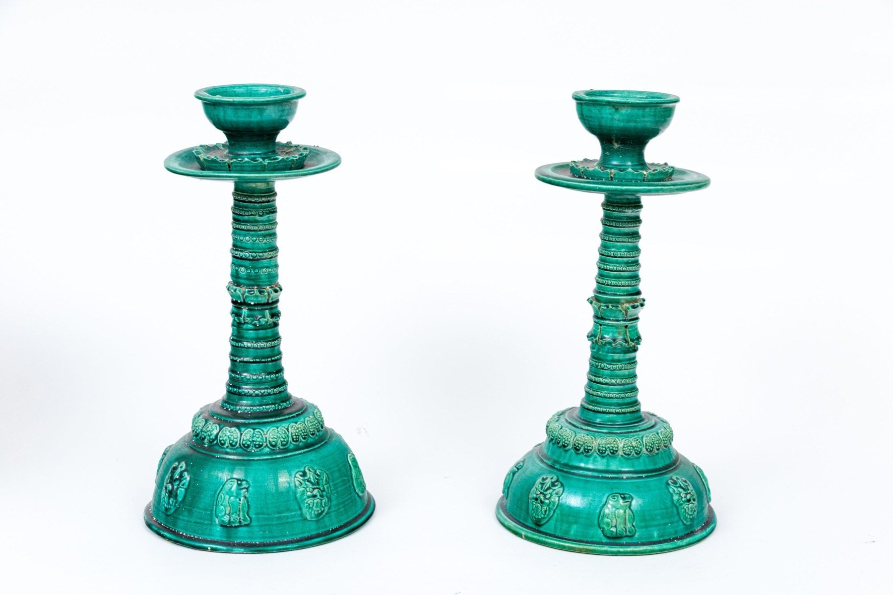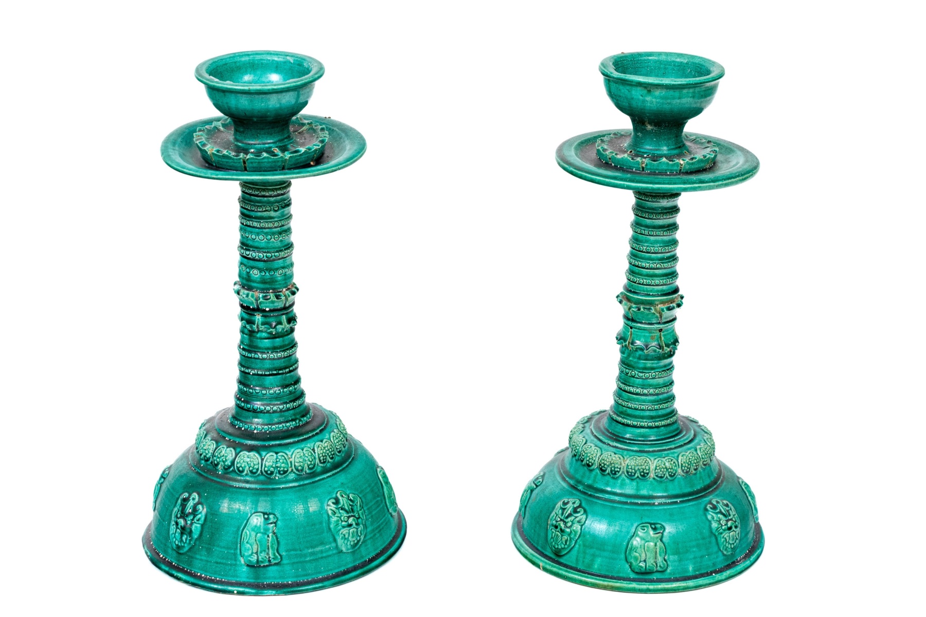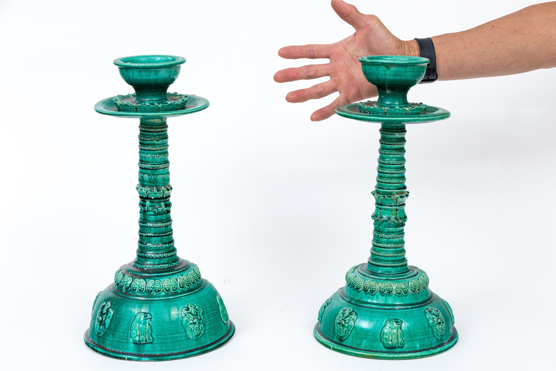 A striking pair of ceramic candlesticks raised on large domed bases with decorative moulded posts, wax drip cups, and bowl form capitals.