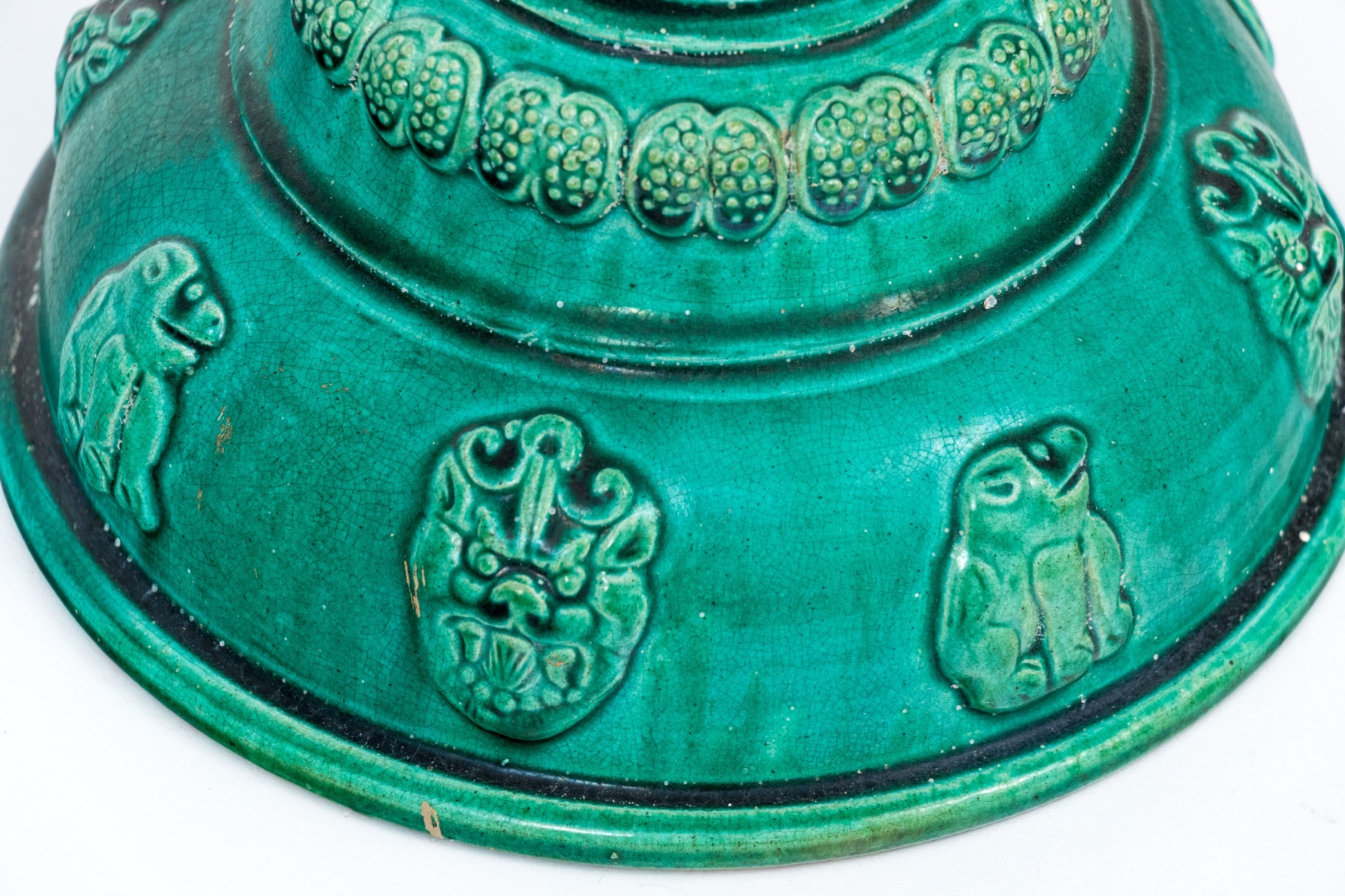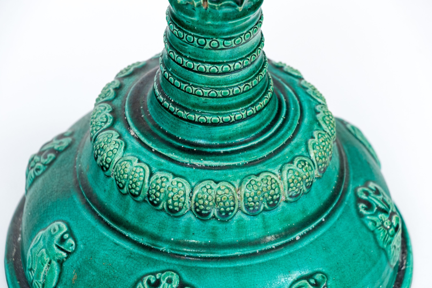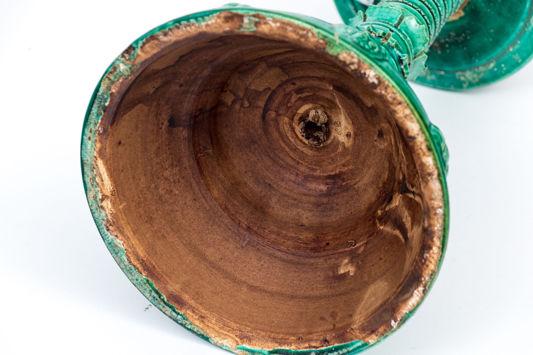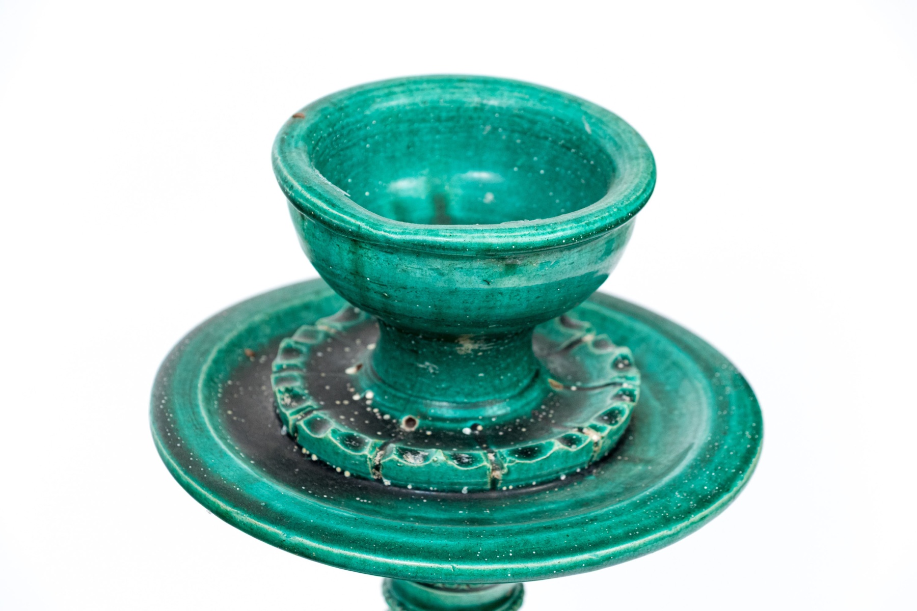 A striking pair of ceramic candlesticks raised on large domed bases with decorative moulded posts, wax drip cups, and bowl form capitals.